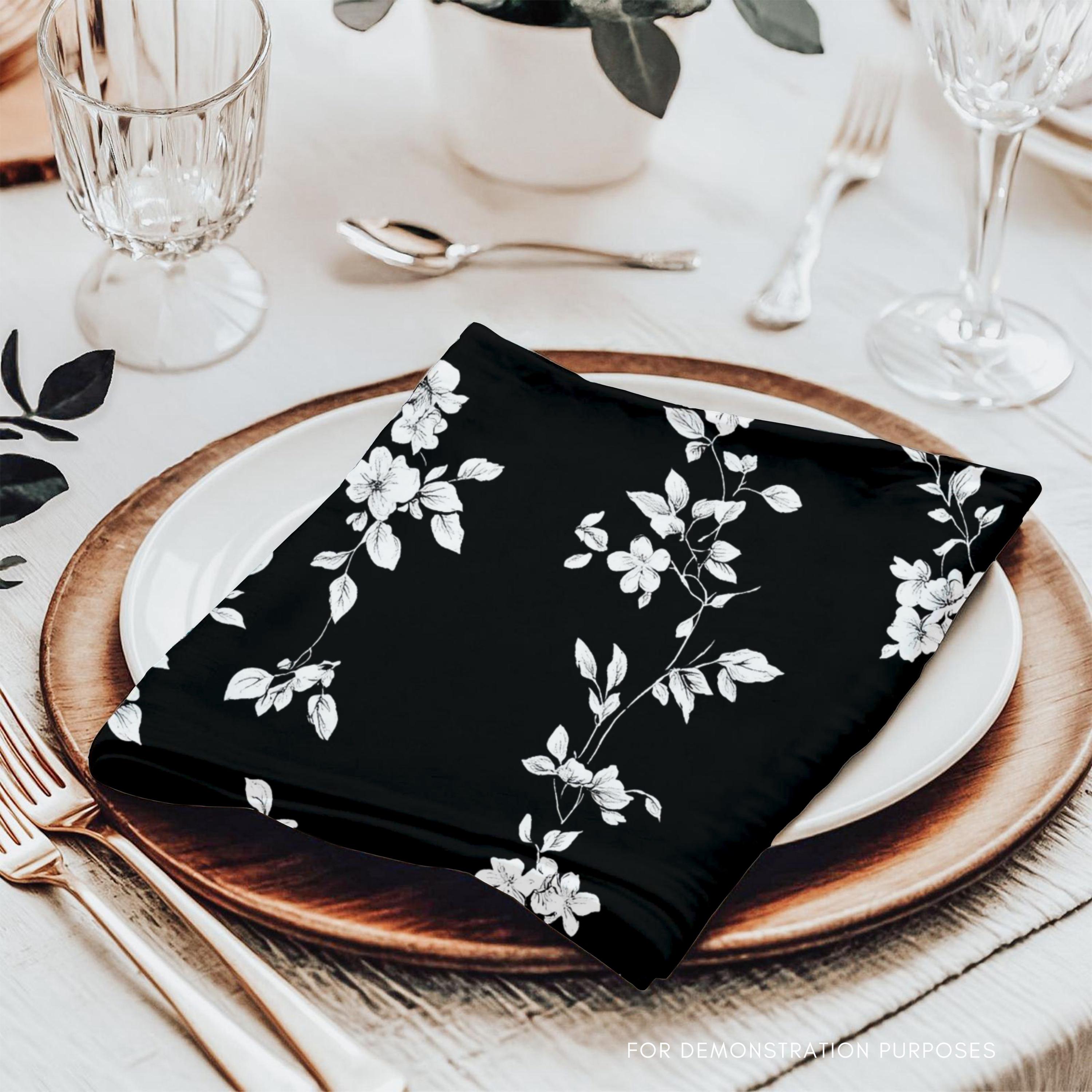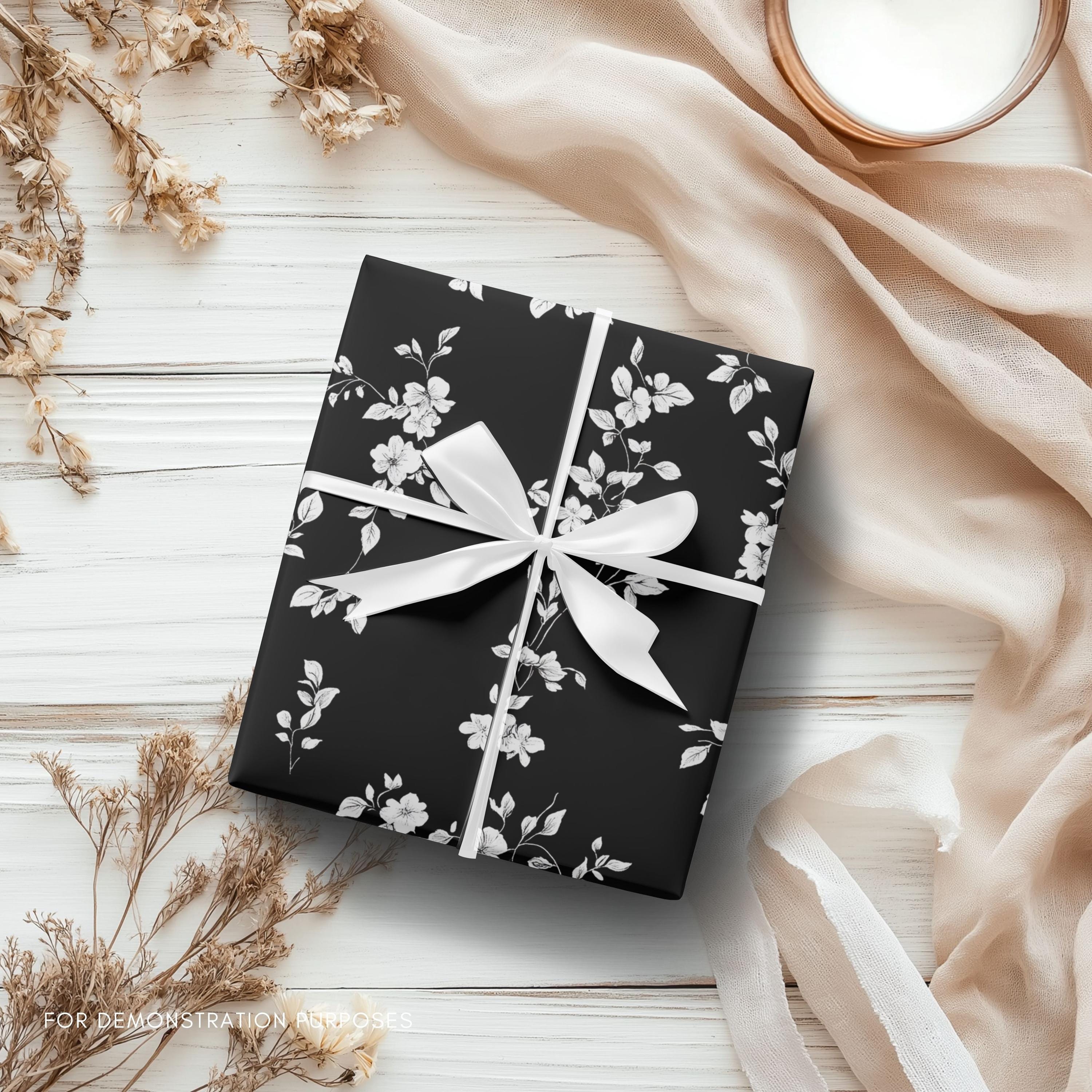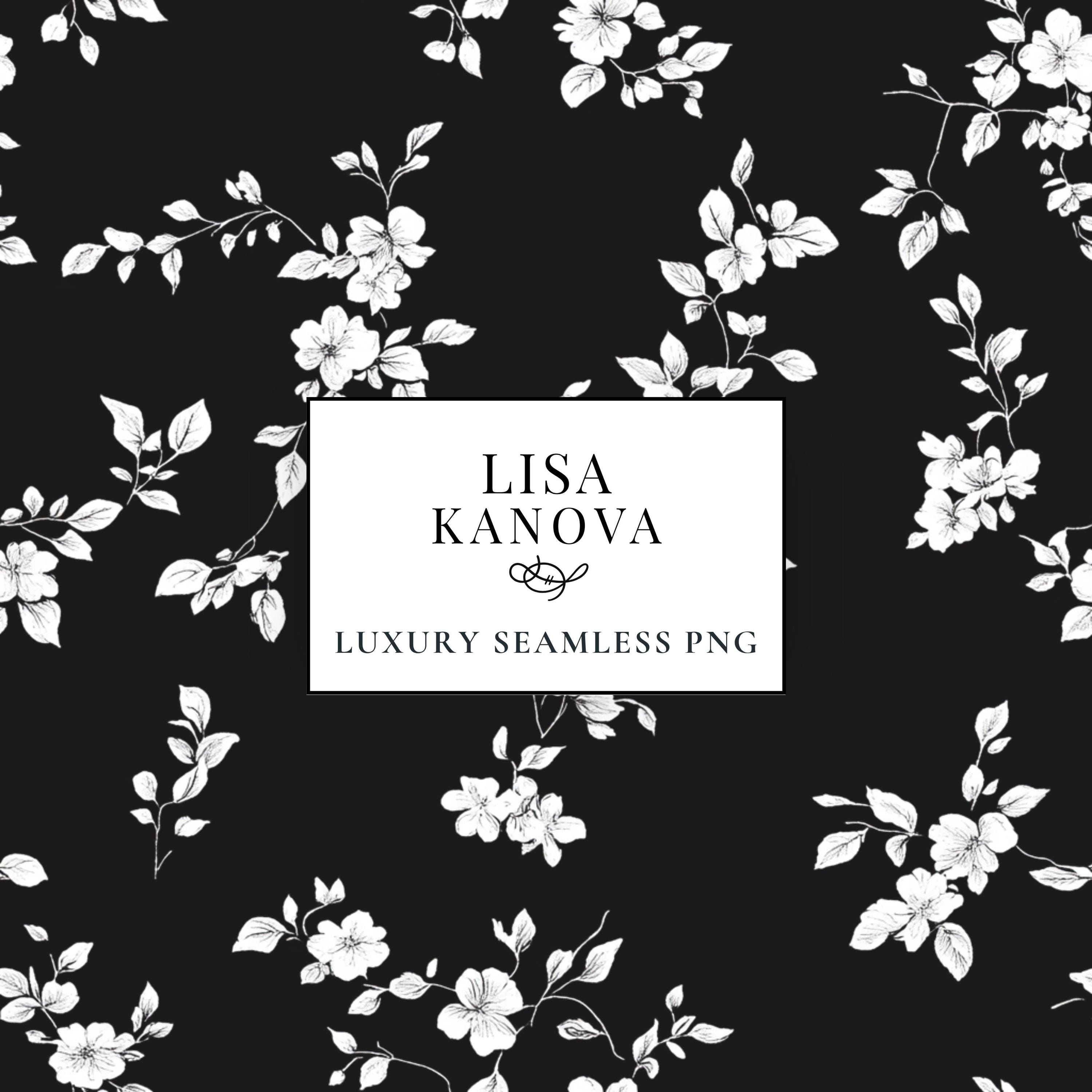 Delicate white blossoms trail across an inky black backdrop like moonlight vines in bloom. This elegant high-contrast pattern blends minimalism with romance, offering a modern yet timeless touch to textiles, paper goods, and moody design palettes.
