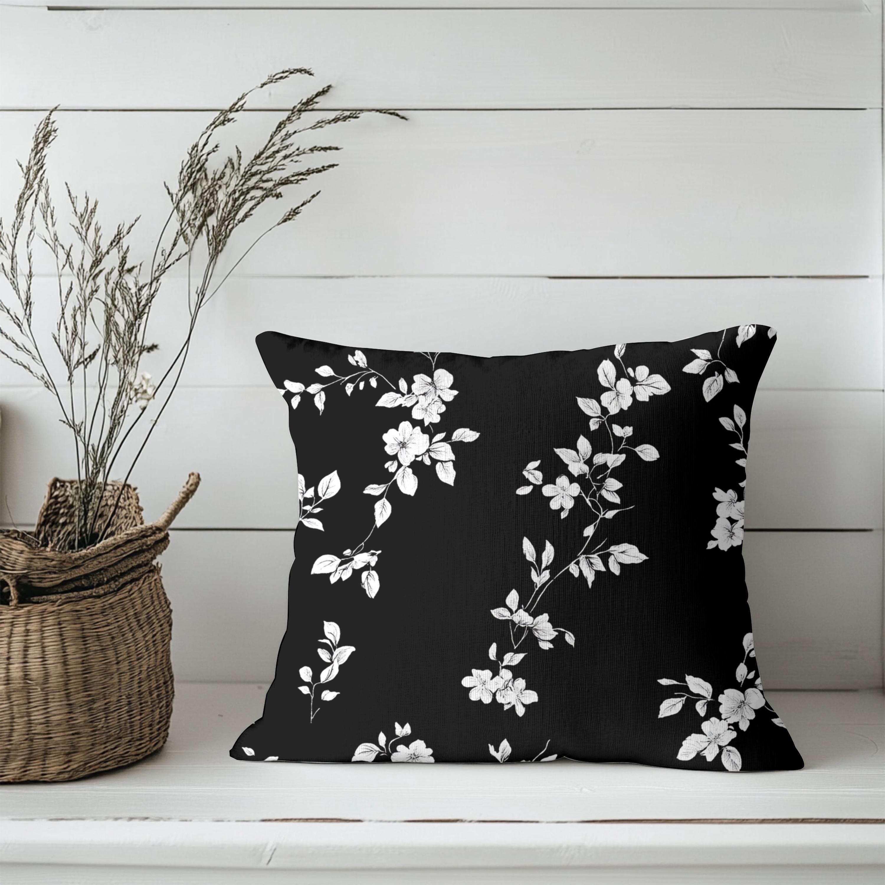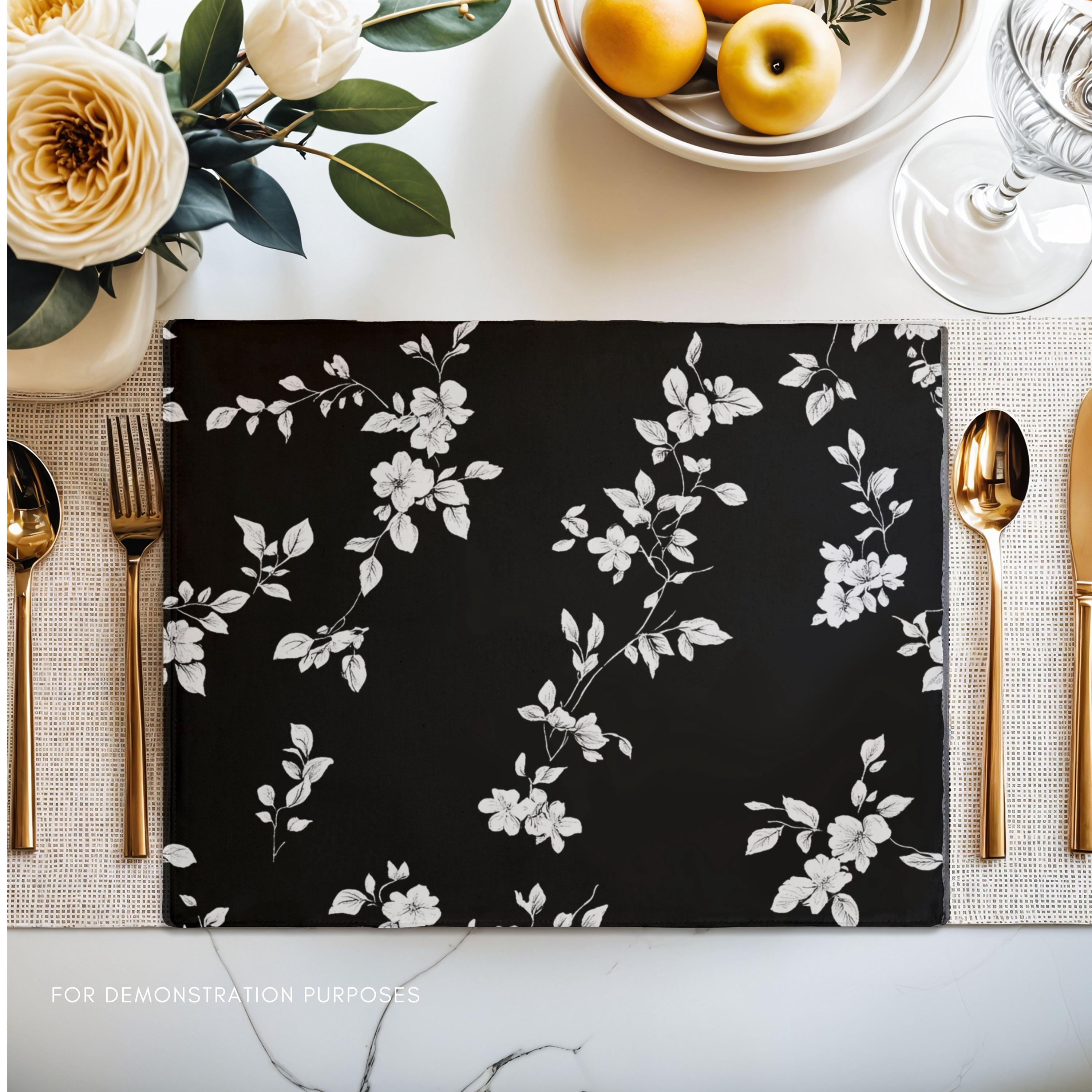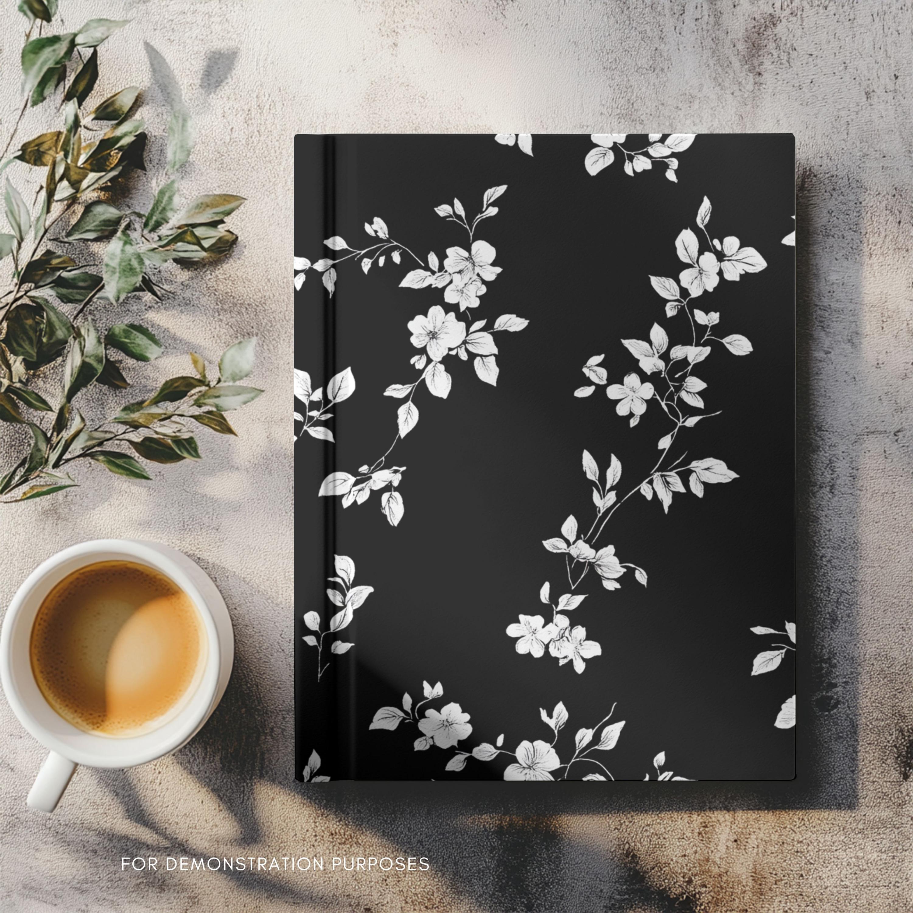 Delicate white blossoms trail across an inky black backdrop like moonlight vines in bloom. This elegant high-contrast pattern blends minimalism with romance, offering a modern yet timeless touch to textiles, paper goods, and moody design palettes.