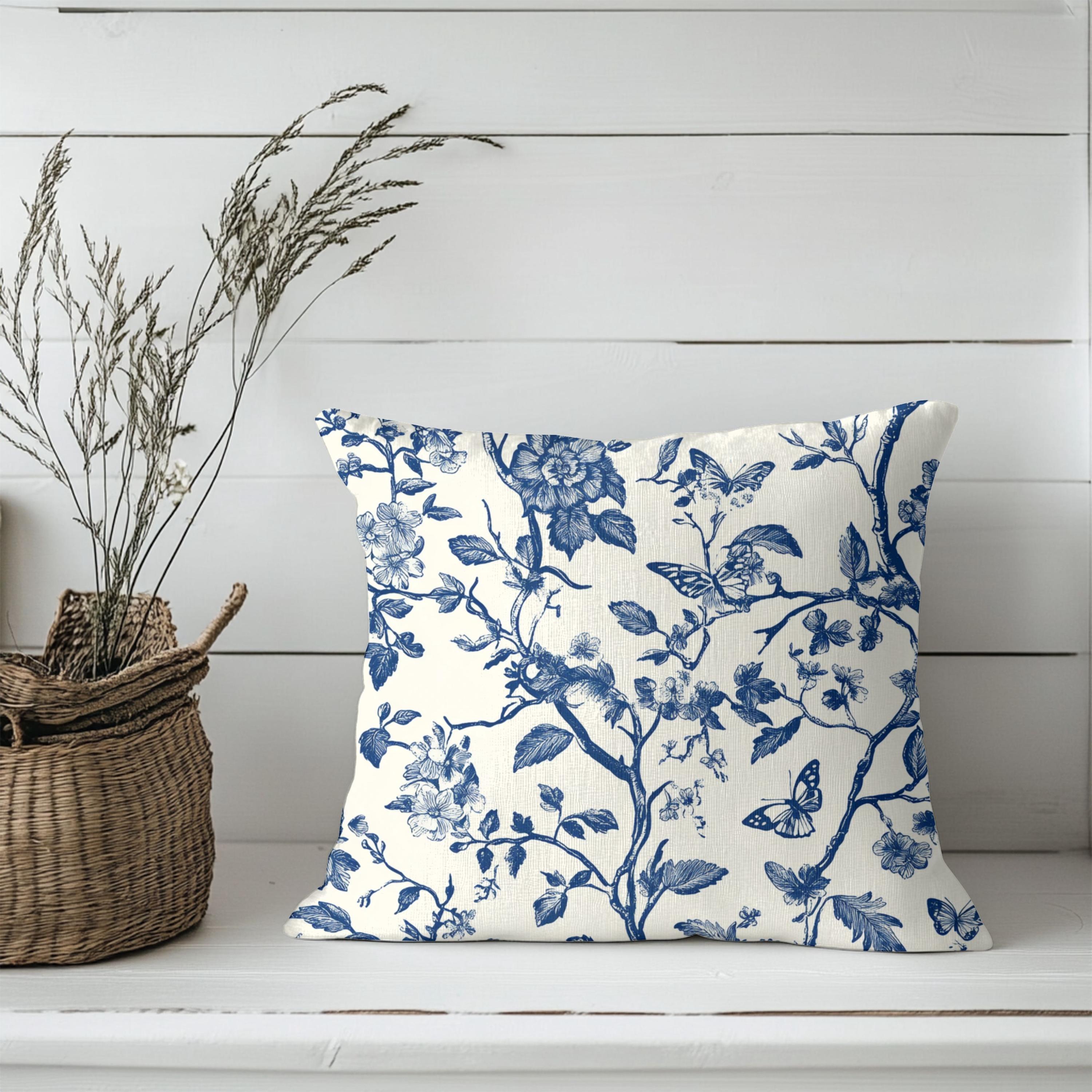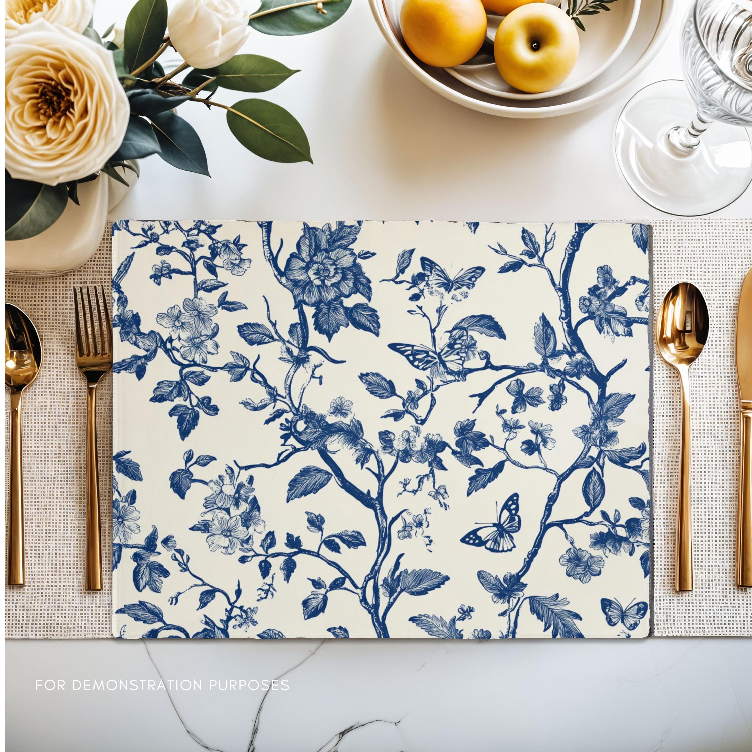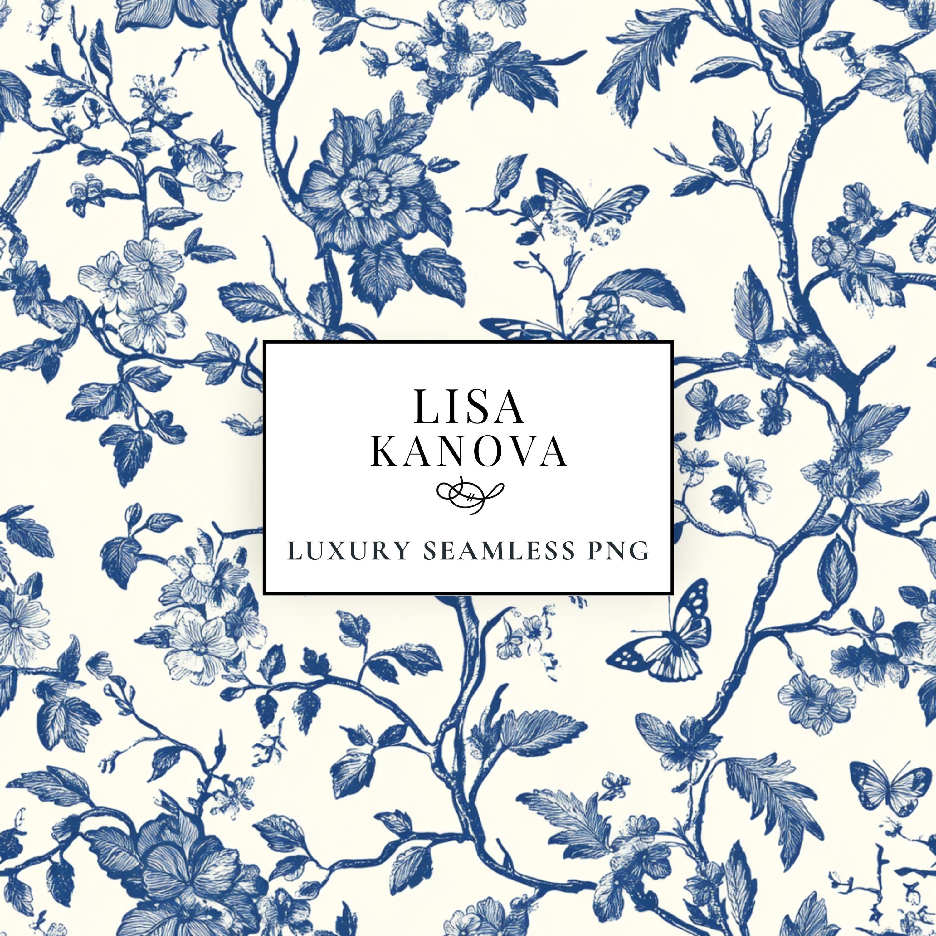 Delicate florals and fluttering butterflies wind through this timeless toile, rendered in a classic cobalt blue on ivory. The intricate linework evokes vintage botanical engravings—perfect for elegant textiles, stationery, or wallpaper with an heirloom feel.