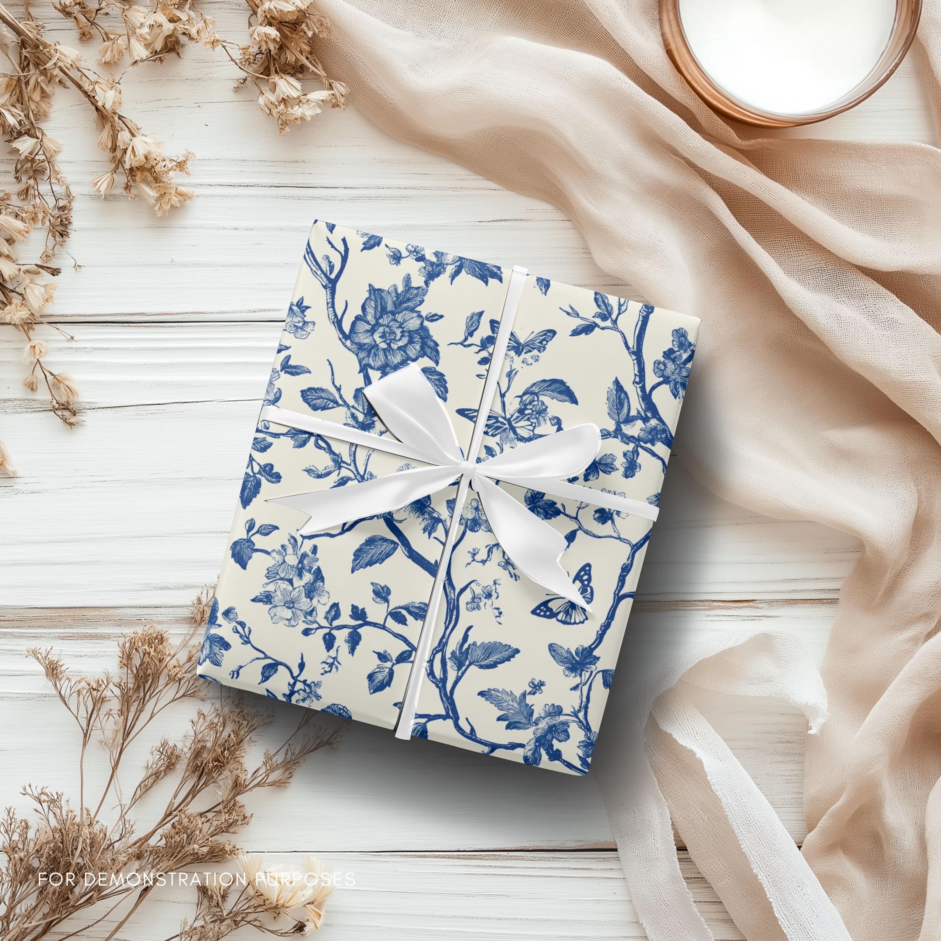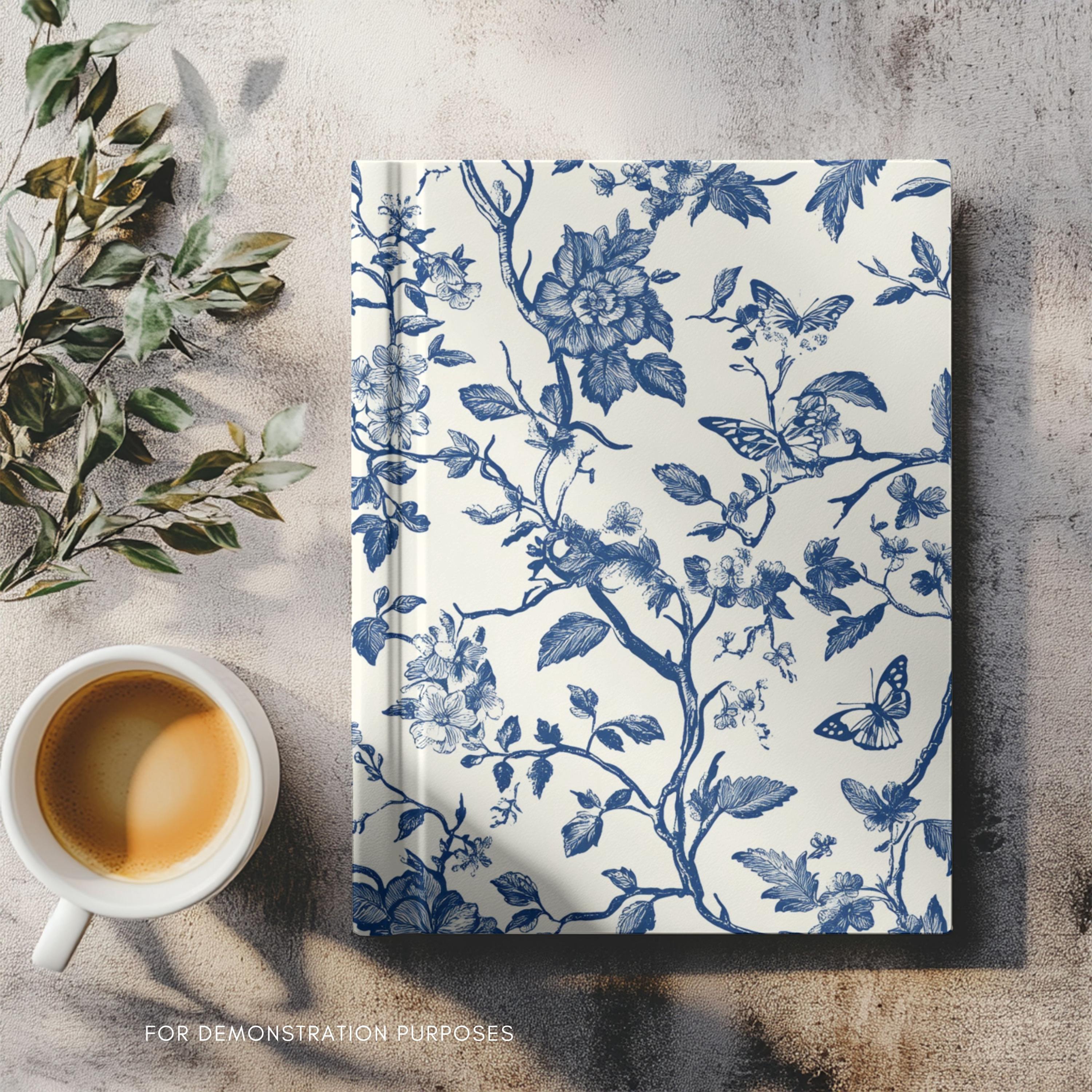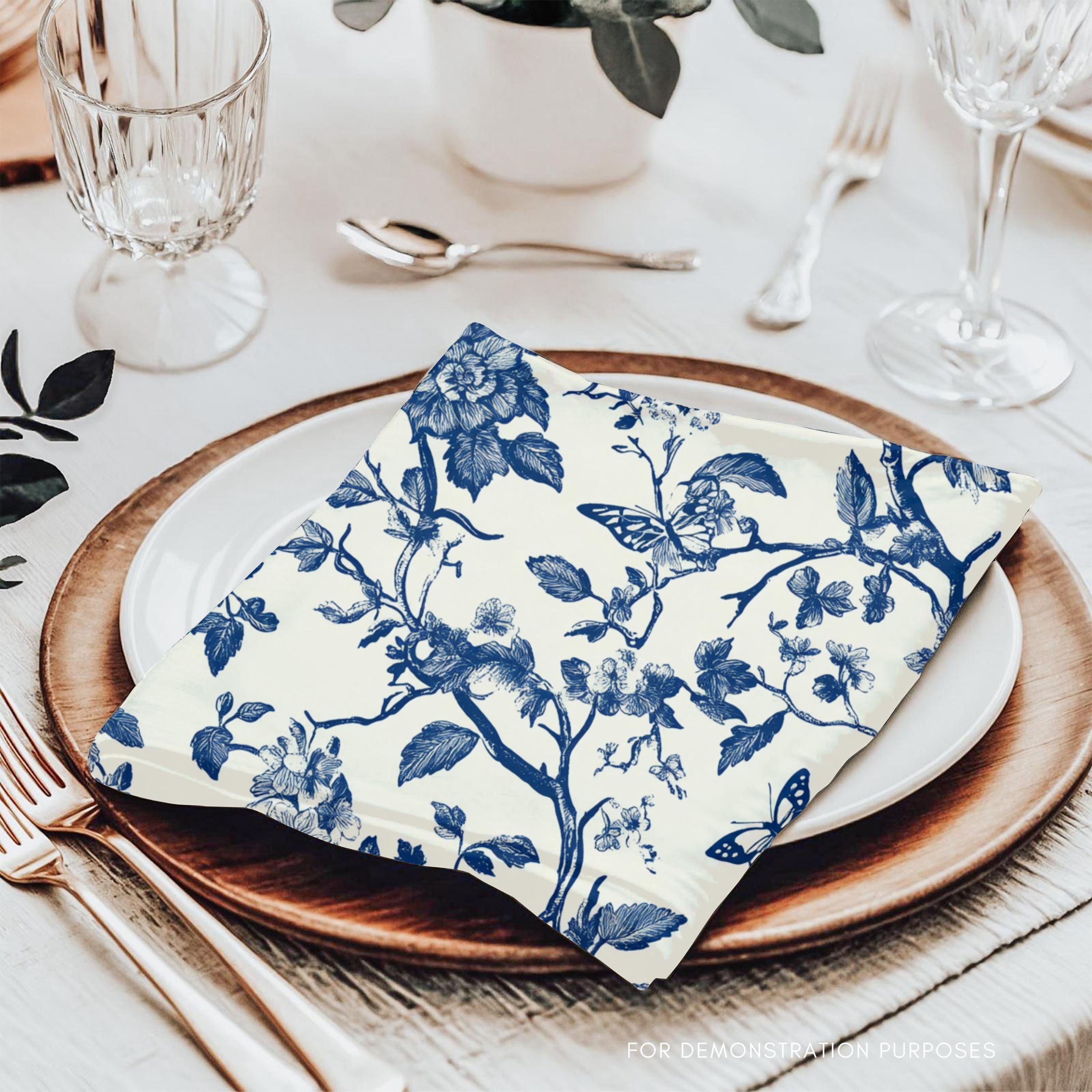 Delicate florals and fluttering butterflies wind through this timeless toile, rendered in a classic cobalt blue on ivory. The intricate linework evokes vintage botanical engravings—perfect for elegant textiles, stationery, or wallpaper with an heirloom feel.
