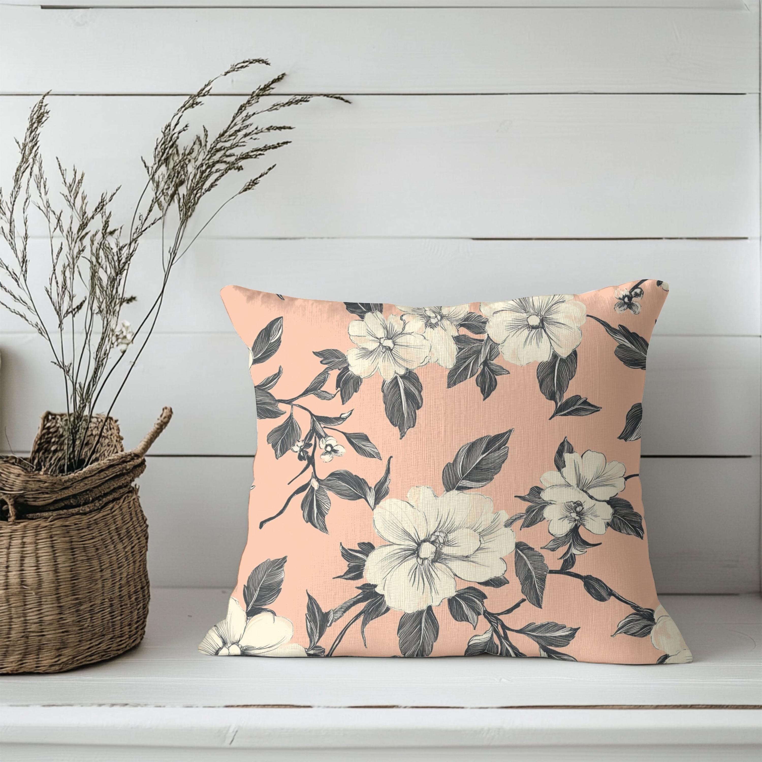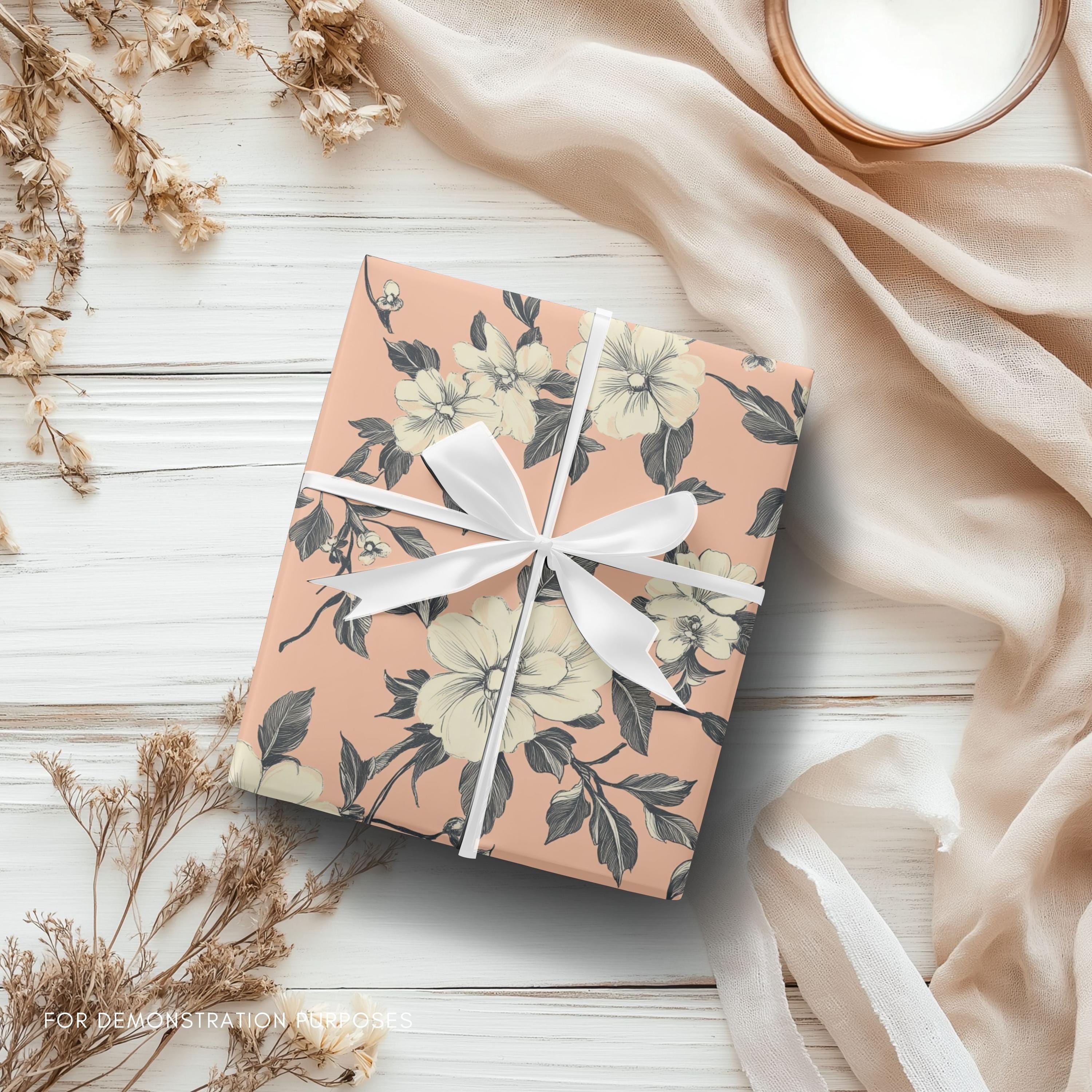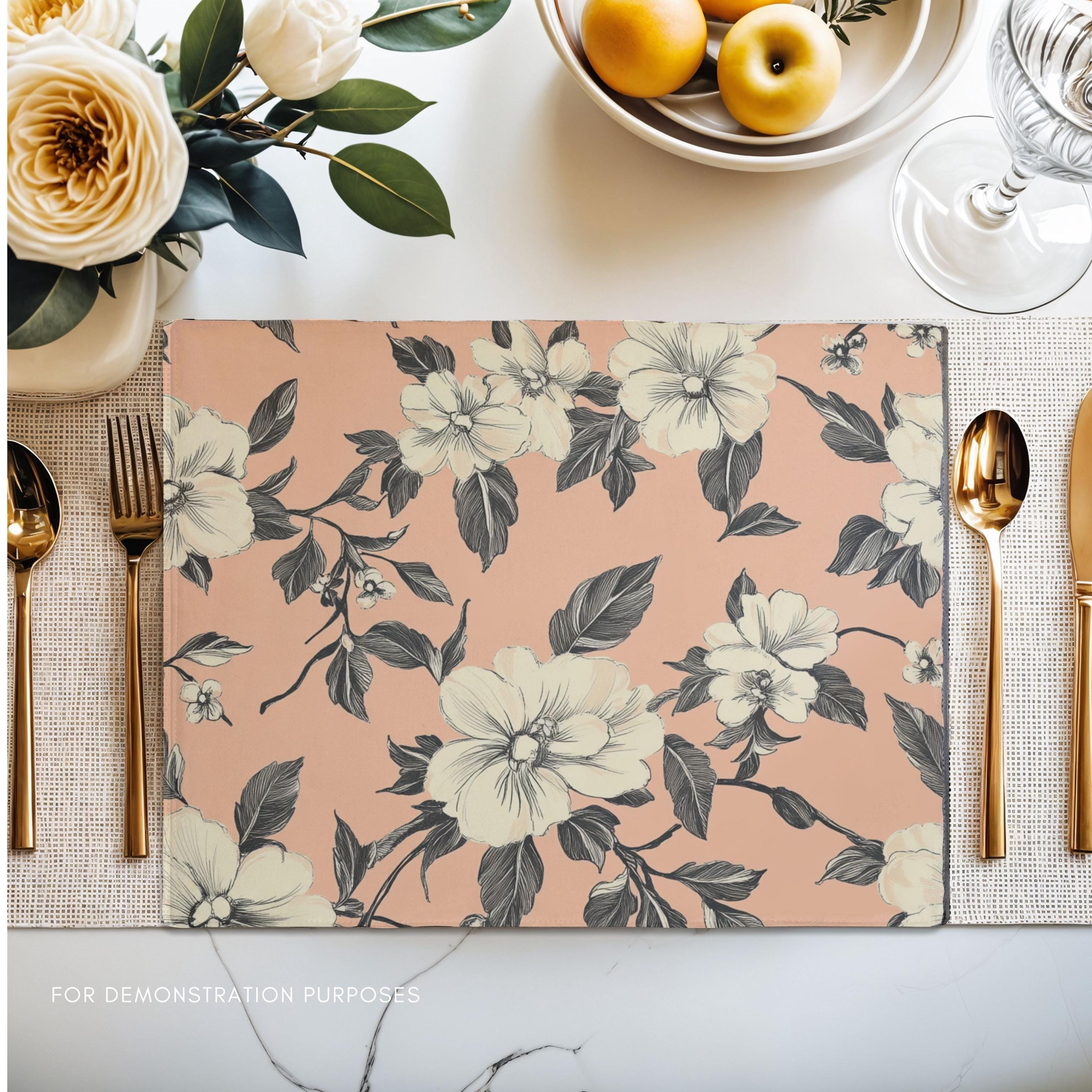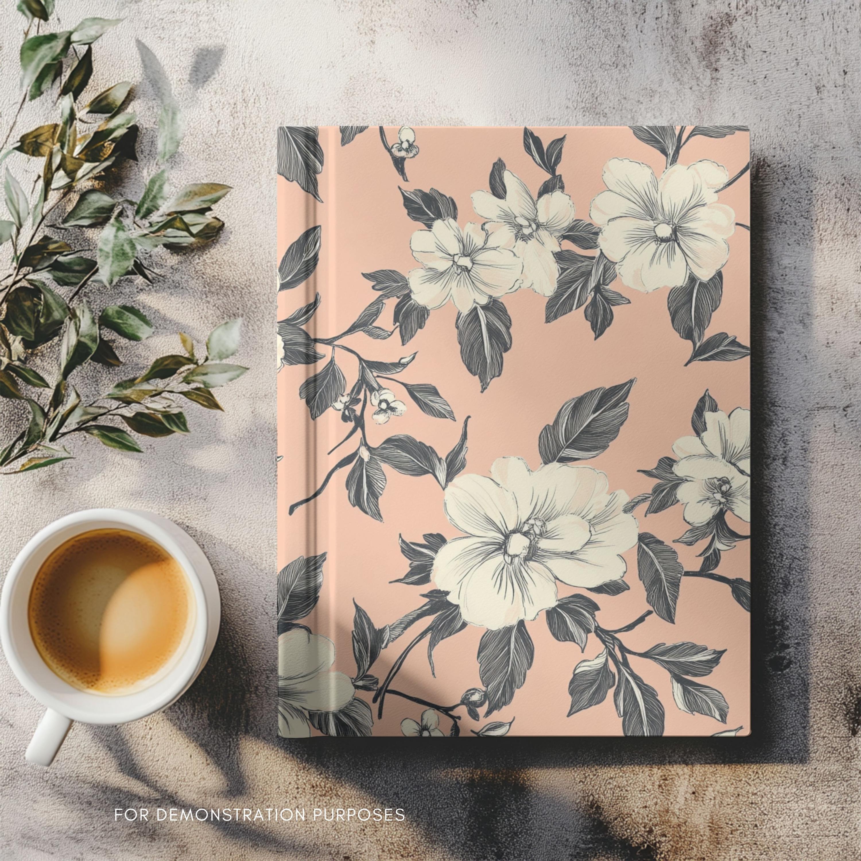Creamy white florals bloom against a soft blush ground, with inky charcoal leaves adding graceful contrast. Romantic and painterly, this seamless pattern evokes vintage charm with a fresh modern twist—ideal for fabric, stationery, or elegant packaging.