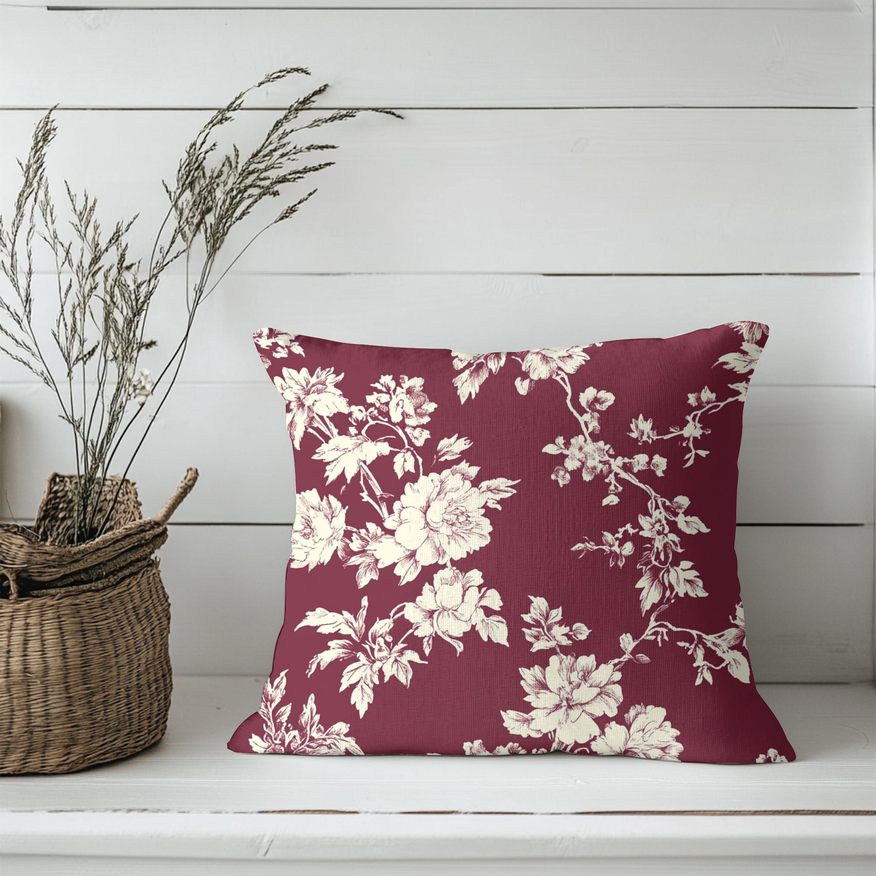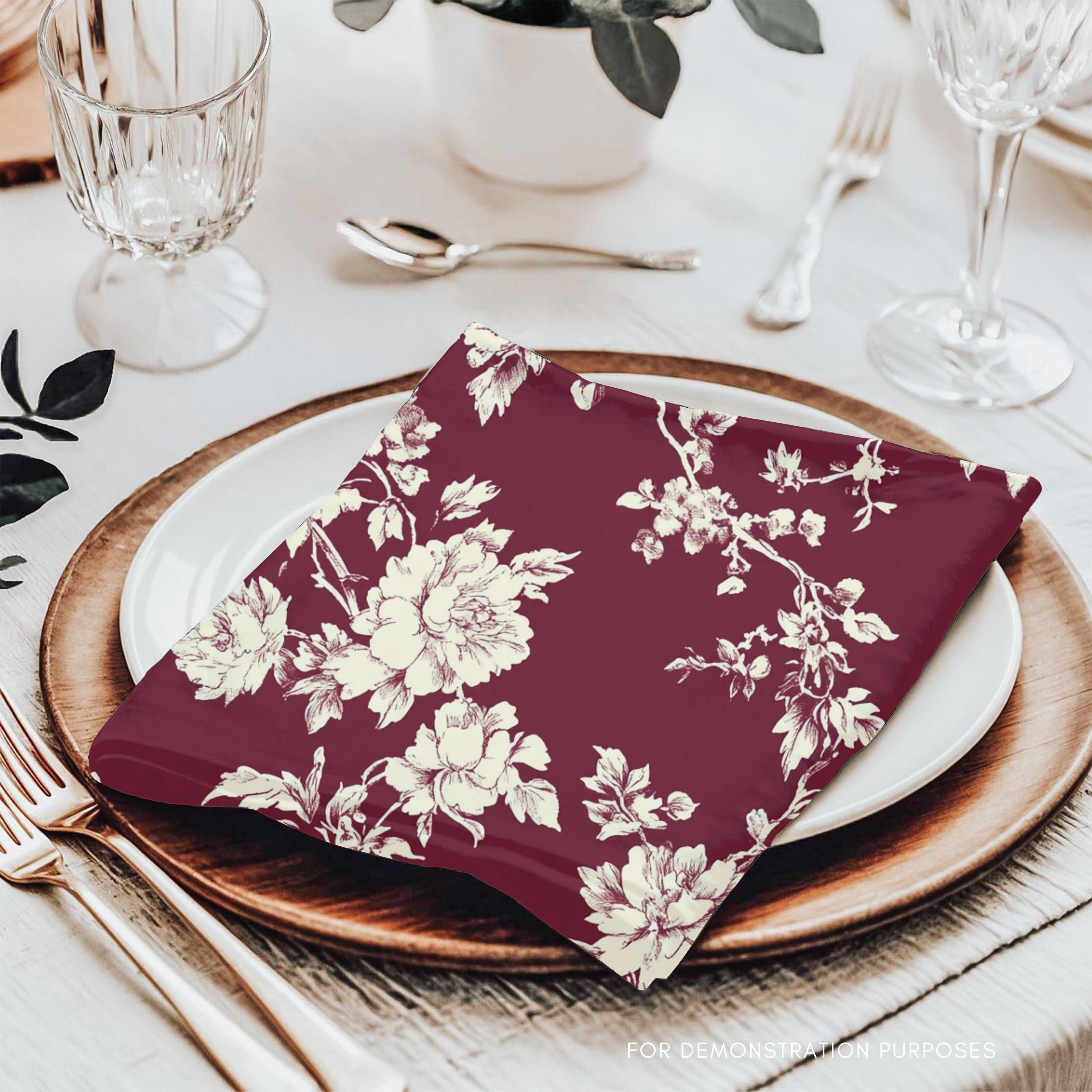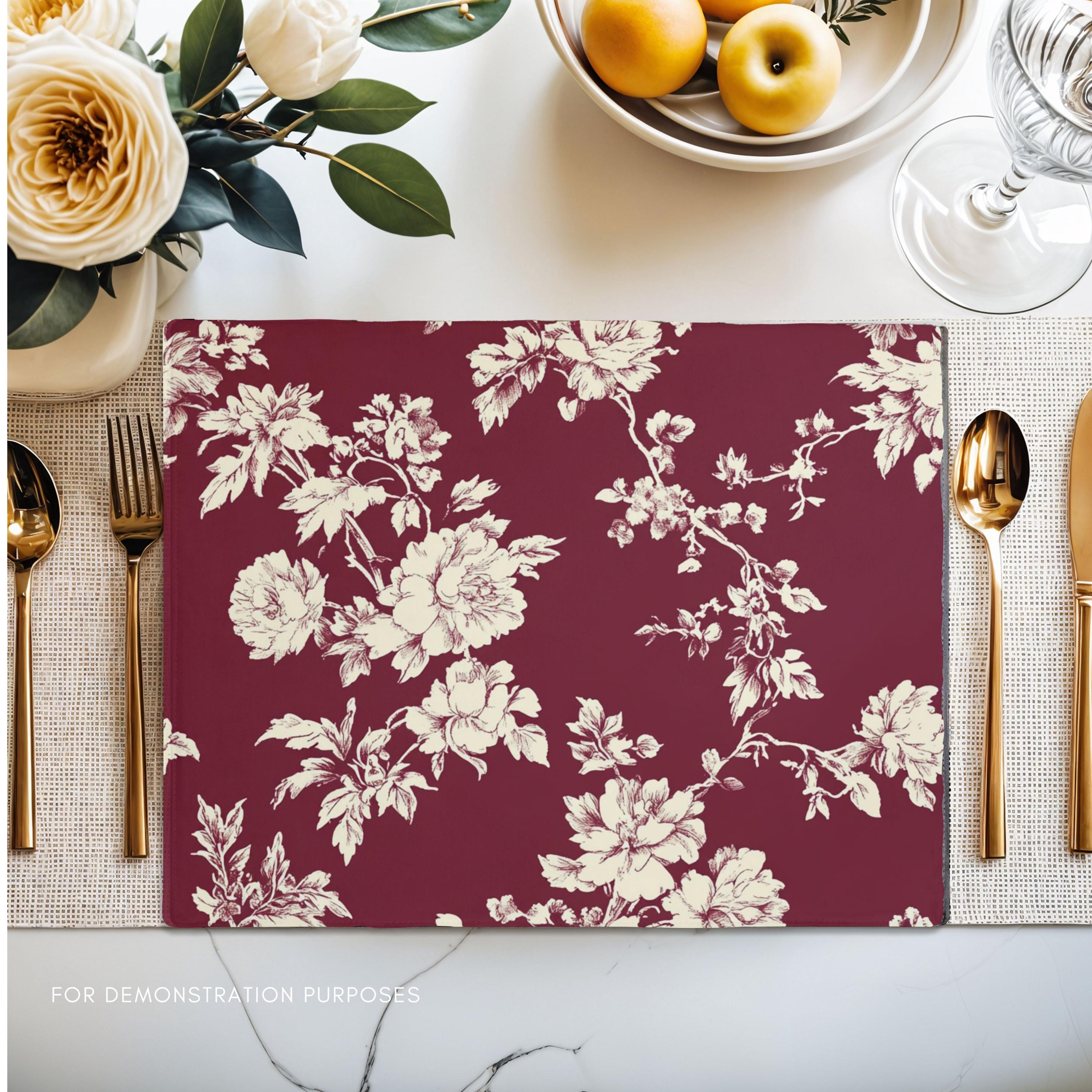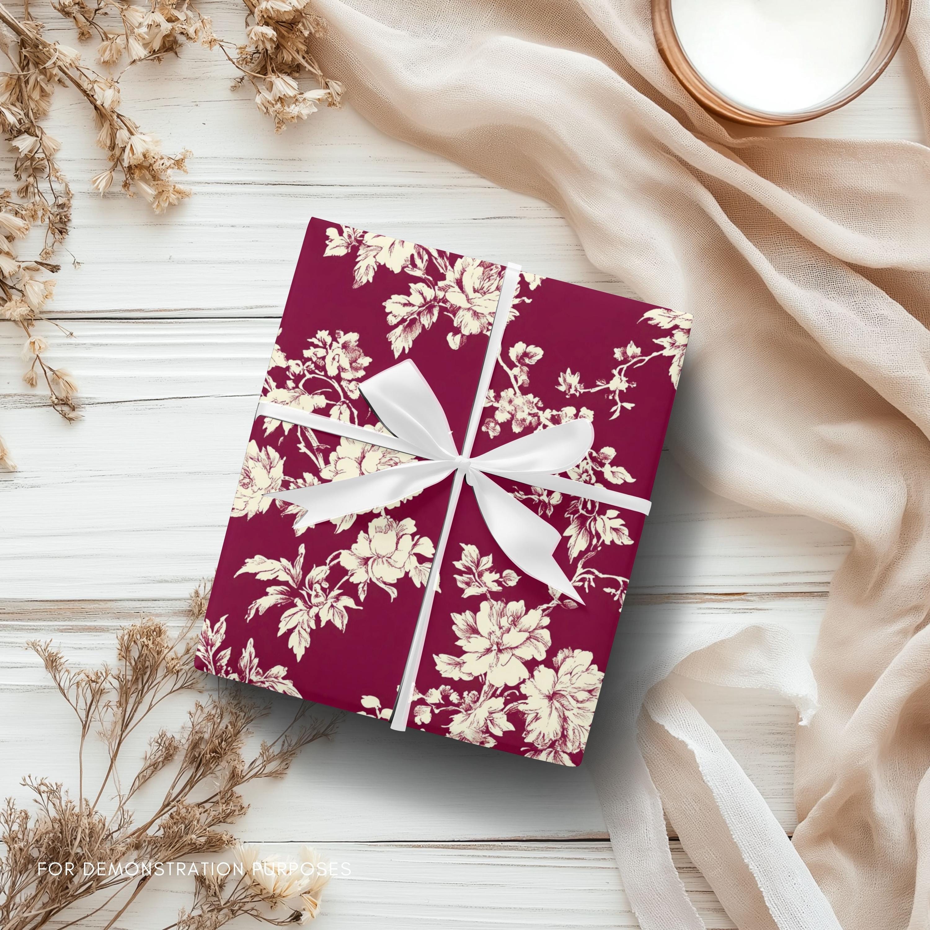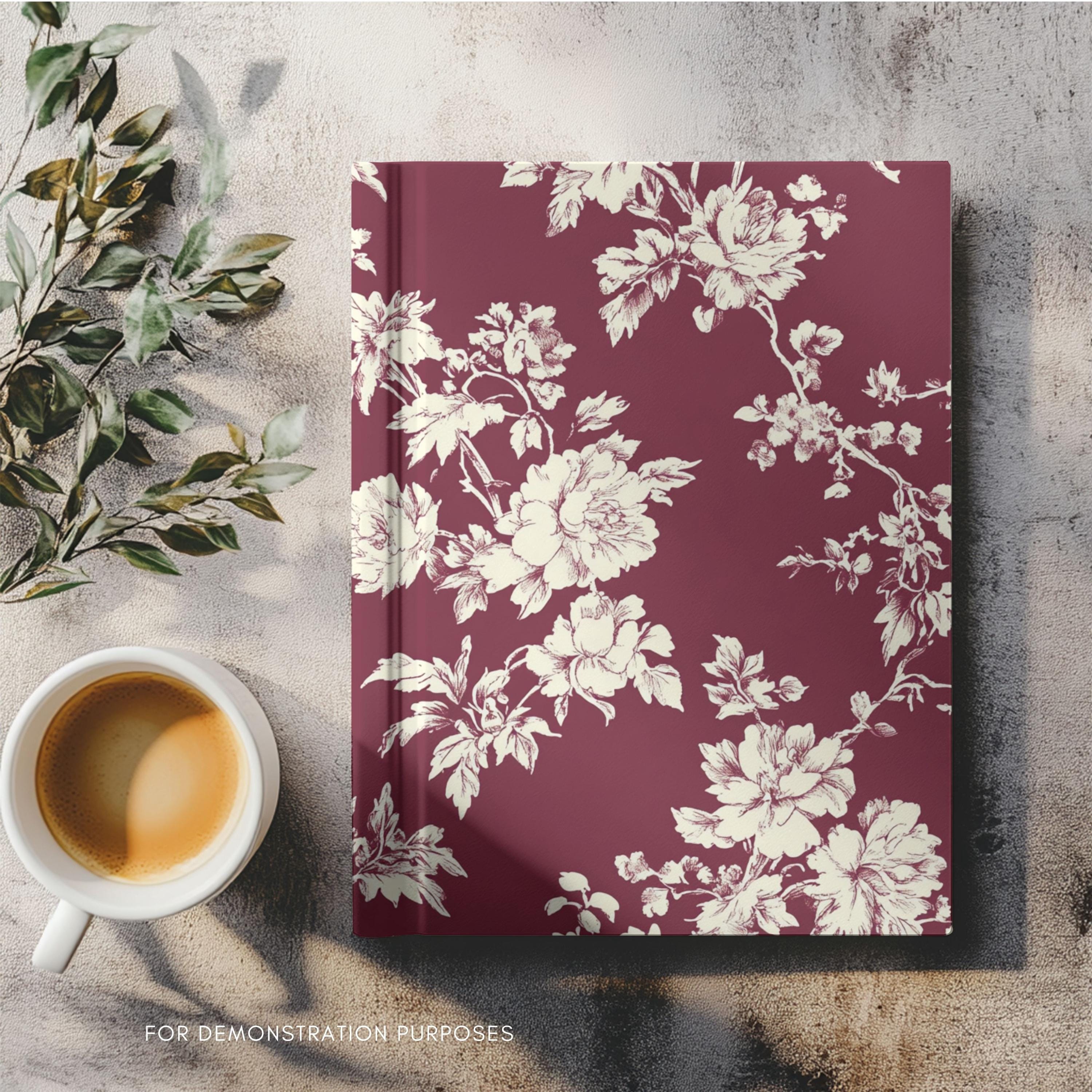 Ivory florals bloom in vintage etching style across a rich crimson red backdrop, like a forgotten page from an antique botanical journal. This seamless design is dramatic, romantic, and perfectly poised for bold textiles, wallpaper, and timeless paper goods.