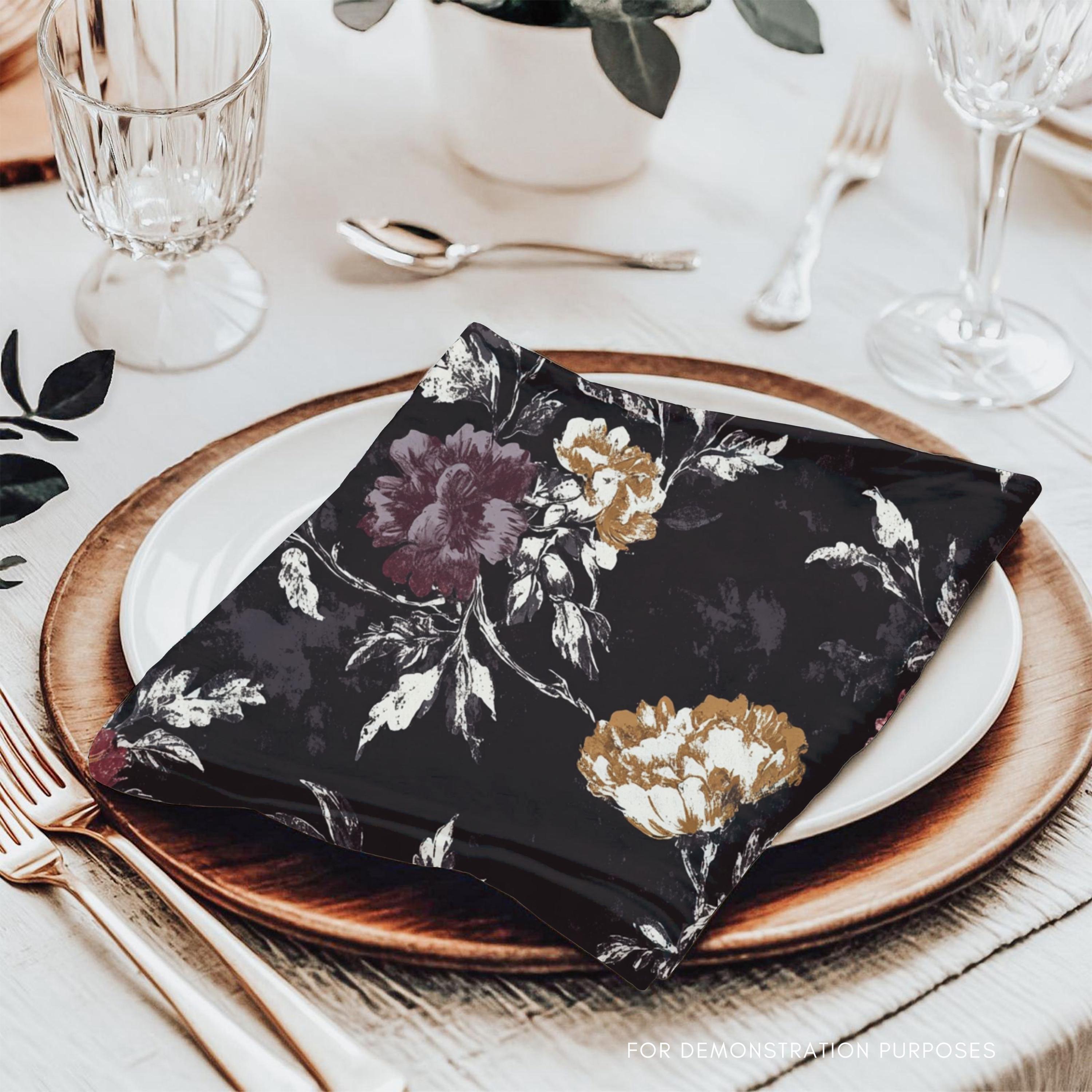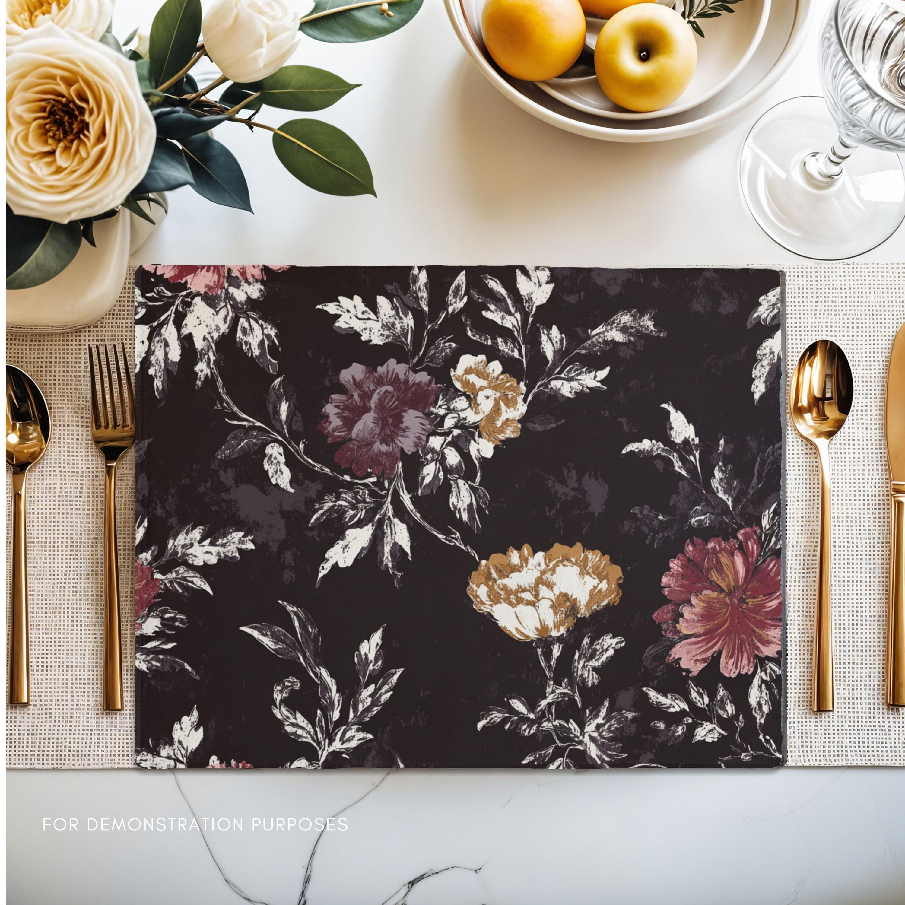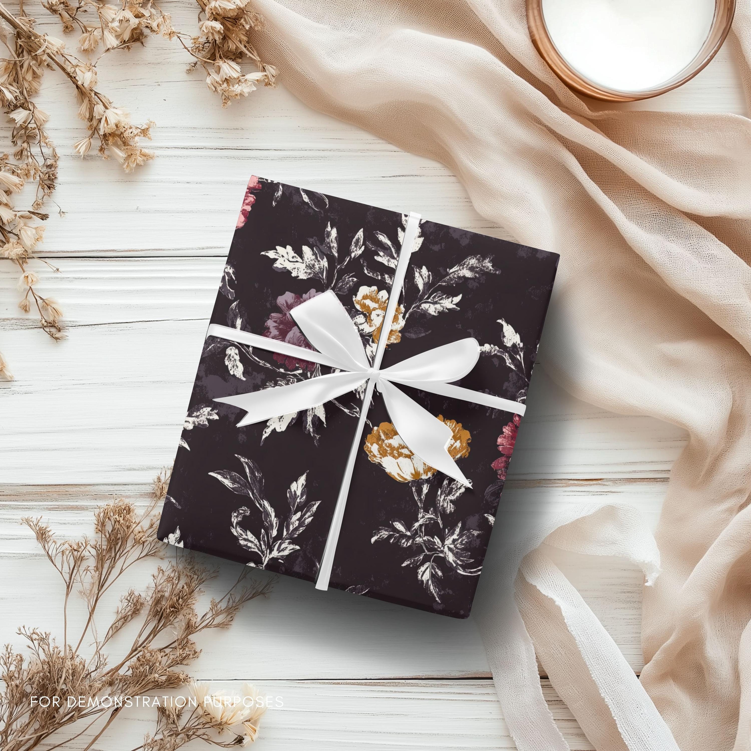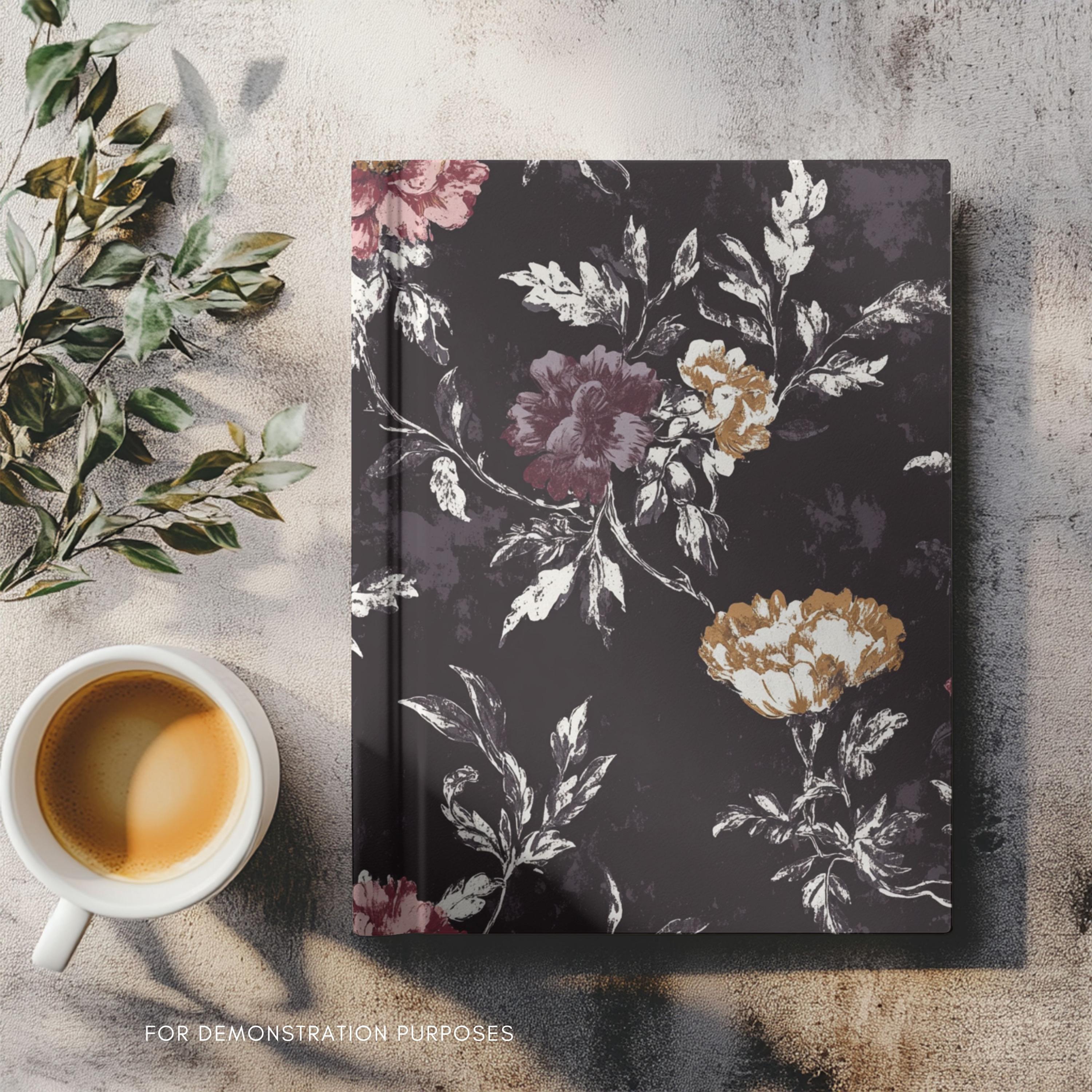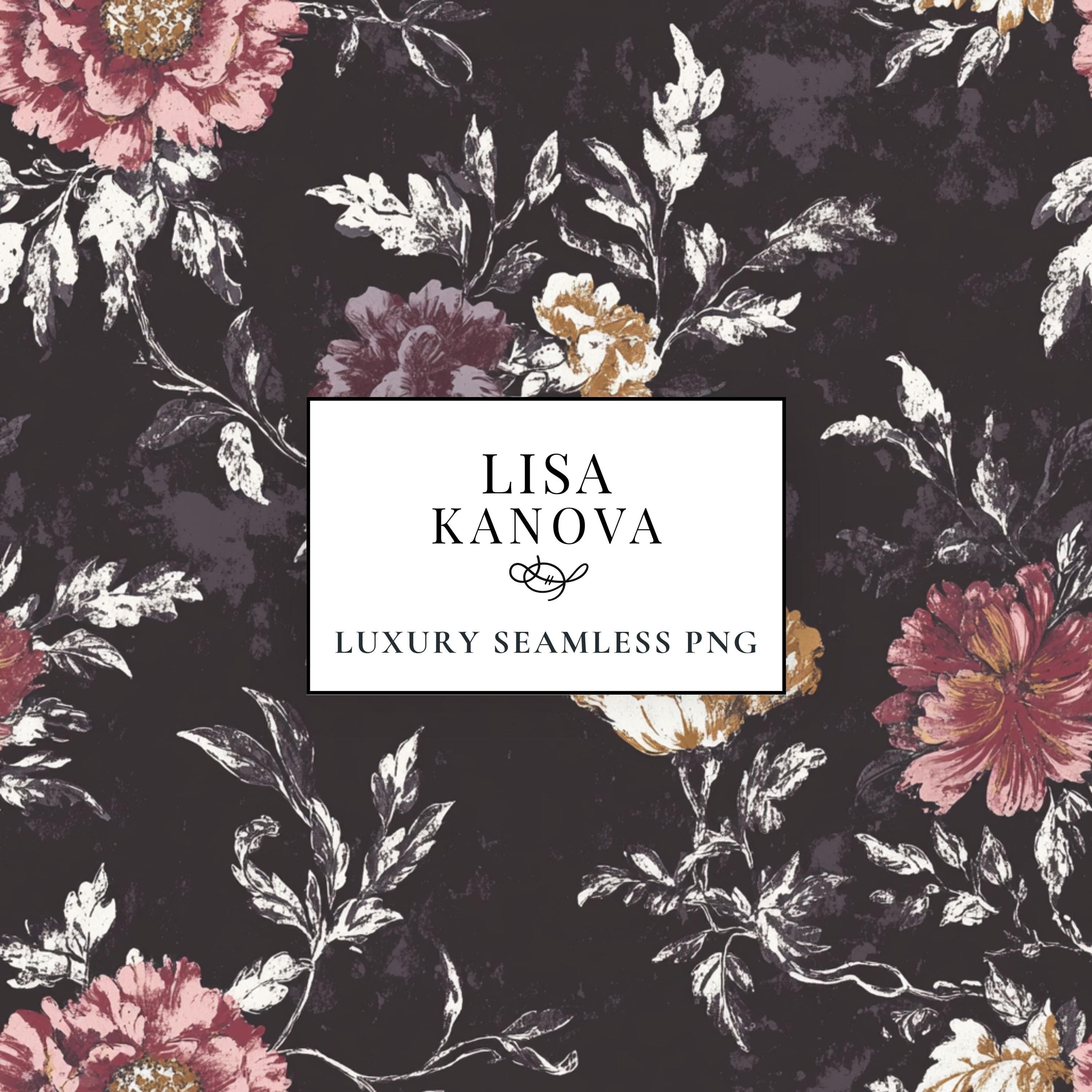 With vintage dahlia blossoms in soft blush, gold, and plum tones, this richly textured floral unfolds over a moody charcoal-black base. Dramatic and romantic, this seamless pattern adds old-world glamour to textiles, packaging, and bold, atmospheric designs.