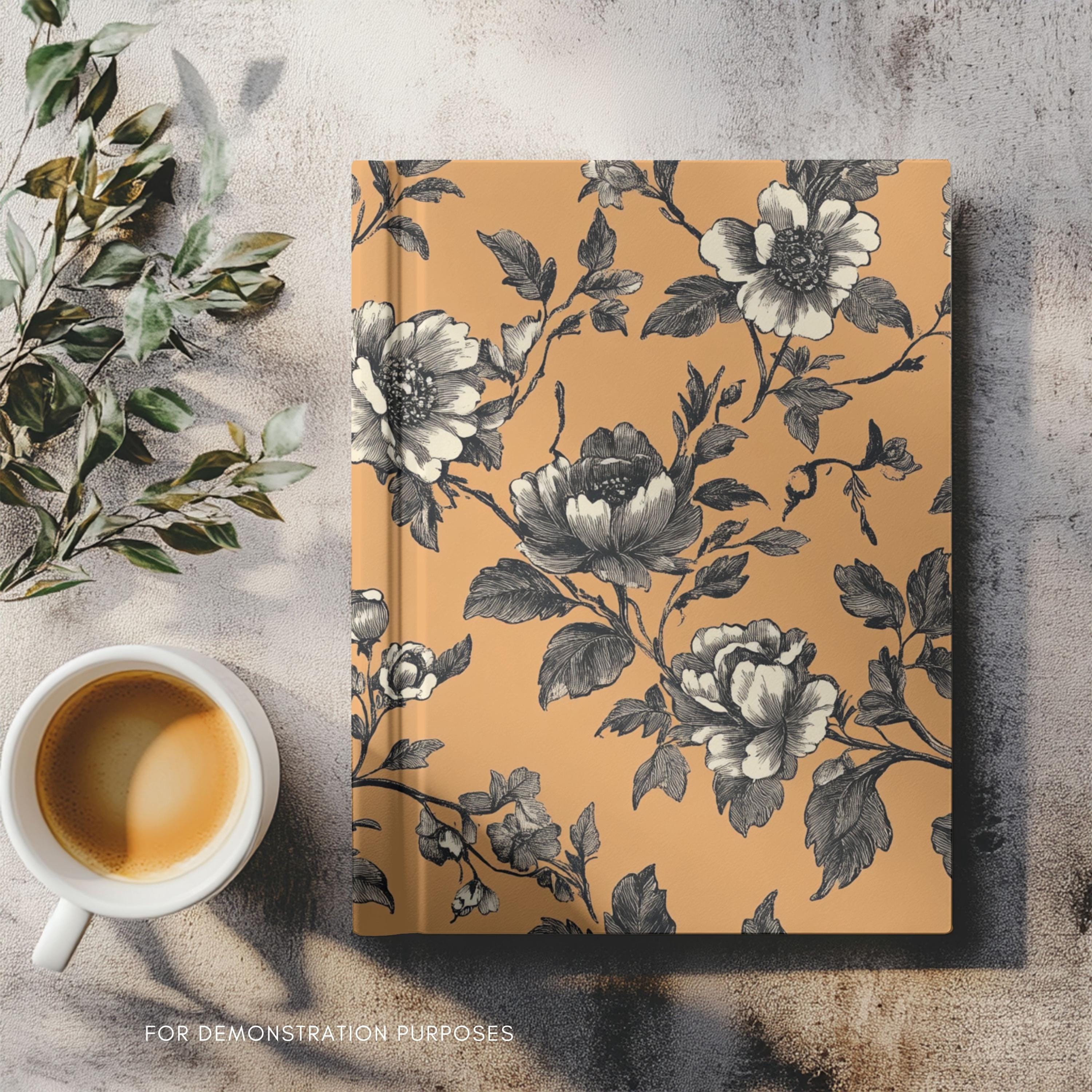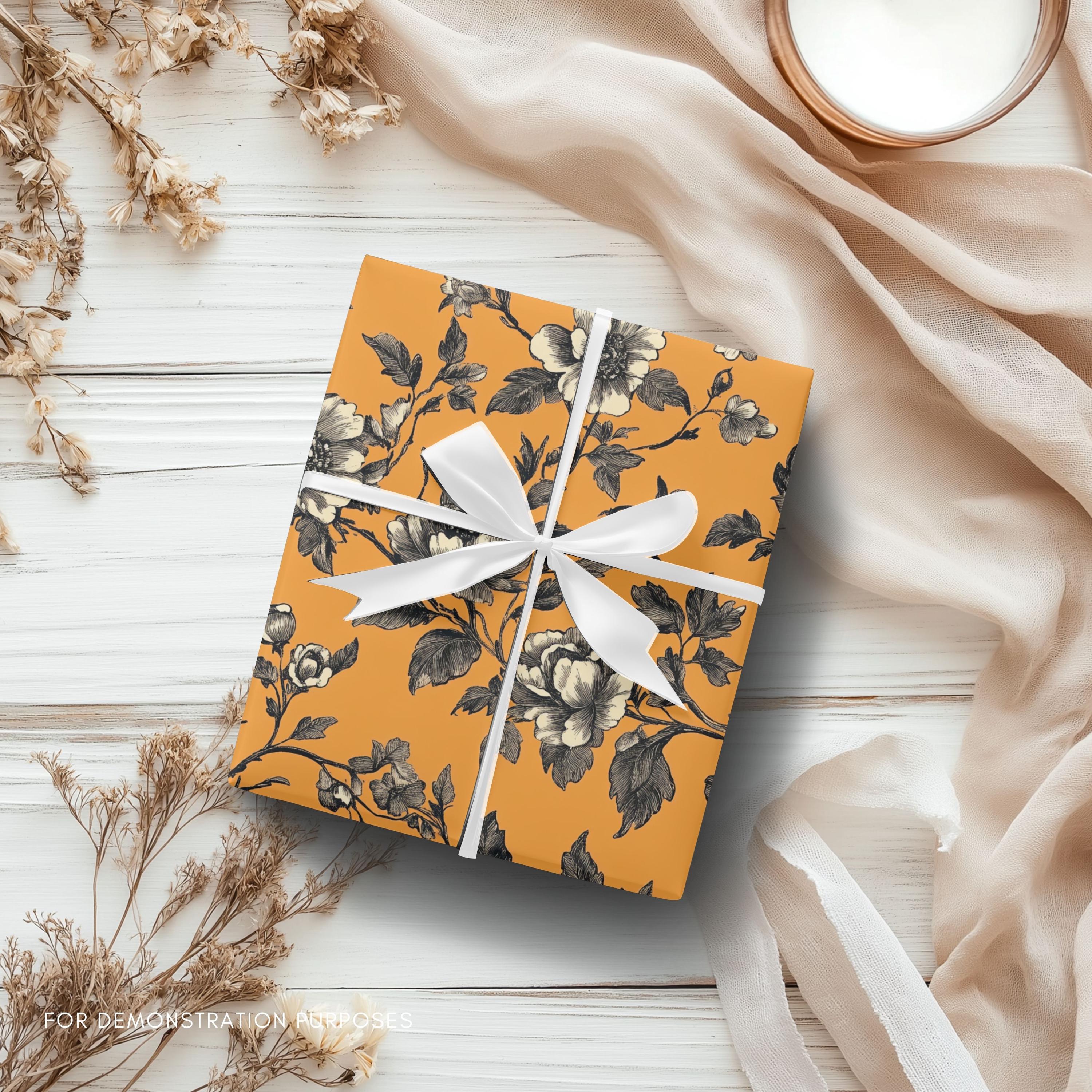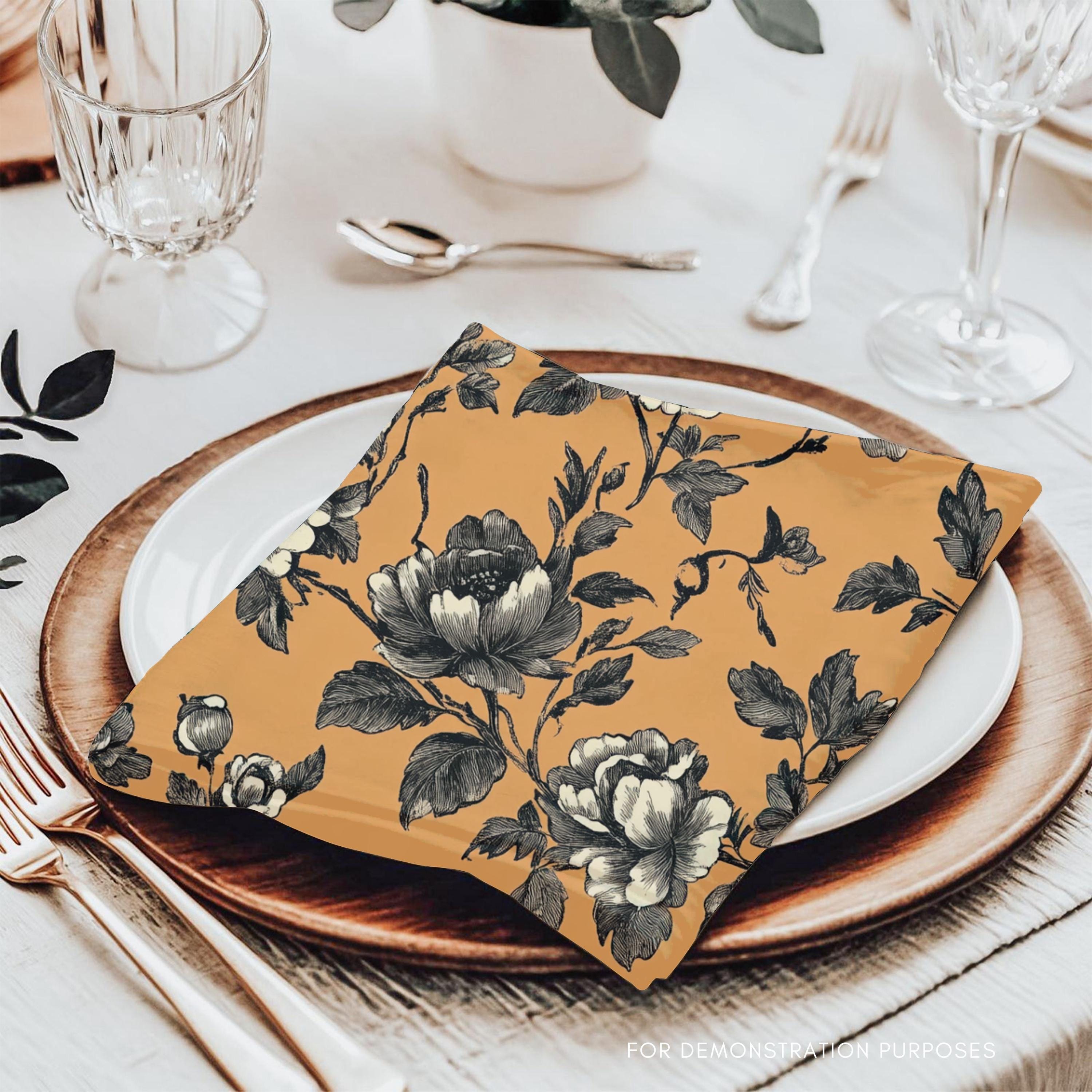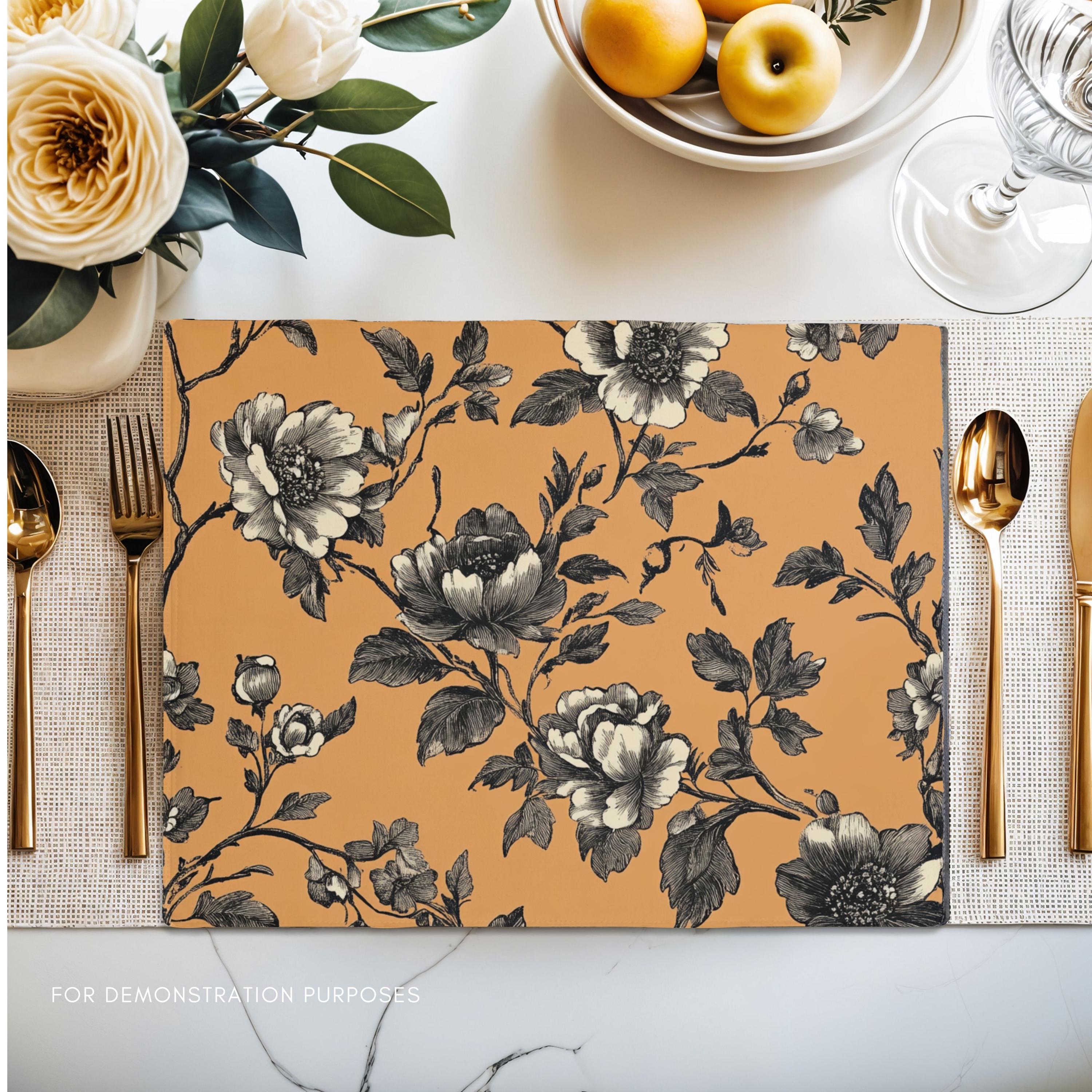 Bold charcoal florals unfurl against a deep amber-orange backdrop in this dramatic yet refined seamless pattern. Perfect for statement-making designs with an editorial edge and a touch of vintage mystery.