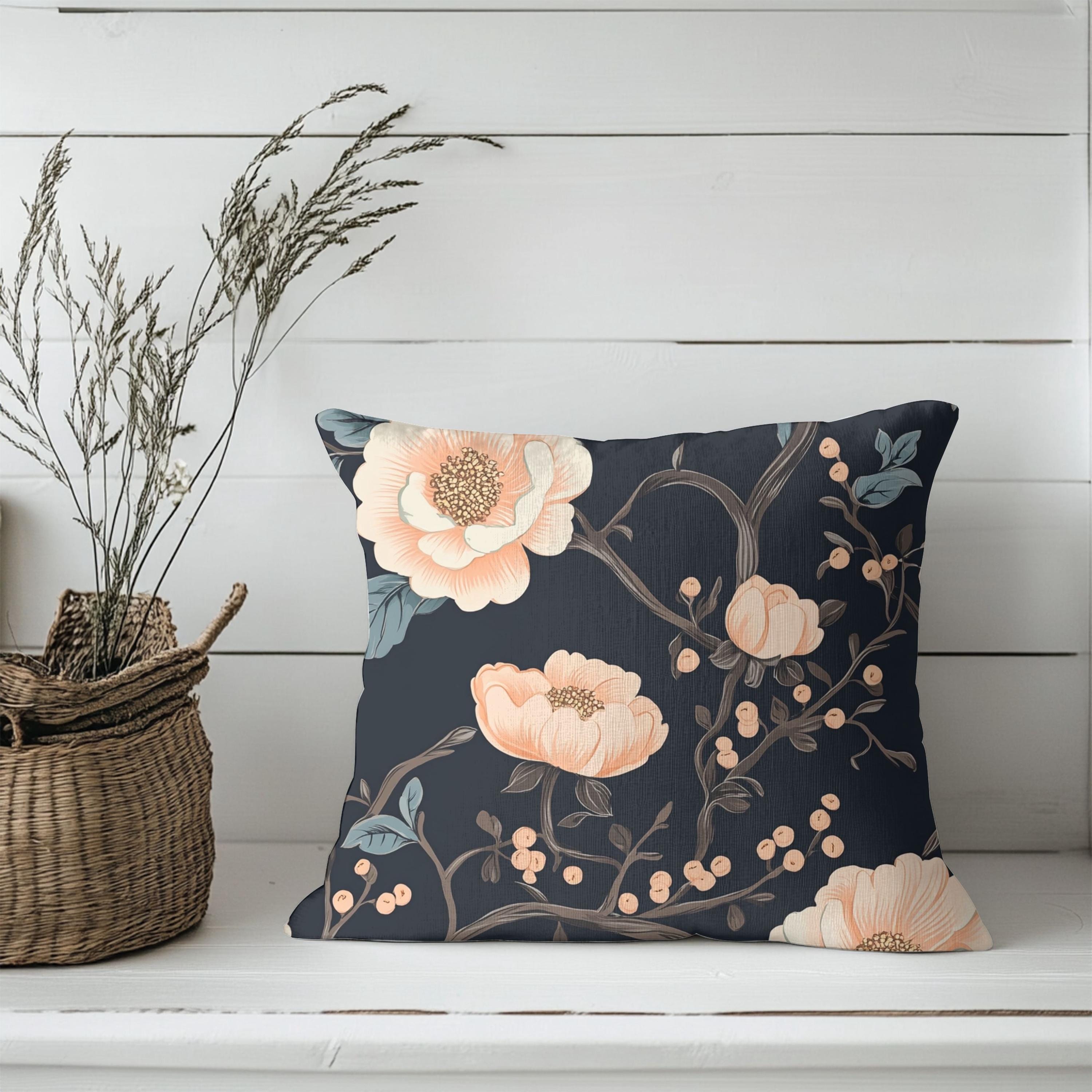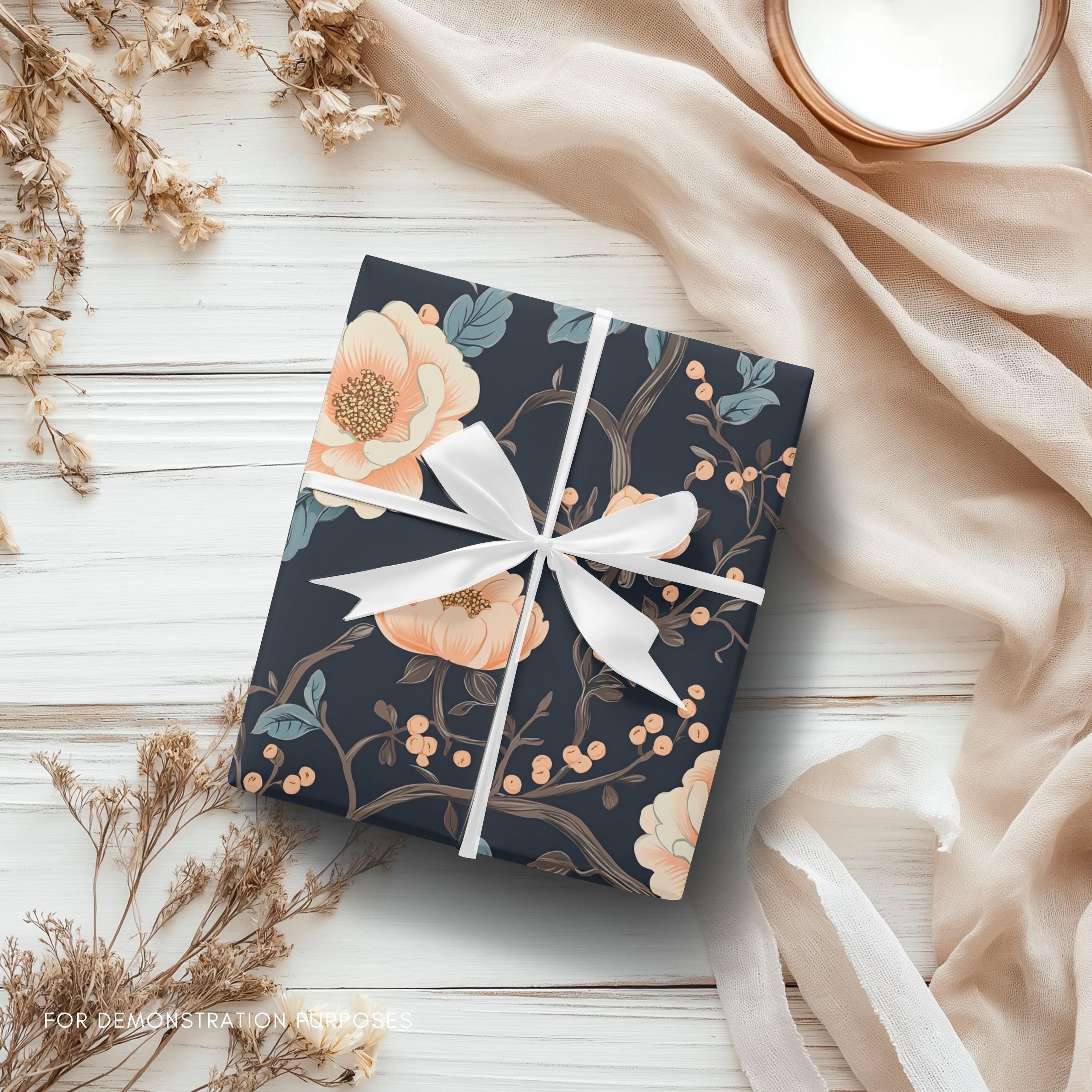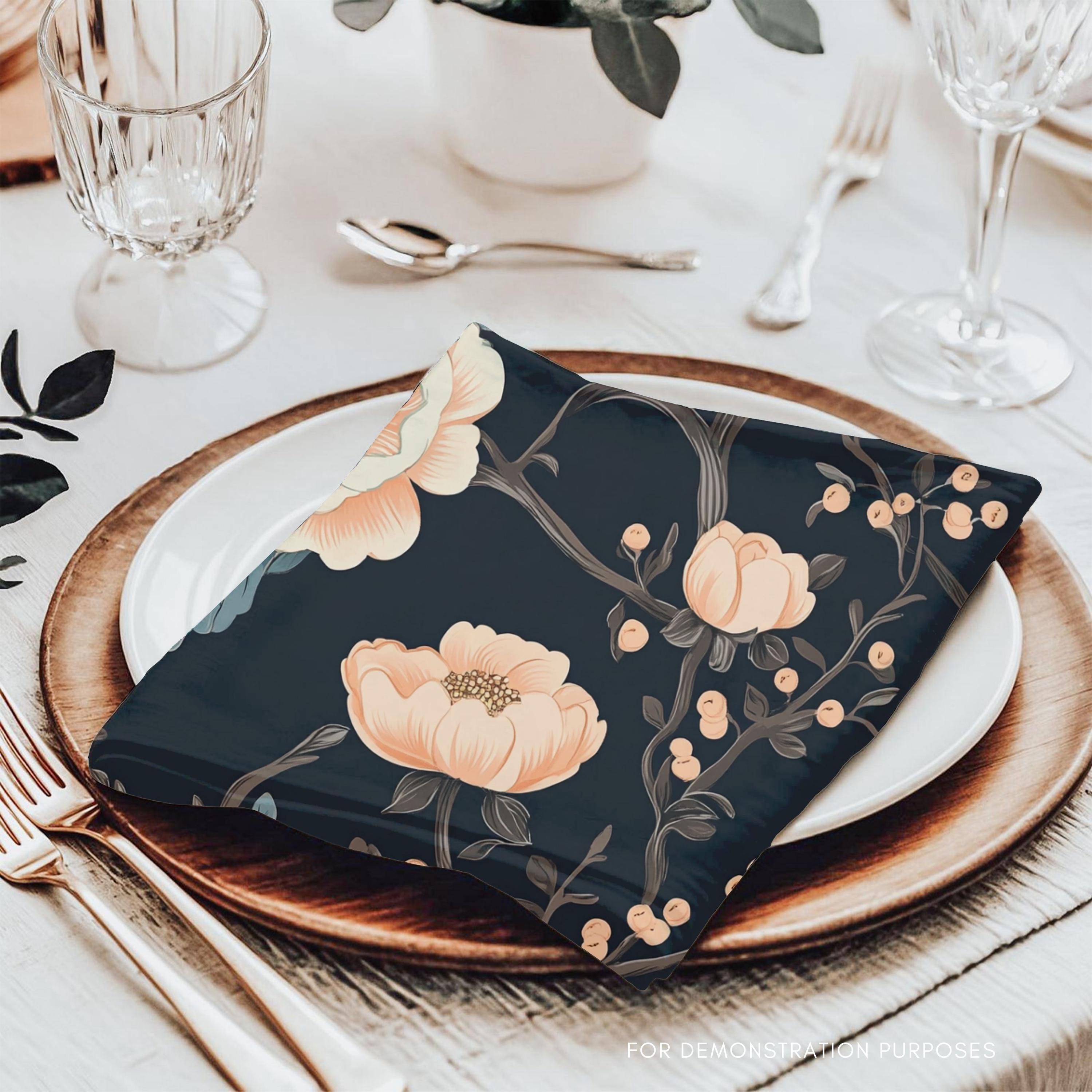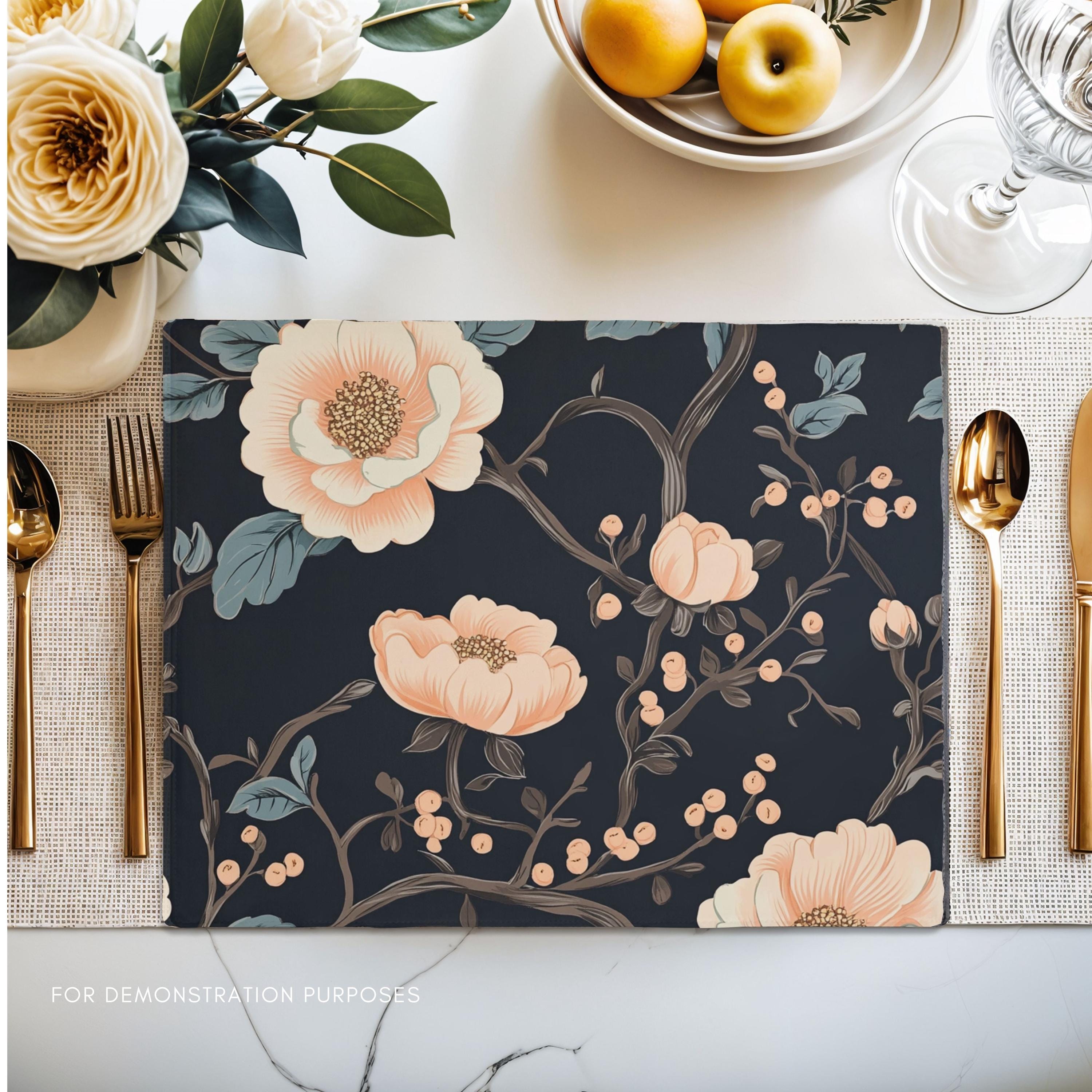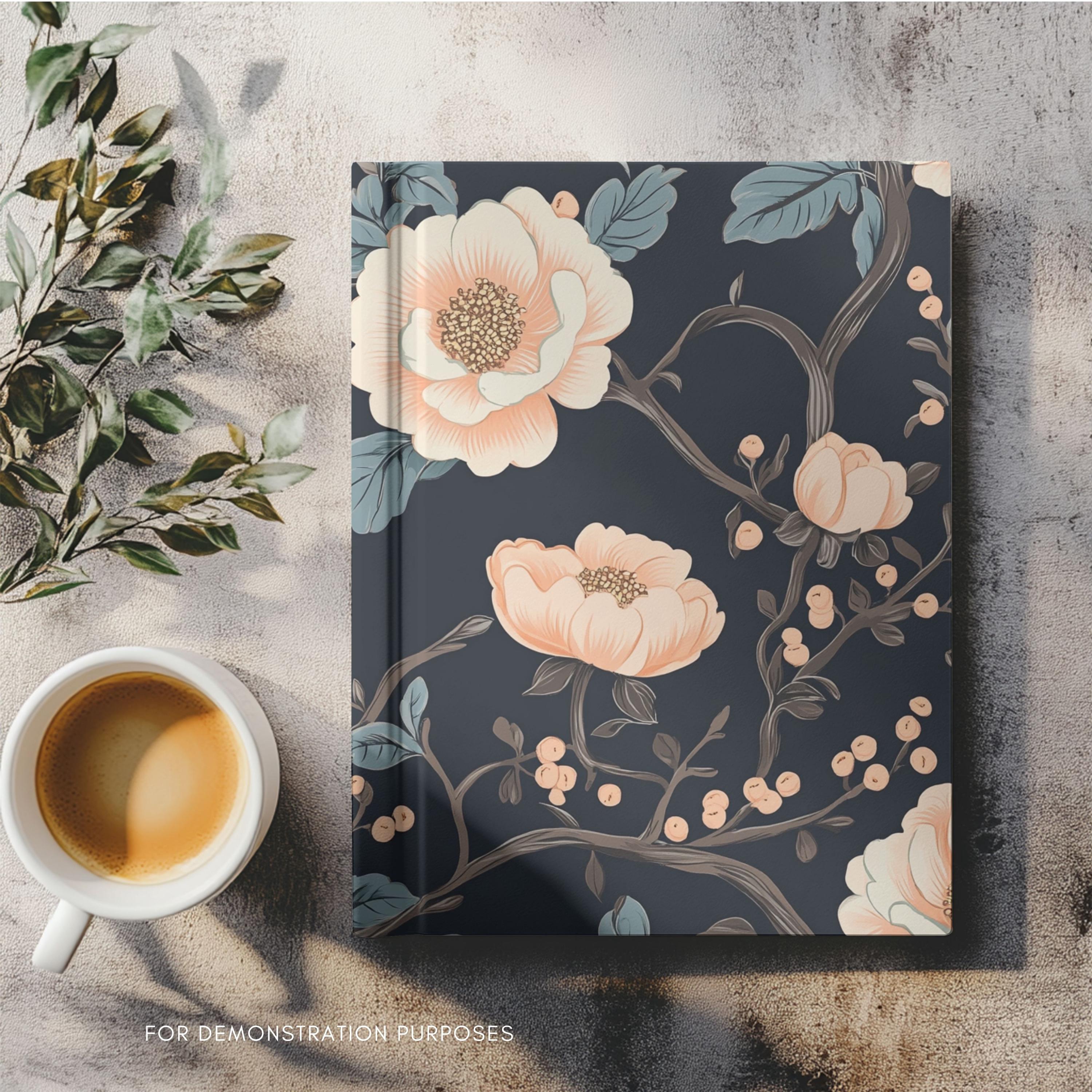 A striking contrast of creamy blush florals and pale coral berries unfurls over a velvety midnight-blue ground. Vintage-inspired yet boldly modern, this seamless pattern marries botanical whimsy with crisp, illustrative precision—perfect for elegant textiles with a hint of enchantment.