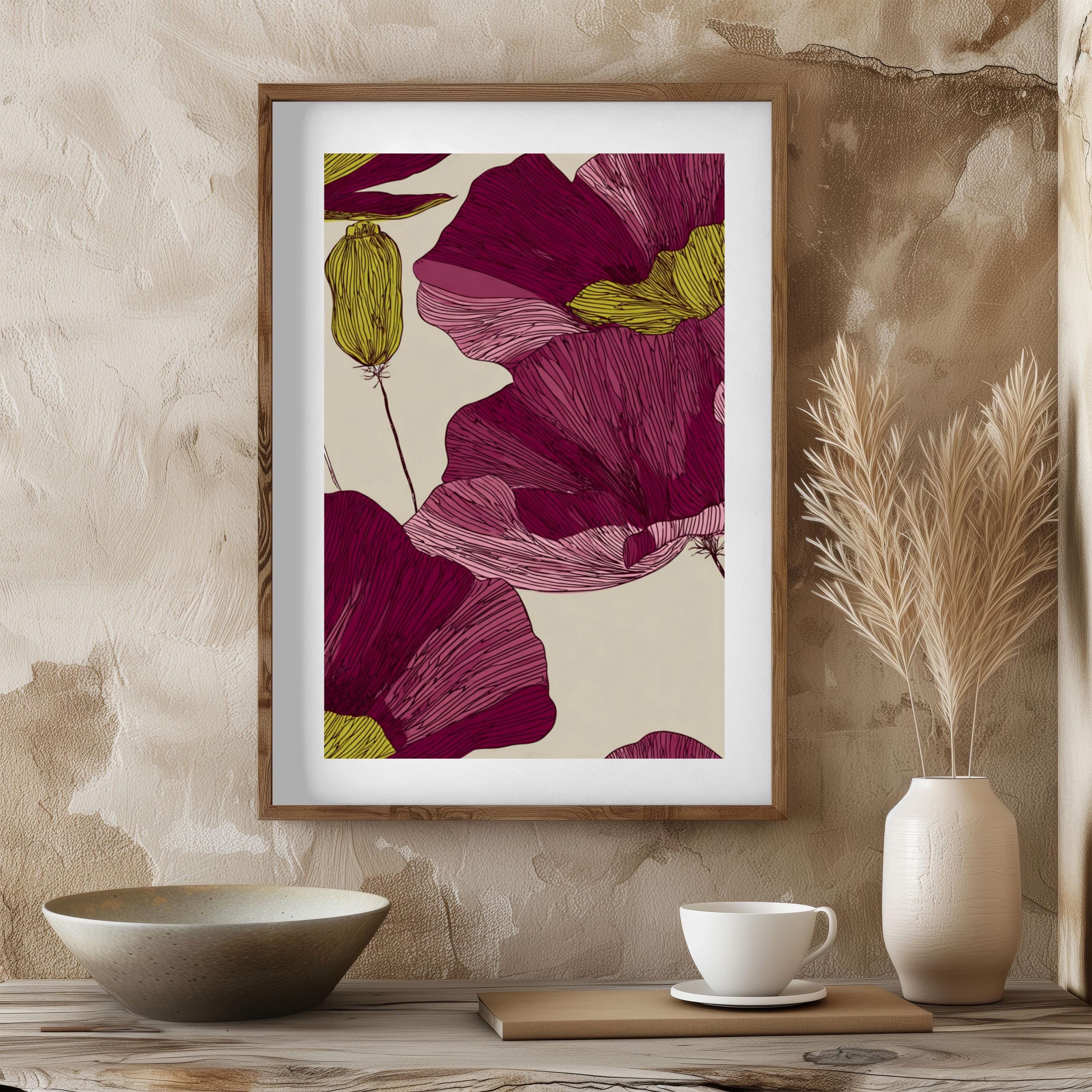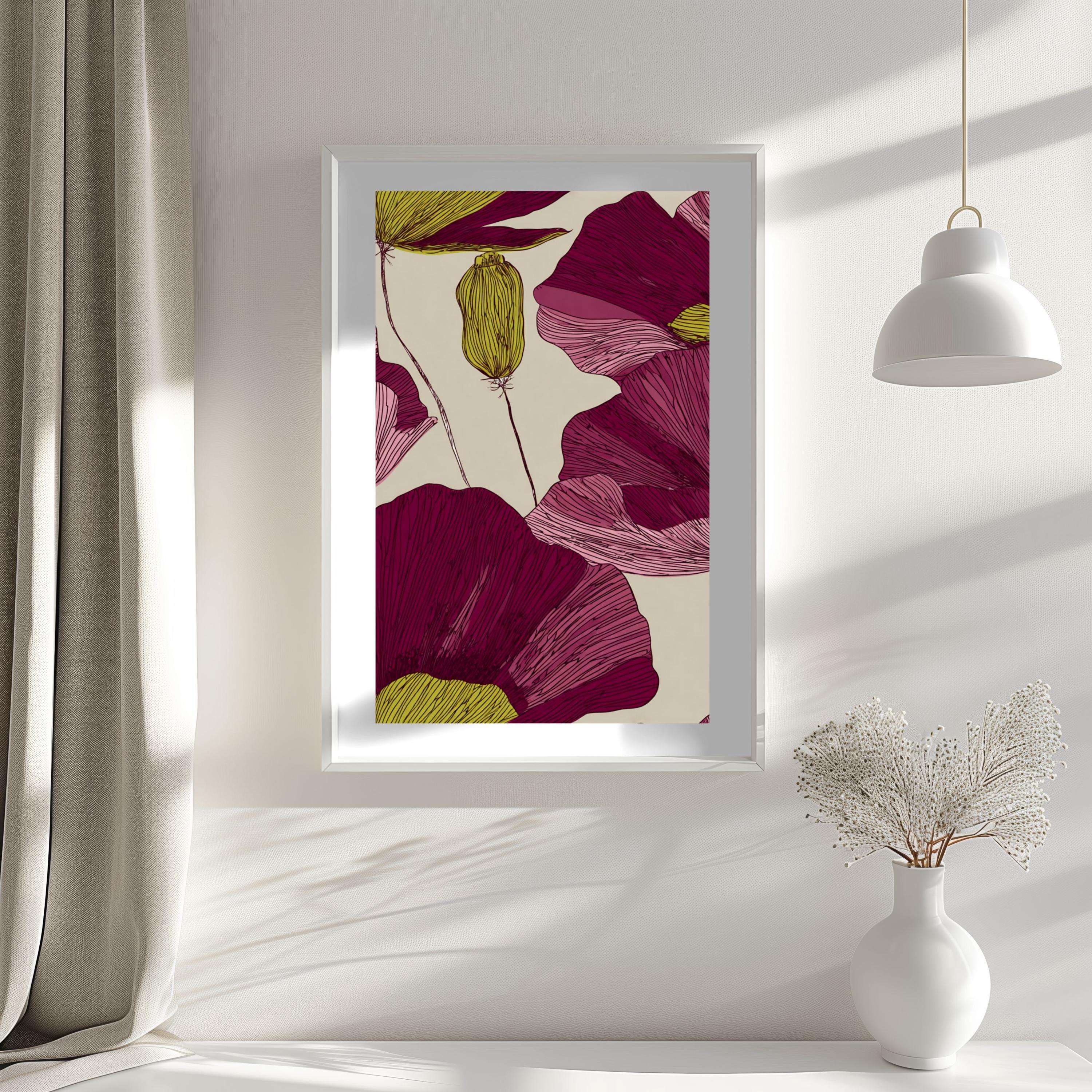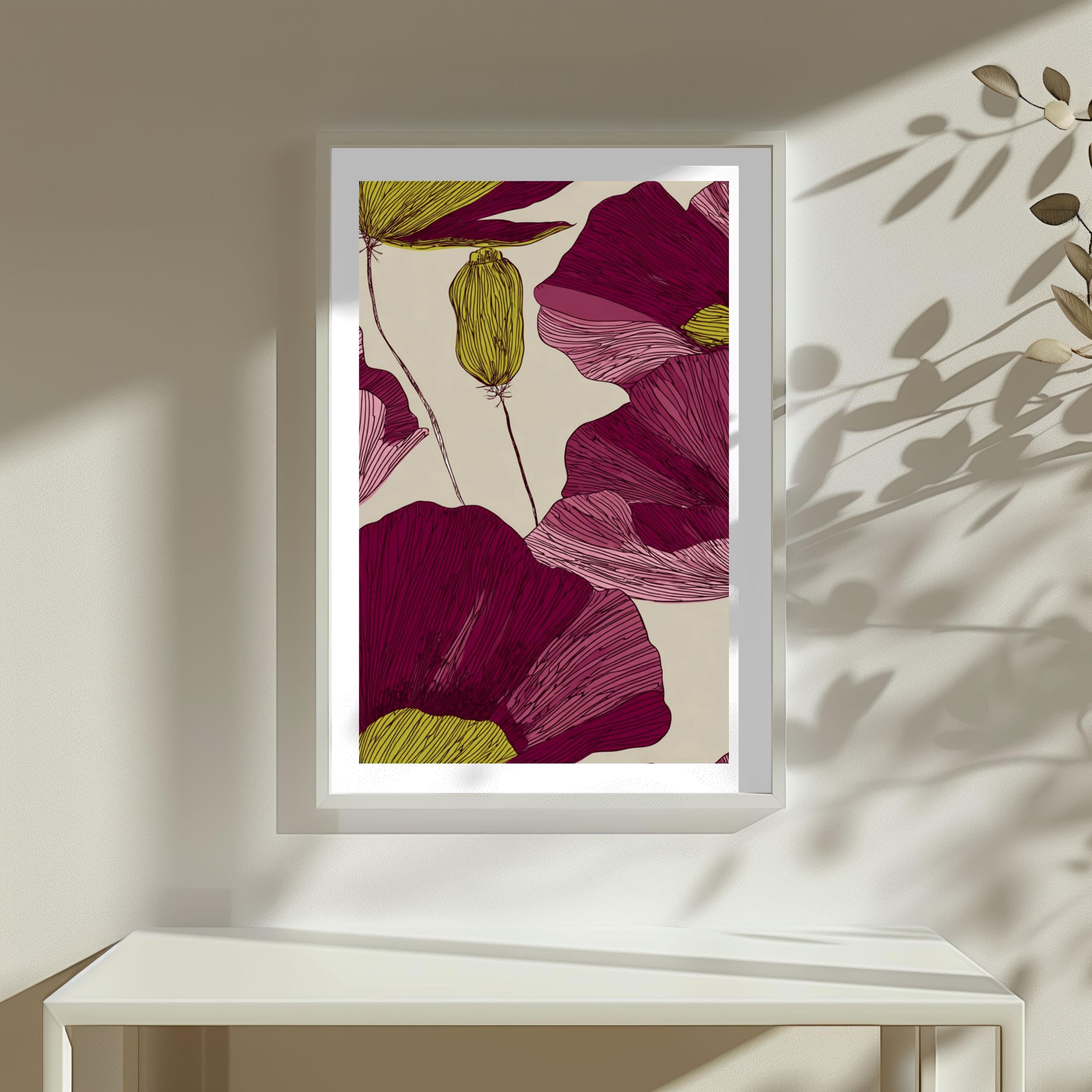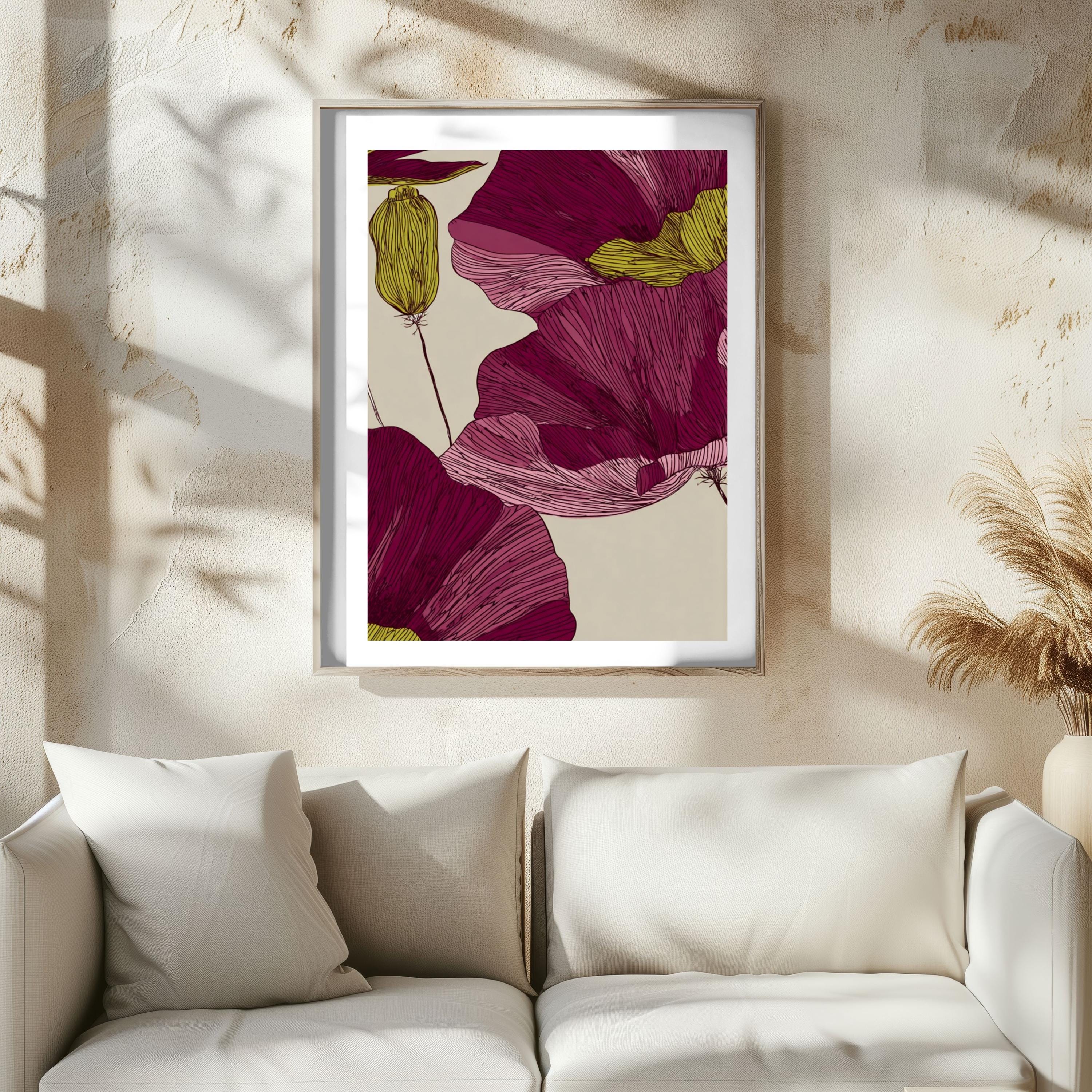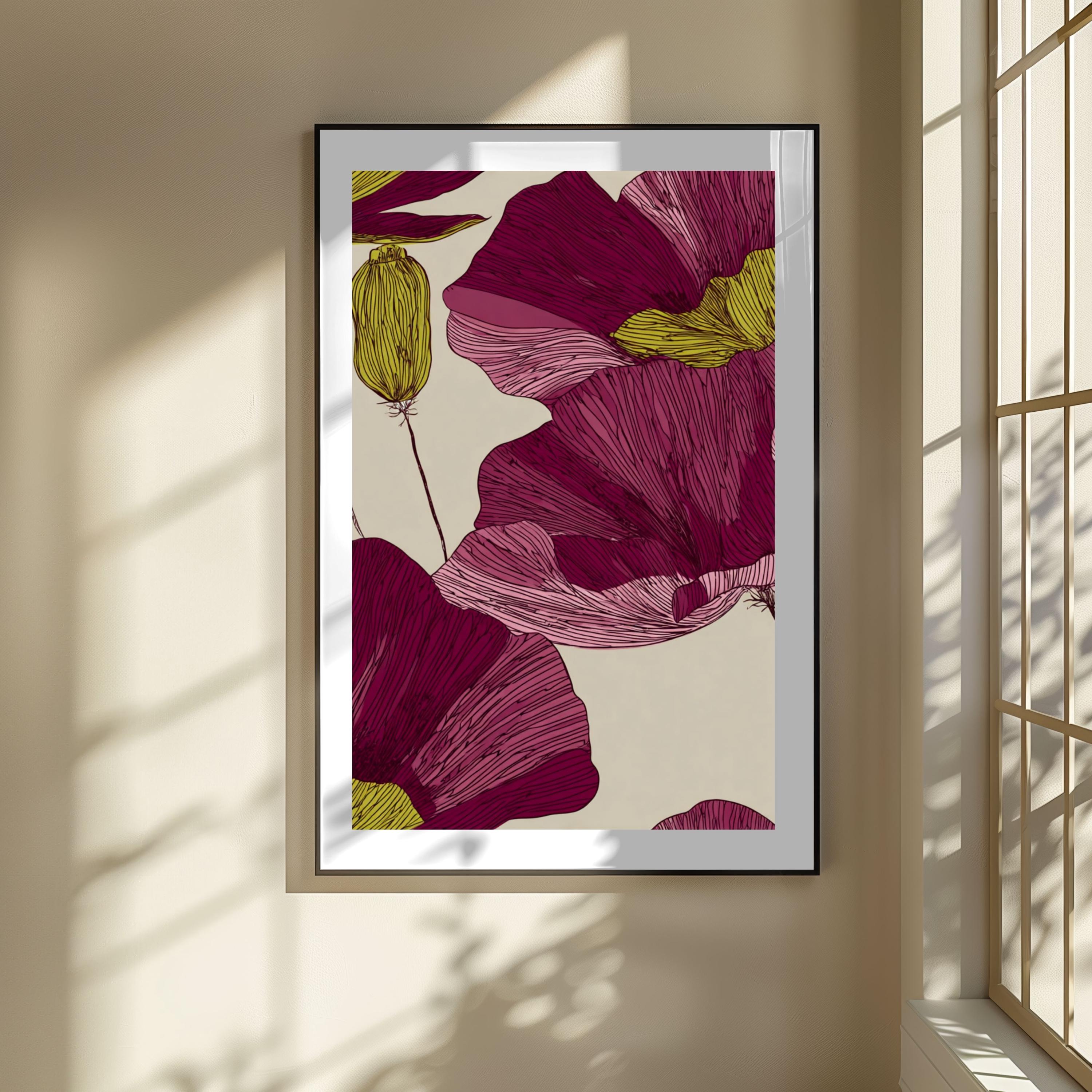 Bring a bold, modern touch to your home with this stunning digital download featuring vibrant magenta, deep purple, and lime-green florals. This unique, hand-drawn line art captures the drama of nature in a sophisticated, contemporary style. Perfect for creating an unforgettable focal point in your living room, bedroom, or home office.