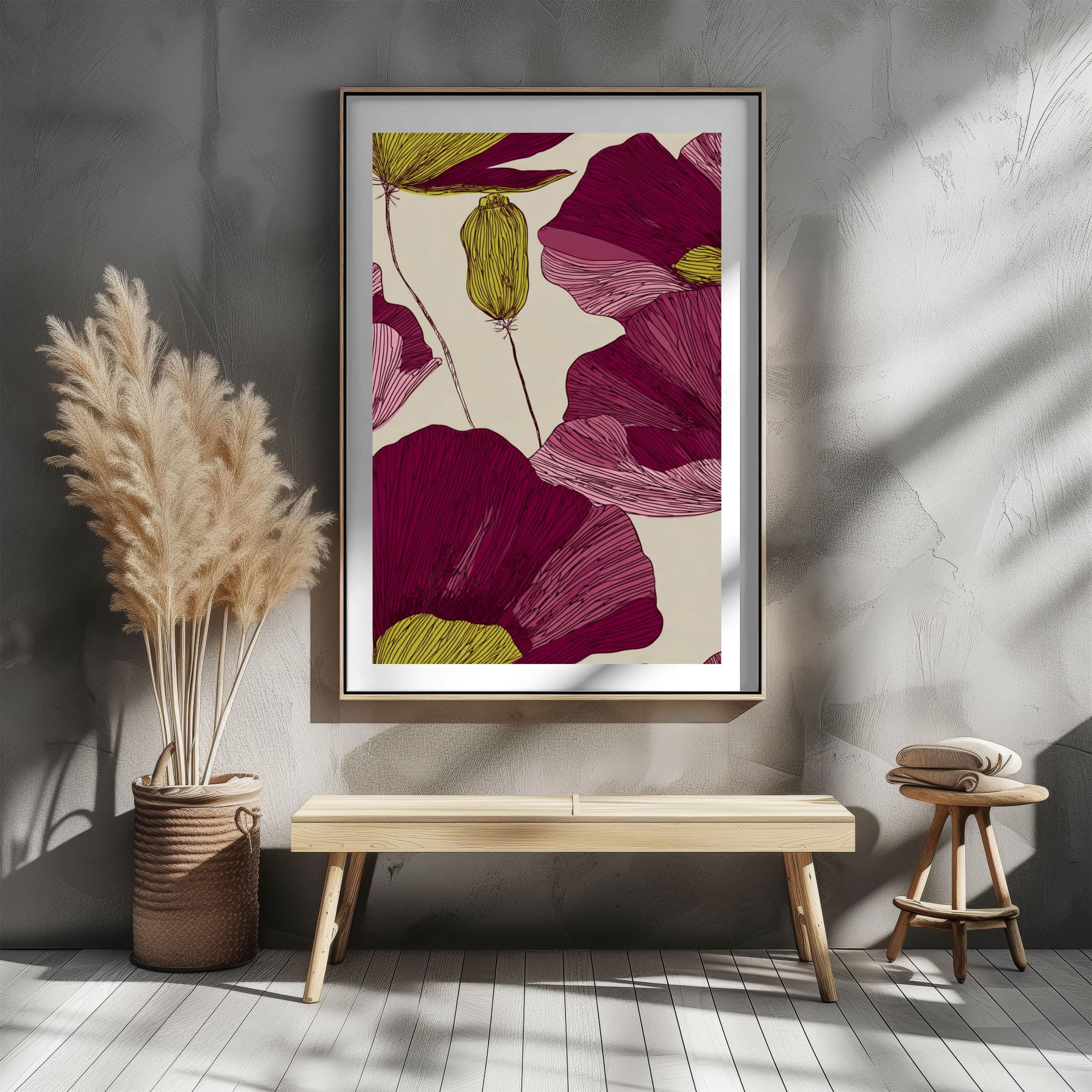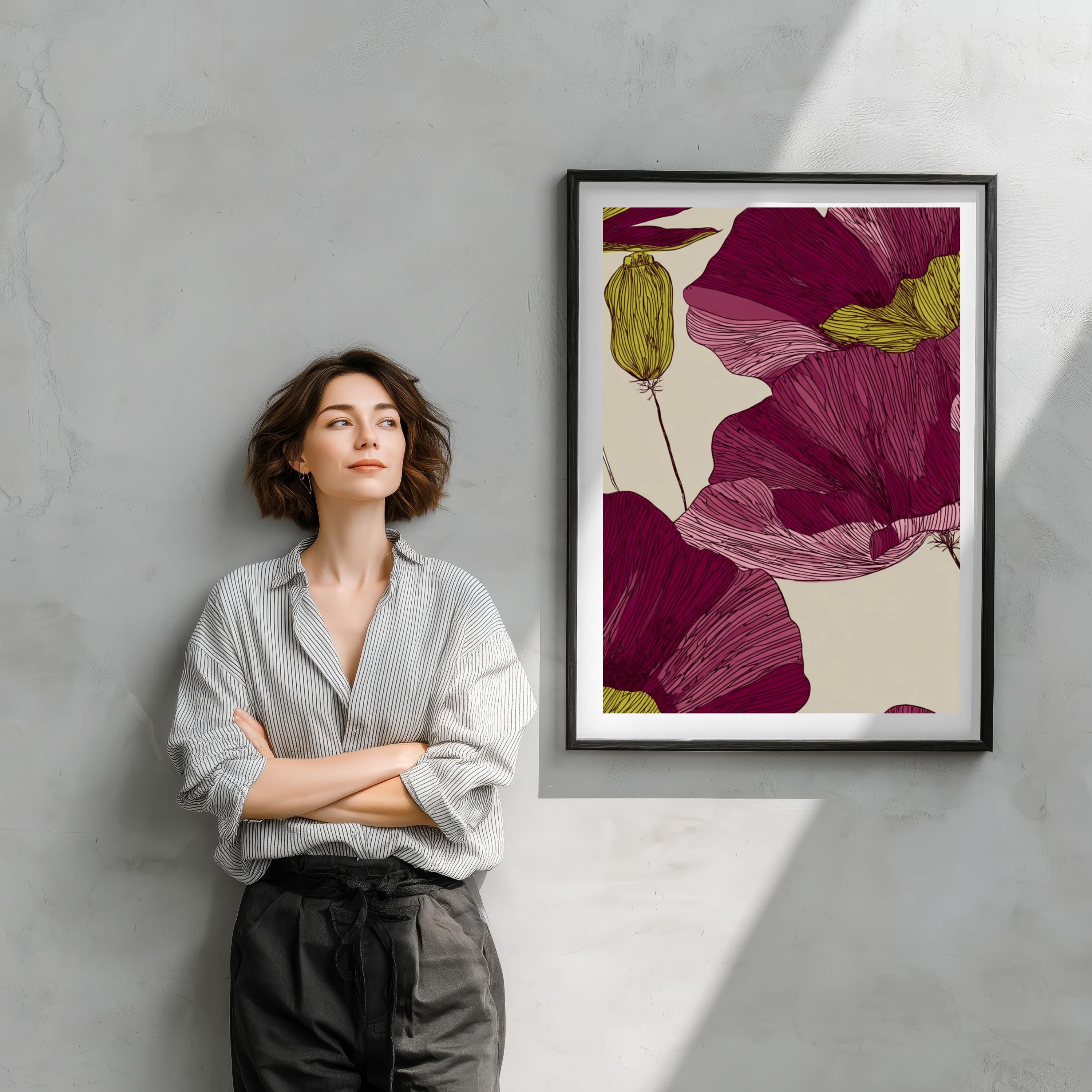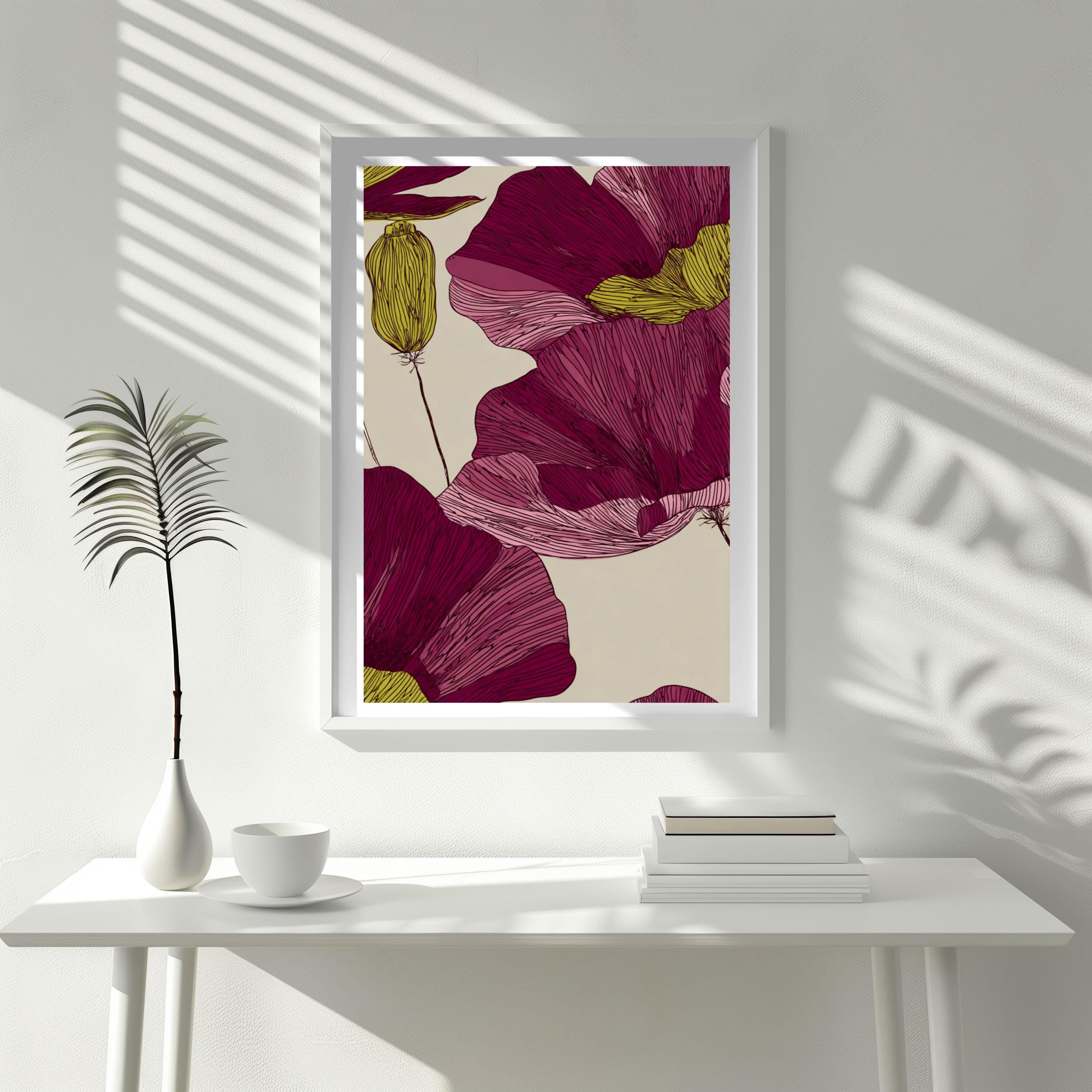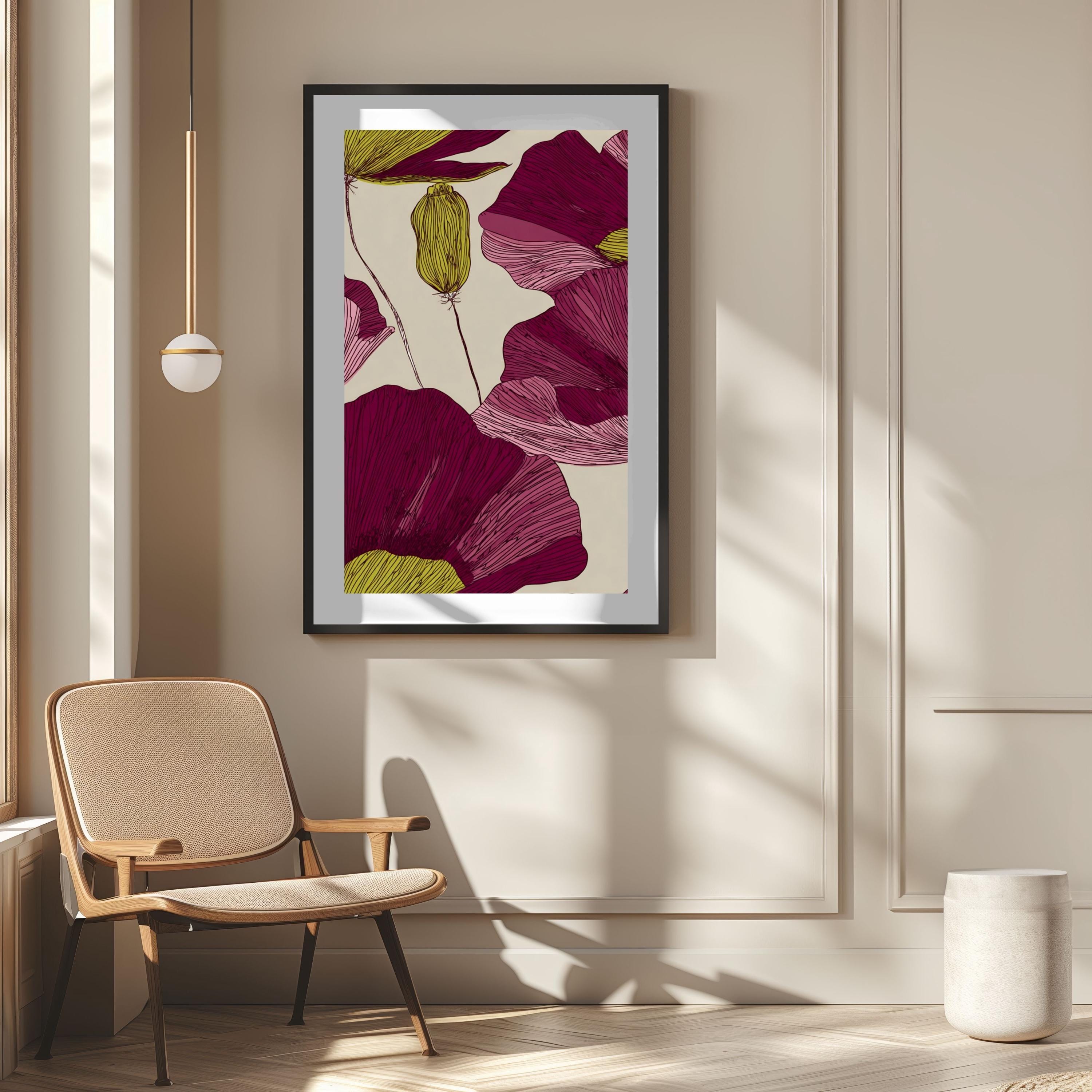 Bring a bold, modern touch to your home with this stunning digital download featuring vibrant magenta, deep purple, and lime-green florals. This unique, hand-drawn line art captures the drama of nature in a sophisticated, contemporary style. Perfect for creating an unforgettable focal point in your living room, bedroom, or home office.