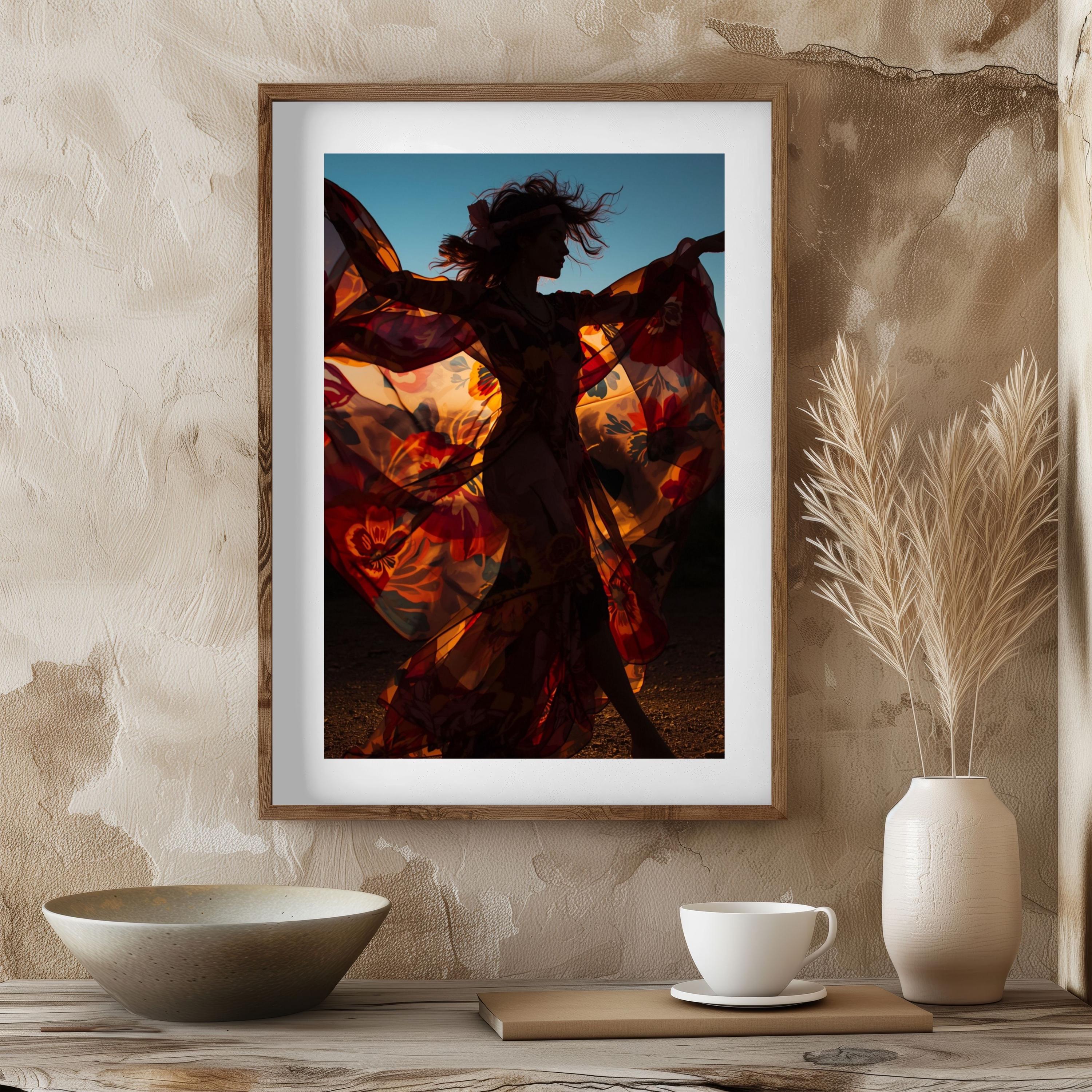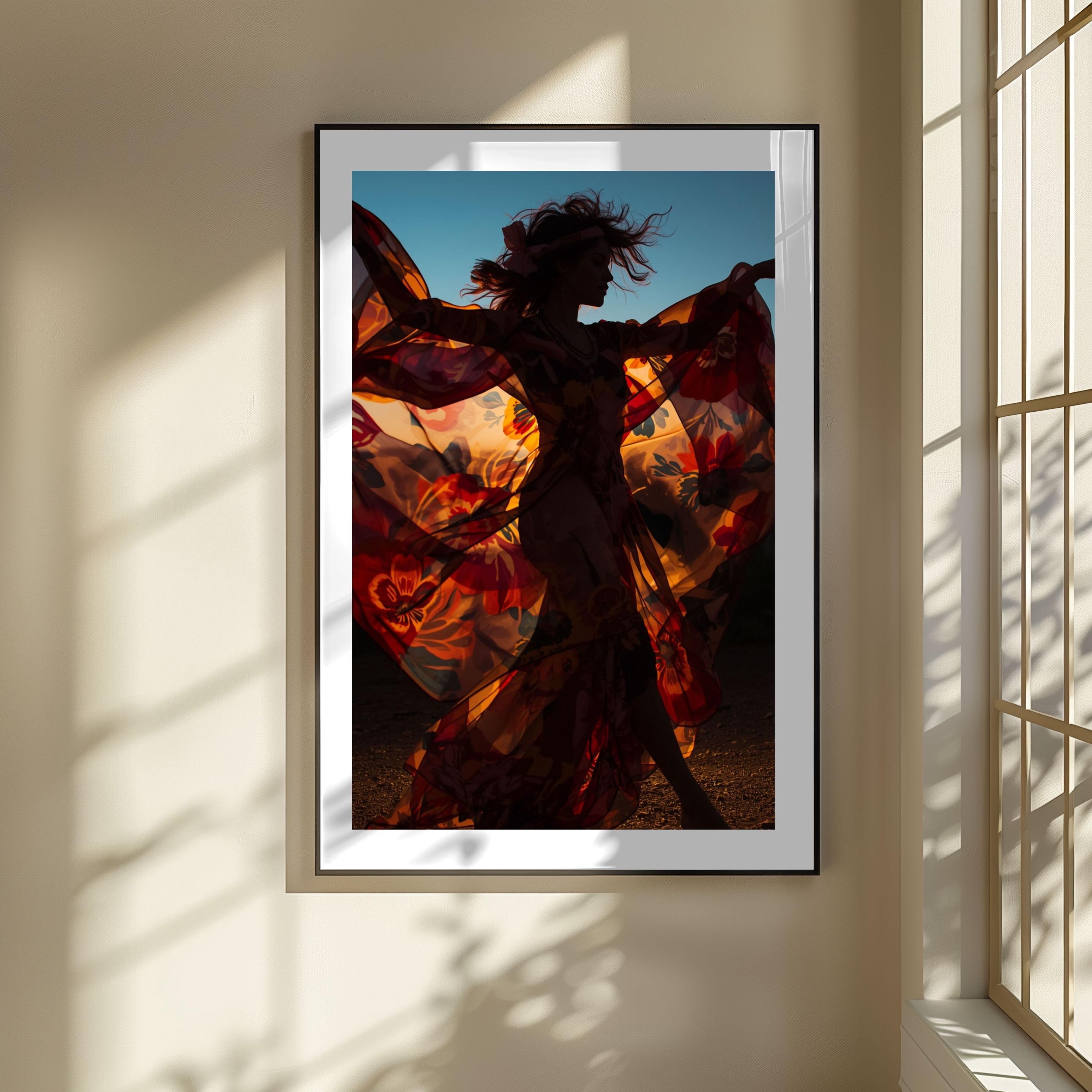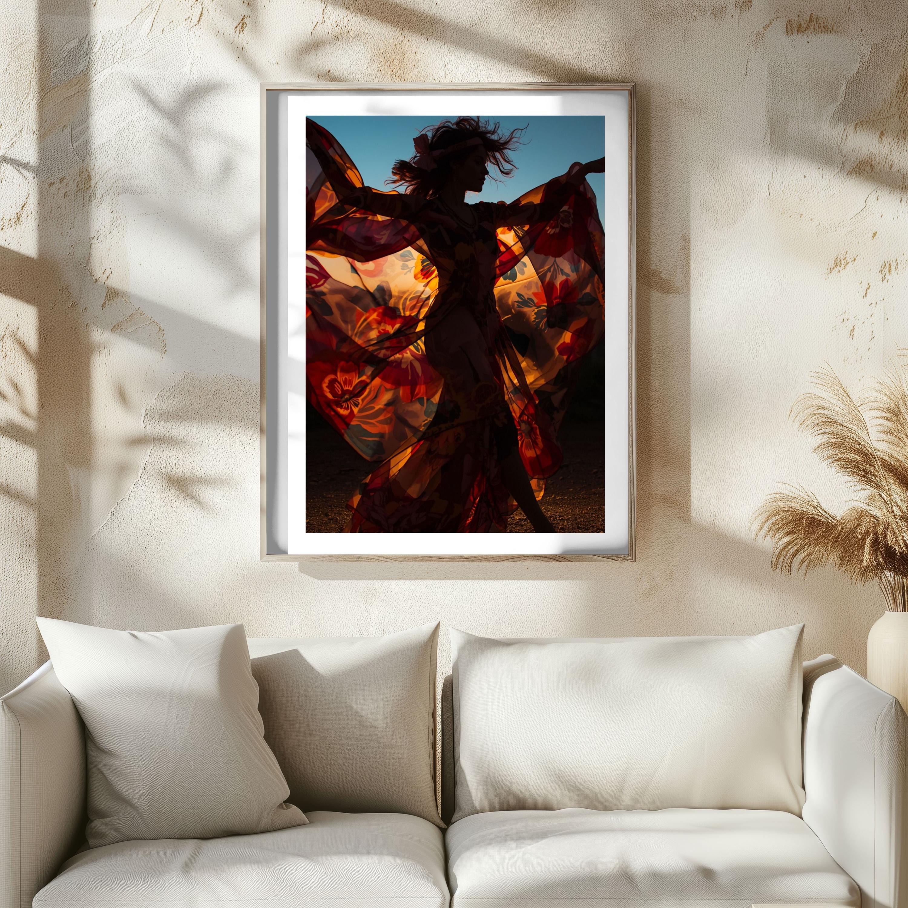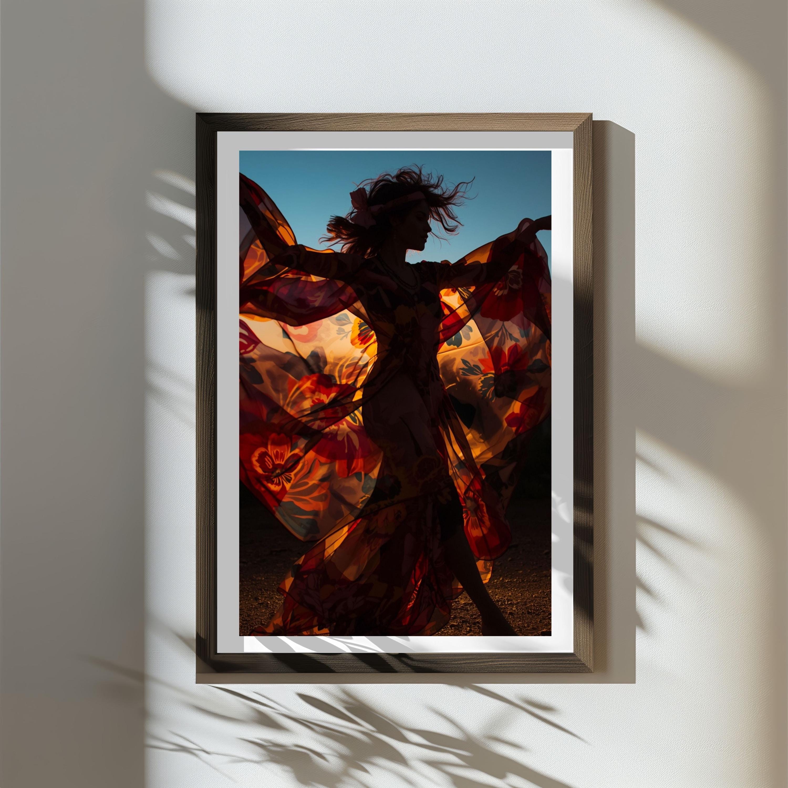 Bring captivating warmth and extraordinary movement into your space with this cinematic digital art print. This dancing silhouette is wrapped in billowing fabric that glows with the light of dusk, adorned with oversized orange, red, and yellow florals. It's a high-impact, statement-making piece perfect for adding a sense of freedom and energy to your decor.