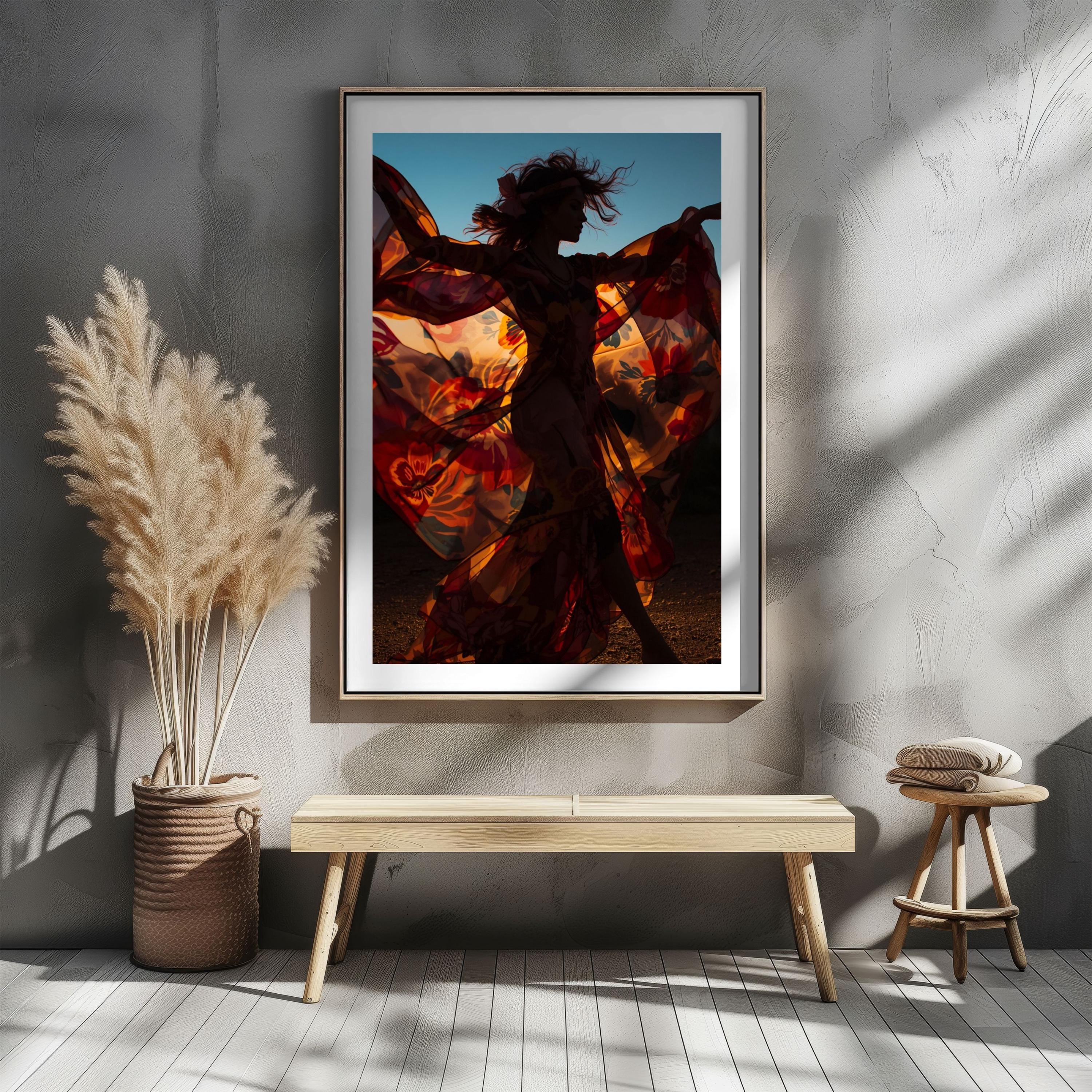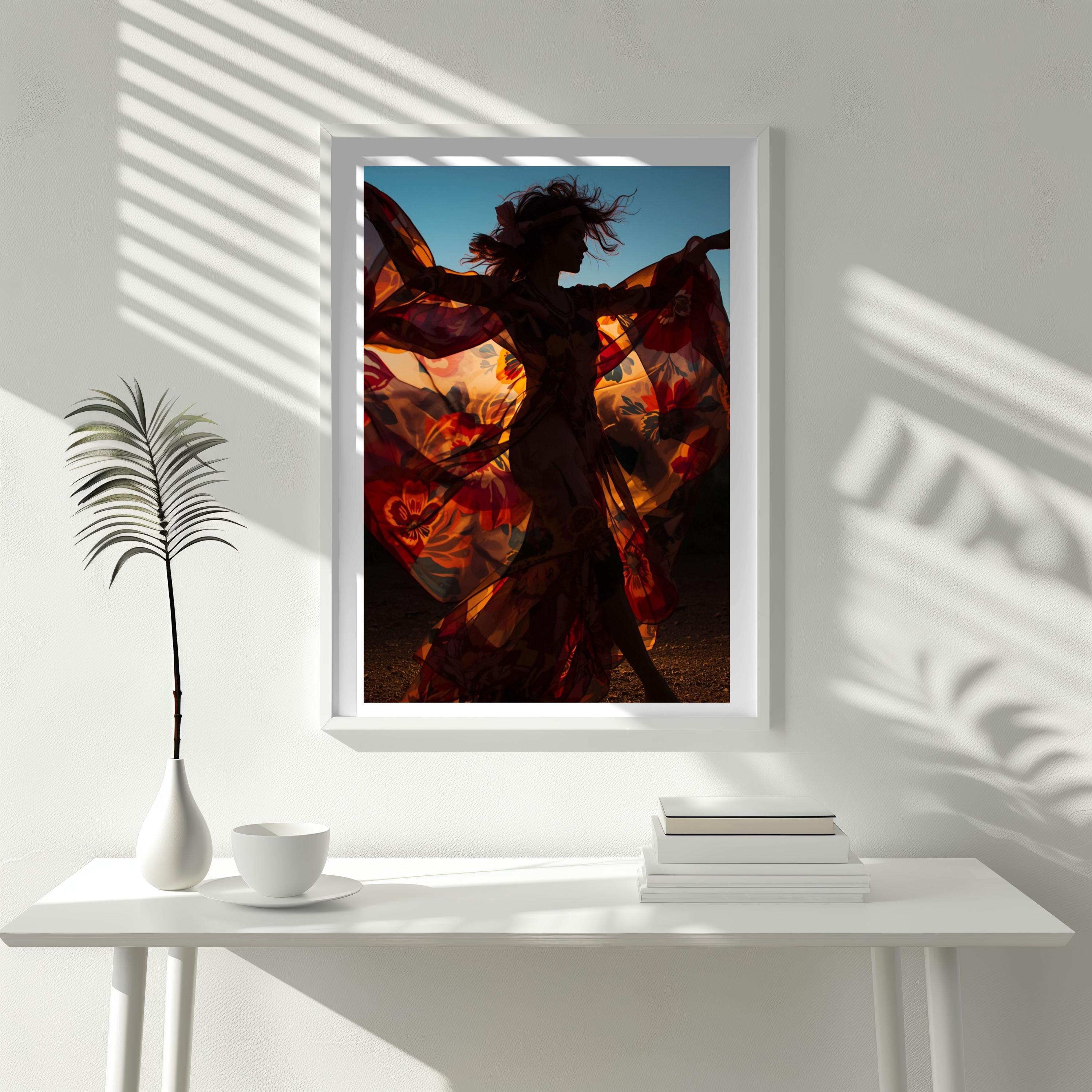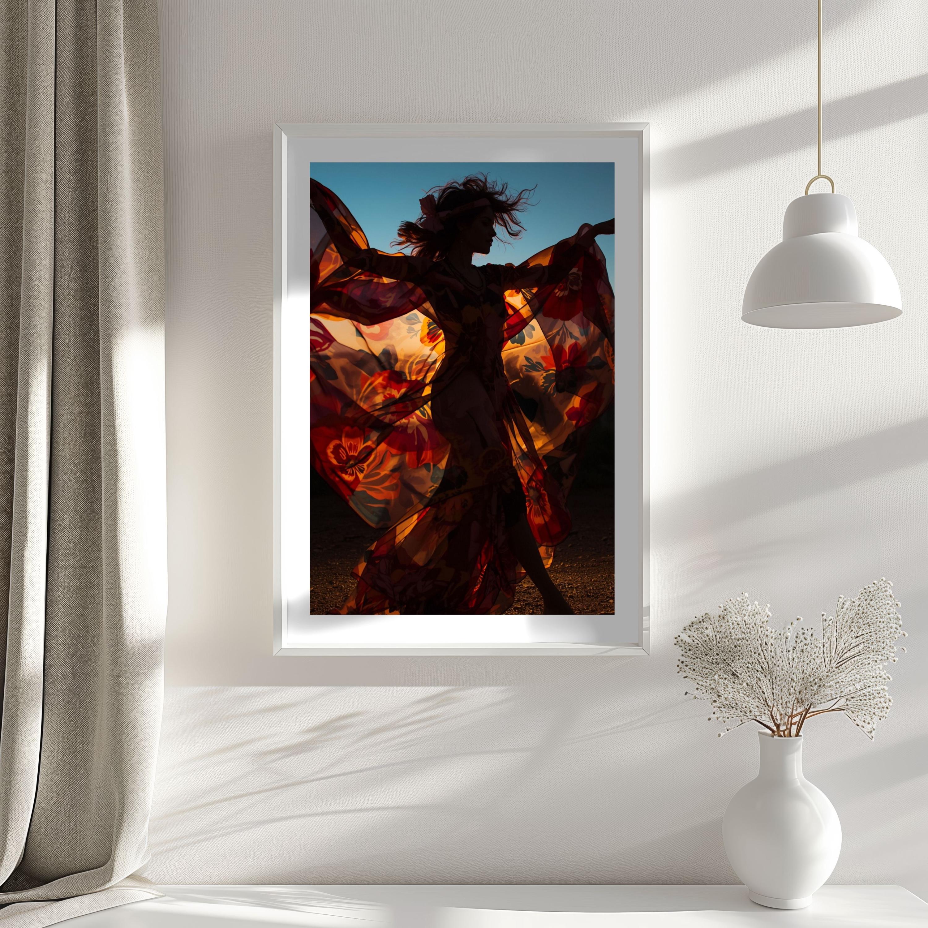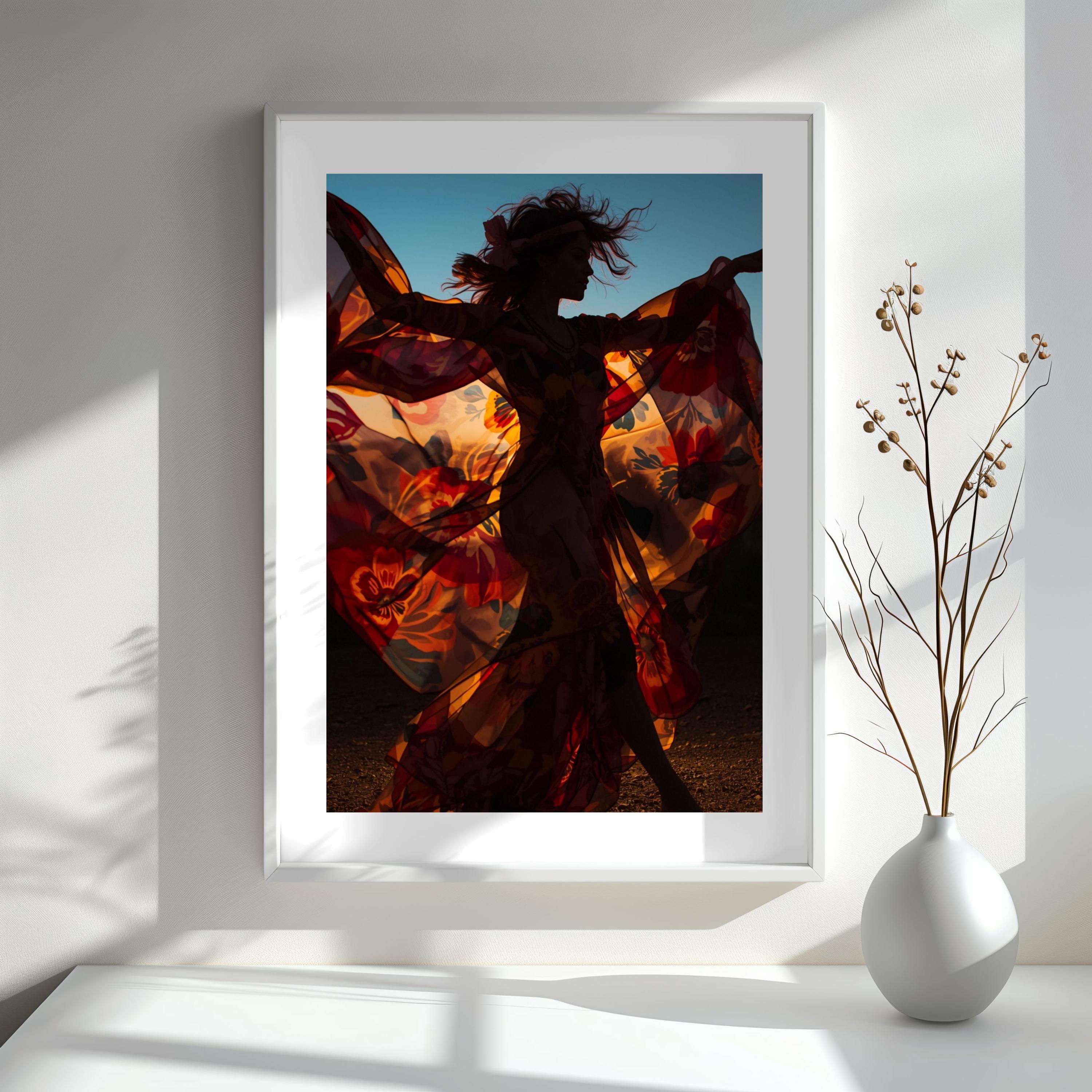 Bring captivating warmth and extraordinary movement into your space with this cinematic digital art print. This dancing silhouette is wrapped in billowing fabric that glows with the light of dusk, adorned with oversized orange, red, and yellow florals. It's a high-impact, statement-making piece perfect for adding a sense of freedom and energy to your decor.