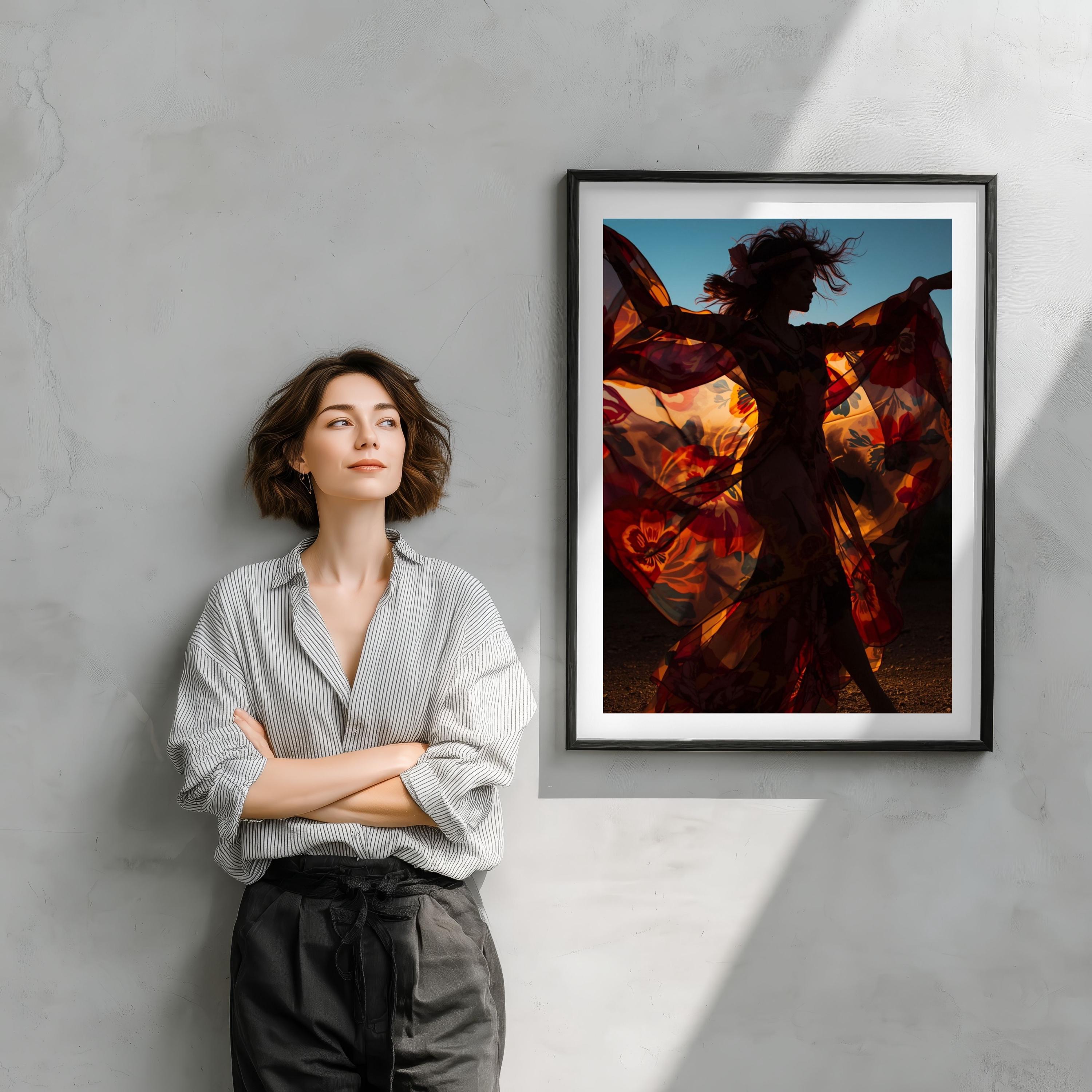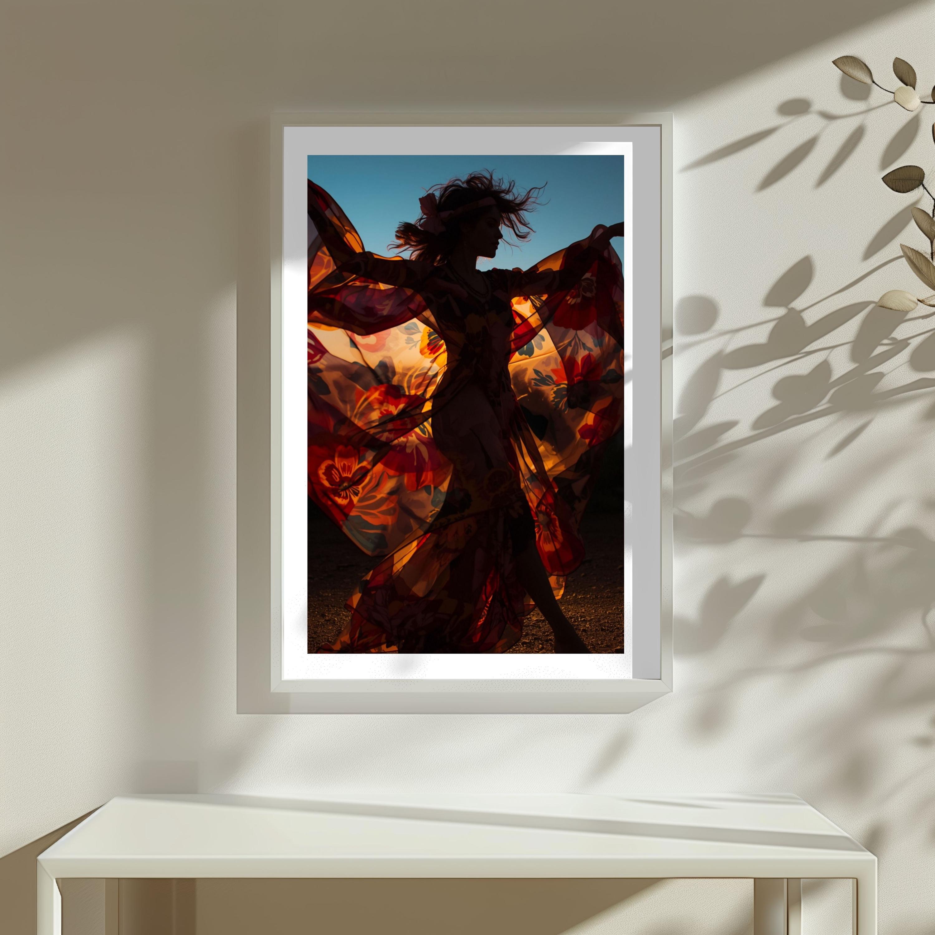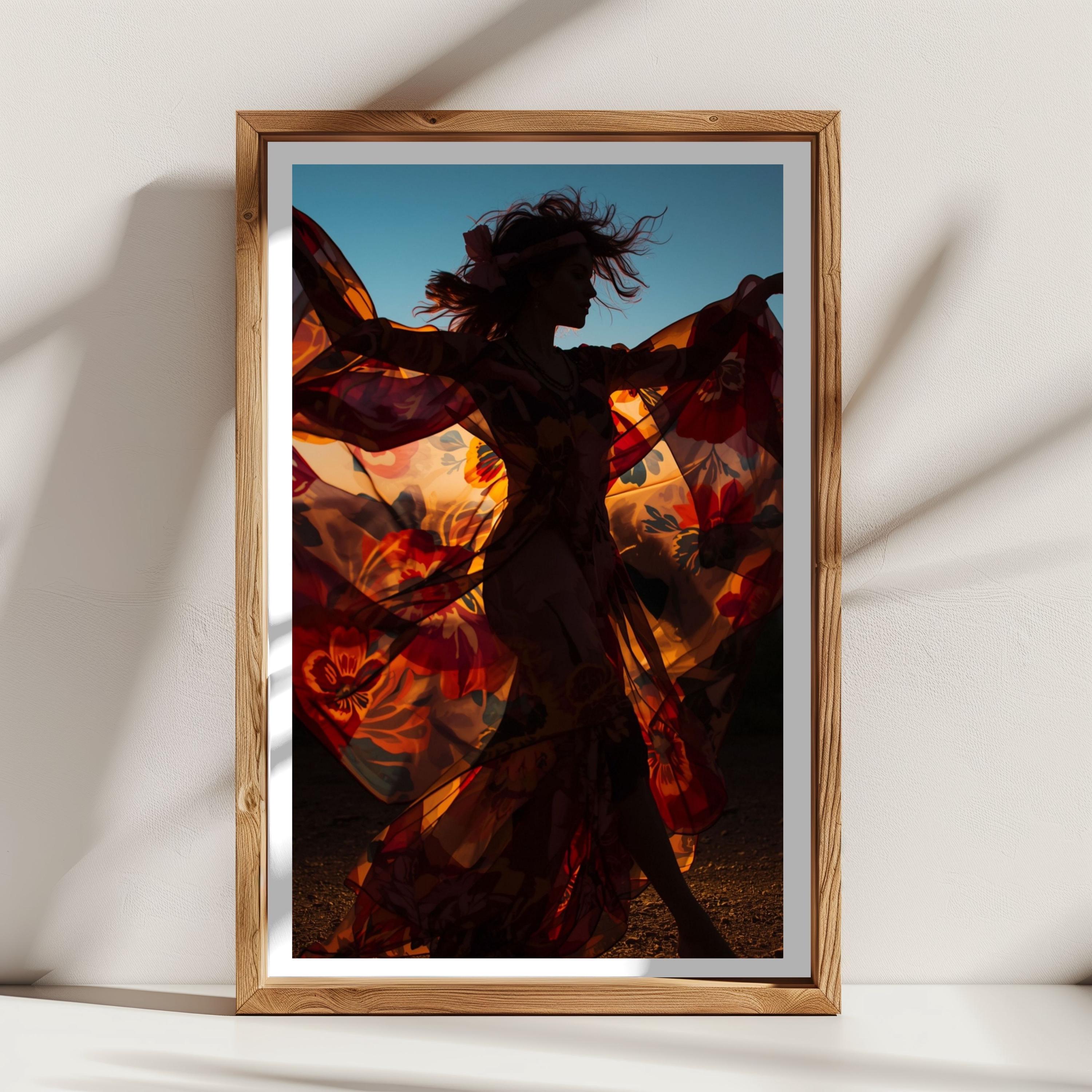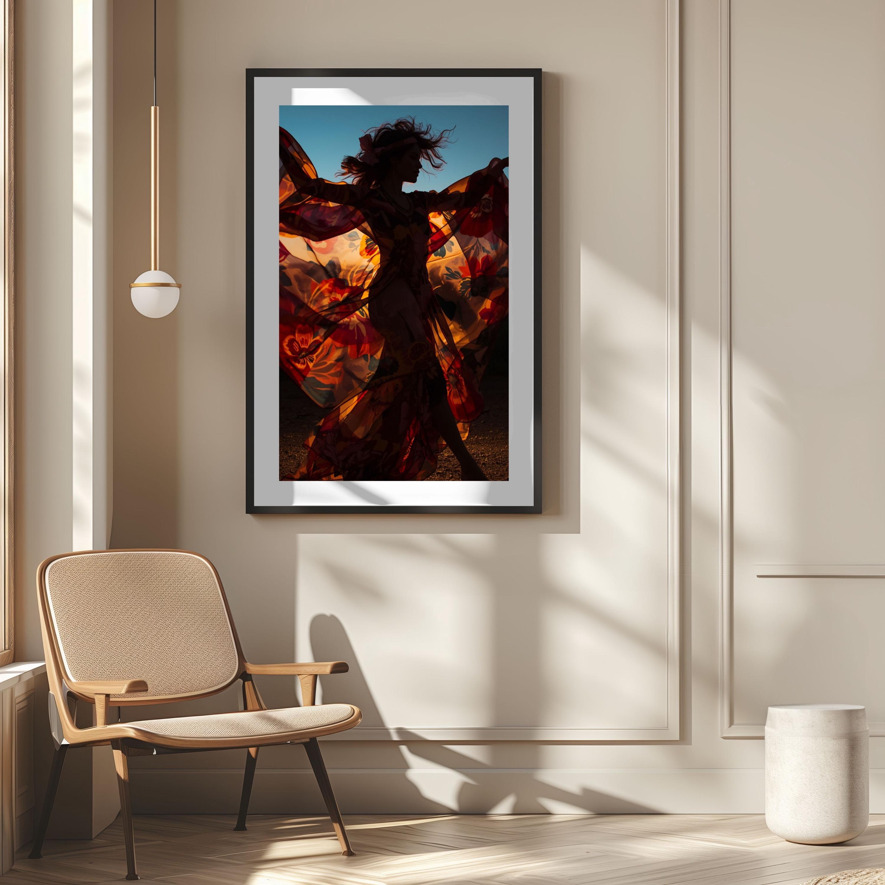 Bring captivating warmth and extraordinary movement into your space with this cinematic digital art print. This dancing silhouette is wrapped in billowing fabric that glows with the light of dusk, adorned with oversized orange, red, and yellow florals. It's a high-impact, statement-making piece perfect for adding a sense of freedom and energy to your decor.