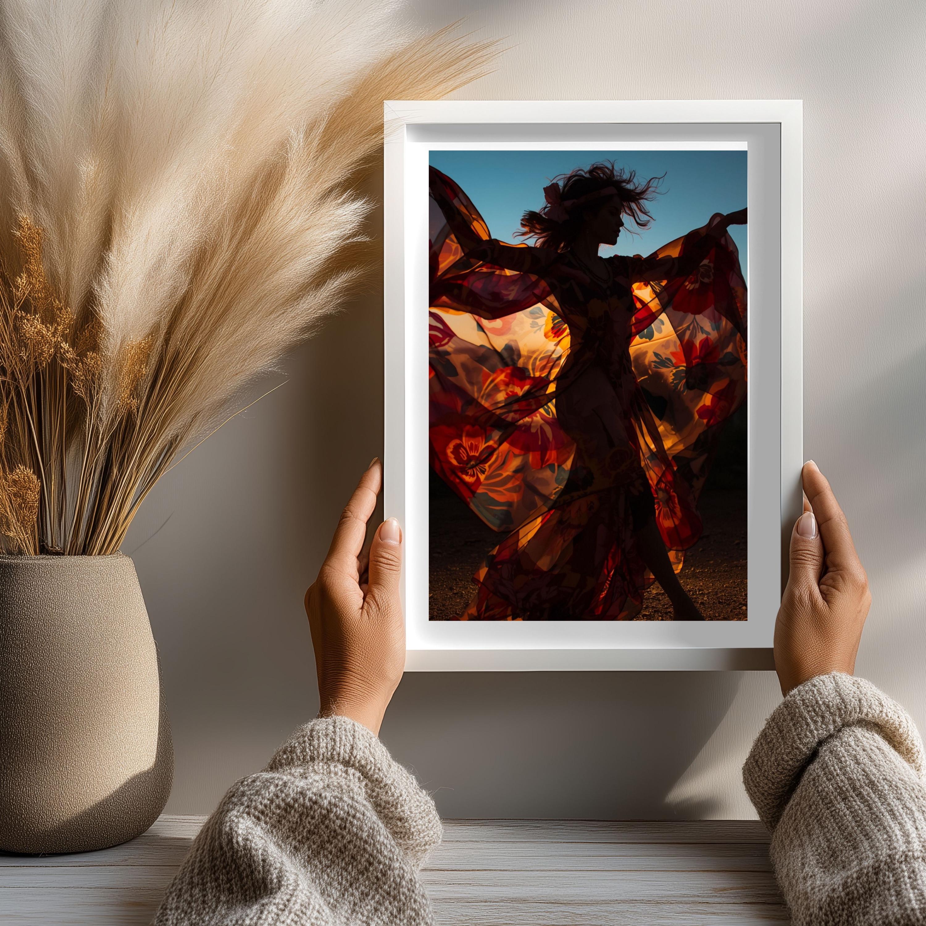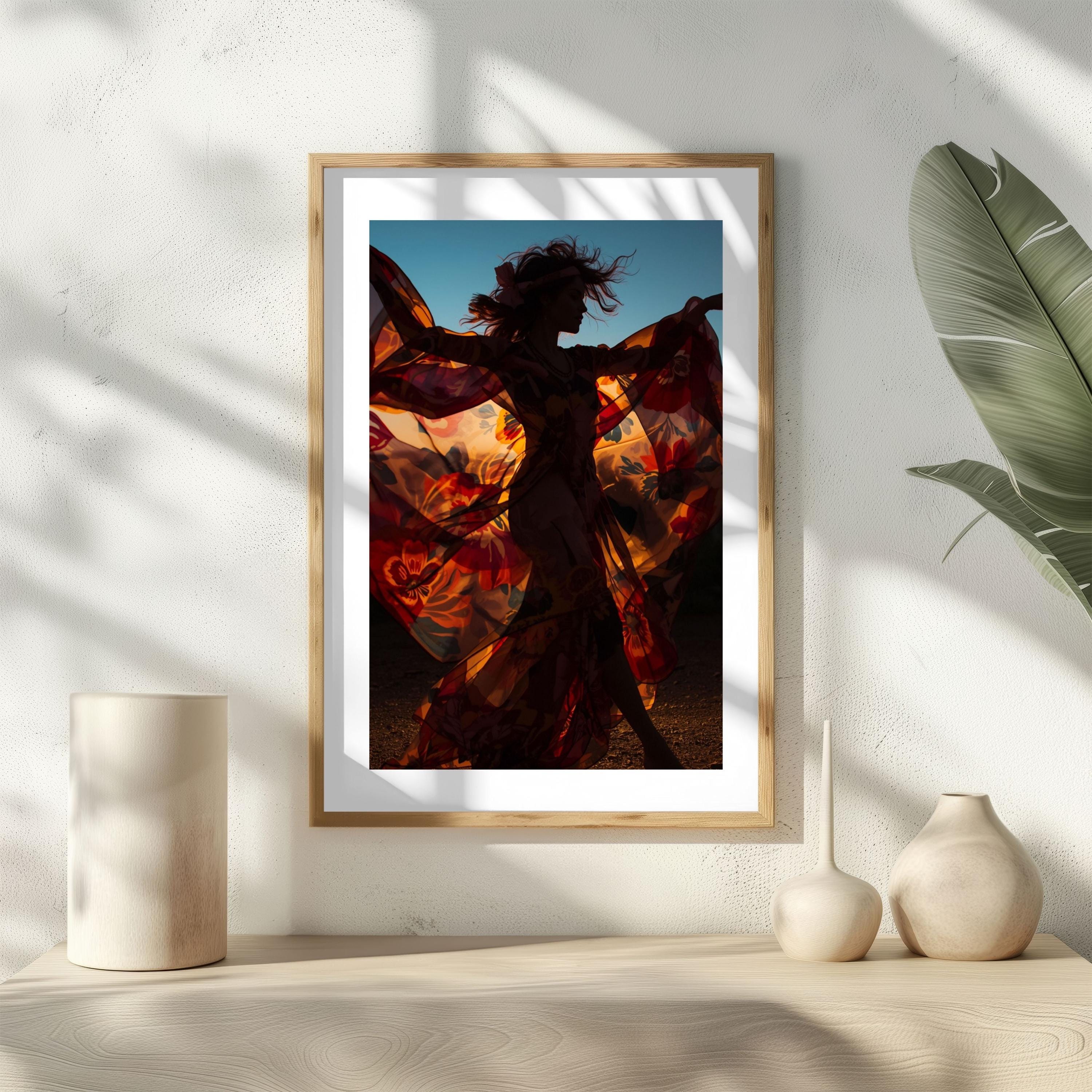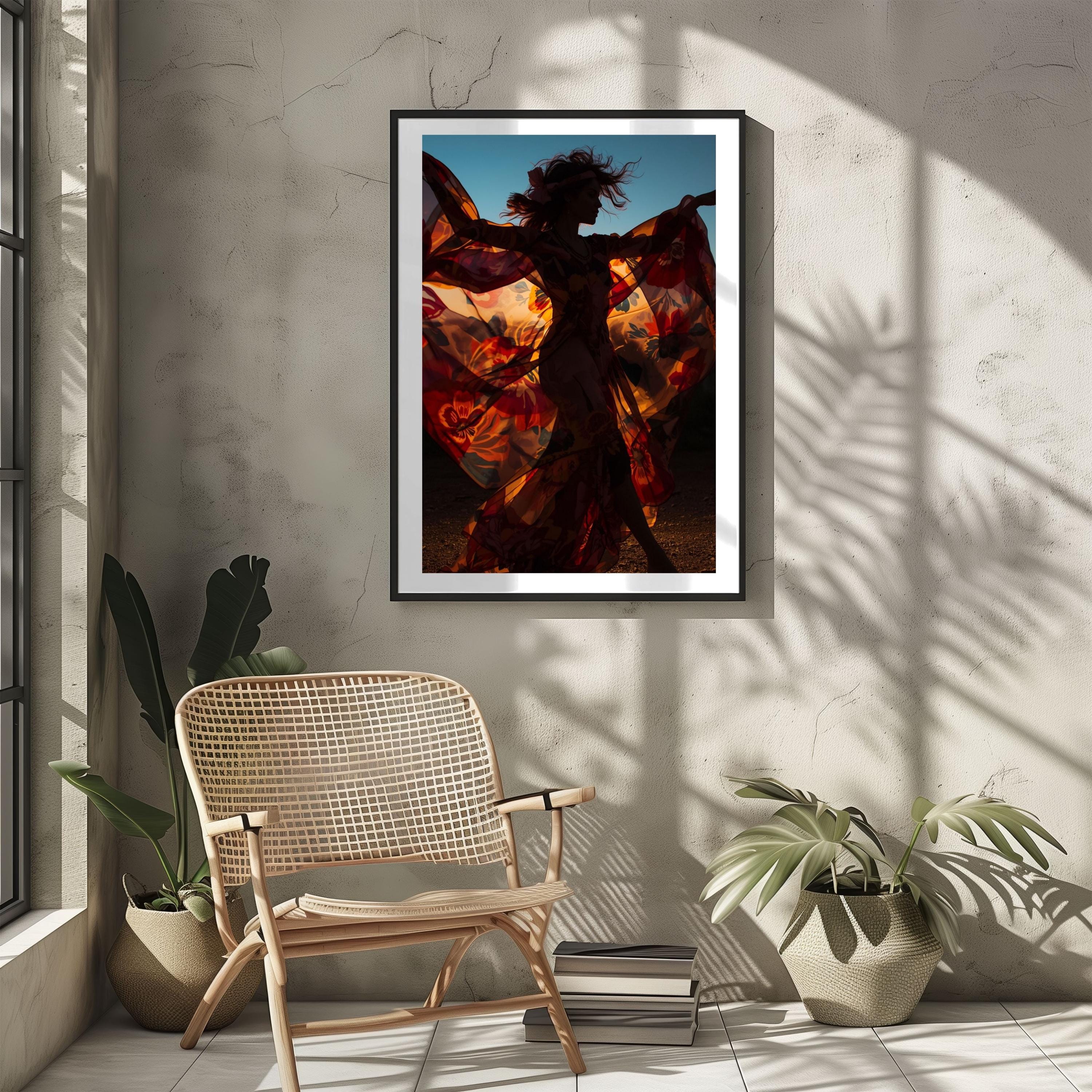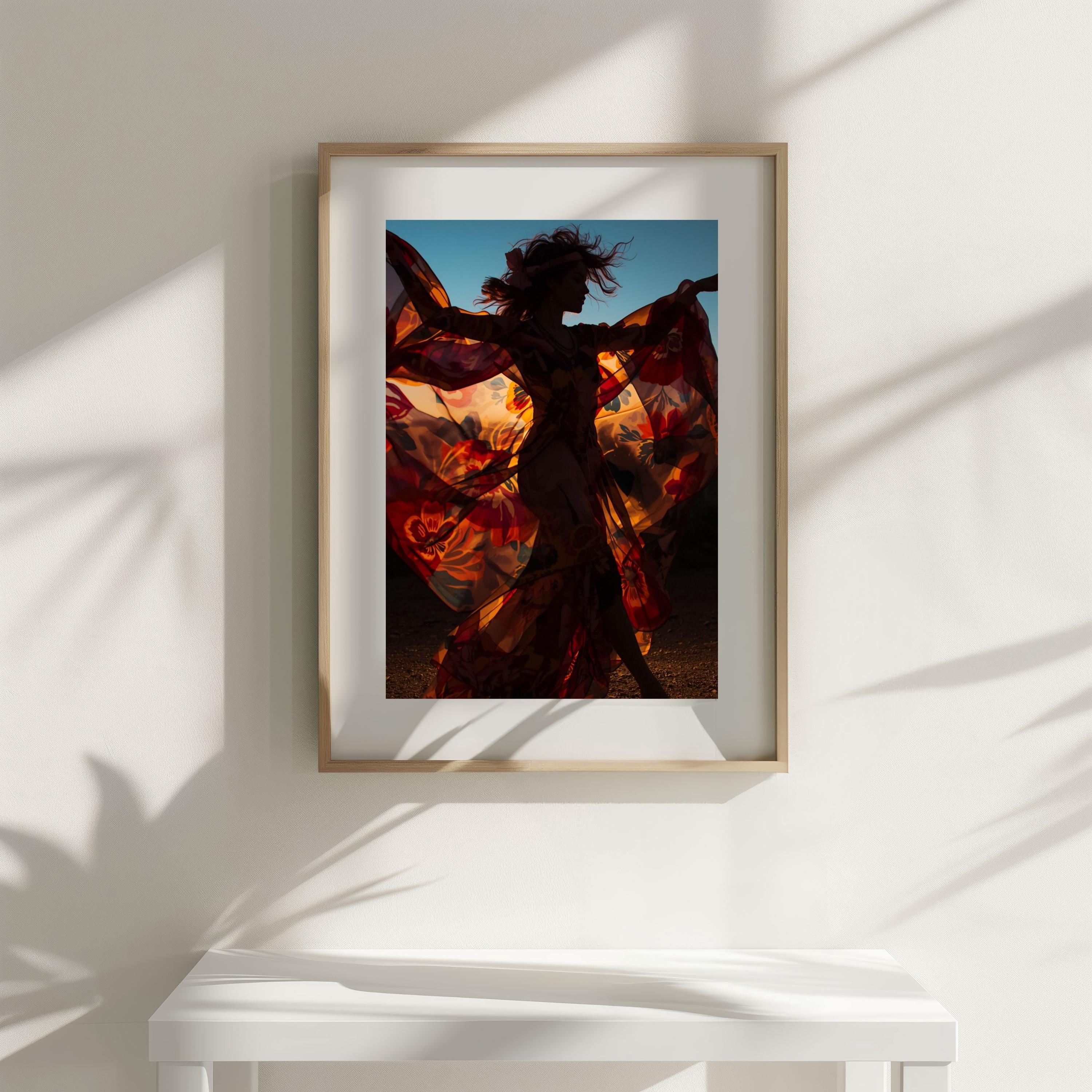 Bring captivating warmth and extraordinary movement into your space with this cinematic digital art print. This dancing silhouette is wrapped in billowing fabric that glows with the light of dusk, adorned with oversized orange, red, and yellow florals. It's a high-impact, statement-making piece perfect for adding a sense of freedom and energy to your decor.