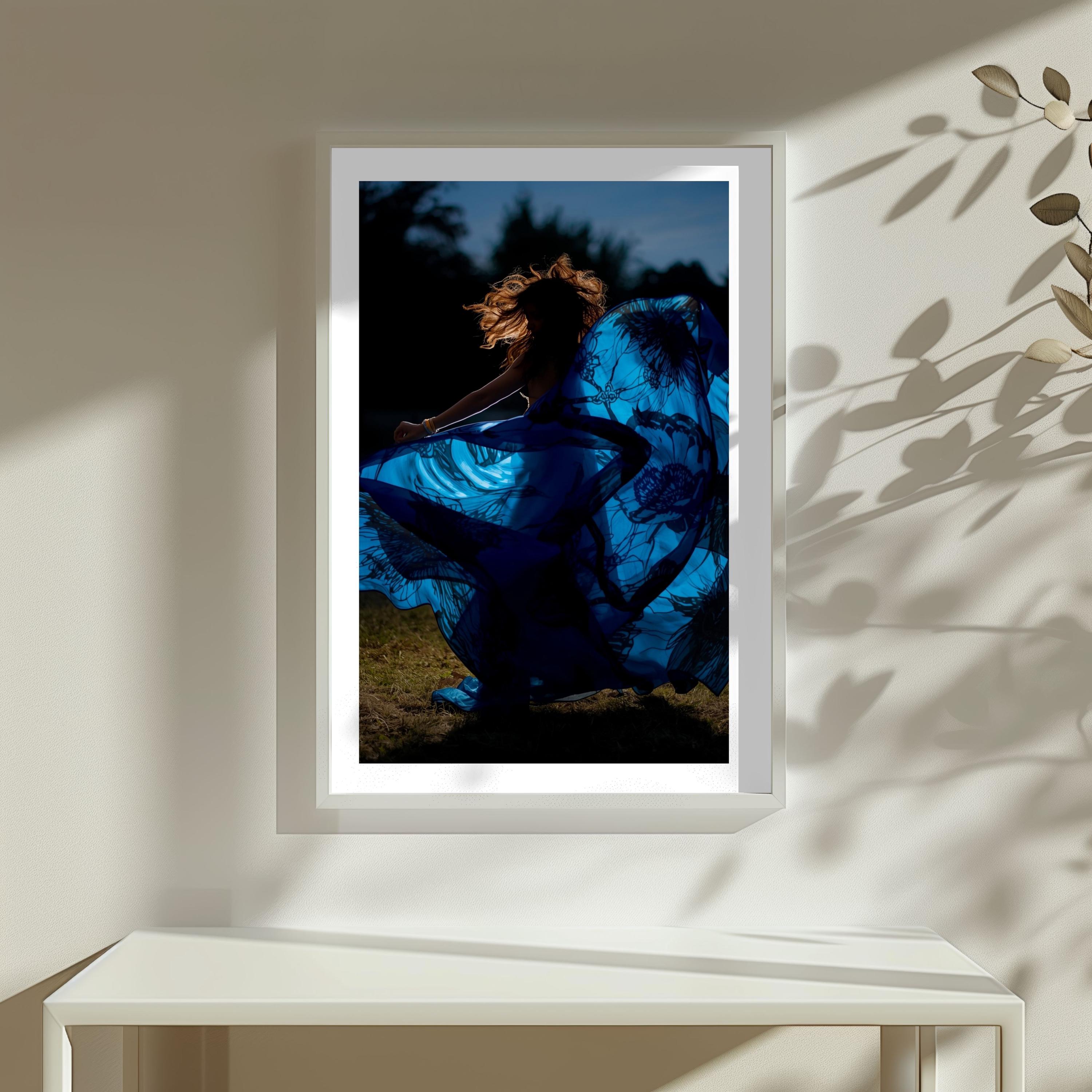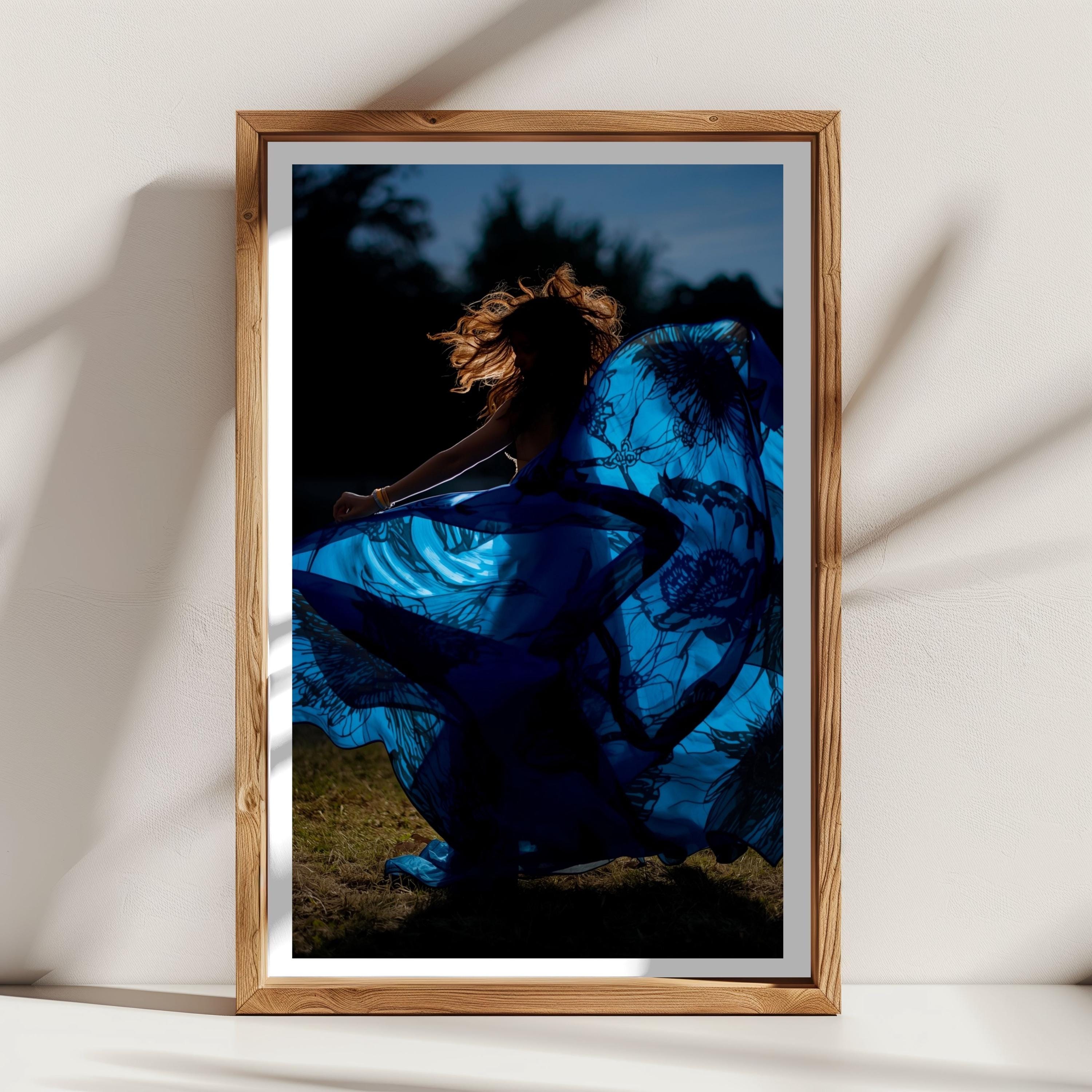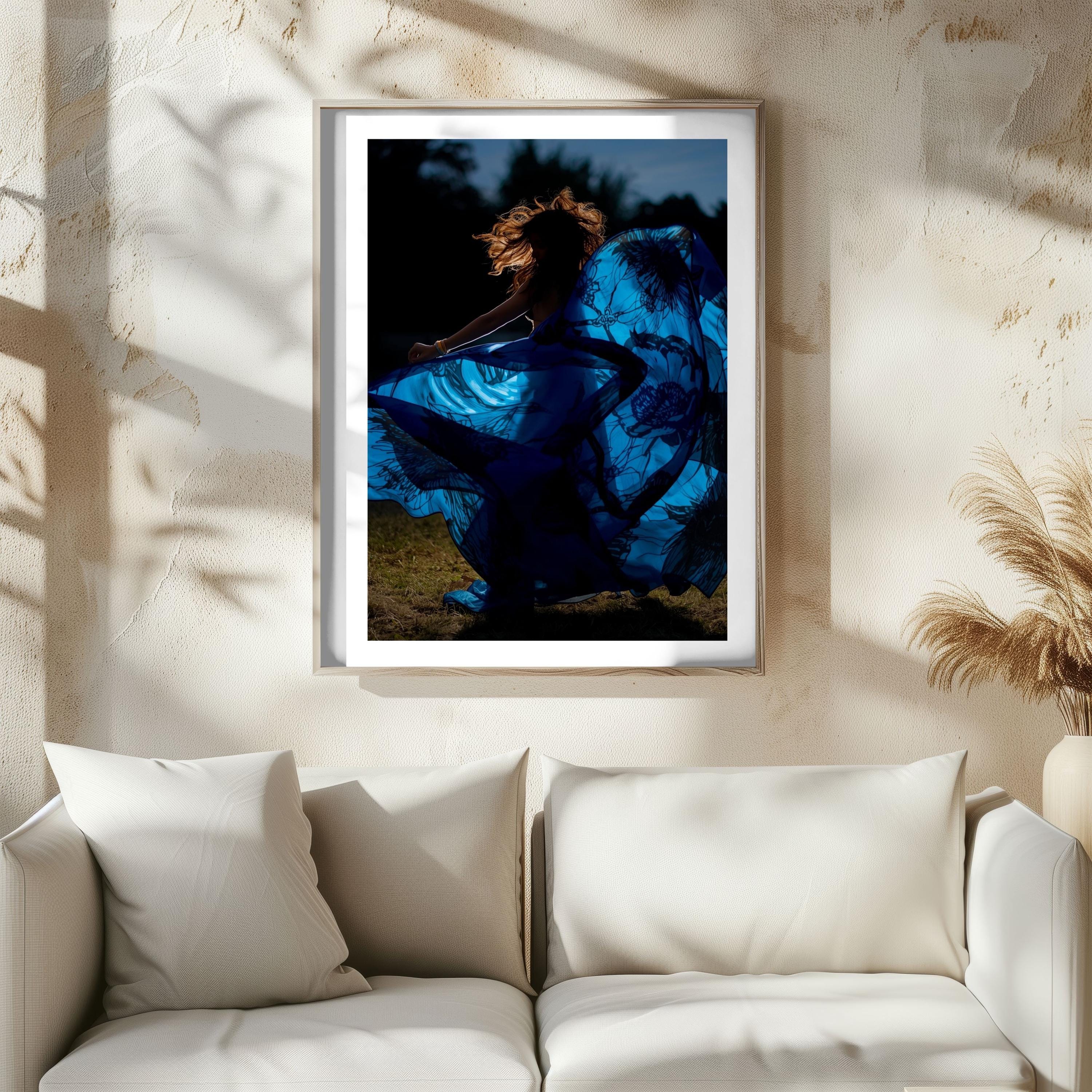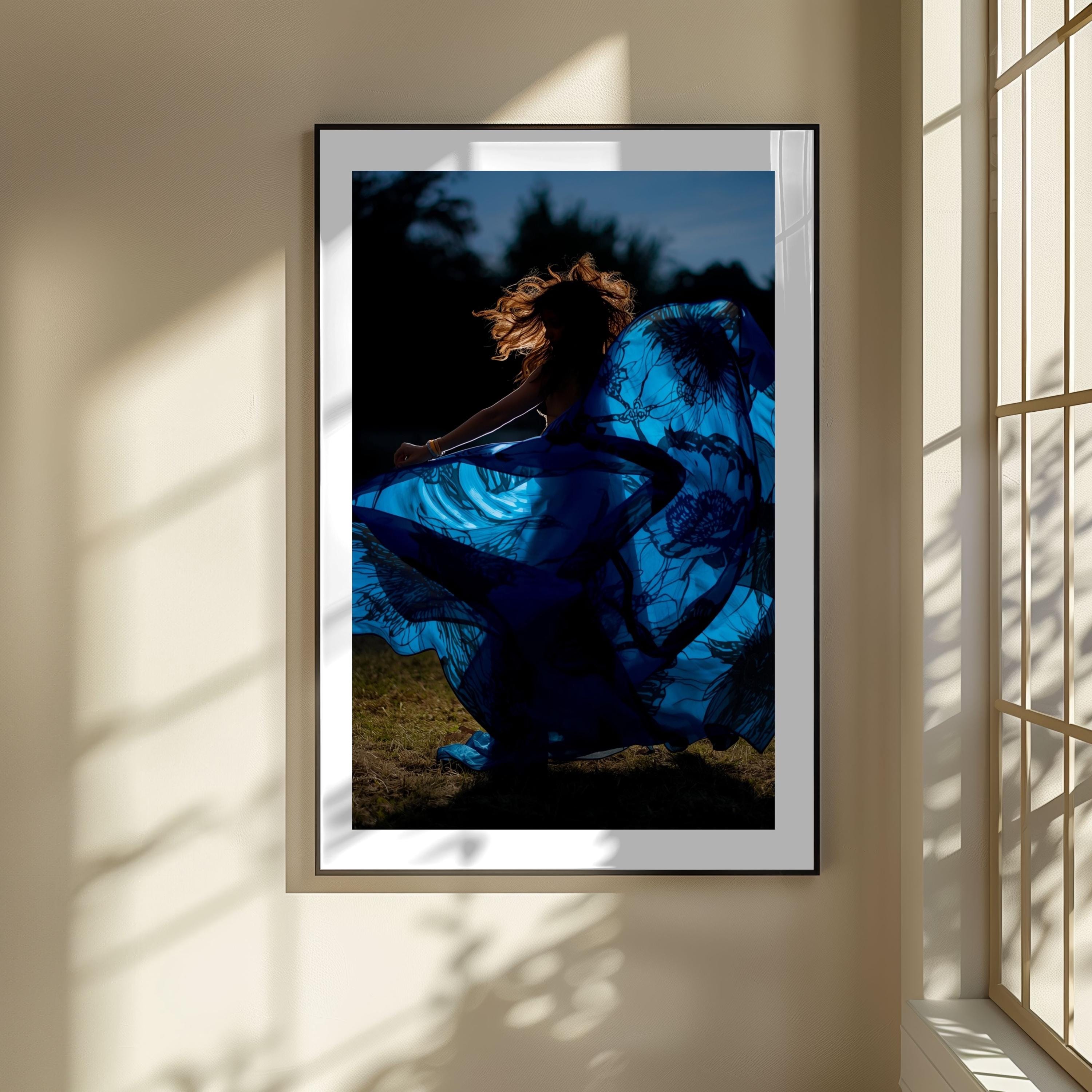 Unveil the magic of twilight in your home with this cinematic digital art print. This dancing silhouette is wrapped in billowing fabric that glows with rich, cool light, showcasing oversized sapphire and midnight blue florals. It's a high-impact, statement-making piece, perfect for bringing a luxurious, moody elegance and a sense of freedom to any space.