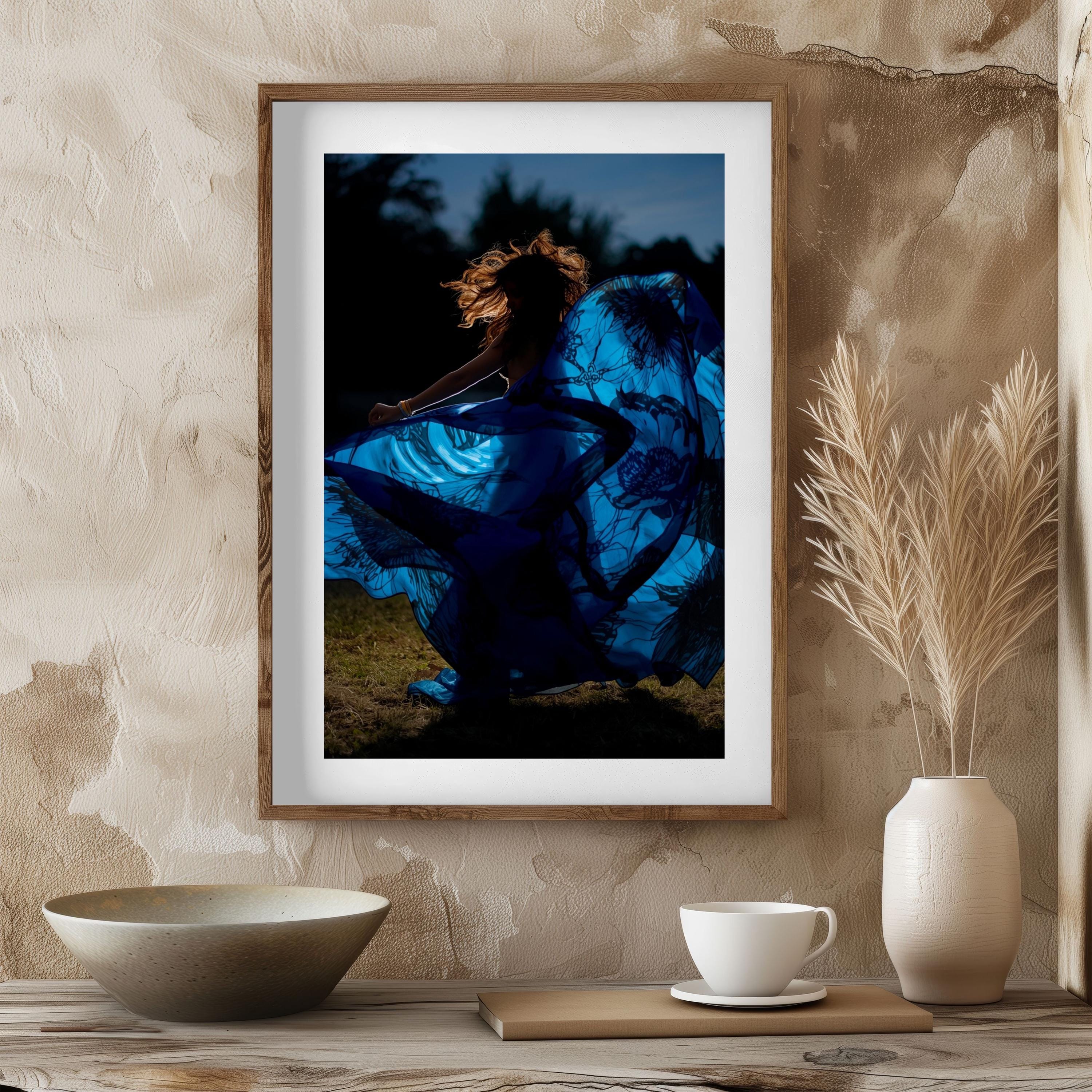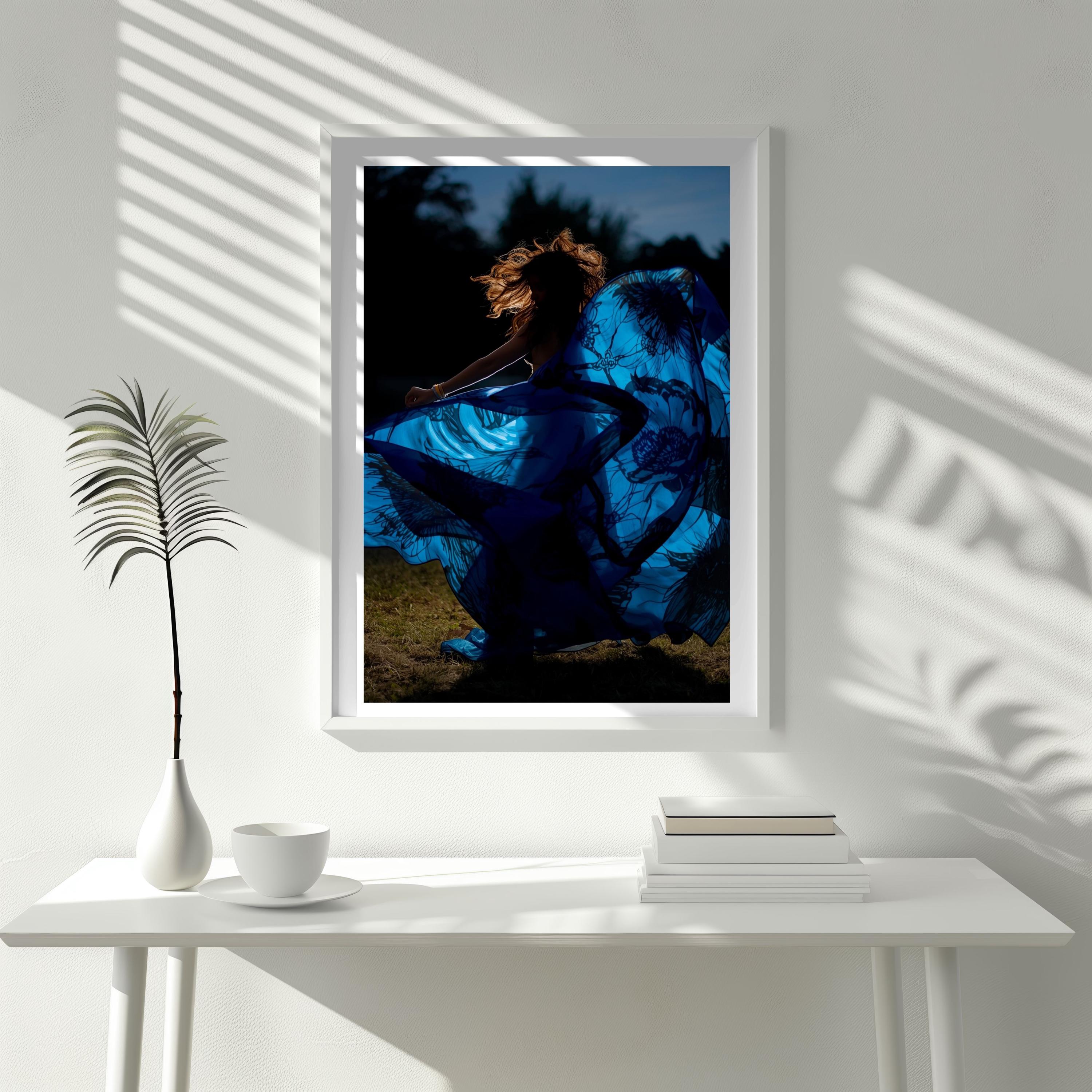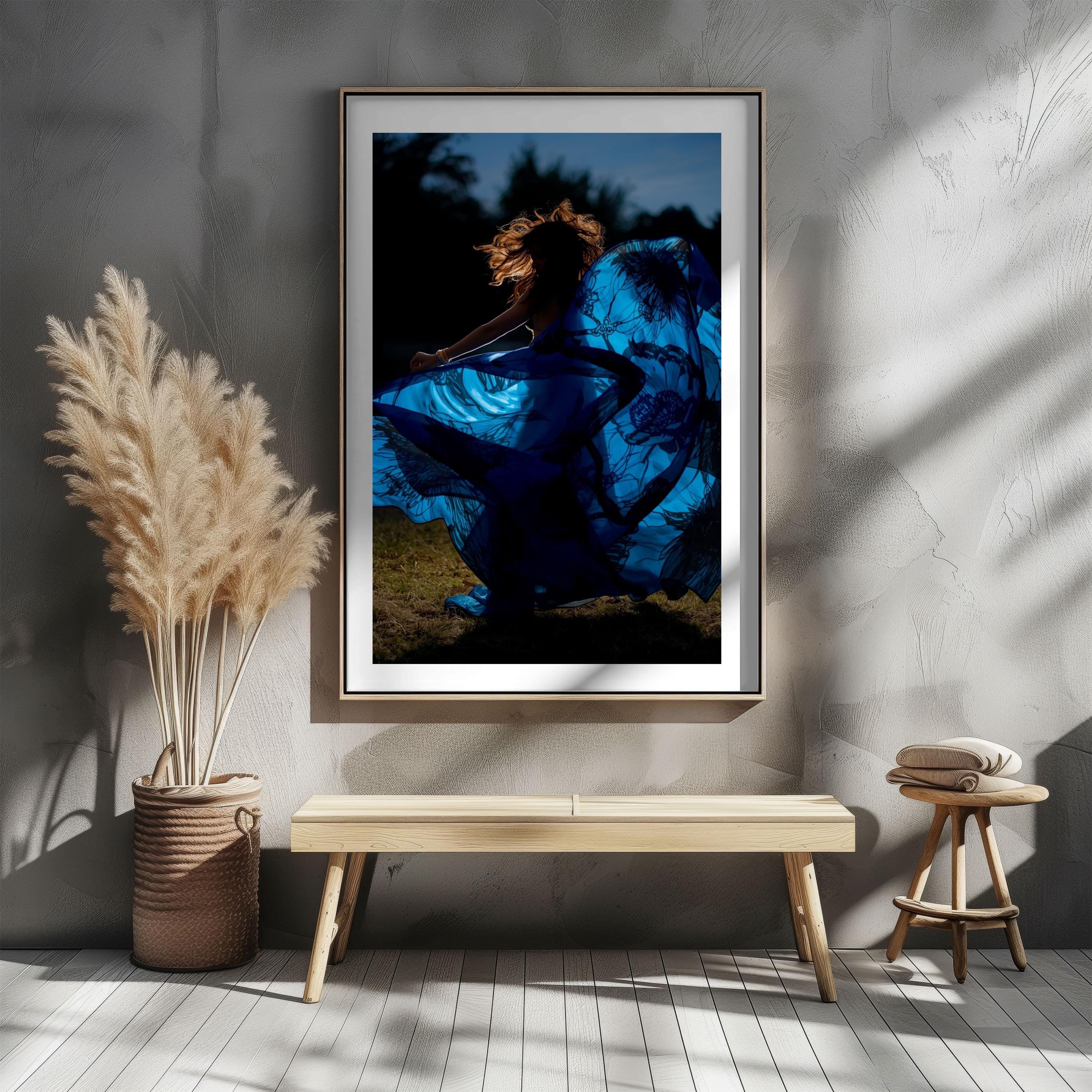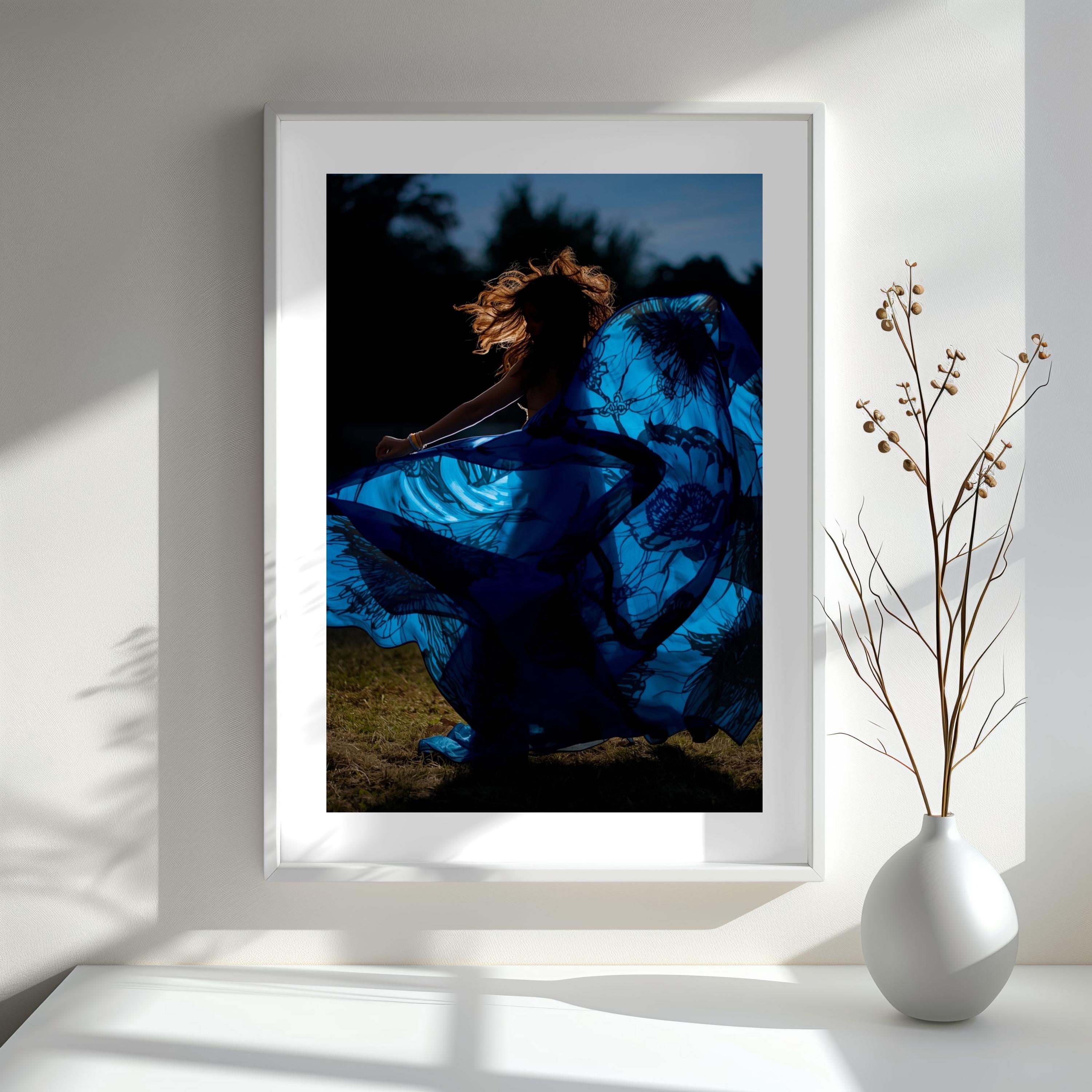 Unveil the magic of twilight in your home with this cinematic digital art print. This dancing silhouette is wrapped in billowing fabric that glows with rich, cool light, showcasing oversized sapphire and midnight blue florals. It's a high-impact, statement-making piece, perfect for bringing a luxurious, moody elegance and a sense of freedom to any space.