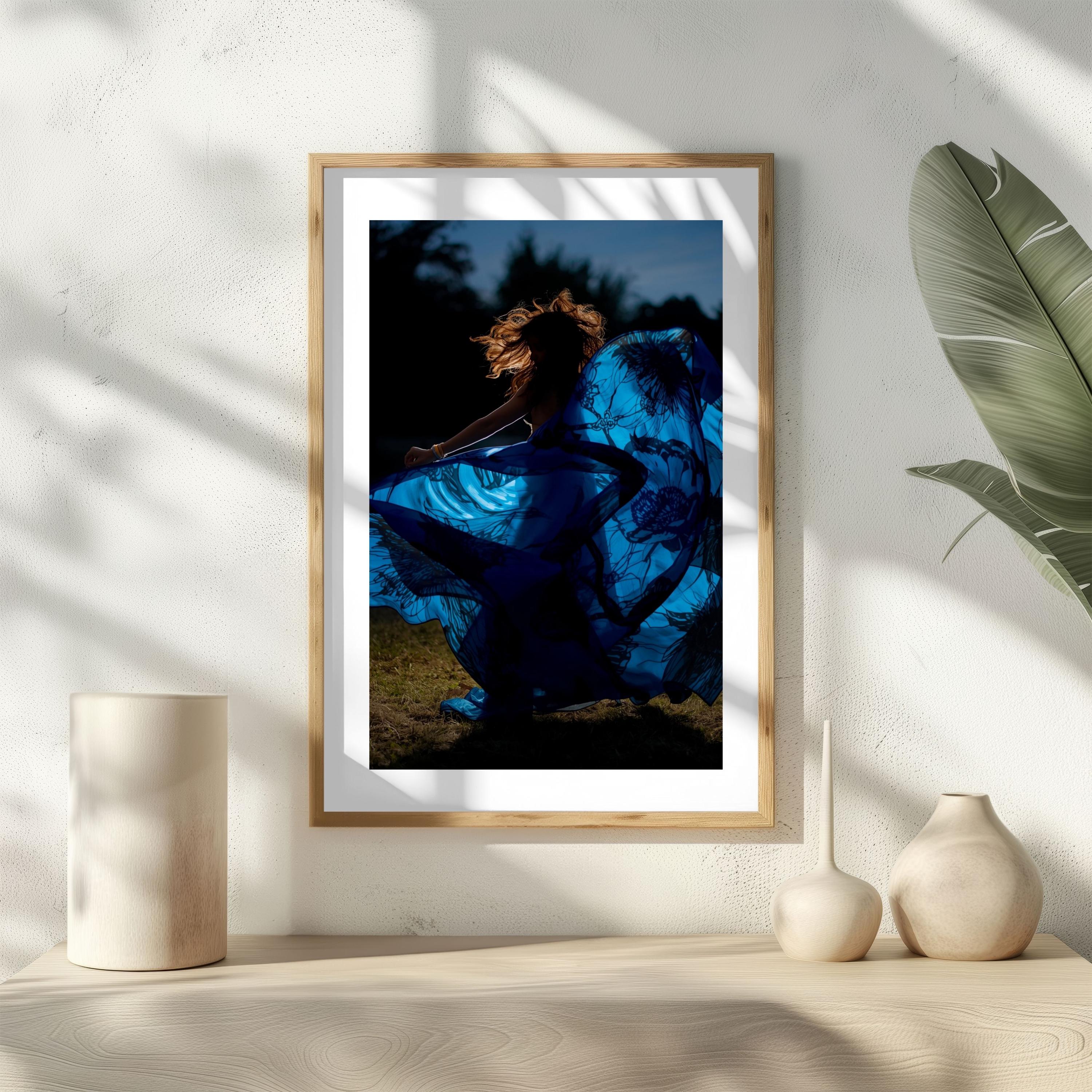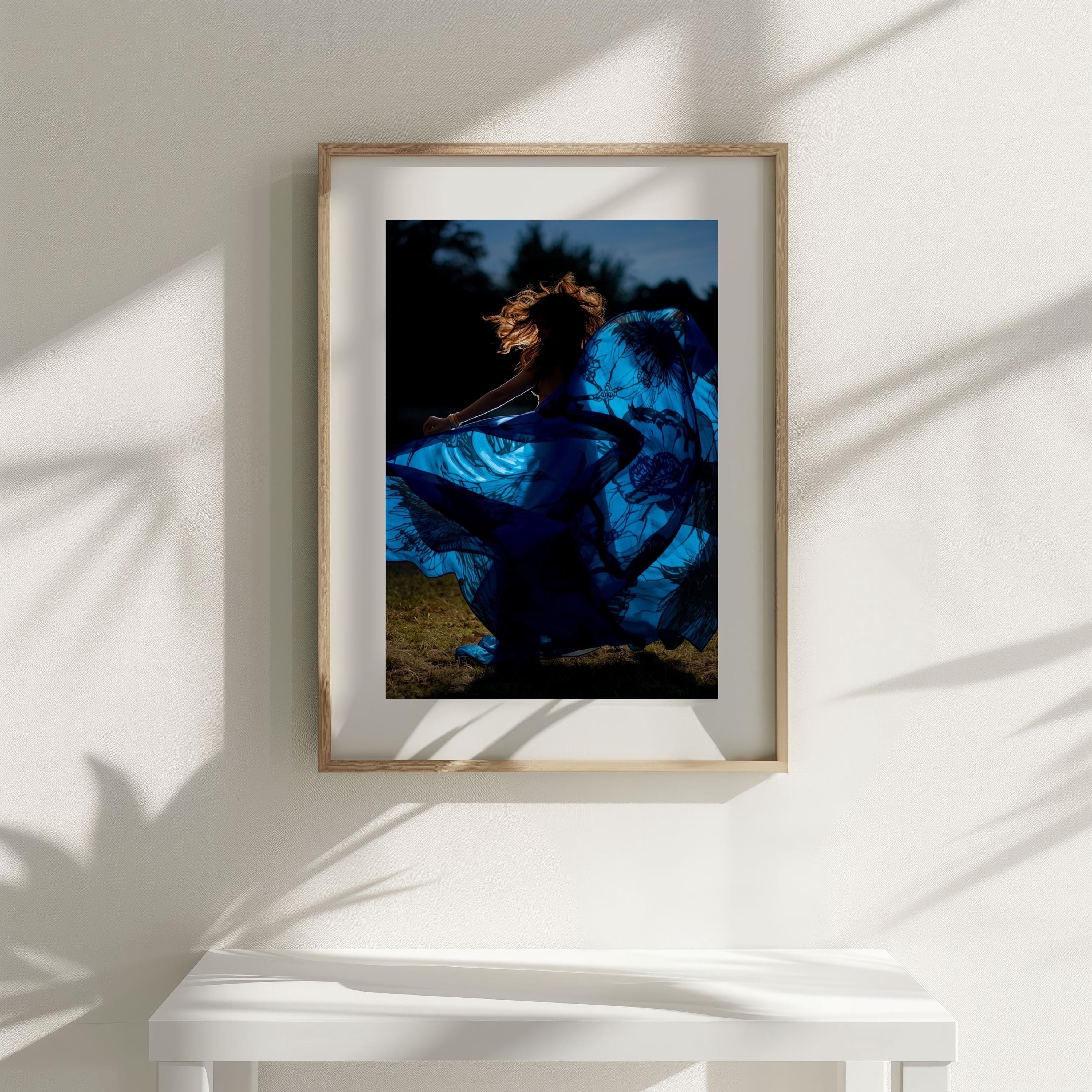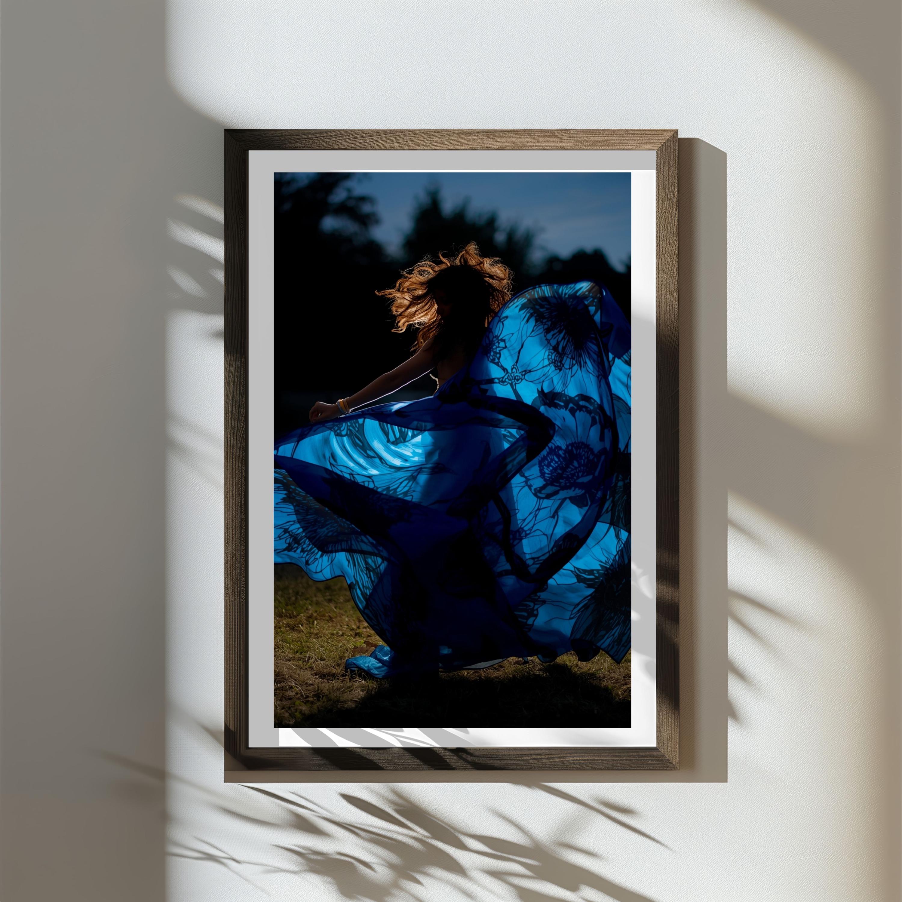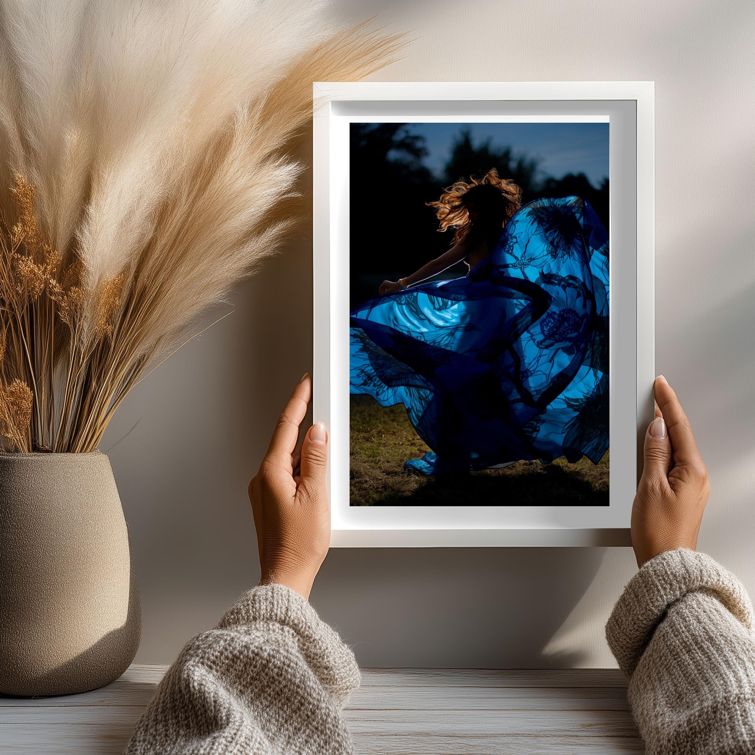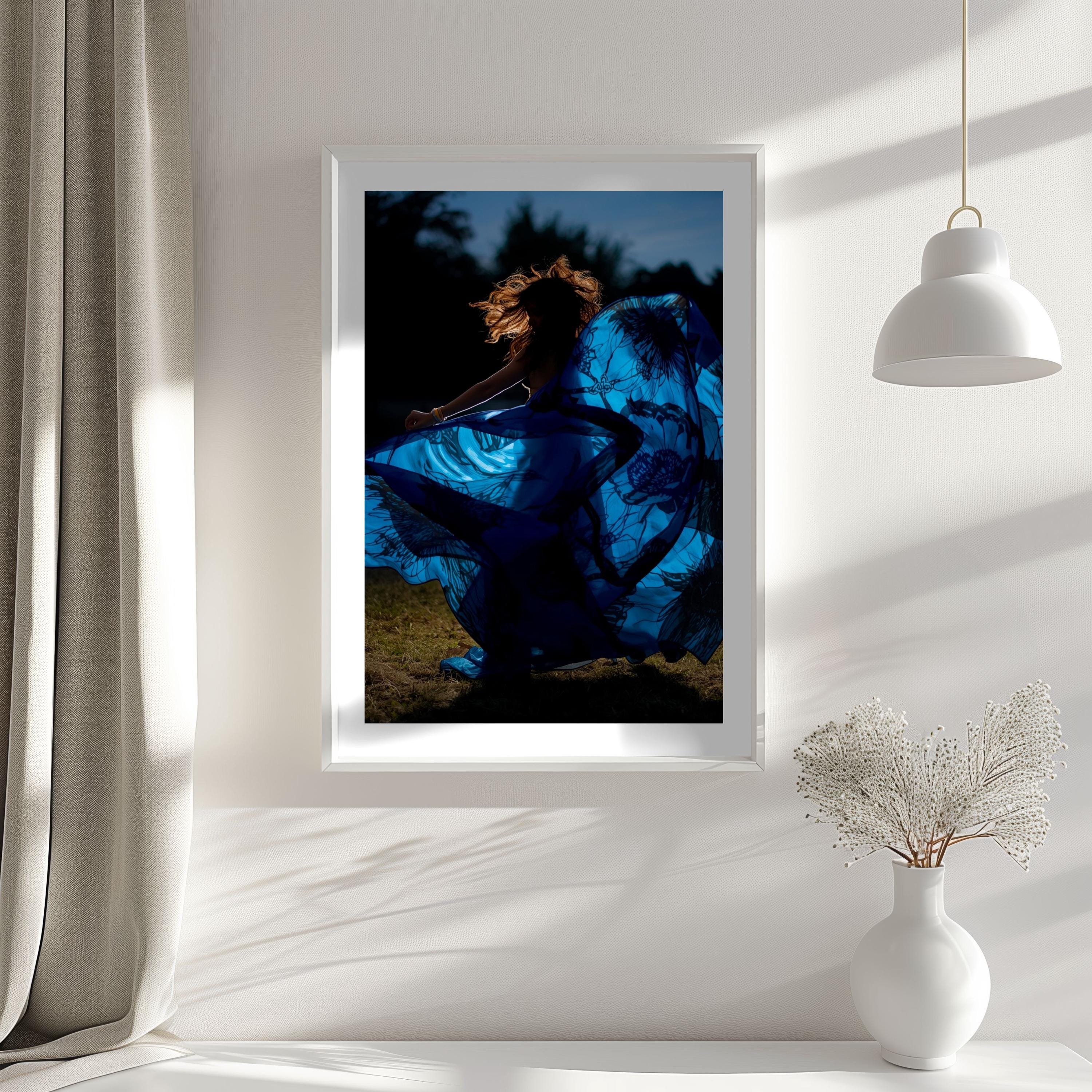 Unveil the magic of twilight in your home with this cinematic digital art print. This dancing silhouette is wrapped in billowing fabric that glows with rich, cool light, showcasing oversized sapphire and midnight blue florals. It's a high-impact, statement-making piece, perfect for bringing a luxurious, moody elegance and a sense of freedom to any space.