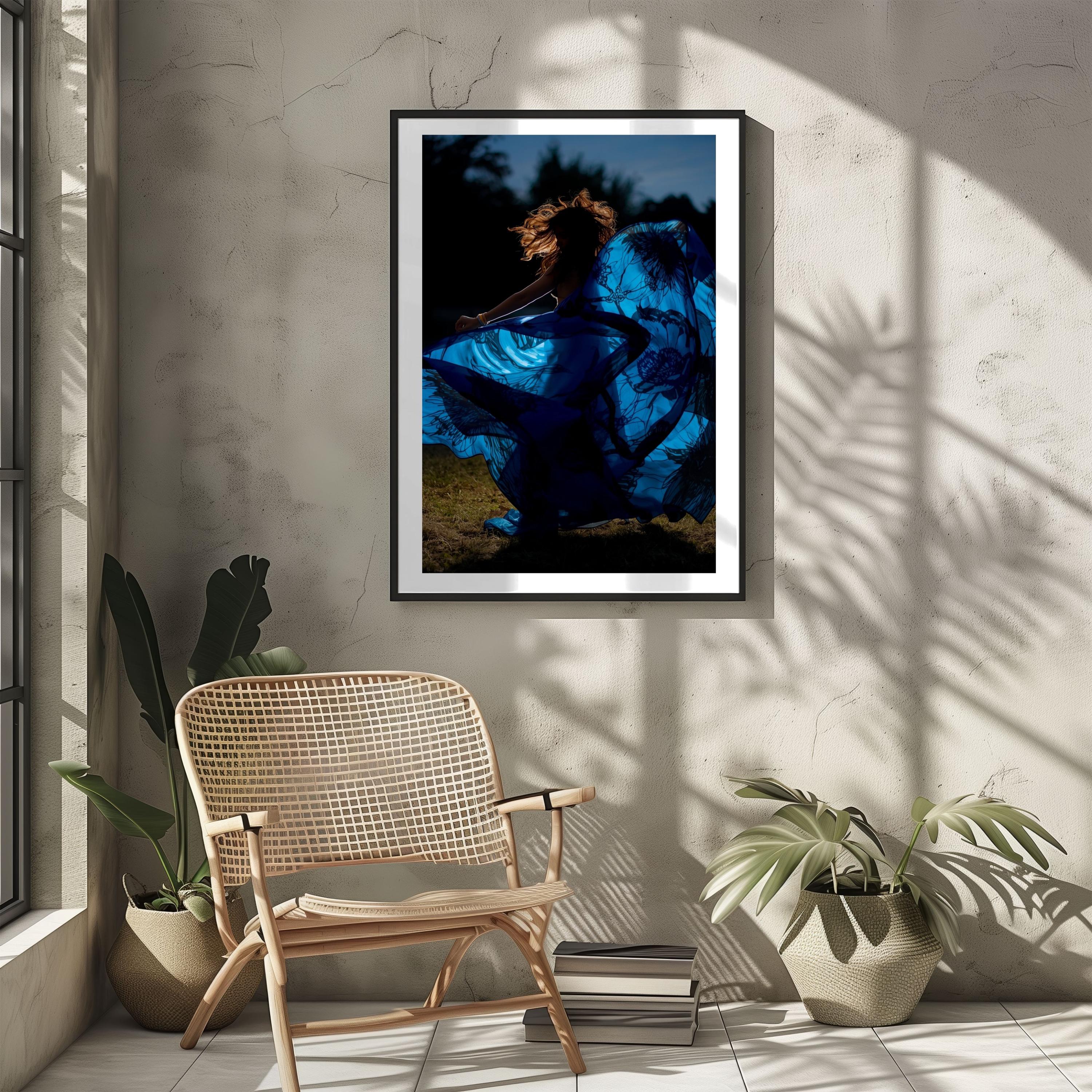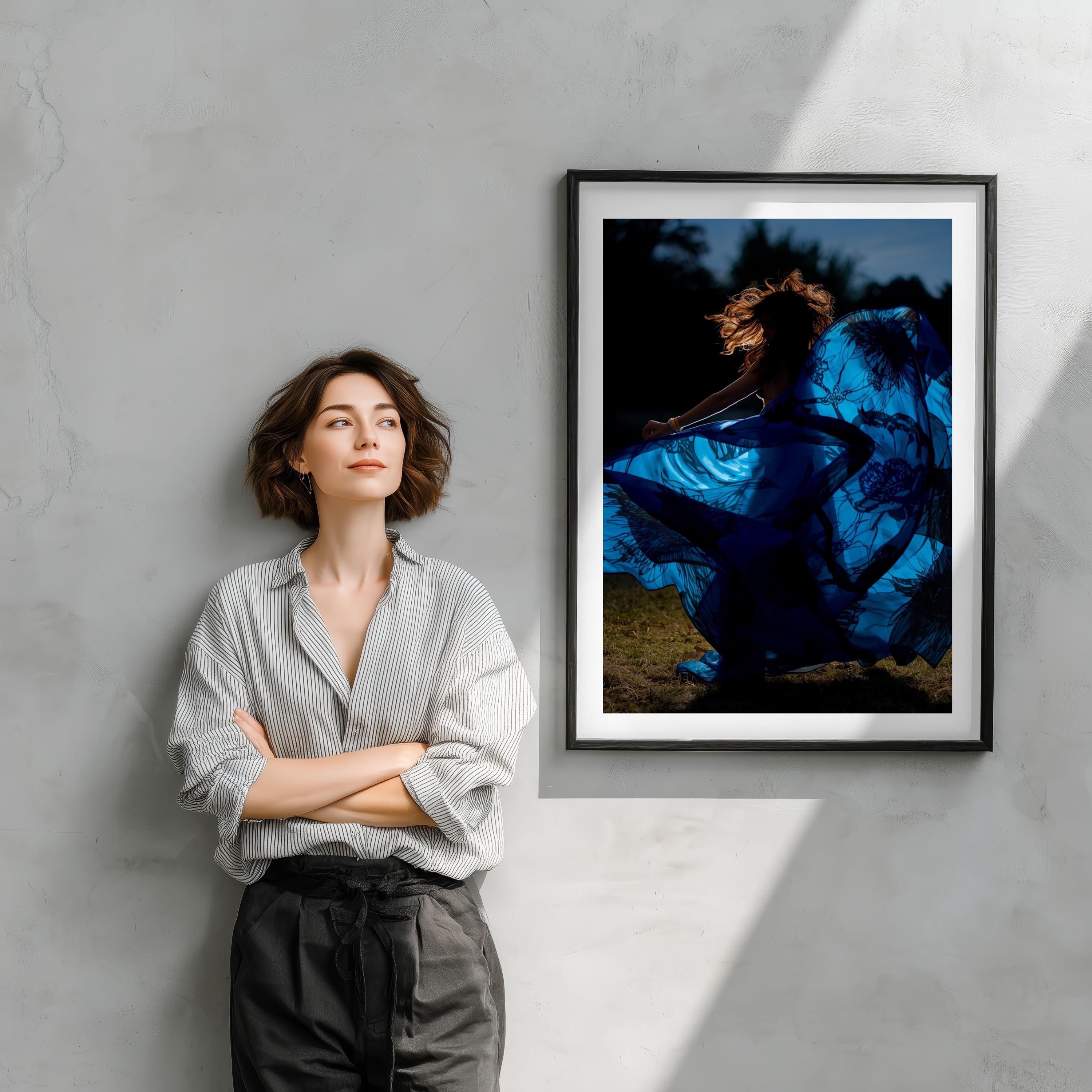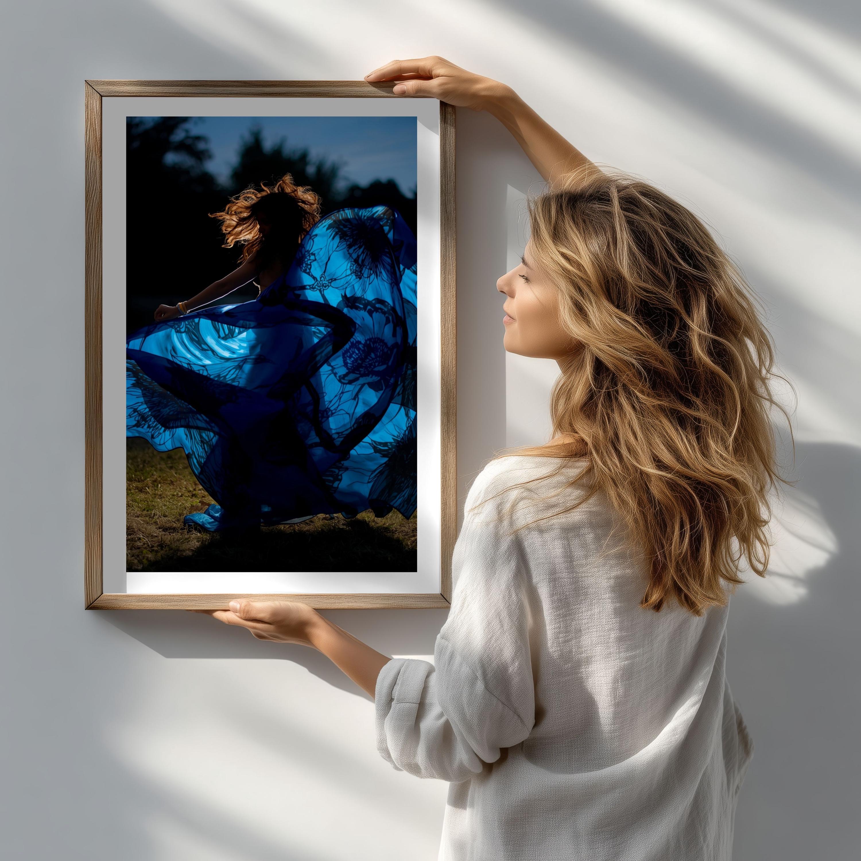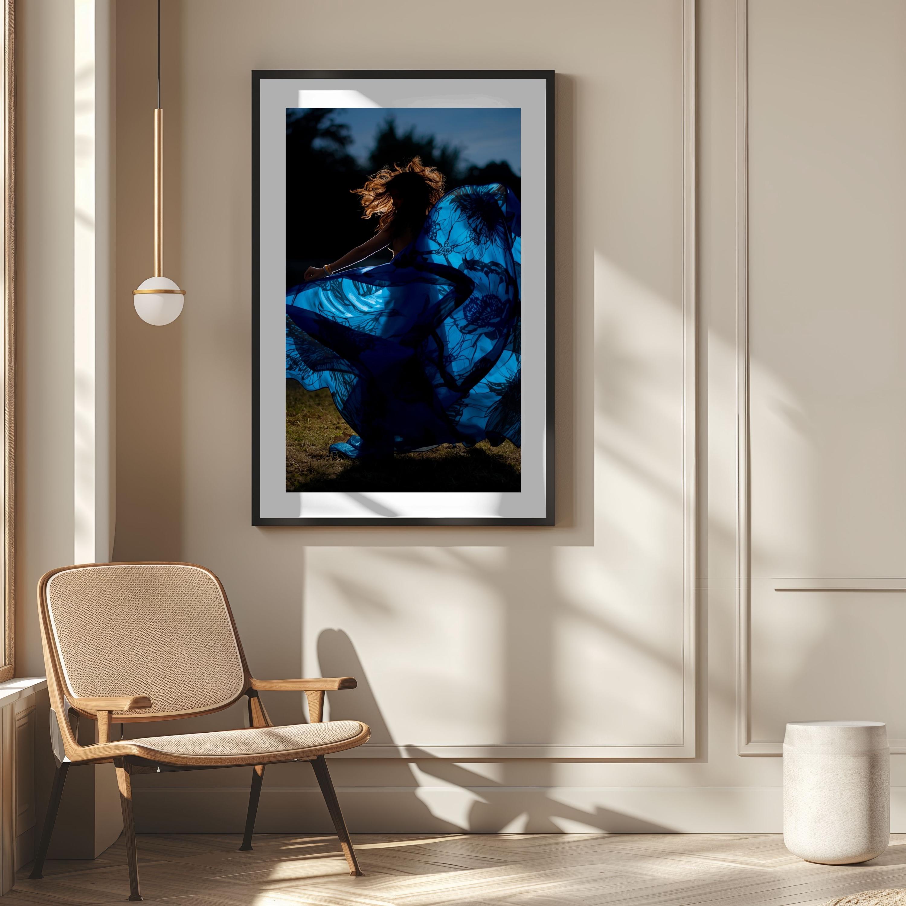 Unveil the magic of twilight in your home with this cinematic digital art print. This dancing silhouette is wrapped in billowing fabric that glows with rich, cool light, showcasing oversized sapphire and midnight blue florals. It's a high-impact, statement-making piece, perfect for bringing a luxurious, moody elegance and a sense of freedom to any space.