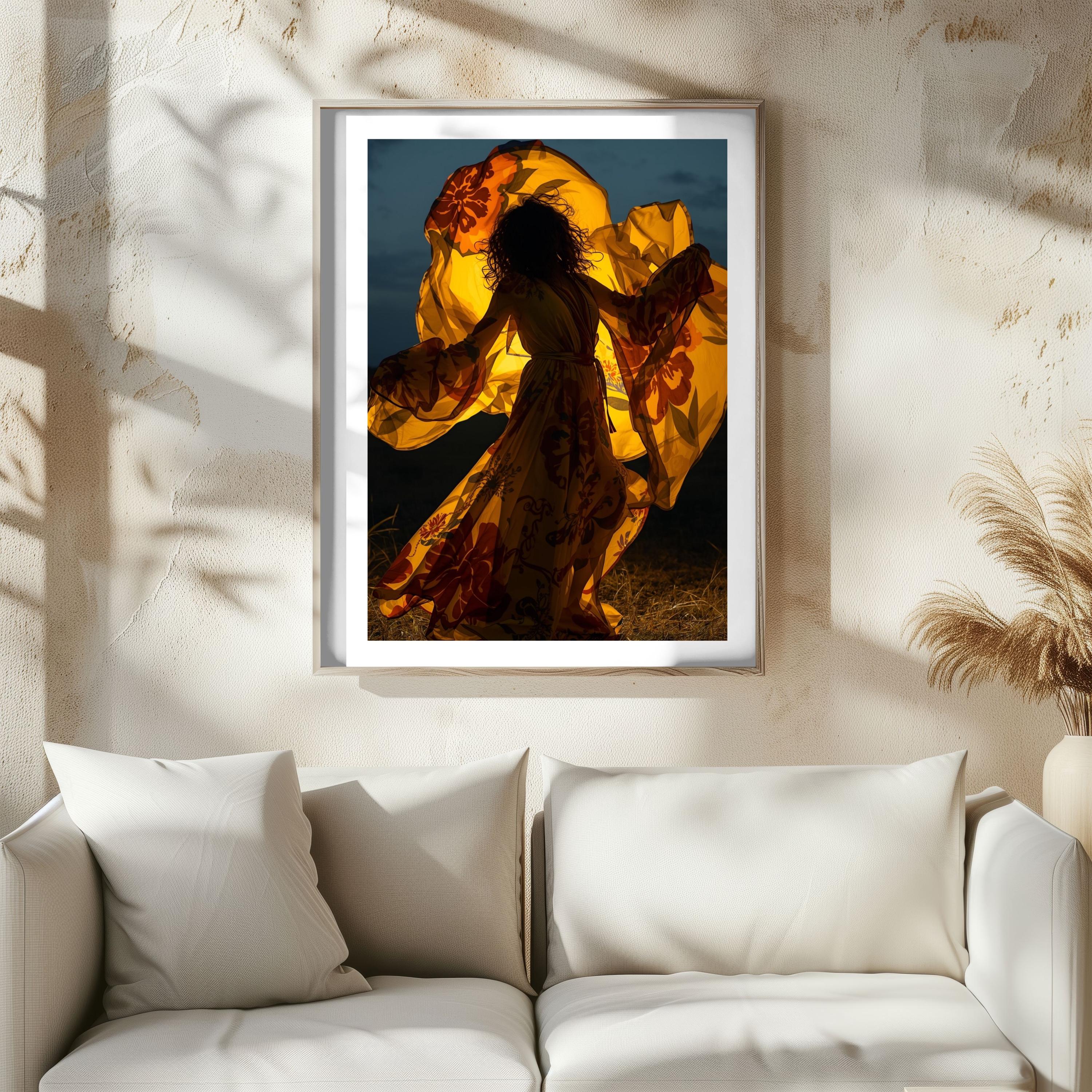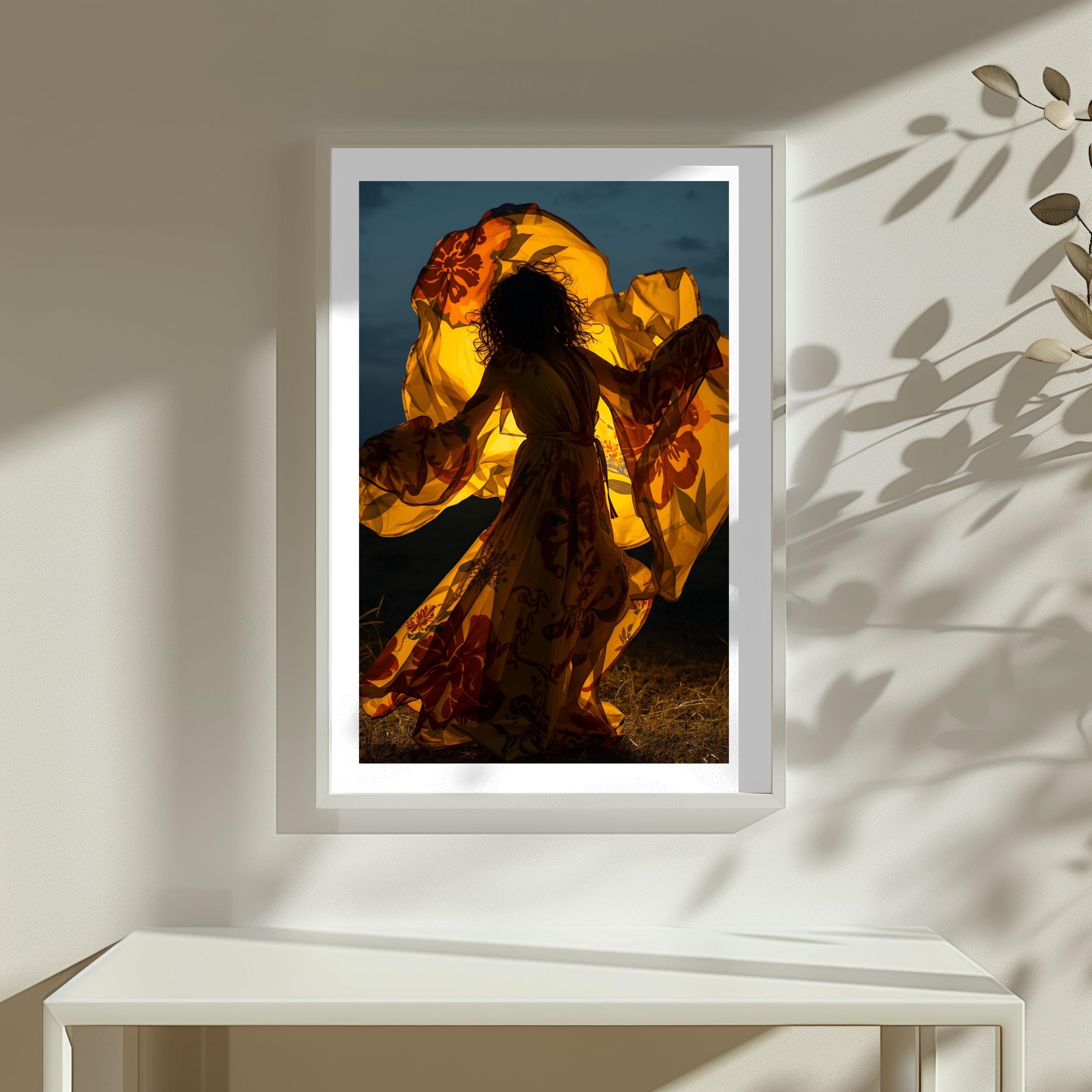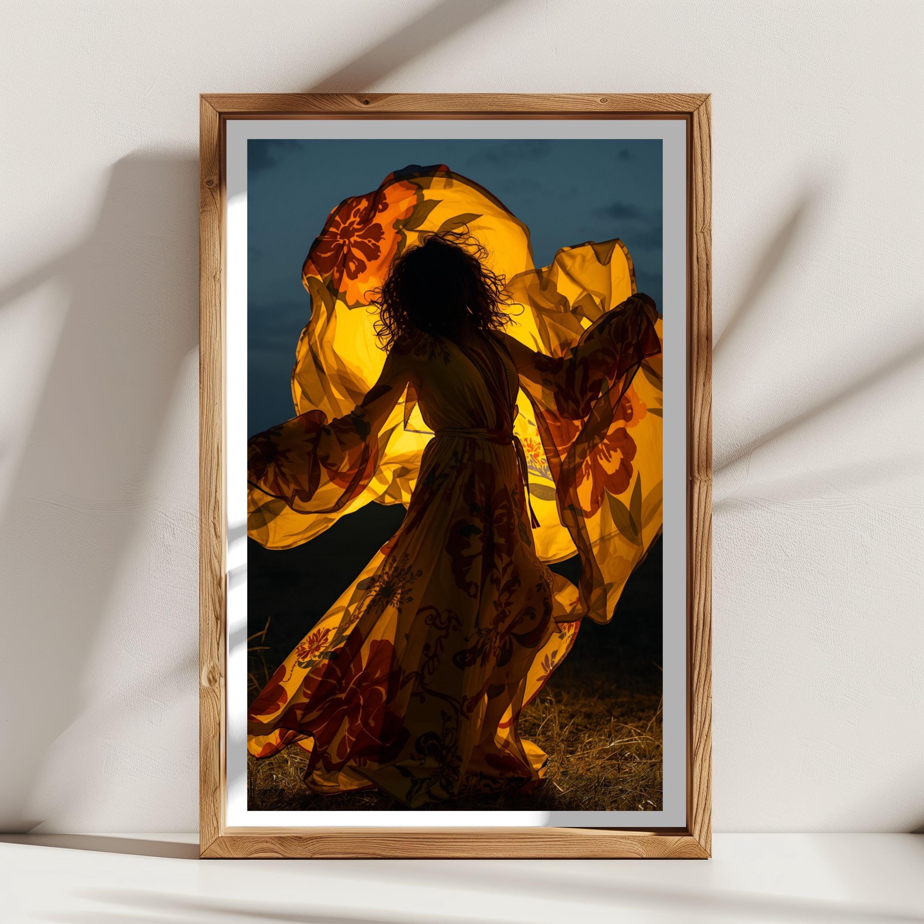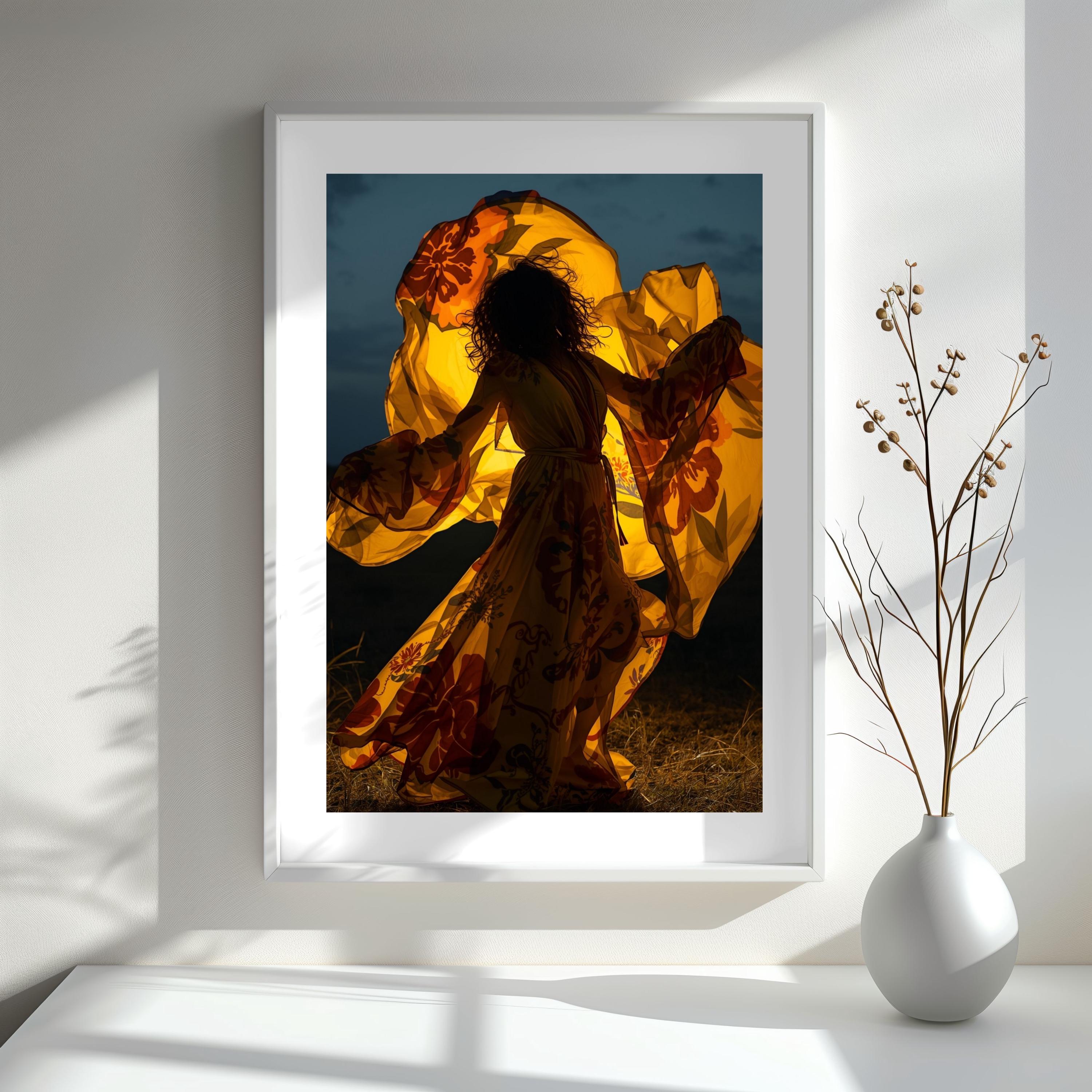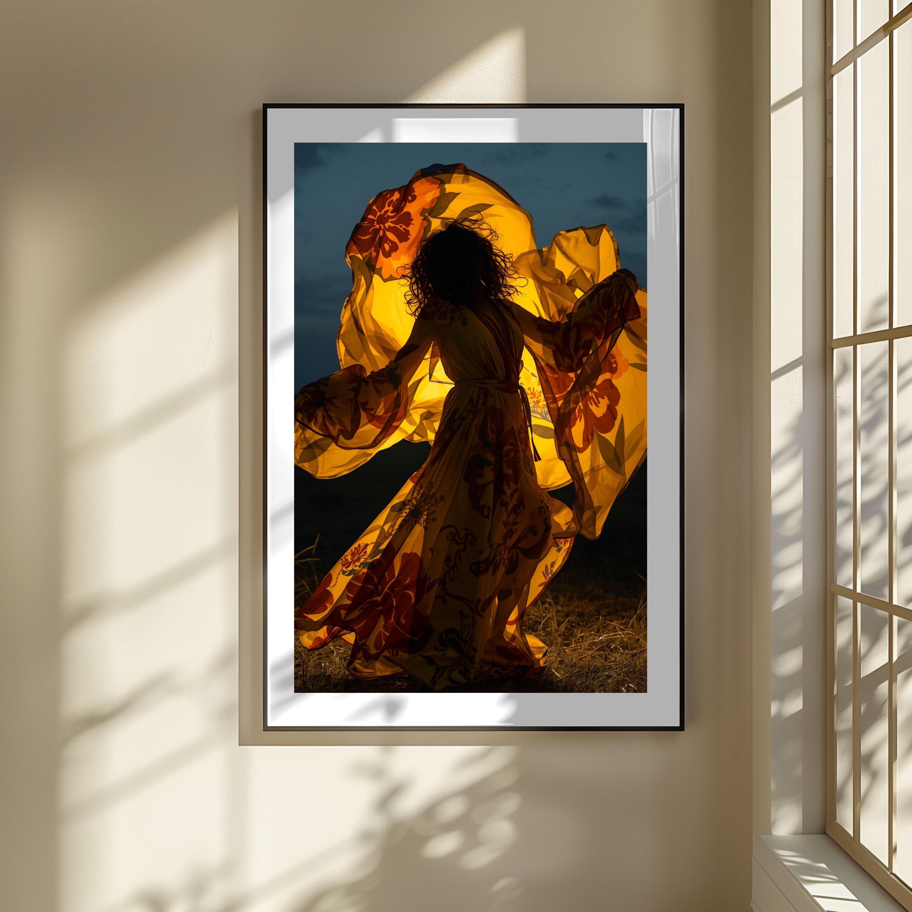 Capture the brilliance of a late sunset in your home with this cinematic digital art print. This dancing silhouette is wrapped in billowing fabric that glows with rich, sun-drenched yellow and gold florals. It is a high-impact, statement-making piece, perfect for bringing a warm, luxurious energy and a sense of freedom to any space.