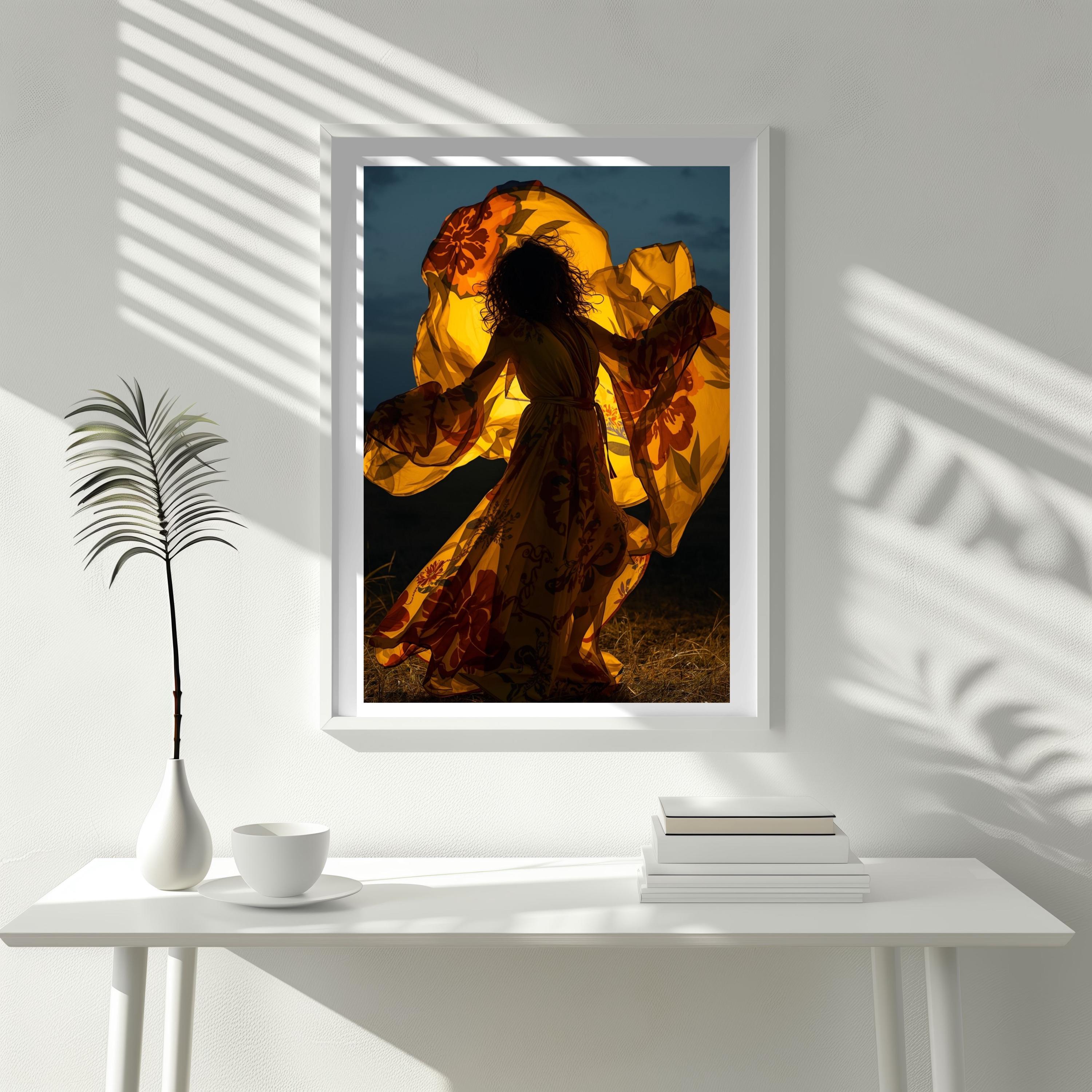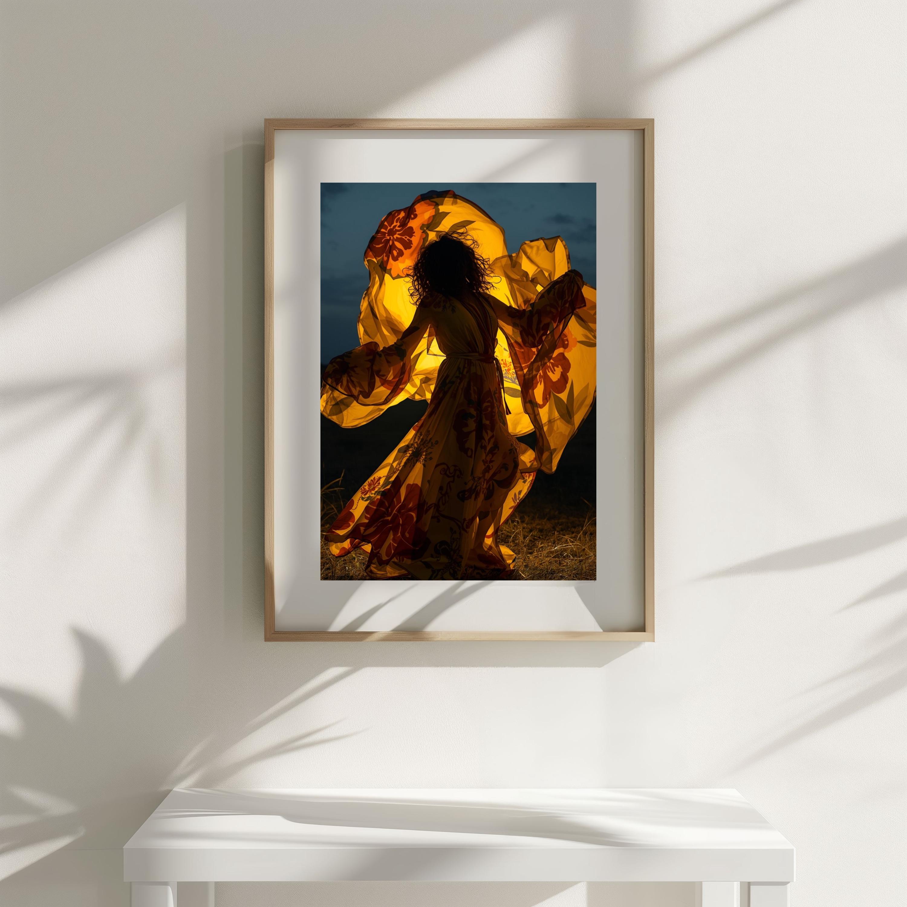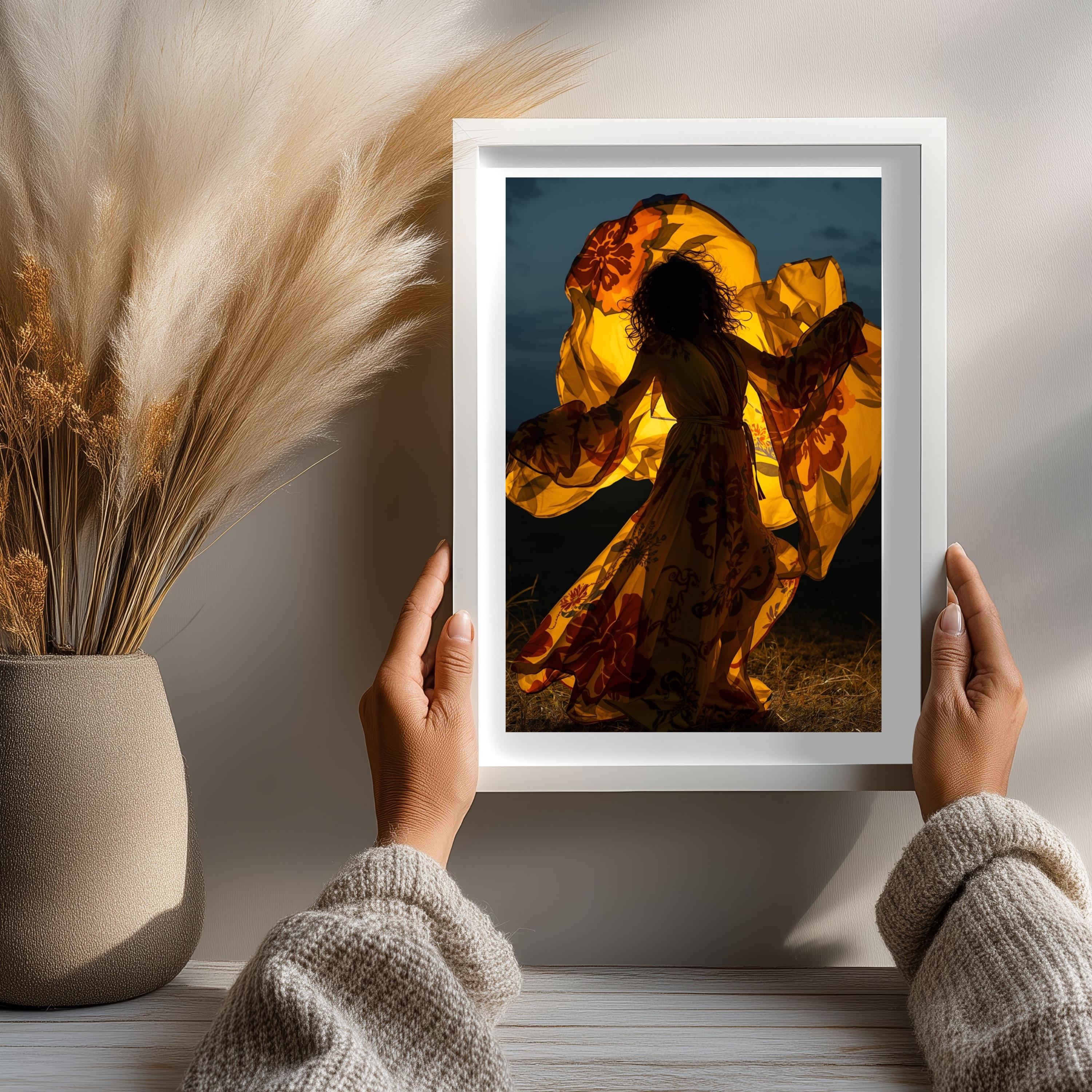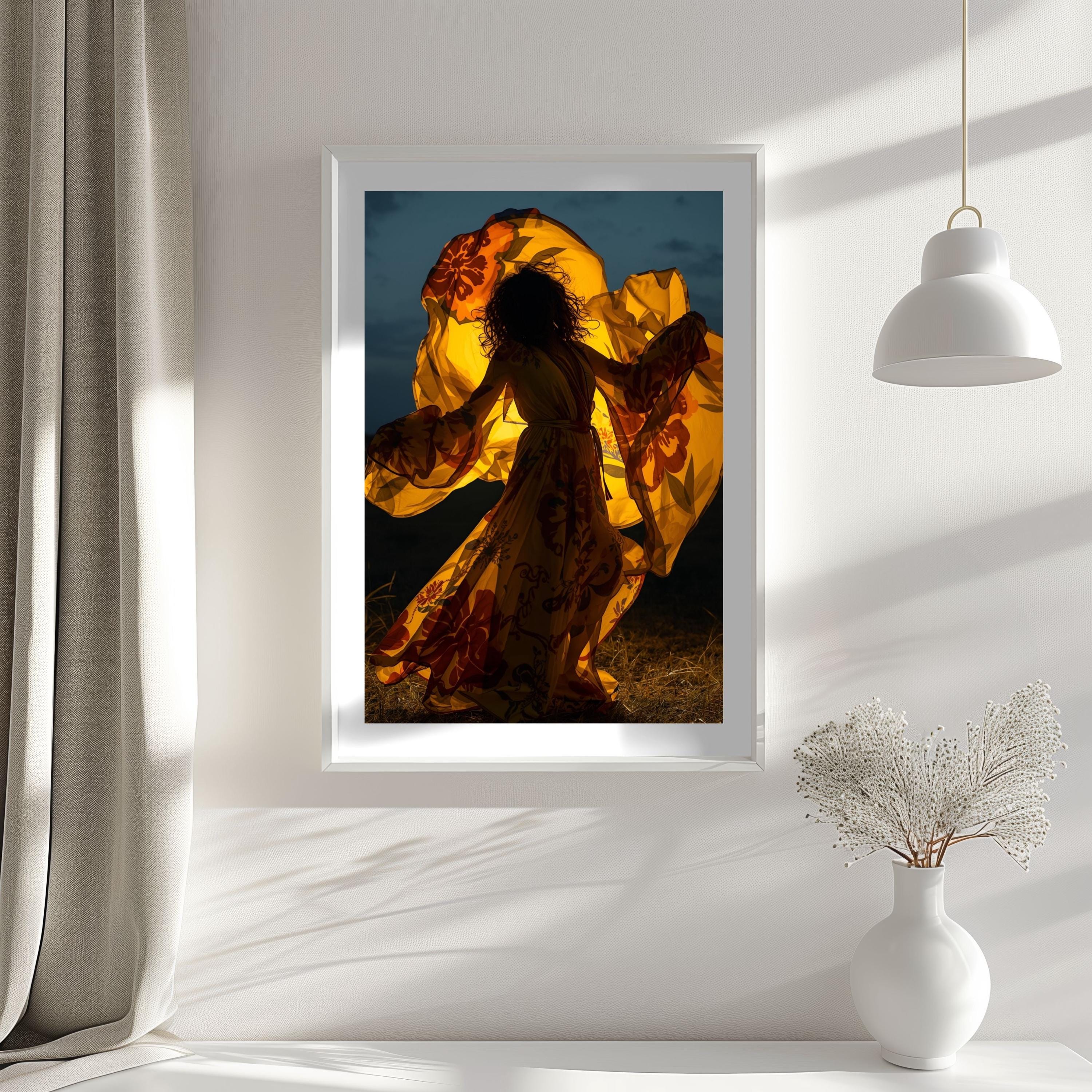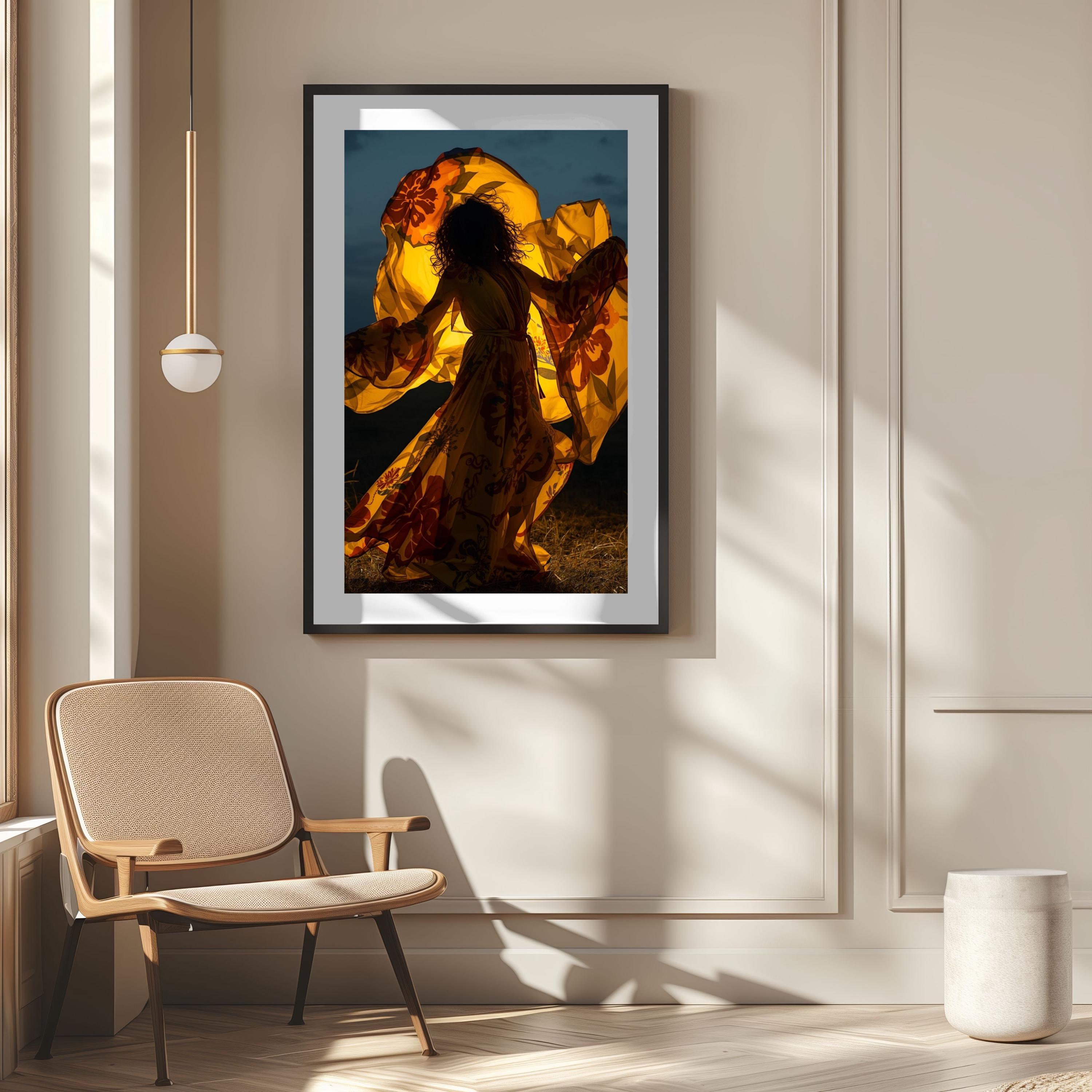 Capture the brilliance of a late sunset in your home with this cinematic digital art print. This dancing silhouette is wrapped in billowing fabric that glows with rich, sun-drenched yellow and gold florals. It is a high-impact, statement-making piece, perfect for bringing a warm, luxurious energy and a sense of freedom to any space.