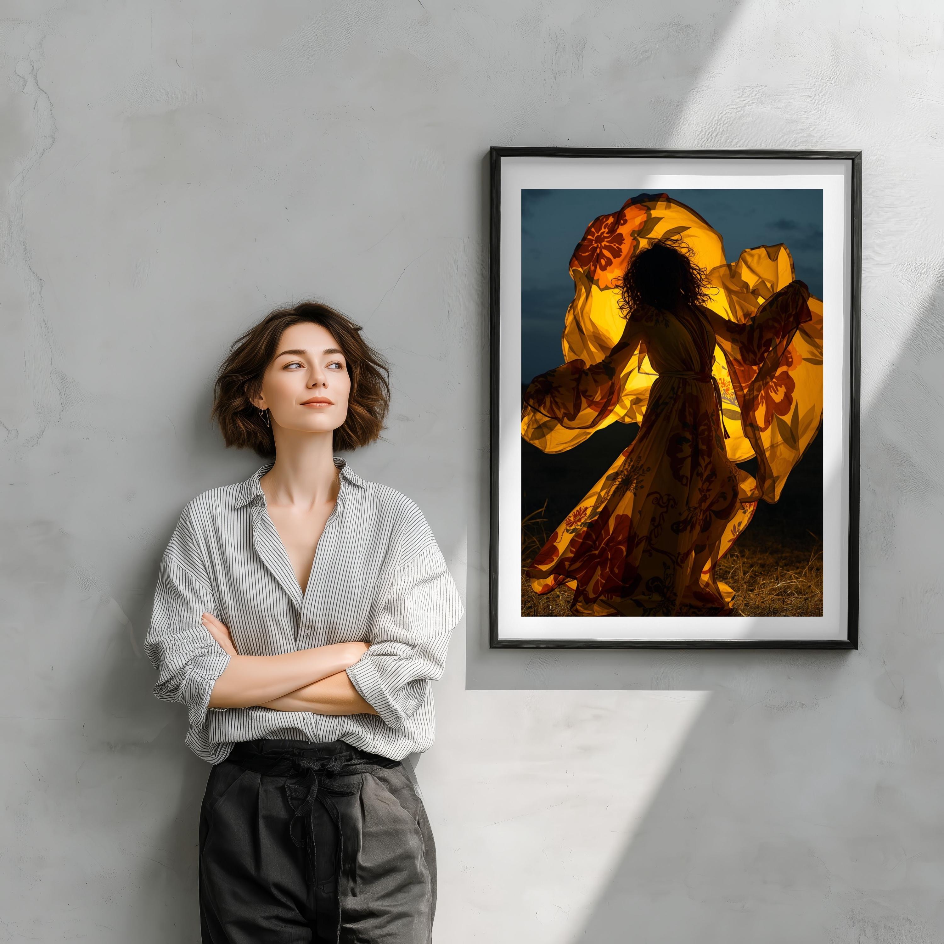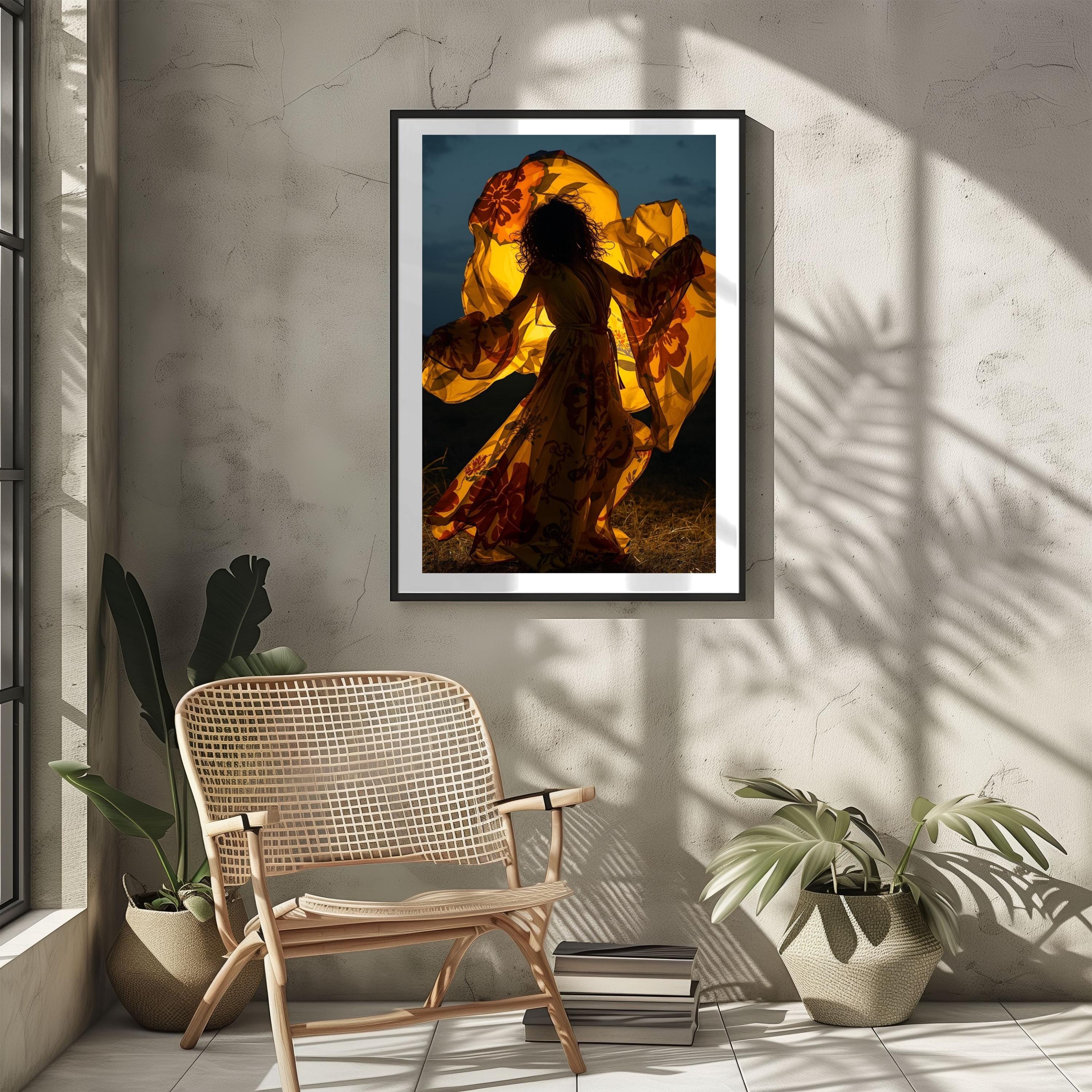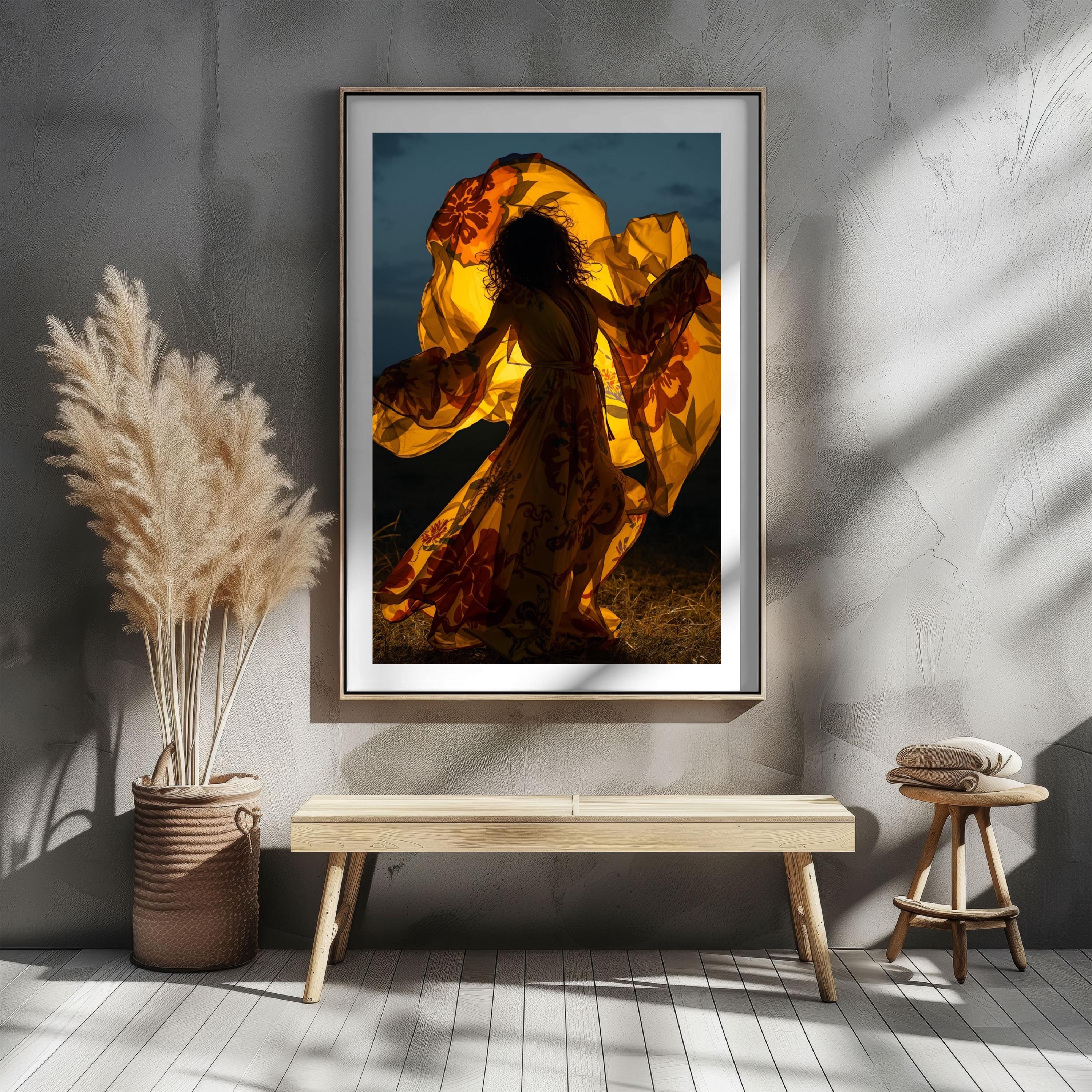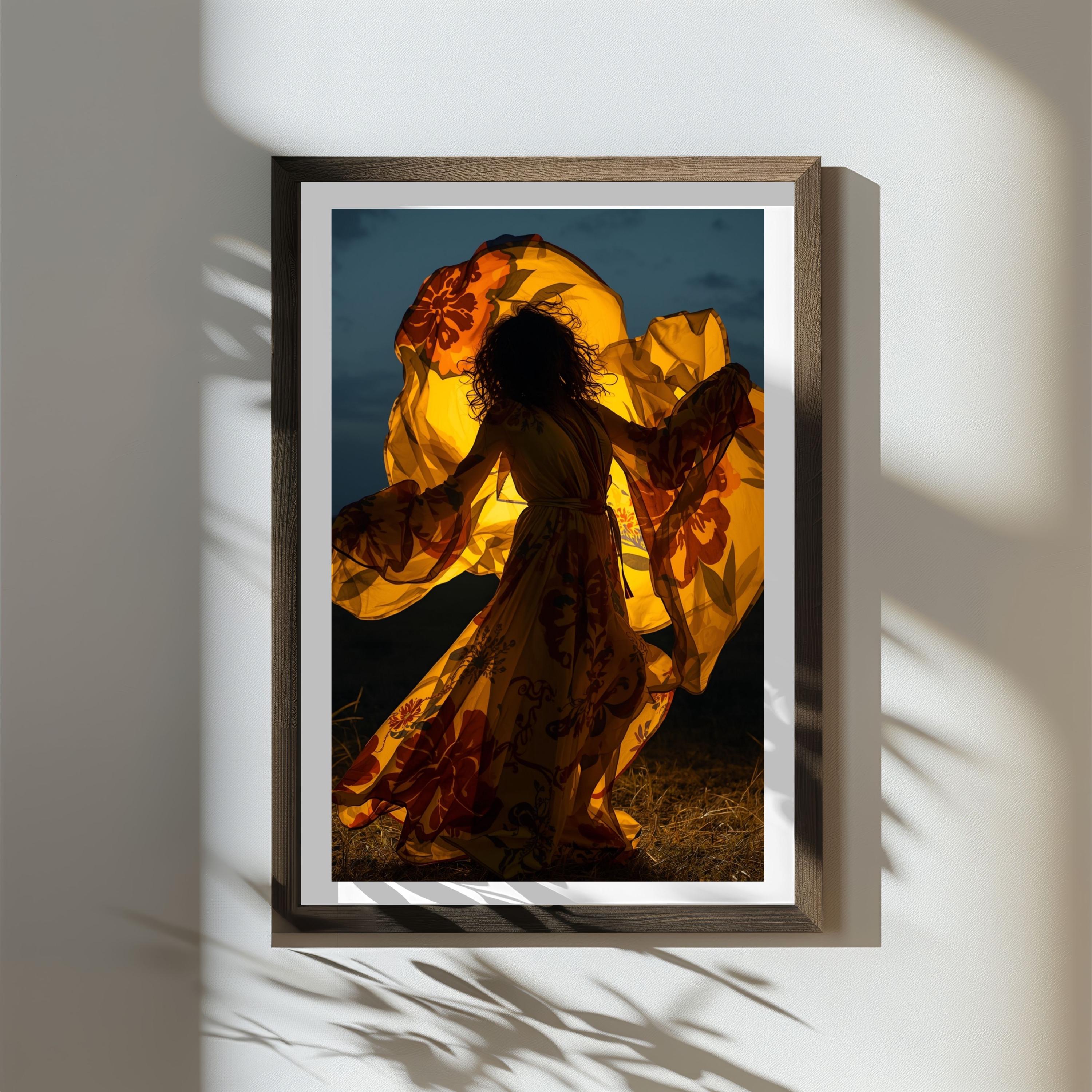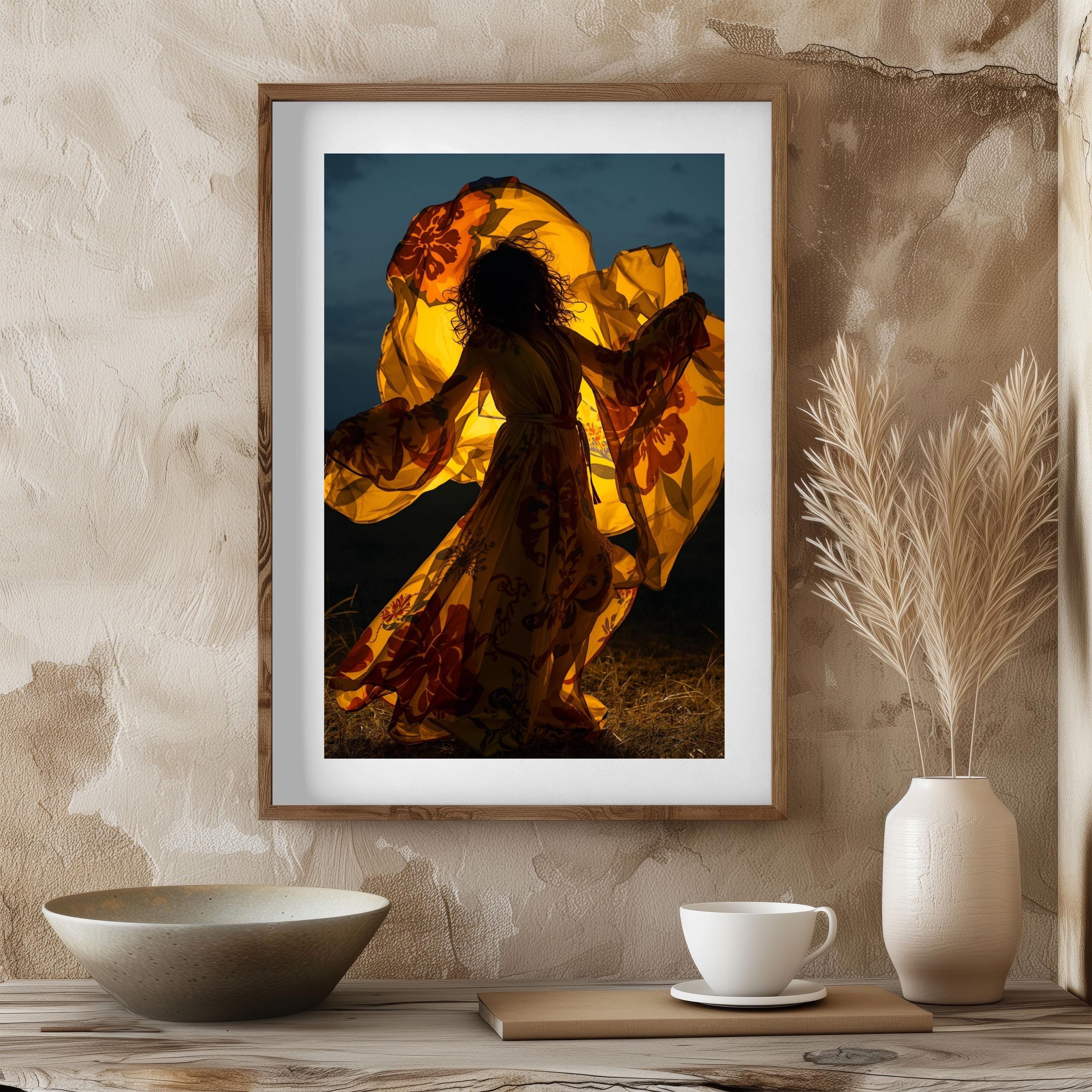 Capture the brilliance of a late sunset in your home with this cinematic digital art print. This dancing silhouette is wrapped in billowing fabric that glows with rich, sun-drenched yellow and gold florals. It is a high-impact, statement-making piece, perfect for bringing a warm, luxurious energy and a sense of freedom to any space.