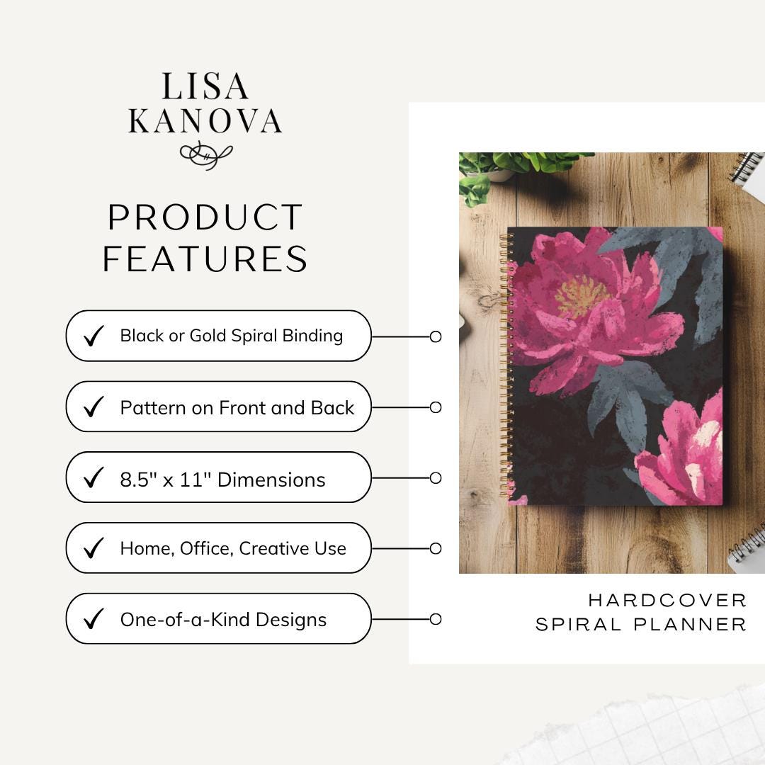Elevate your planning experience with the Signature Planner Hardcover Spiral in a luxurious 8.5" x 11" size, where sophistication meets functionality. Available in chic Black or radiant Gold, this planner is more than just a tool—it's a statement piece for the modern woman. Adorned with oversized signature floral designs by the talented Lisa Kanova, each page invites you to embrace your creativity and organize your life with flair. The sturdy hardcover and elegant spiral binding ensure durability while allowing for effortless page turning. Whether you’re scheduling meetings, jotting down dreams, or mapping out your goals, this planner is designed to inspire and empower. Perfect for the discerning woman who appreciates both style and substance, the Signature Planner redefines the art of planning. Discover a blend of functionality and fashion that keeps you motivated and organized all year long. Experience the joy of elegant planning with a touch of luxury that speaks to your unique sense of style.