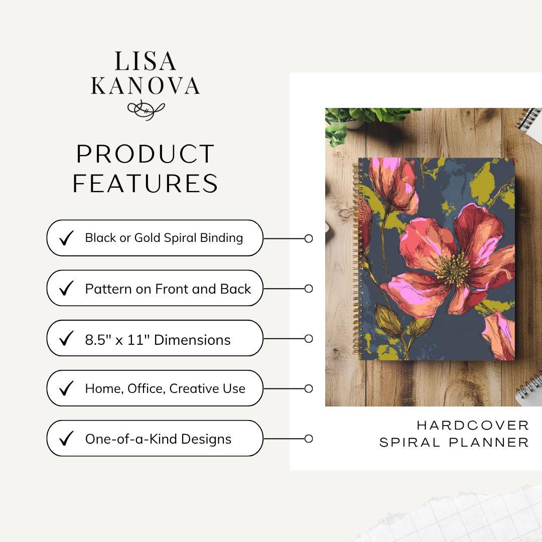 Elevate your planning experience with the Signature Planner Hardcover Spiral in a luxurious 8.5" x 11" size, where sophistication meets functionality. Available in chic Black or radiant Gold, this planner is more than just a tool—it's a statement piece for the modern woman. Adorned with oversized signature floral designs by the talented Lisa Kanova, each page invites you to embrace your creativity and organize your life with flair. The sturdy hardcover and elegant spiral binding ensure durability while allowing for effortless page turning. Whether you’re scheduling meetings, jotting down dreams, or mapping out your goals, this planner is designed to inspire and empower. Perfect for the discerning woman who appreciates both style and substance, the Signature Planner redefines the art of planning. Discover a blend of functionality and fashion that keeps you motivated and organized all year long. Experience the joy of elegant planning with a touch of luxury that speaks to your unique sense of style.