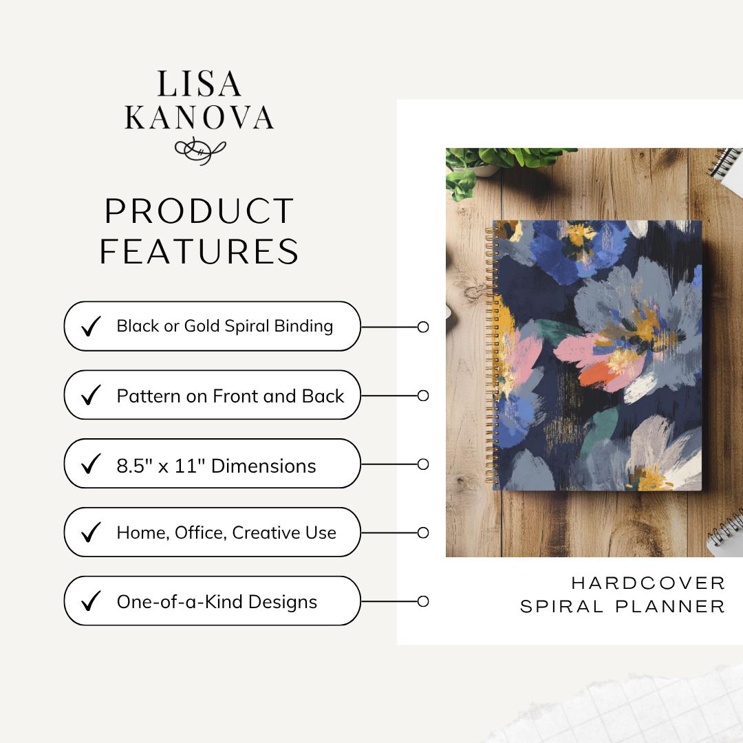Elevate your planning experience with the Signature Planner Hardcover Spiral in a luxurious 8.5" x 11" size, where sophistication meets functionality. Available in chic Black or radiant Gold, this planner is more than just a tool—it's a statement piece for the modern woman. Adorned with oversized signature floral designs by the talented Lisa Kanova, each page invites you to embrace your creativity and organize your life with flair. The sturdy hardcover and elegant spiral binding ensure durability while allowing for effortless page turning. Whether you’re scheduling meetings, jotting down dreams, or mapping out your goals, this planner is designed to inspire and empower. Perfect for the discerning woman who appreciates both style and substance, the Signature Planner redefines the art of planning. Discover a blend of functionality and fashion that keeps you motivated and organized all year long. Experience the joy of elegant planning with a touch of luxury that speaks to your unique sense of style.