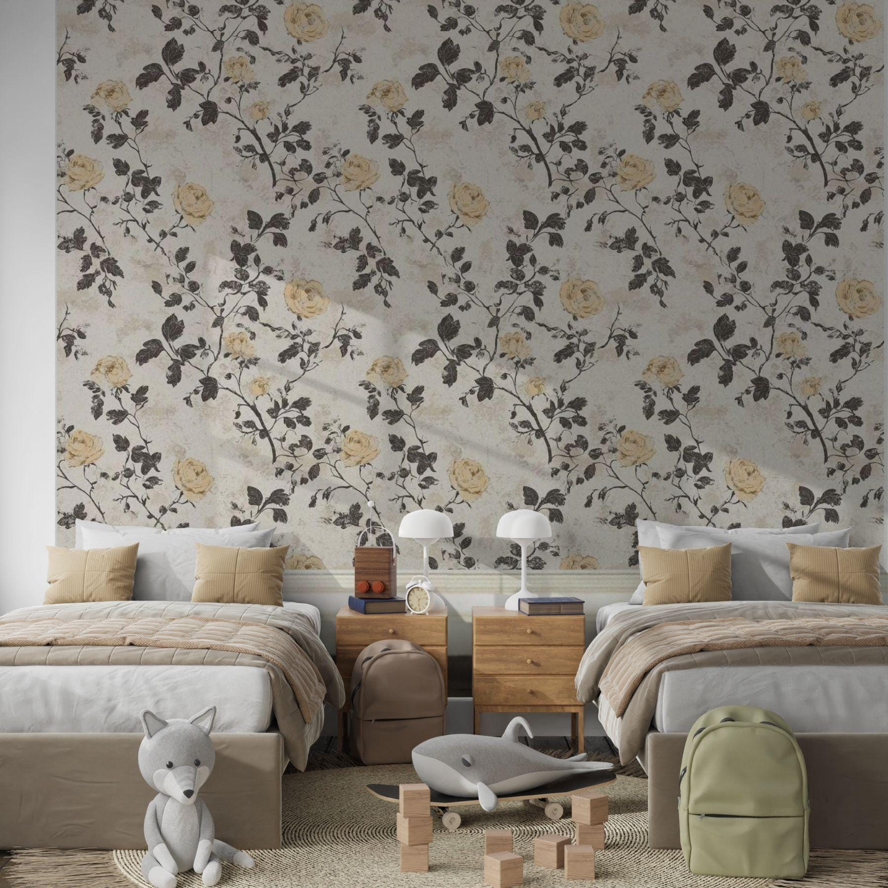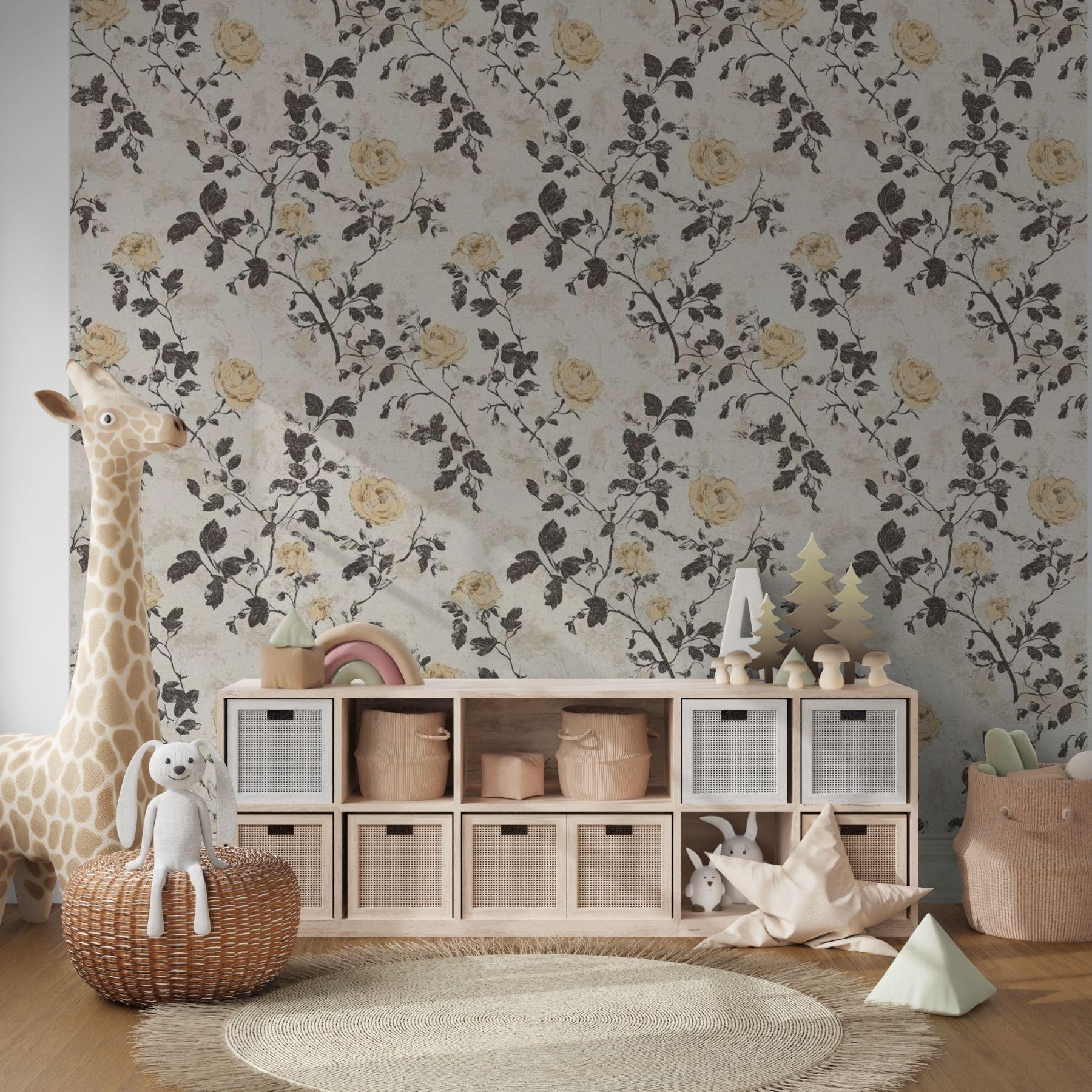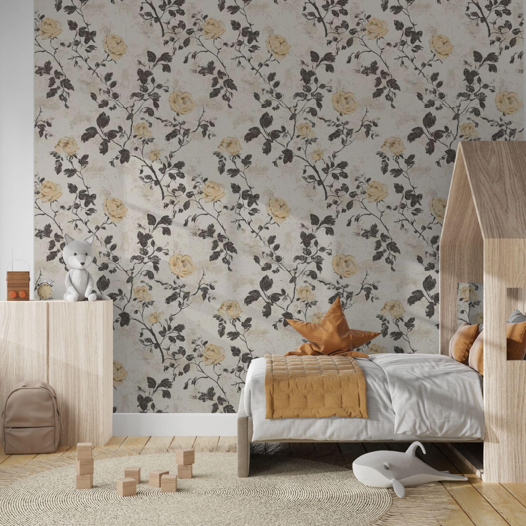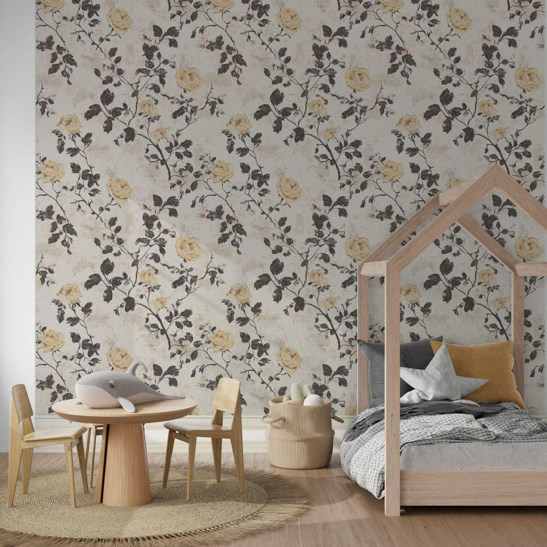Soft golden blooms trail across a timeworn parchment ground, creating a look that’s both refined and comforting. The muted palette and delicate florals bring quiet sophistication to nurseries and kids’ rooms — timeless and effortlessly elegant.