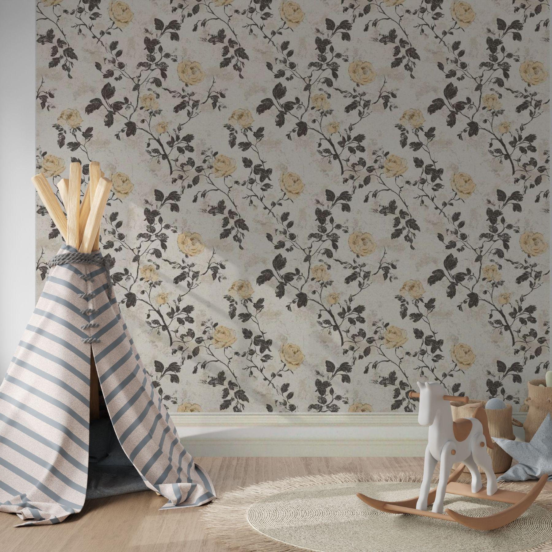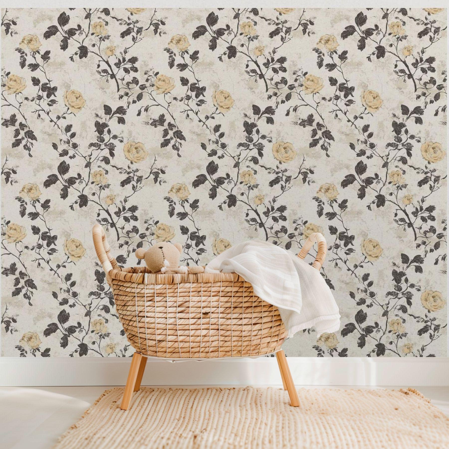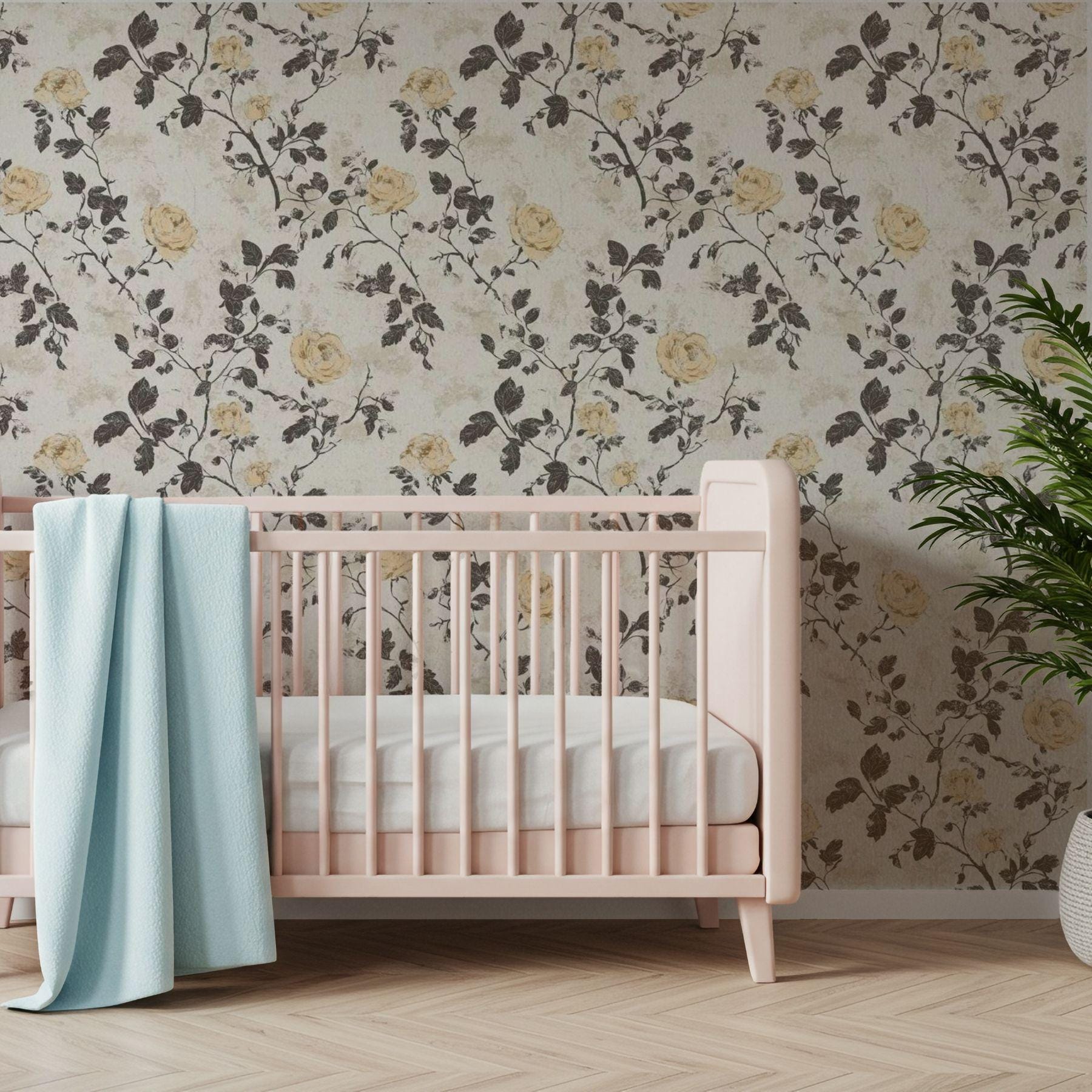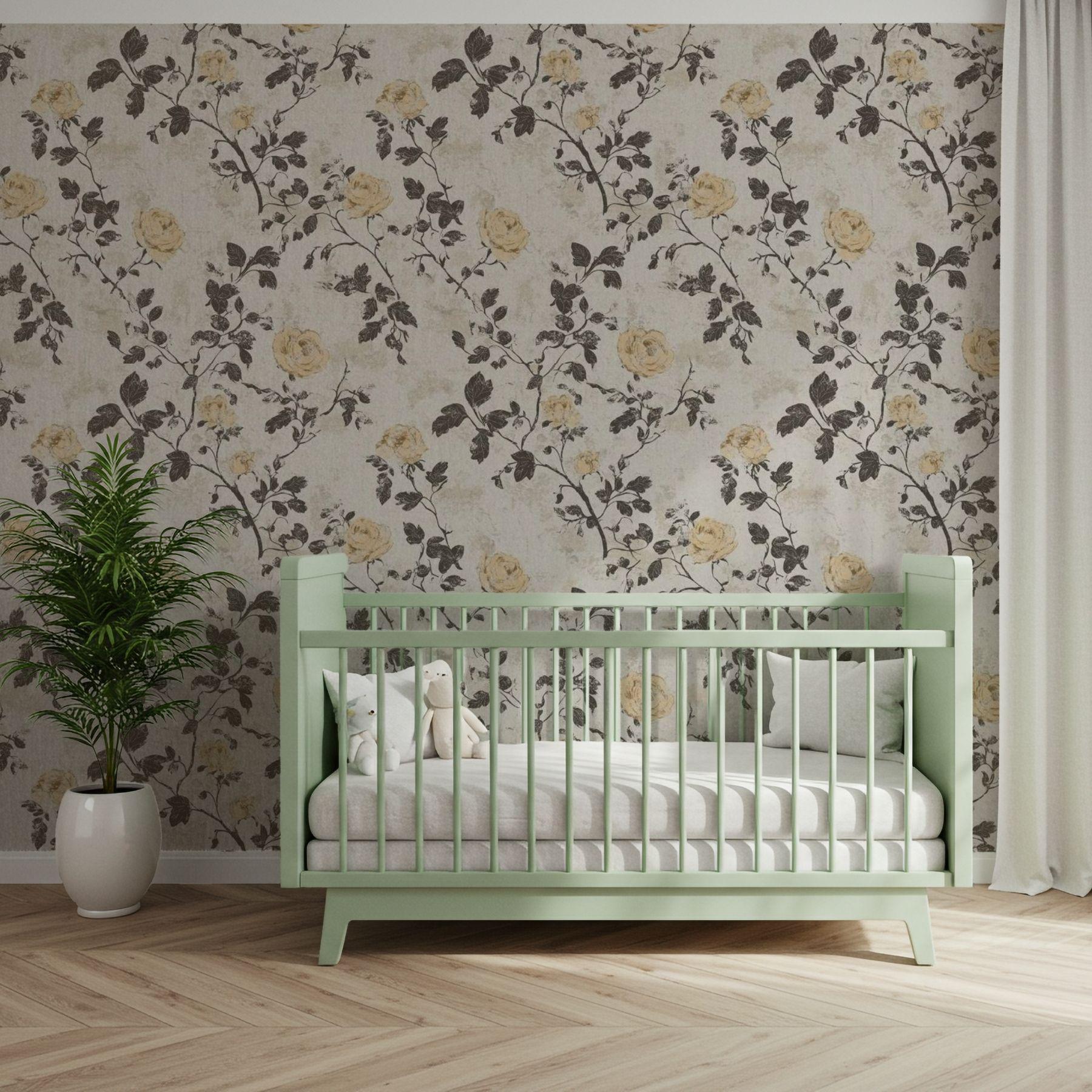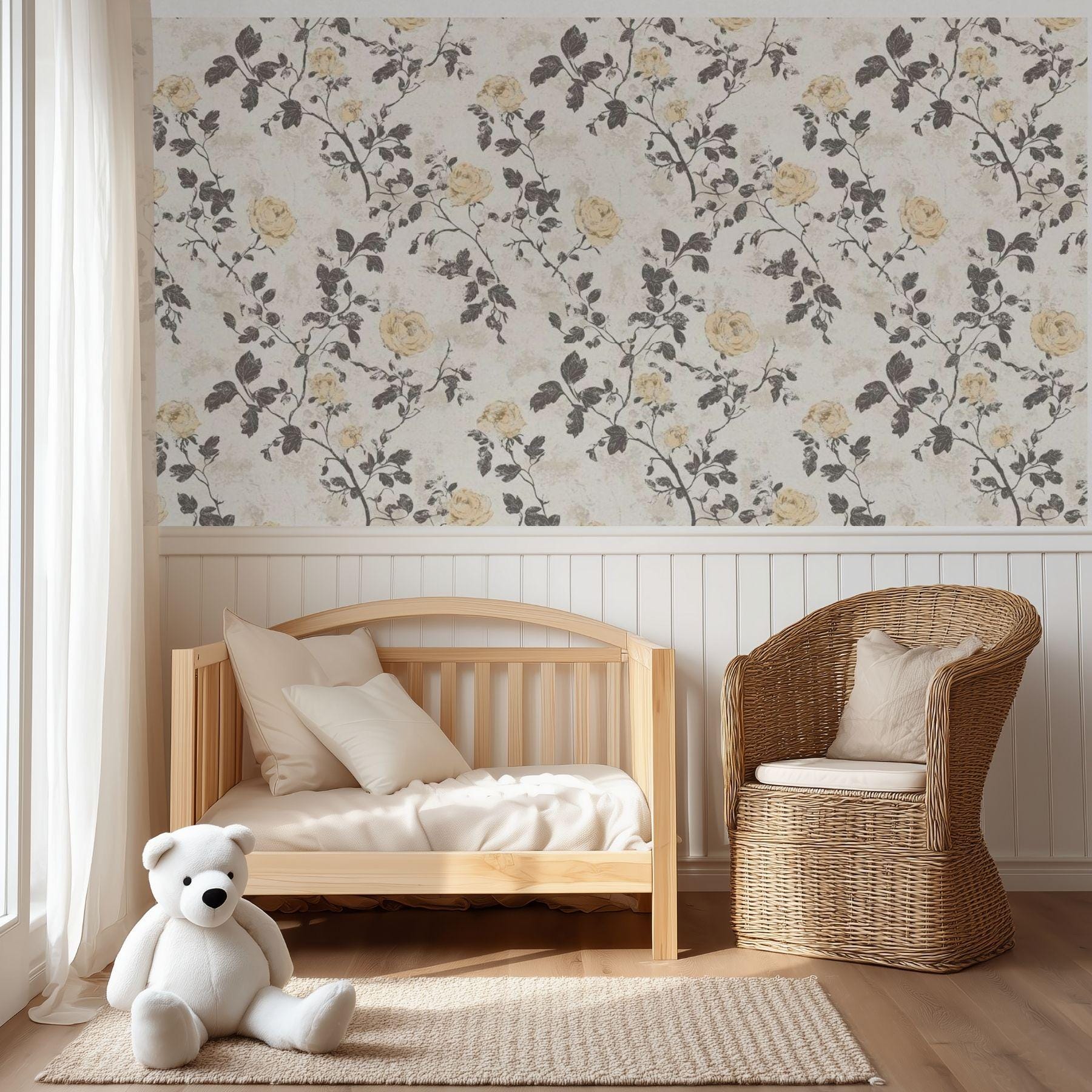 Soft golden blooms trail across a timeworn parchment ground, creating a look that’s both refined and comforting. The muted palette and delicate florals bring quiet sophistication to nurseries and kids’ rooms — timeless and effortlessly elegant.