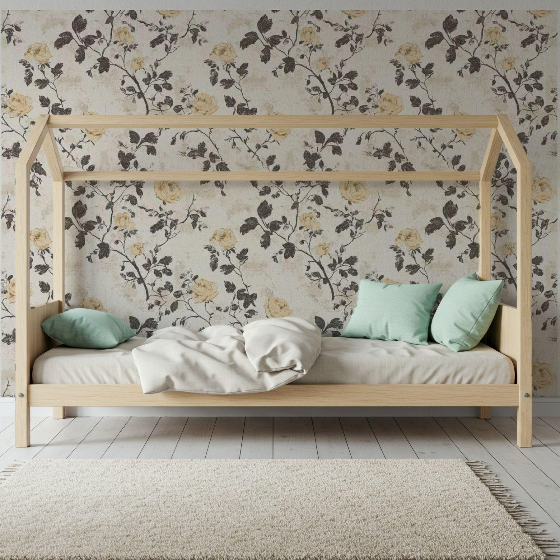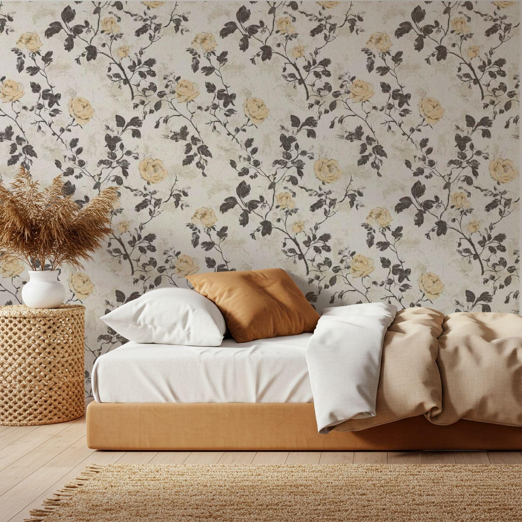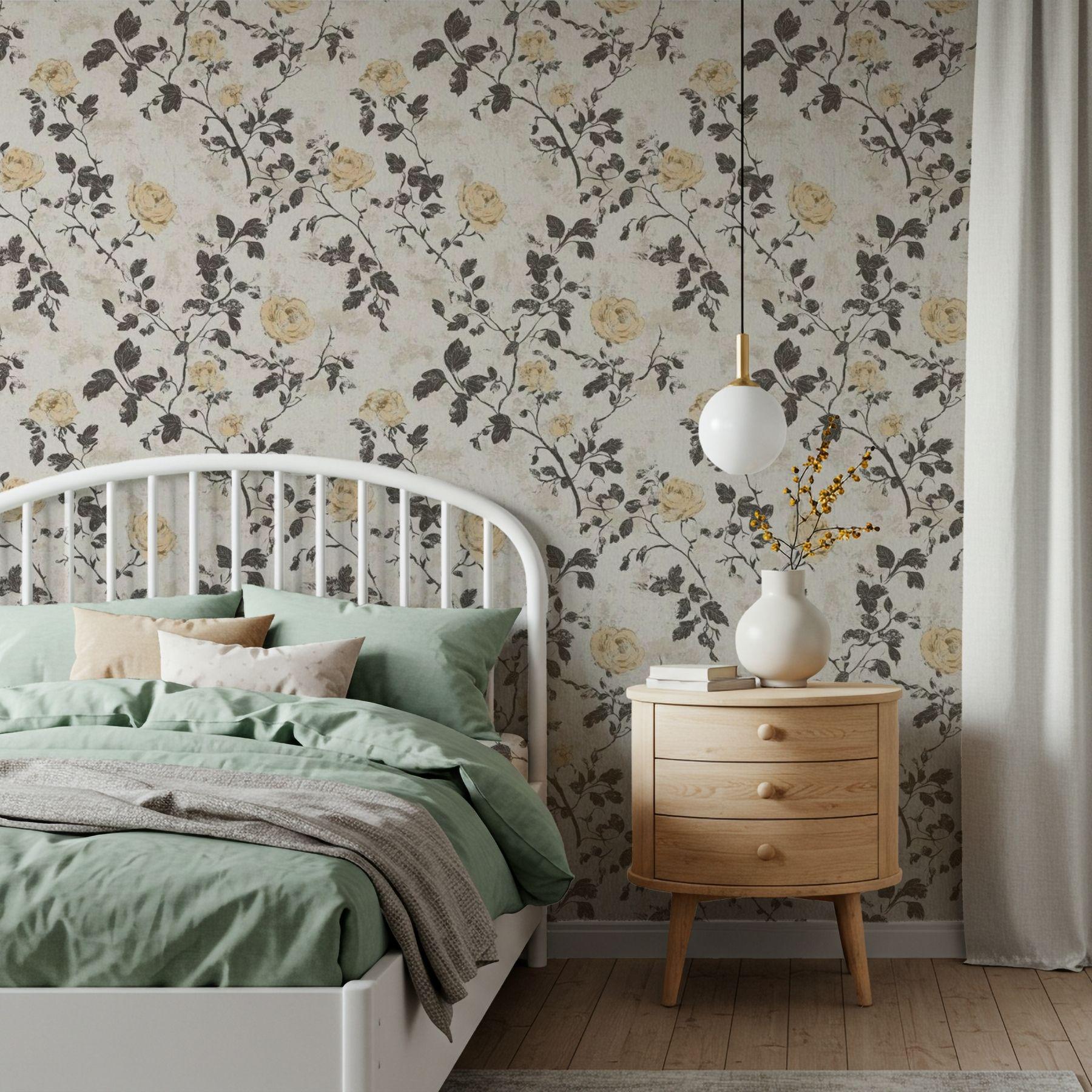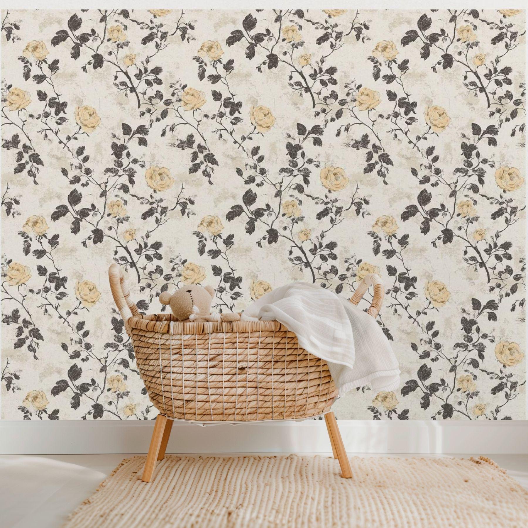 Soft golden blooms trail across a timeworn parchment ground, creating a look that’s both refined and comforting. The muted palette and delicate florals bring quiet sophistication to nurseries and kids’ rooms — timeless and effortlessly elegant.