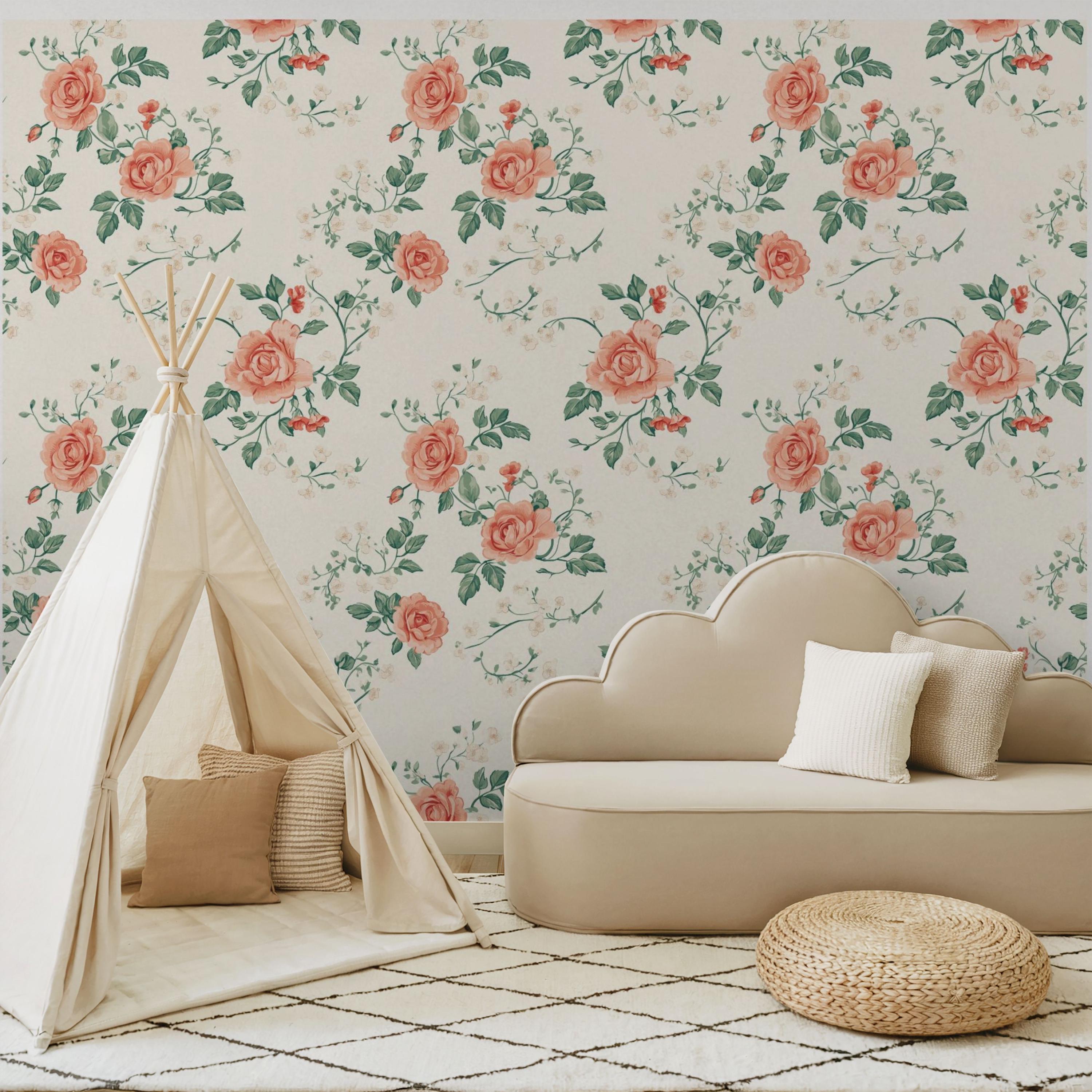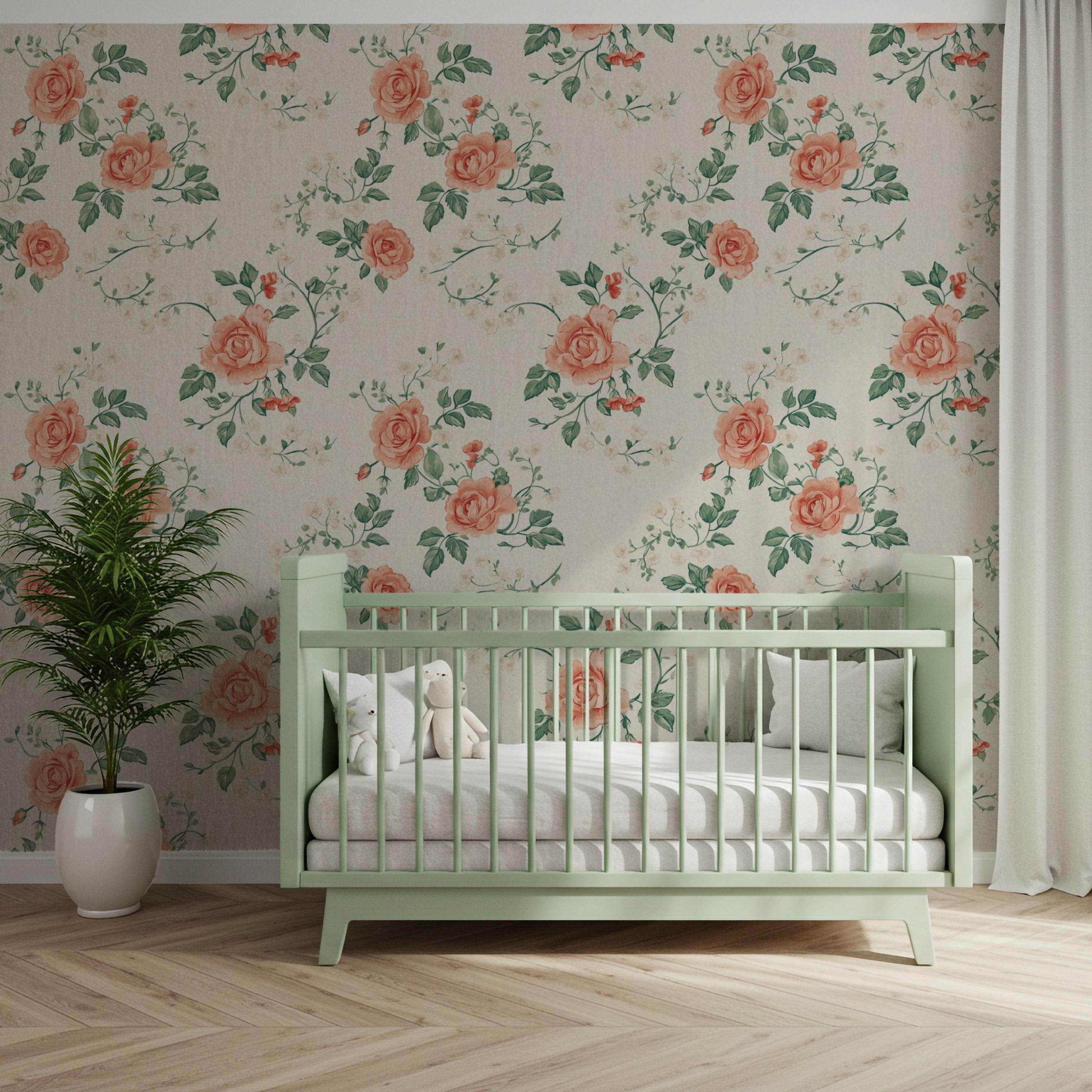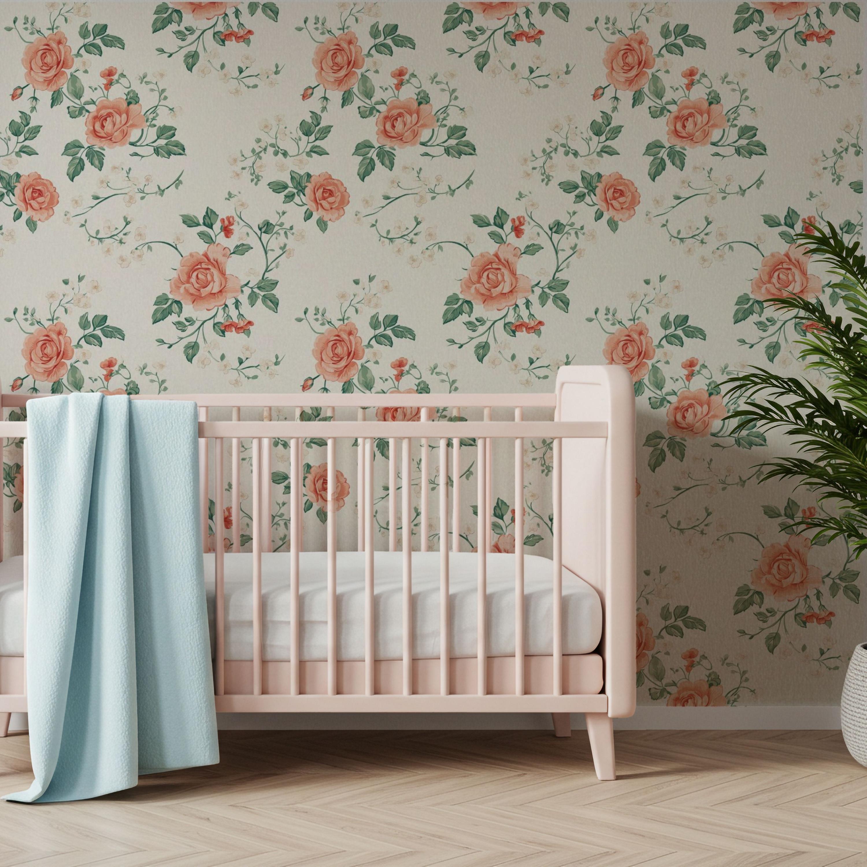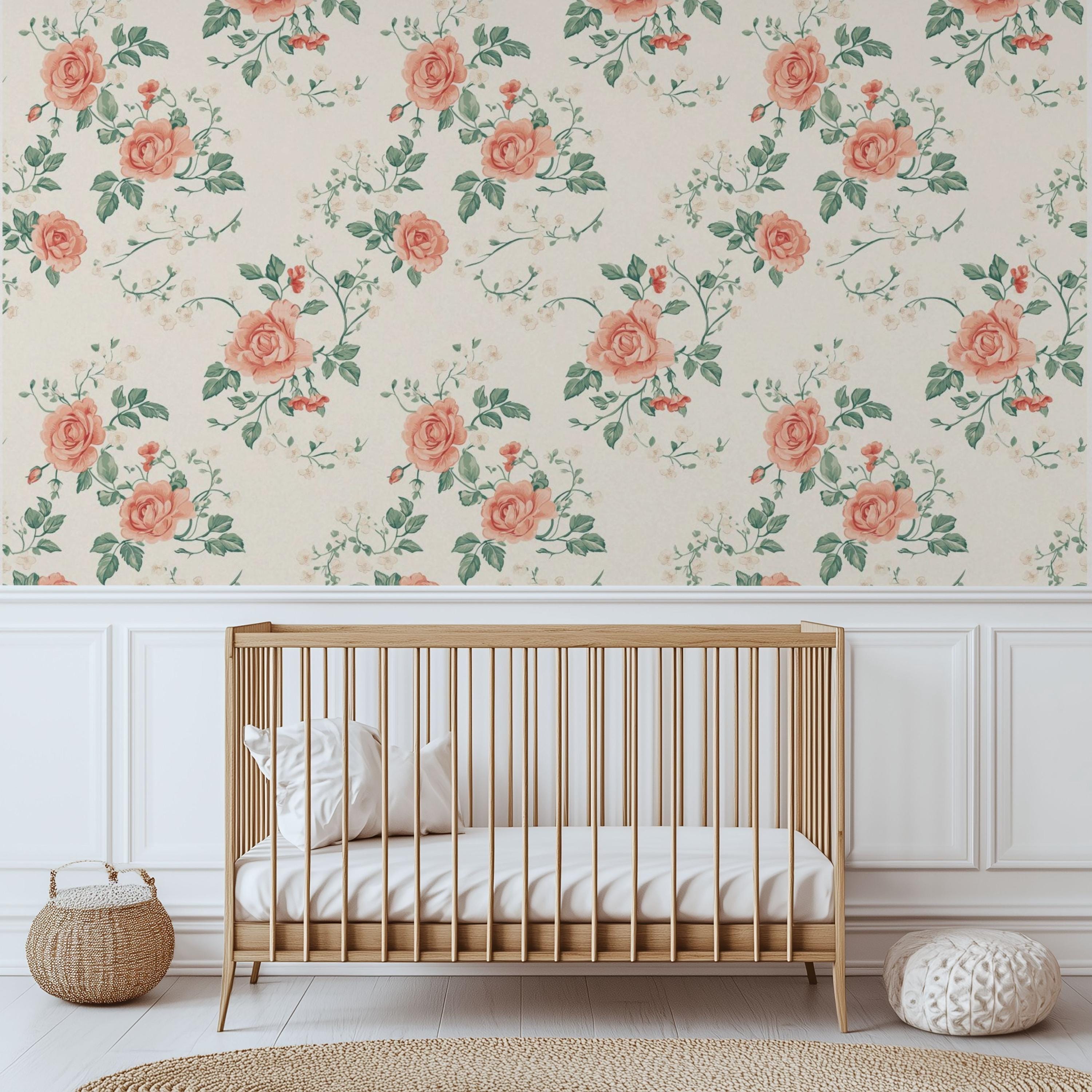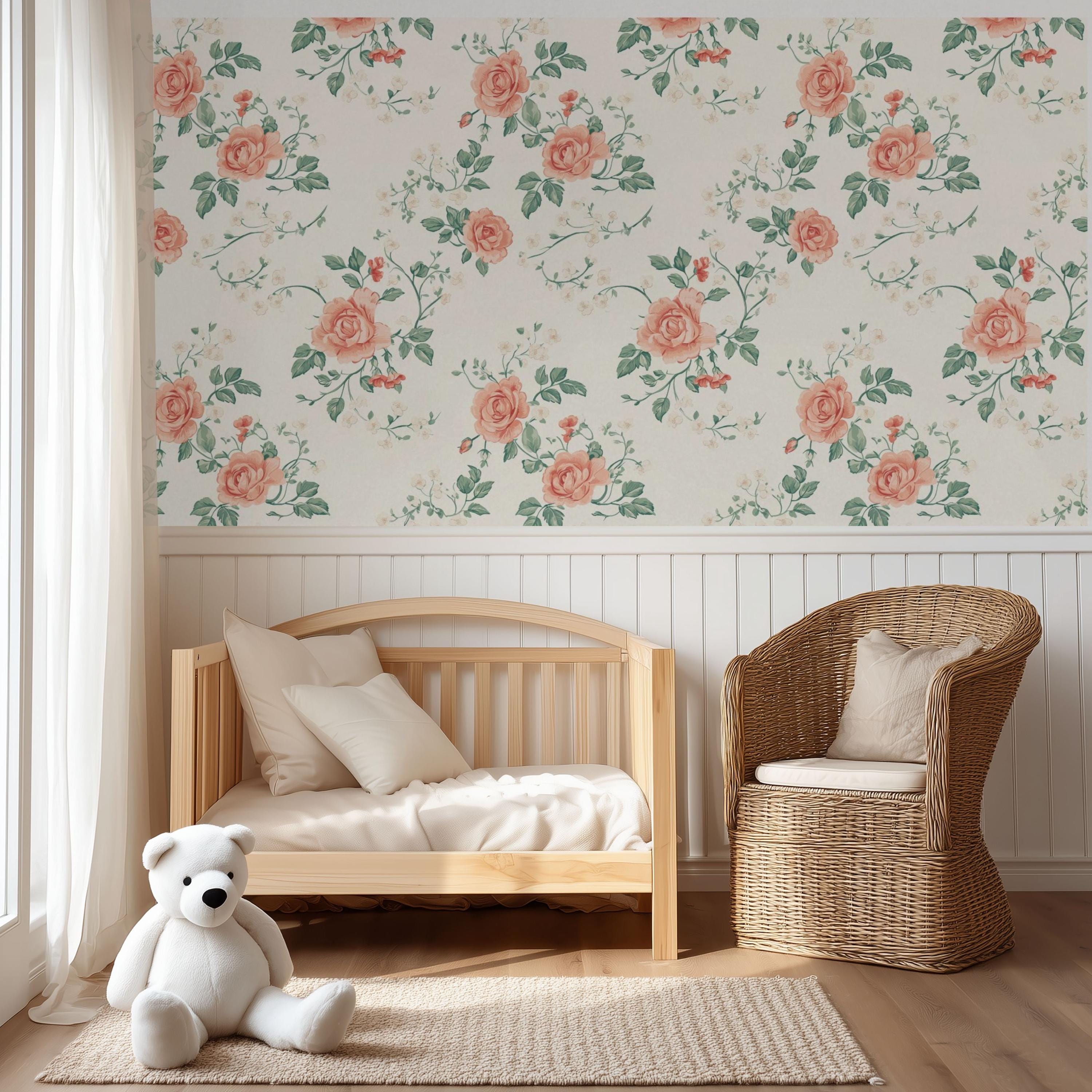 Soft coral roses bloom across a creamy backdrop, bringing warmth and vintage grace to any nursery or child’s space. The painterly petals and gentle green leaves create a timeless look — romantic yet refined, like a garden captured in soft sunlight.