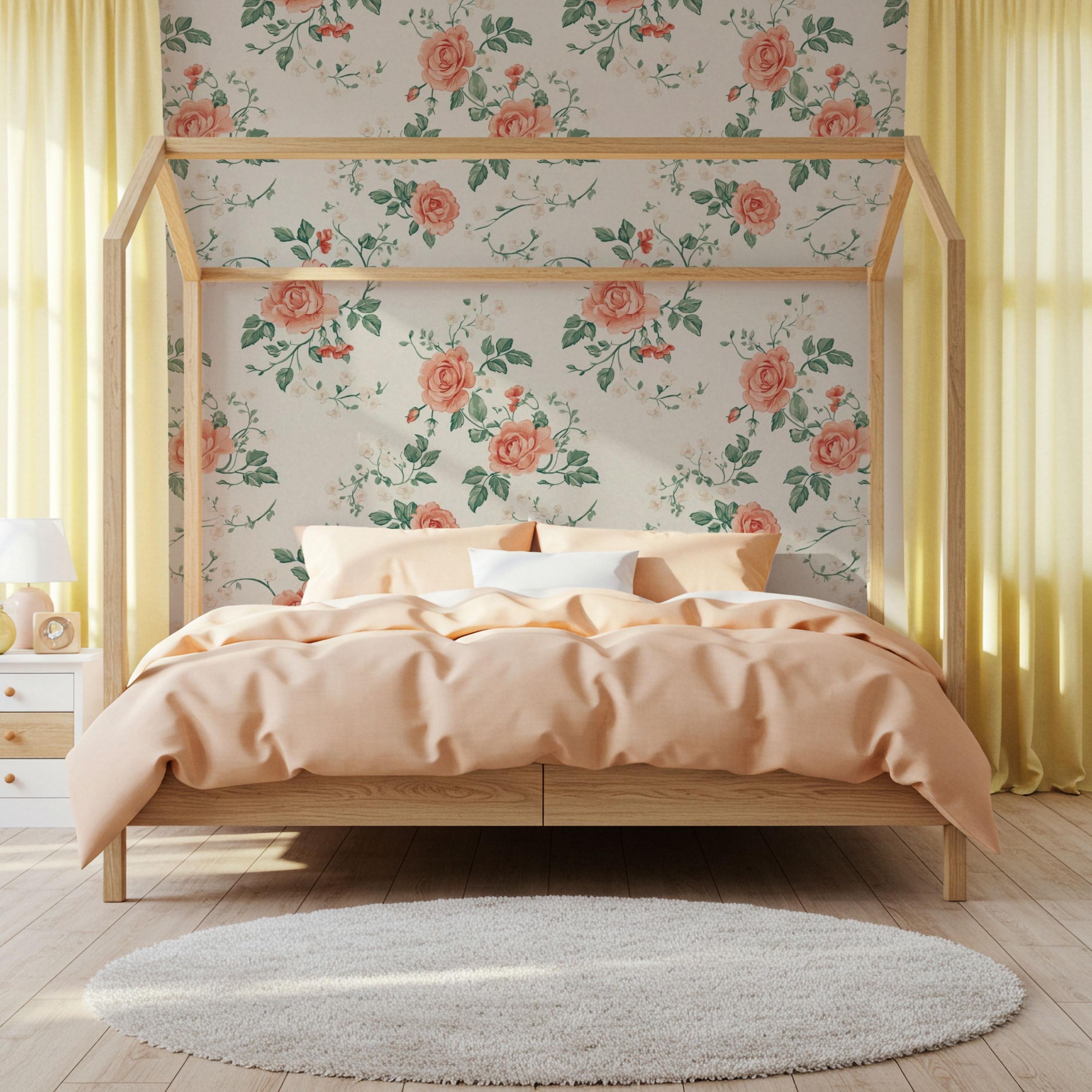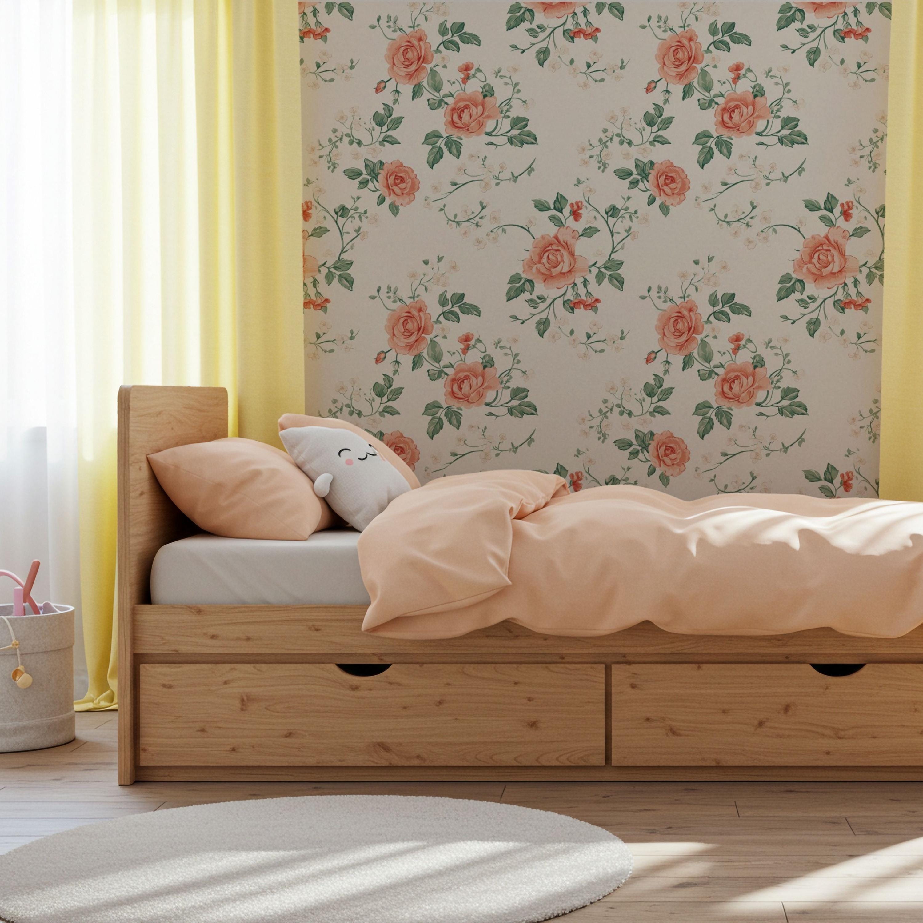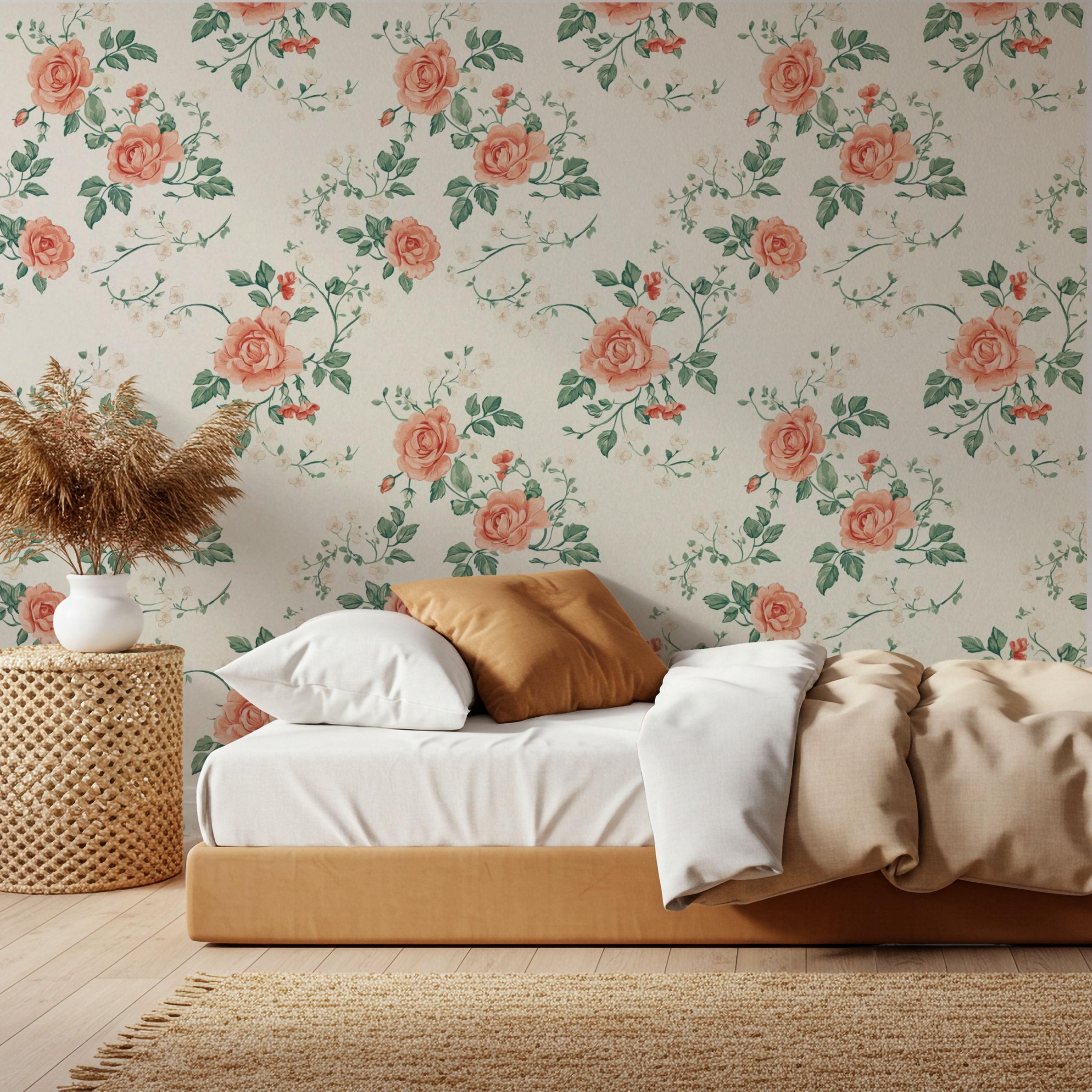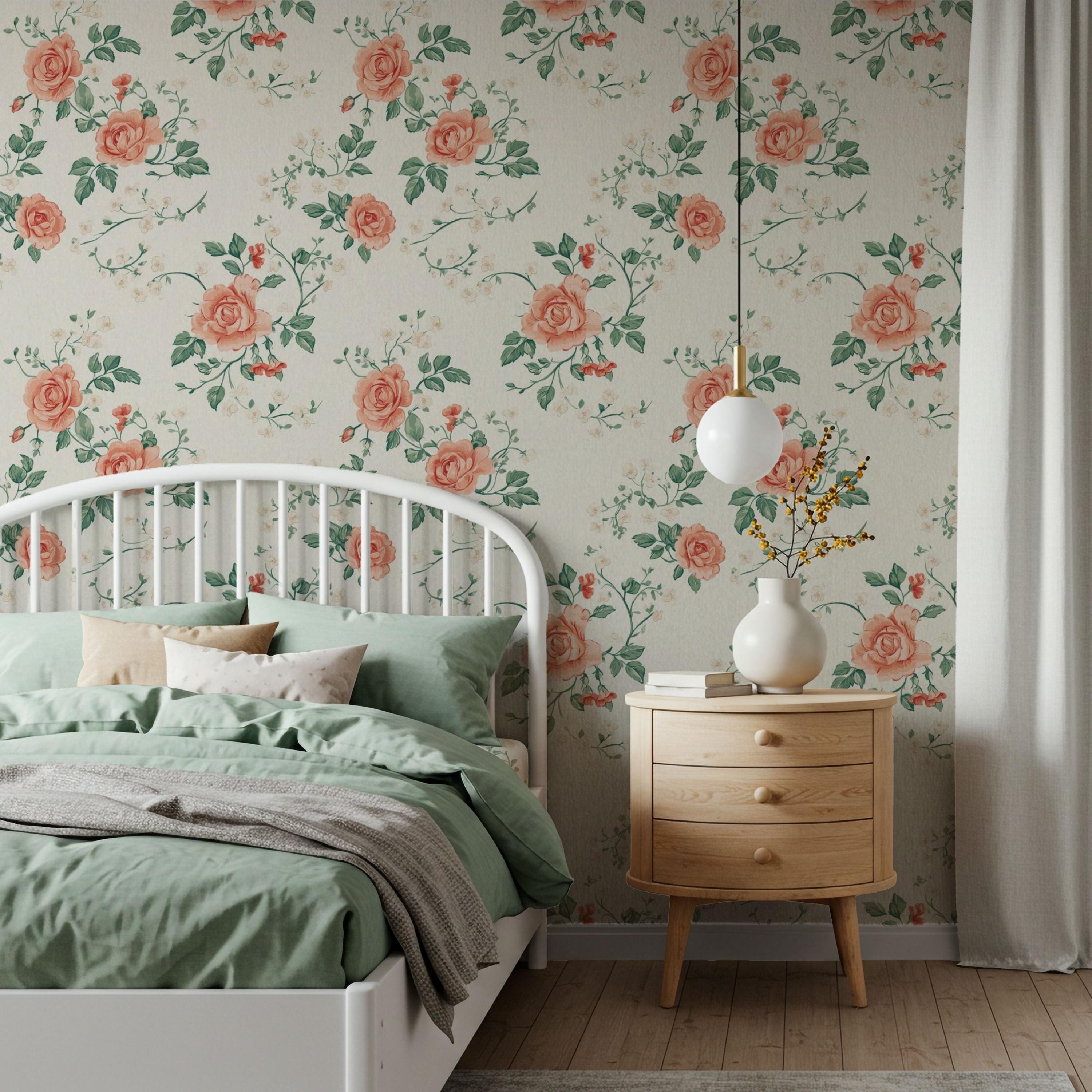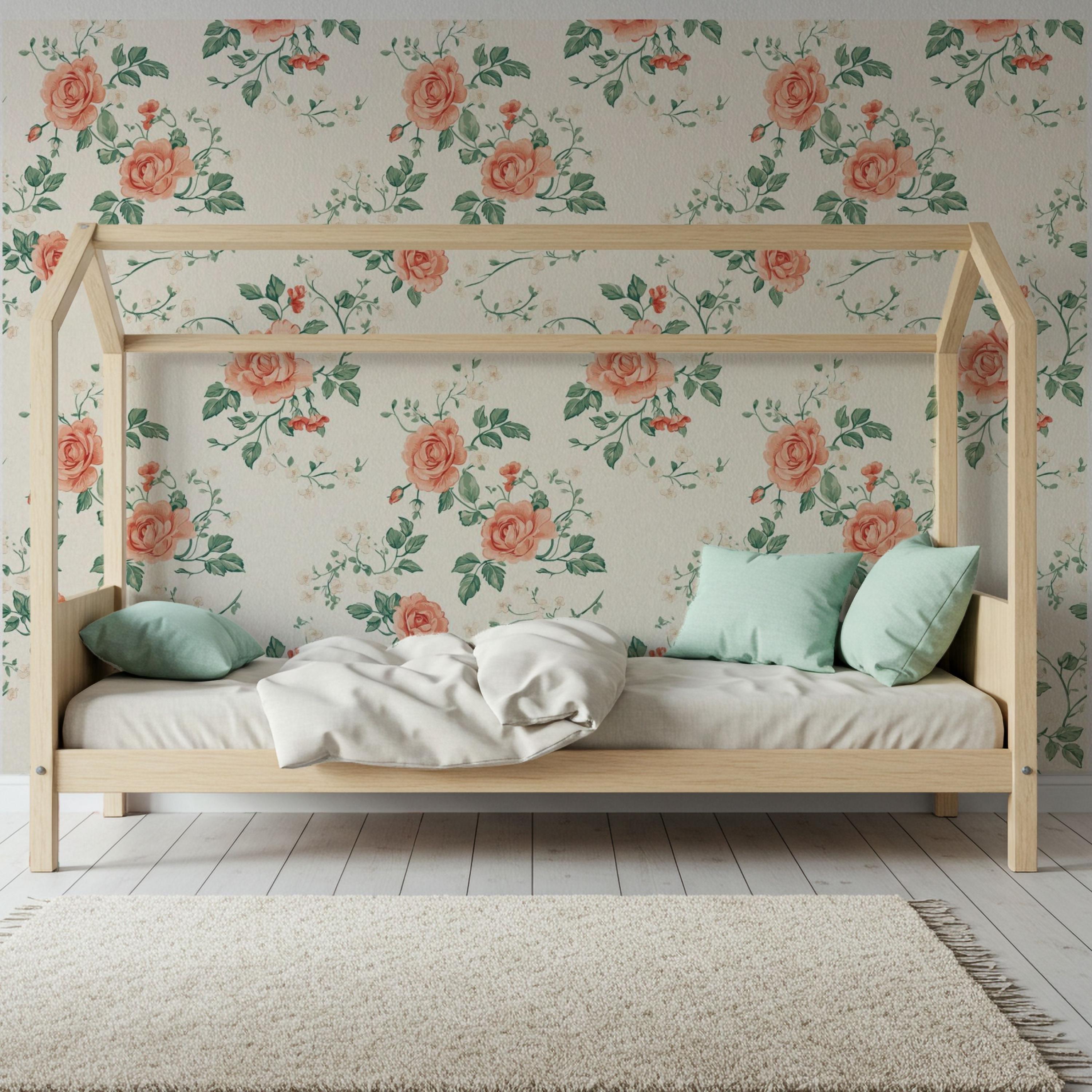 Soft coral roses bloom across a creamy backdrop, bringing warmth and vintage grace to any nursery or child’s space. The painterly petals and gentle green leaves create a timeless look — romantic yet refined, like a garden captured in soft sunlight.
