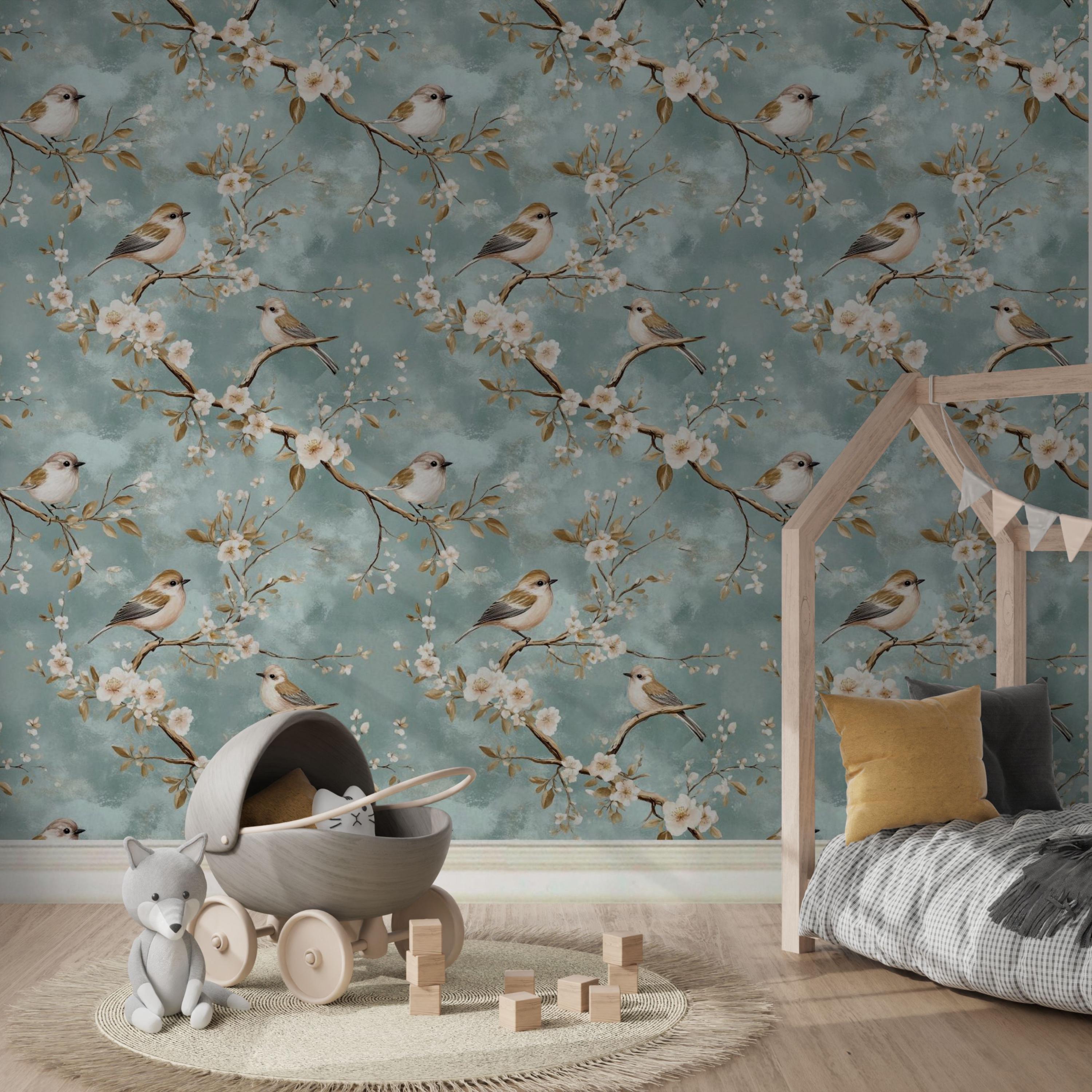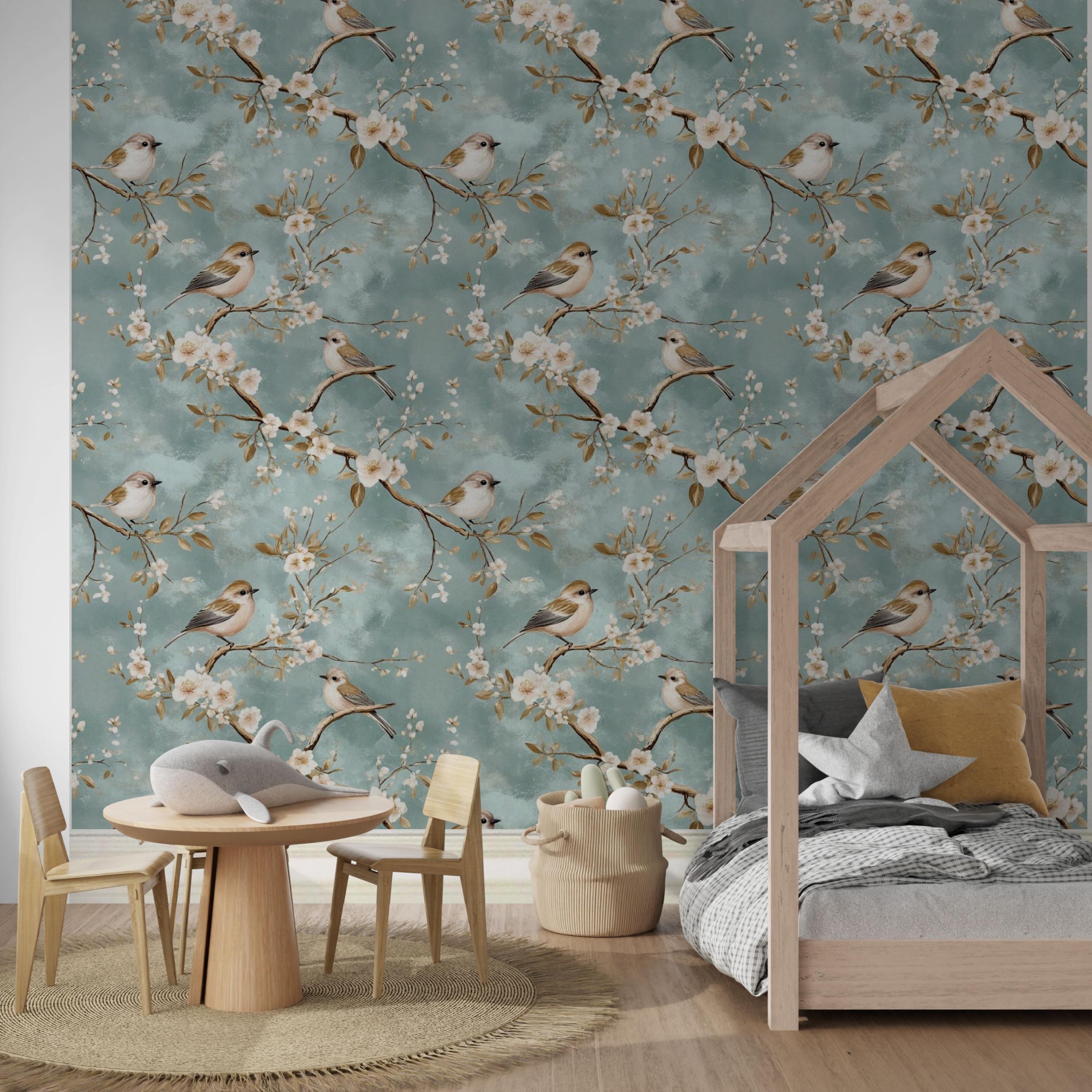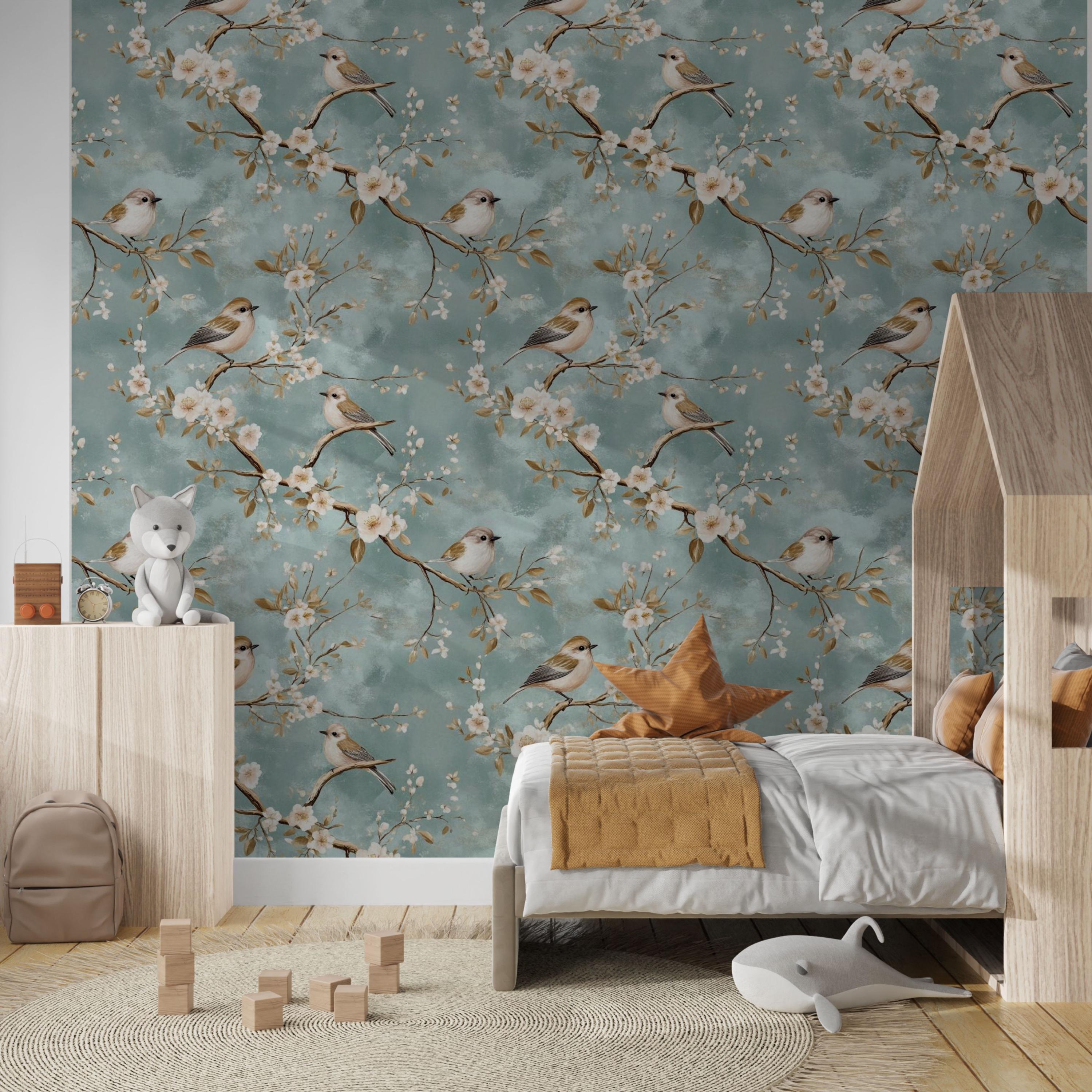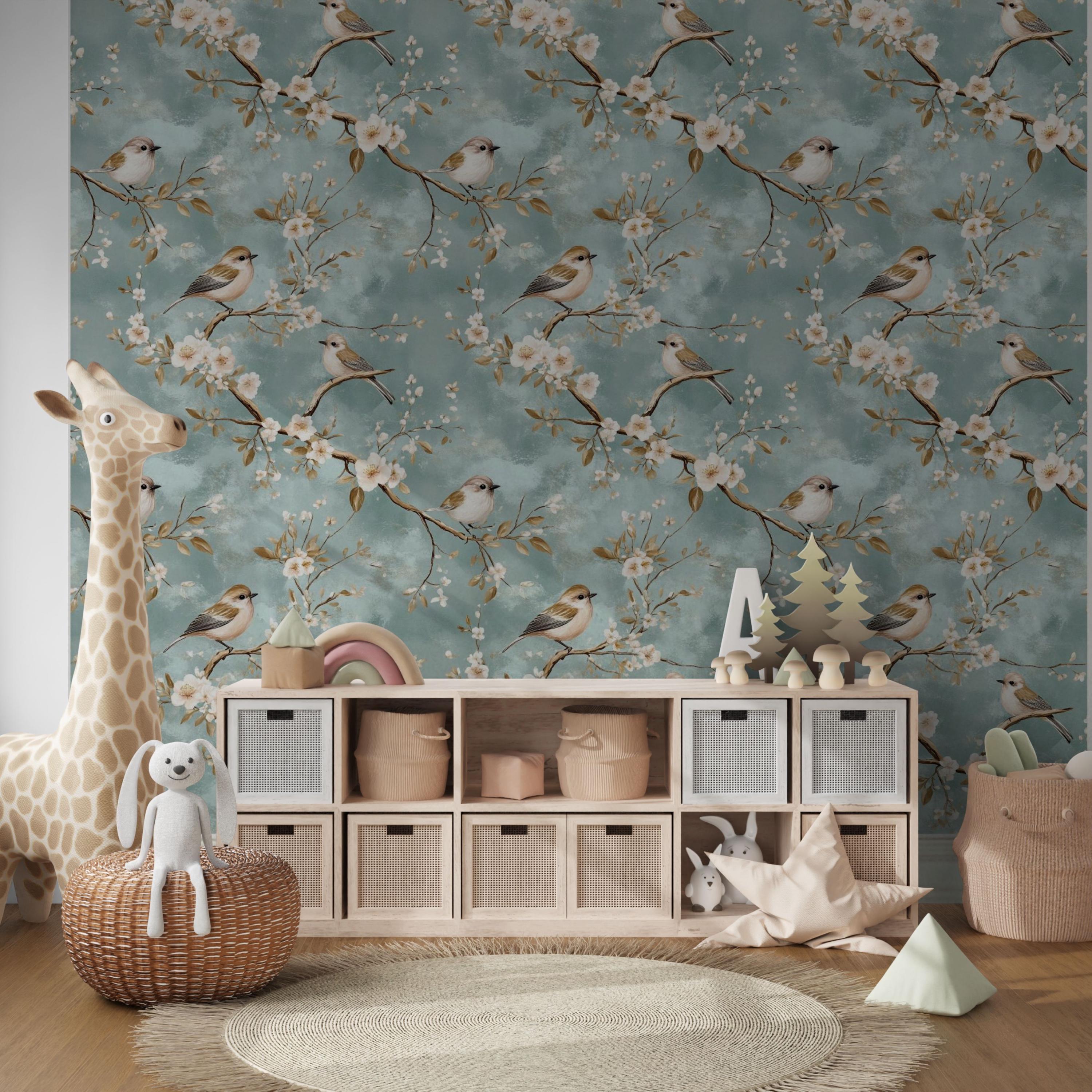 Soft songbirds rest among blooming branches, creating a sense of calm and gentle wonder. The hand-painted look and muted teal tones bring warmth and artistry to a nursery or kids’ space — a timeless design that feels both tender and refined.
