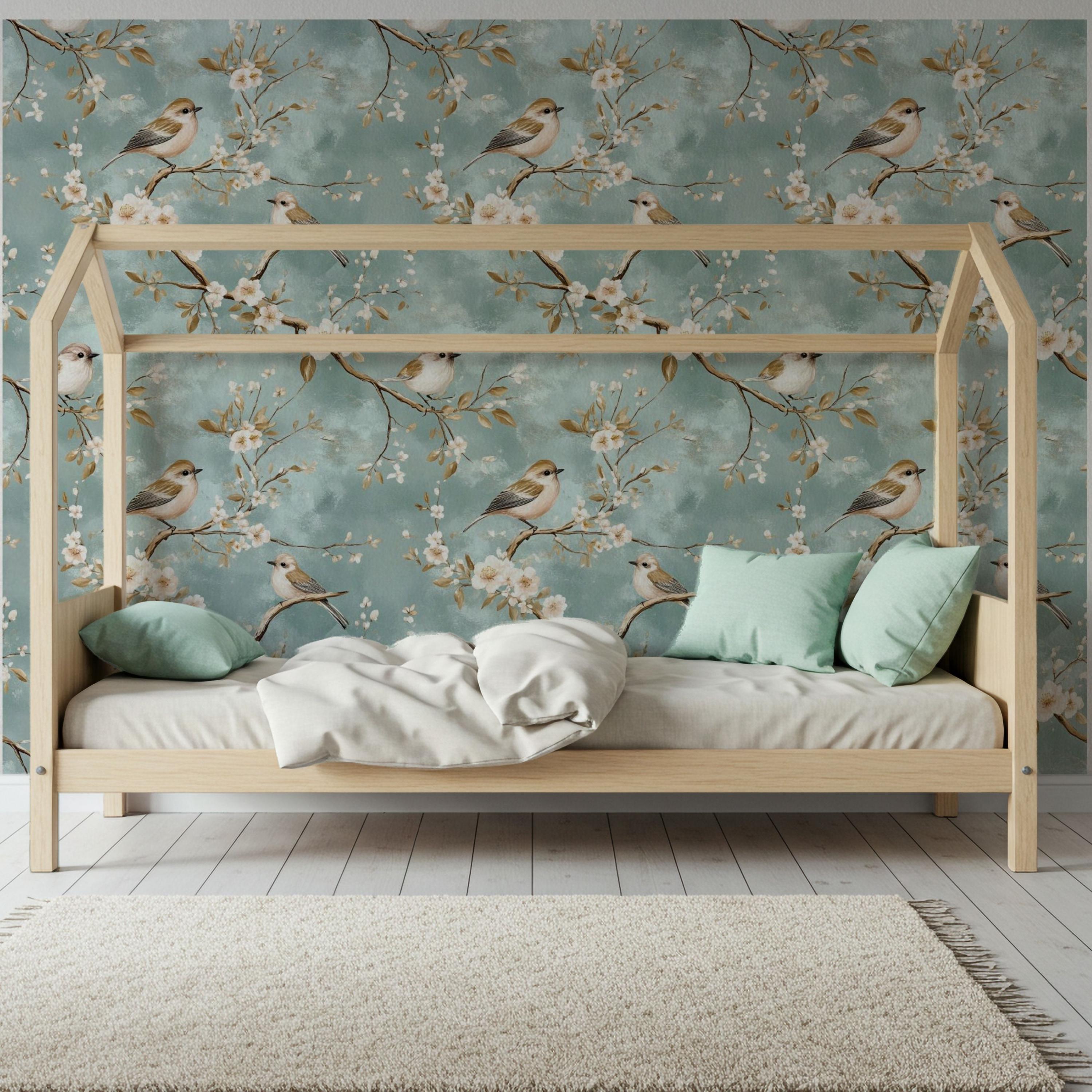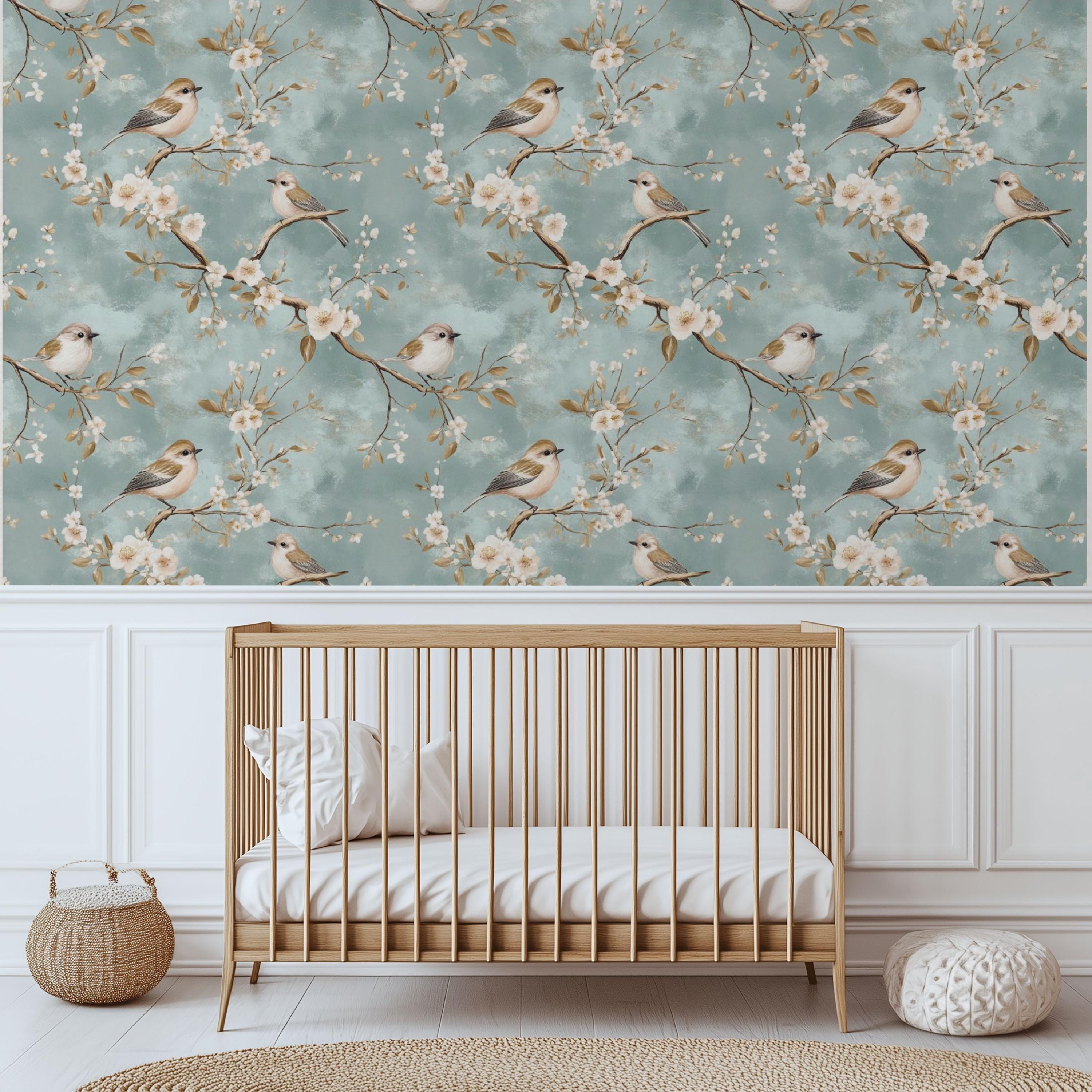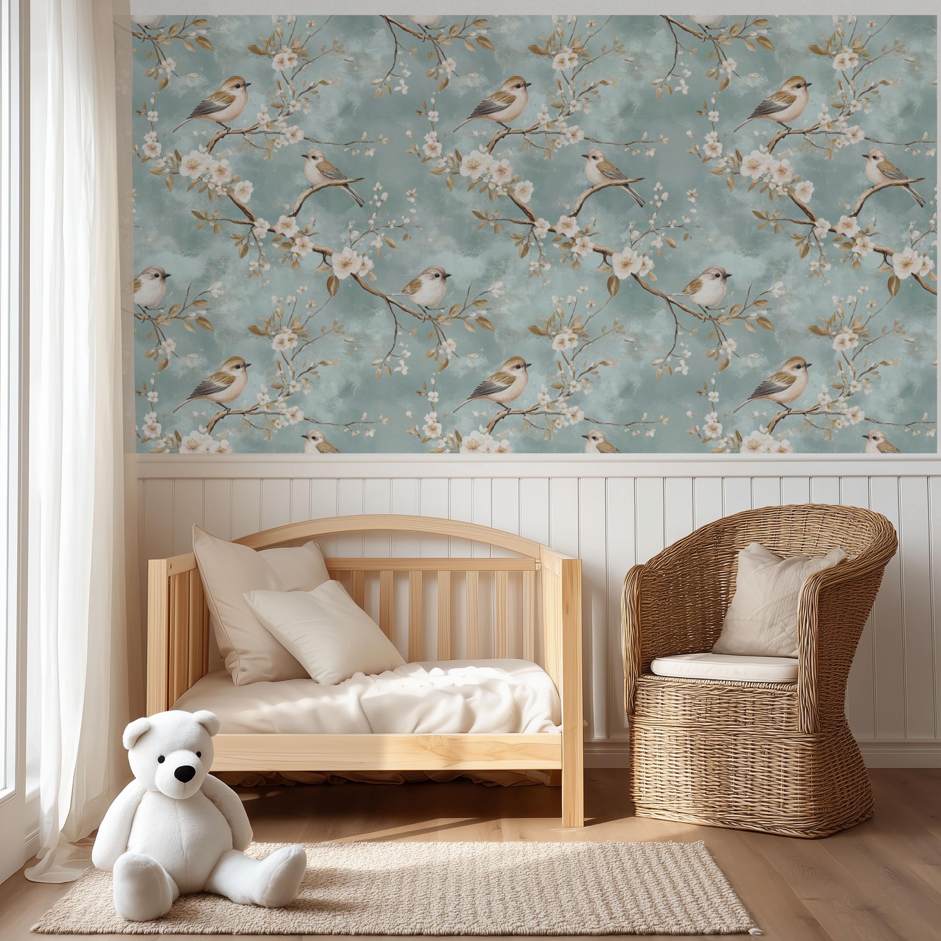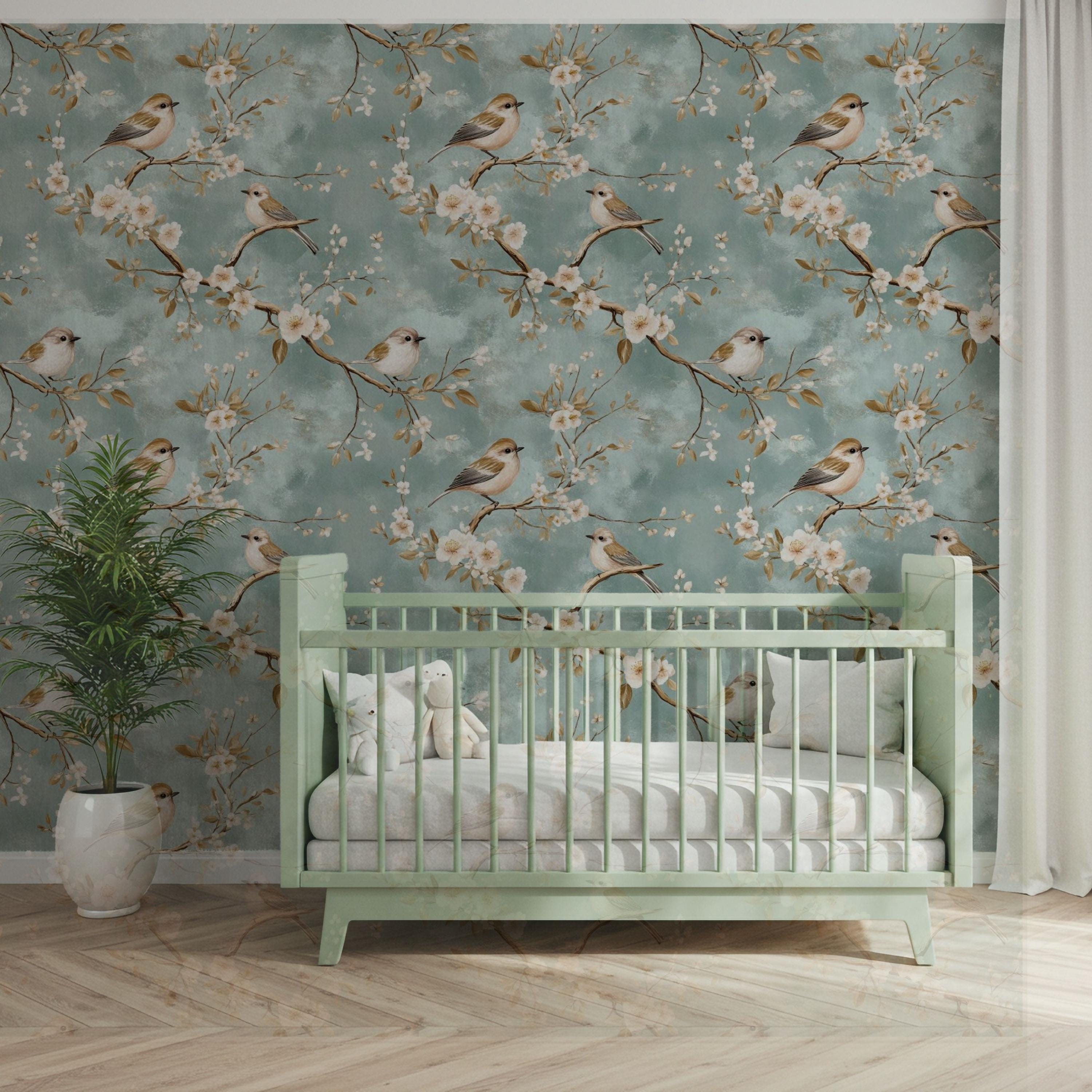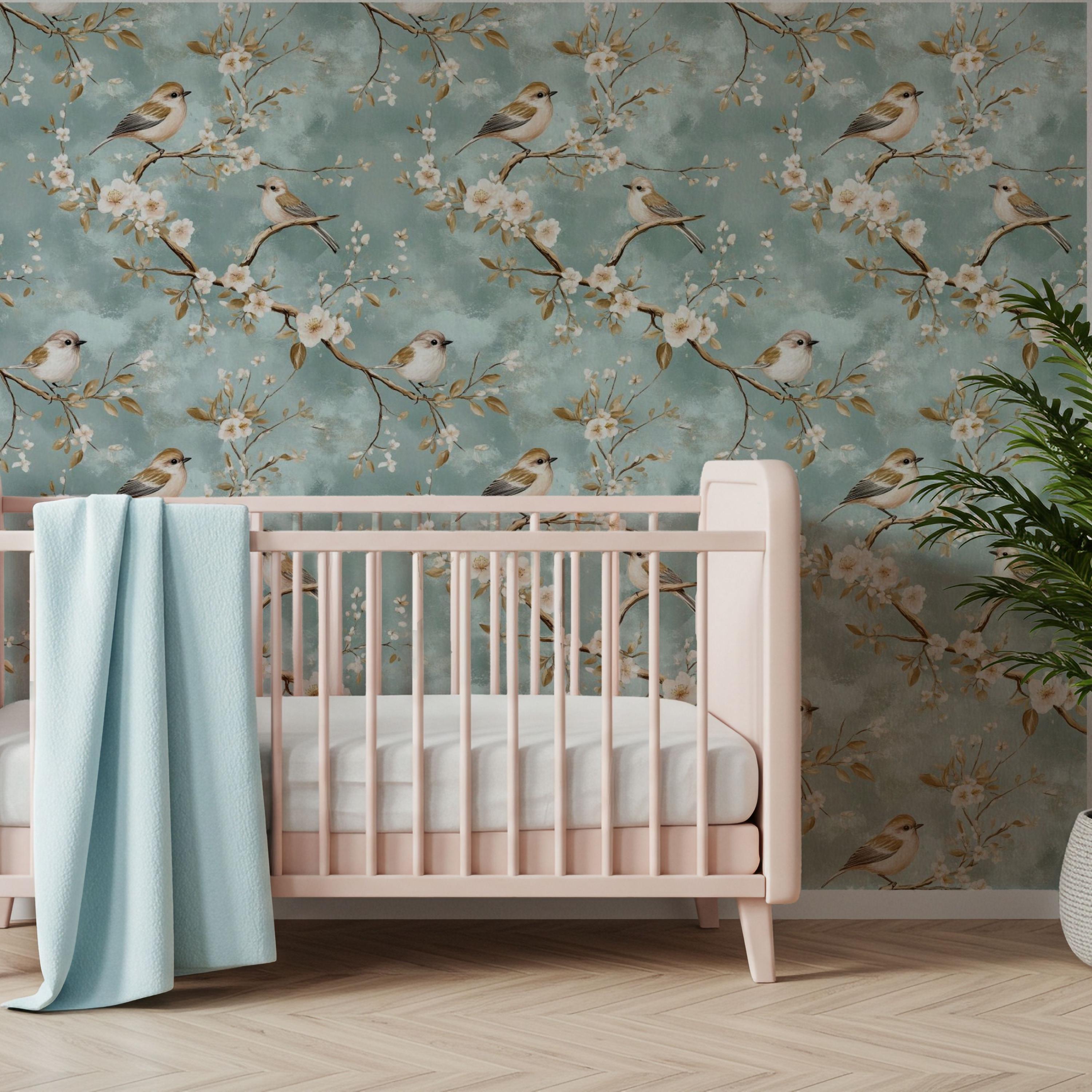Soft songbirds rest among blooming branches, creating a sense of calm and gentle wonder. The hand-painted look and muted teal tones bring warmth and artistry to a nursery or kids’ space — a timeless design that feels both tender and refined.