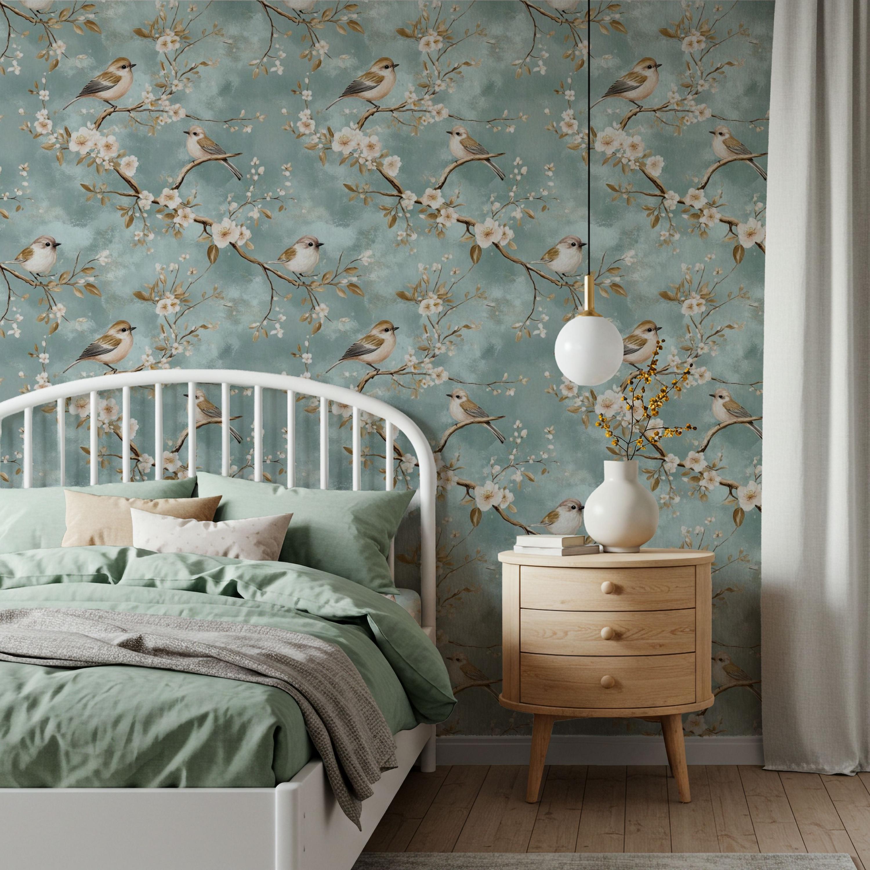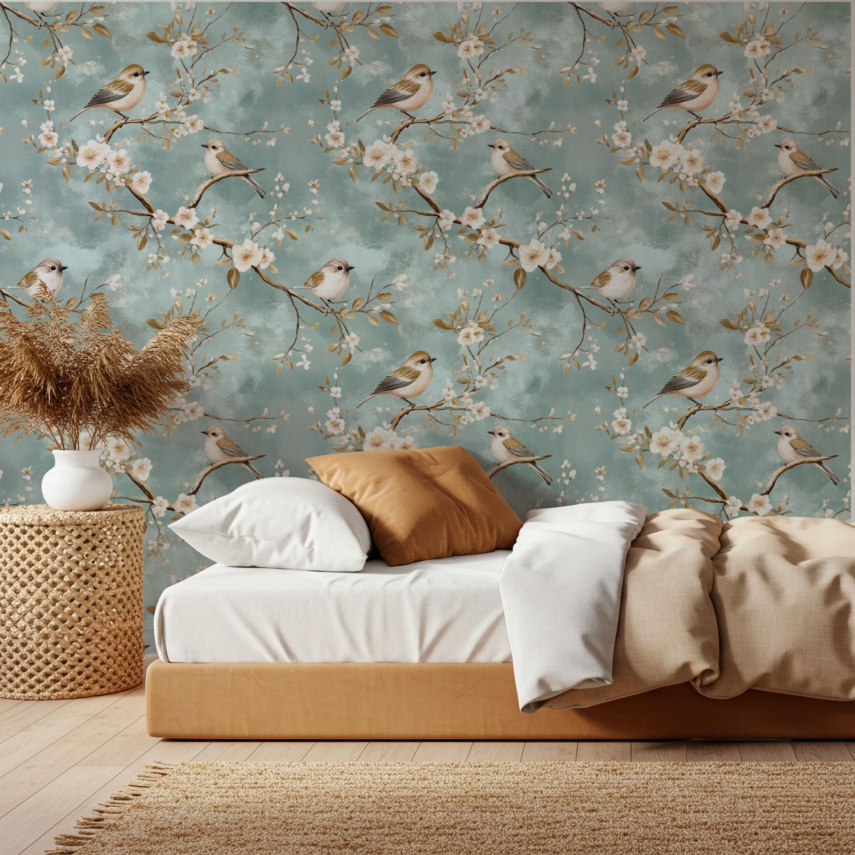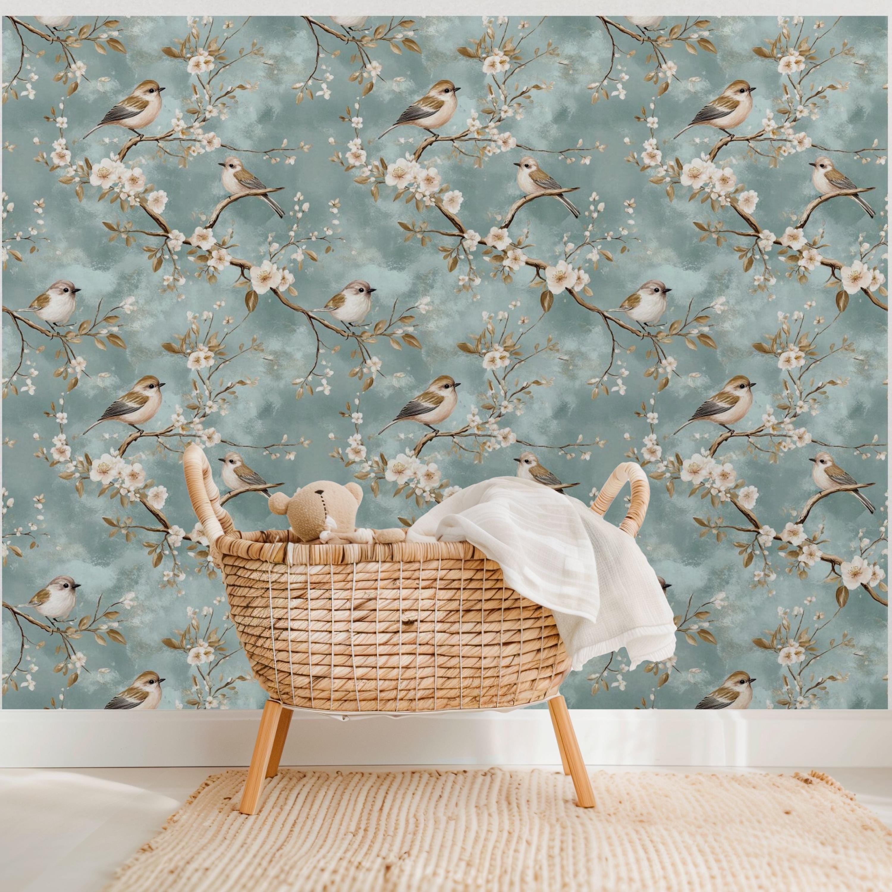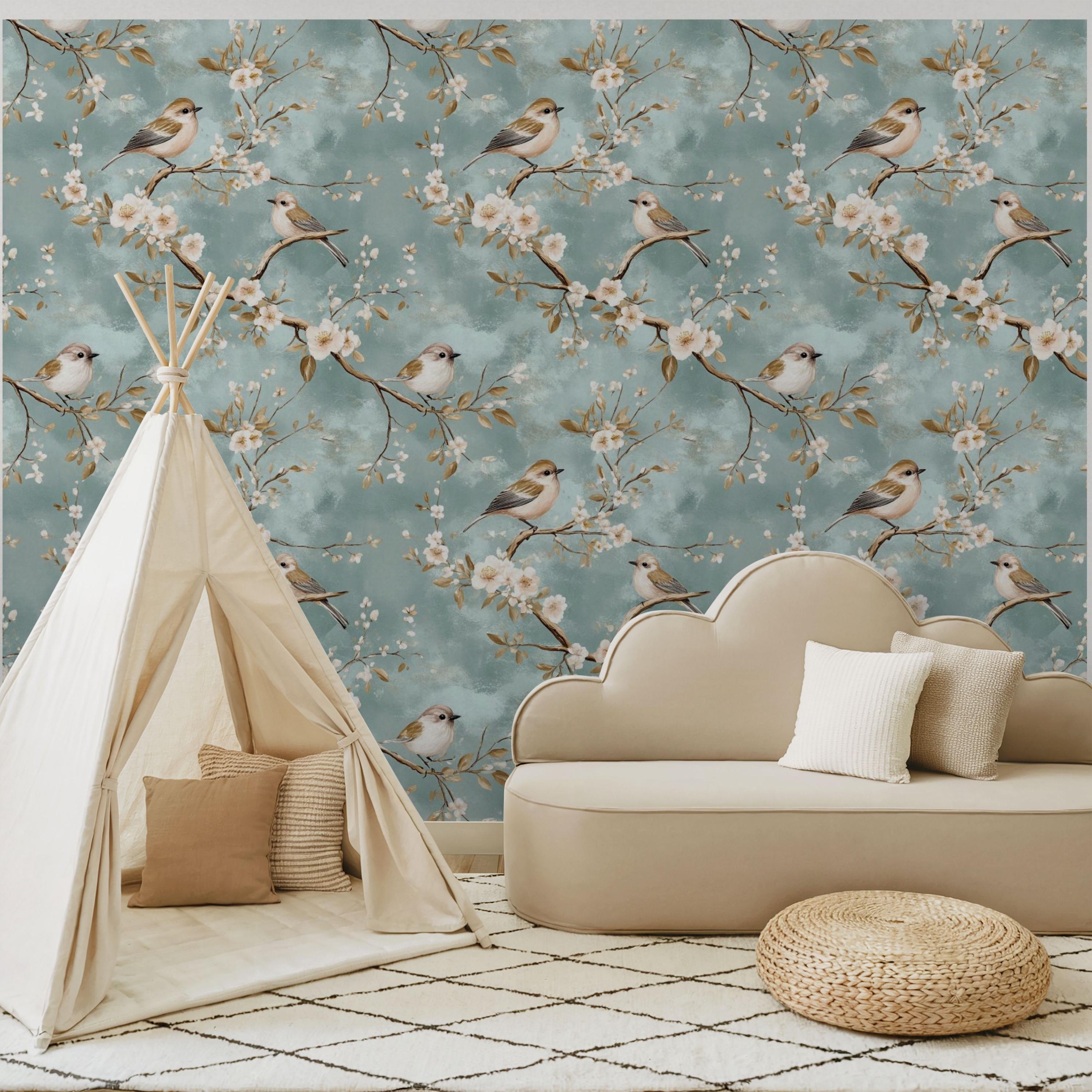 Soft songbirds rest among blooming branches, creating a sense of calm and gentle wonder. The hand-painted look and muted teal tones bring warmth and artistry to a nursery or kids’ space — a timeless design that feels both tender and refined.