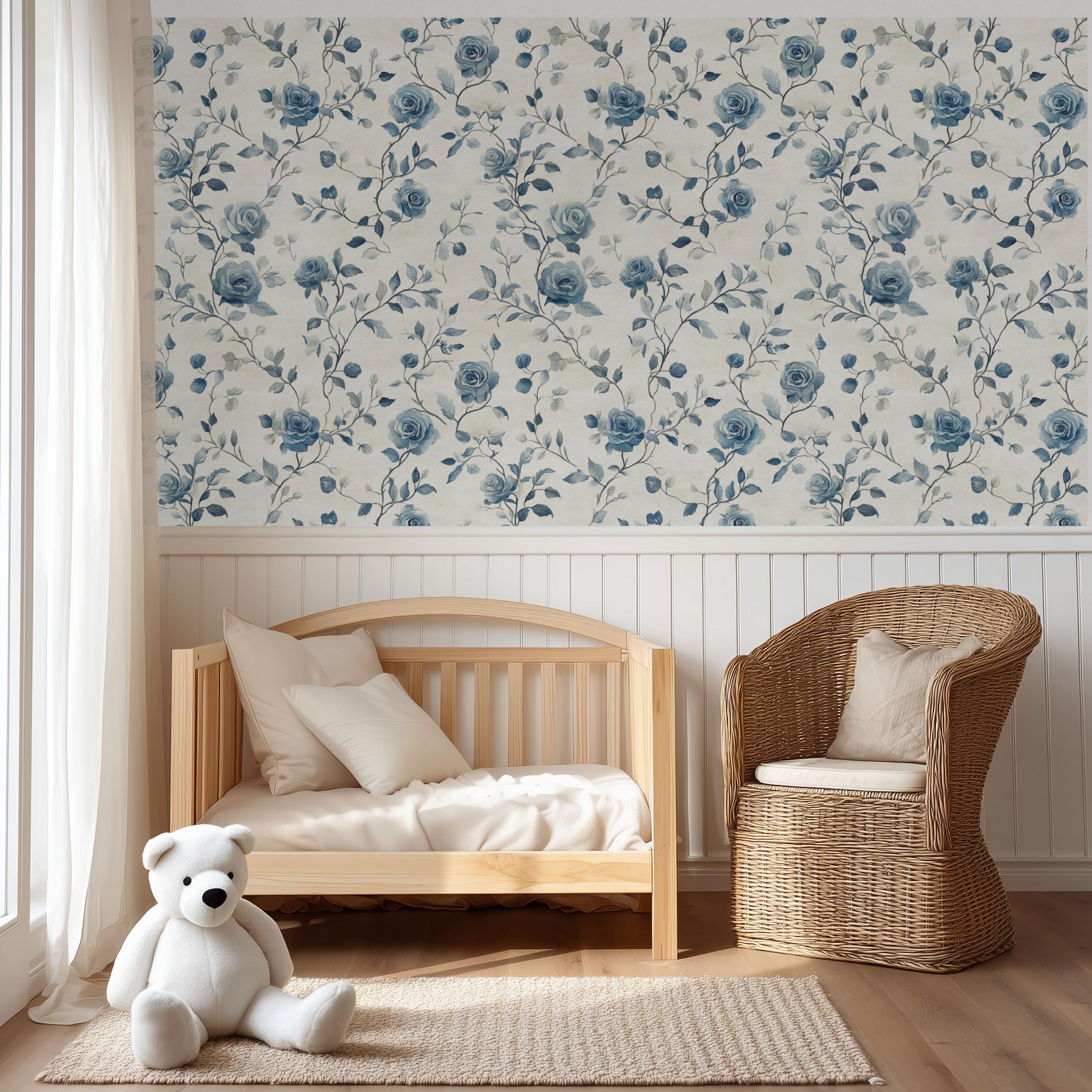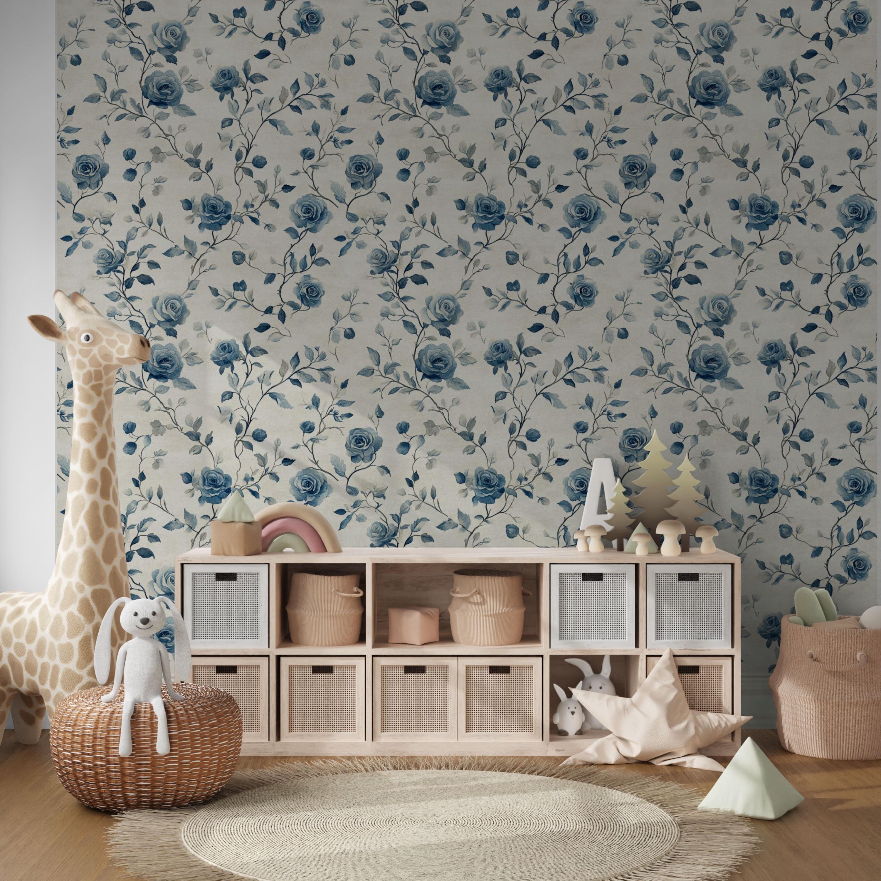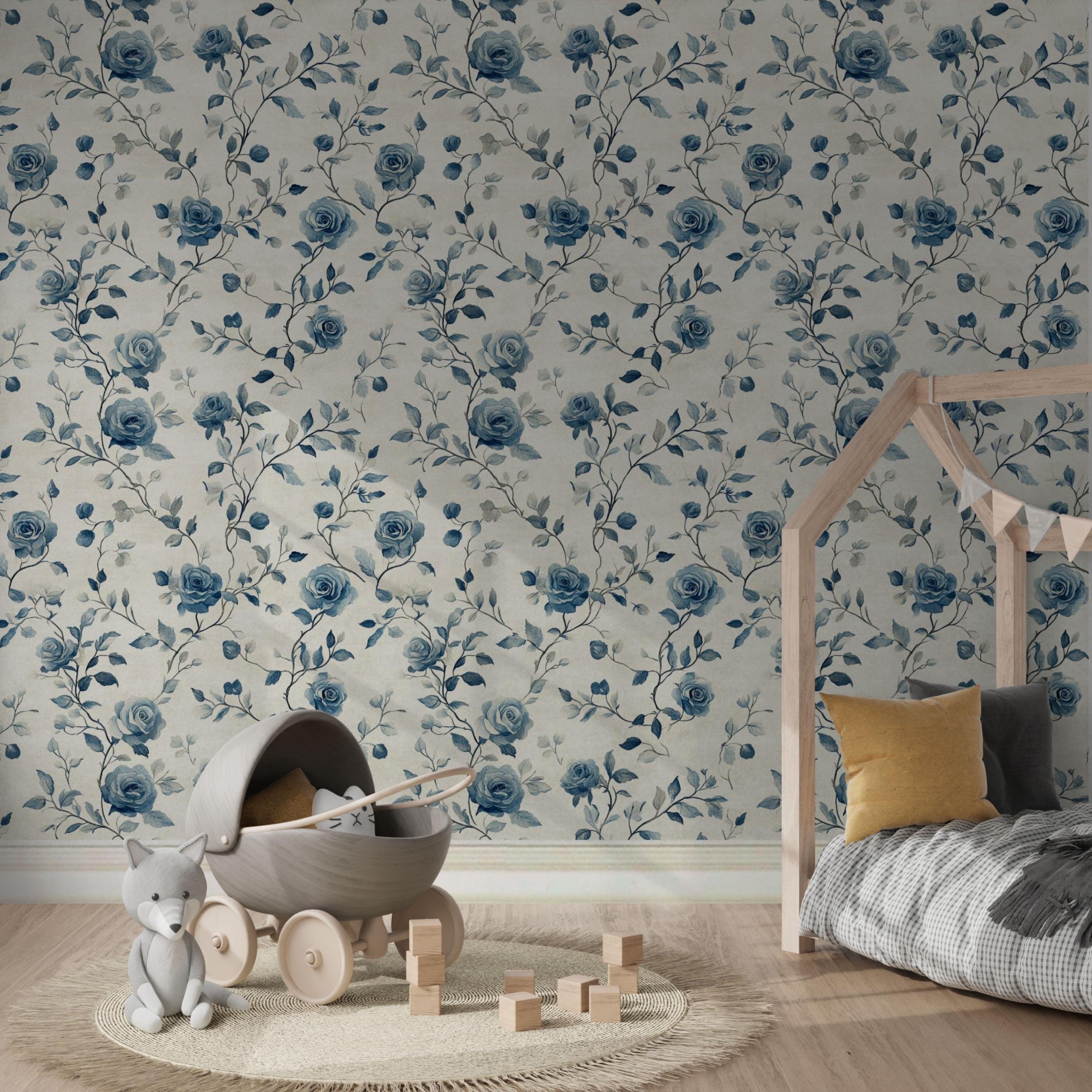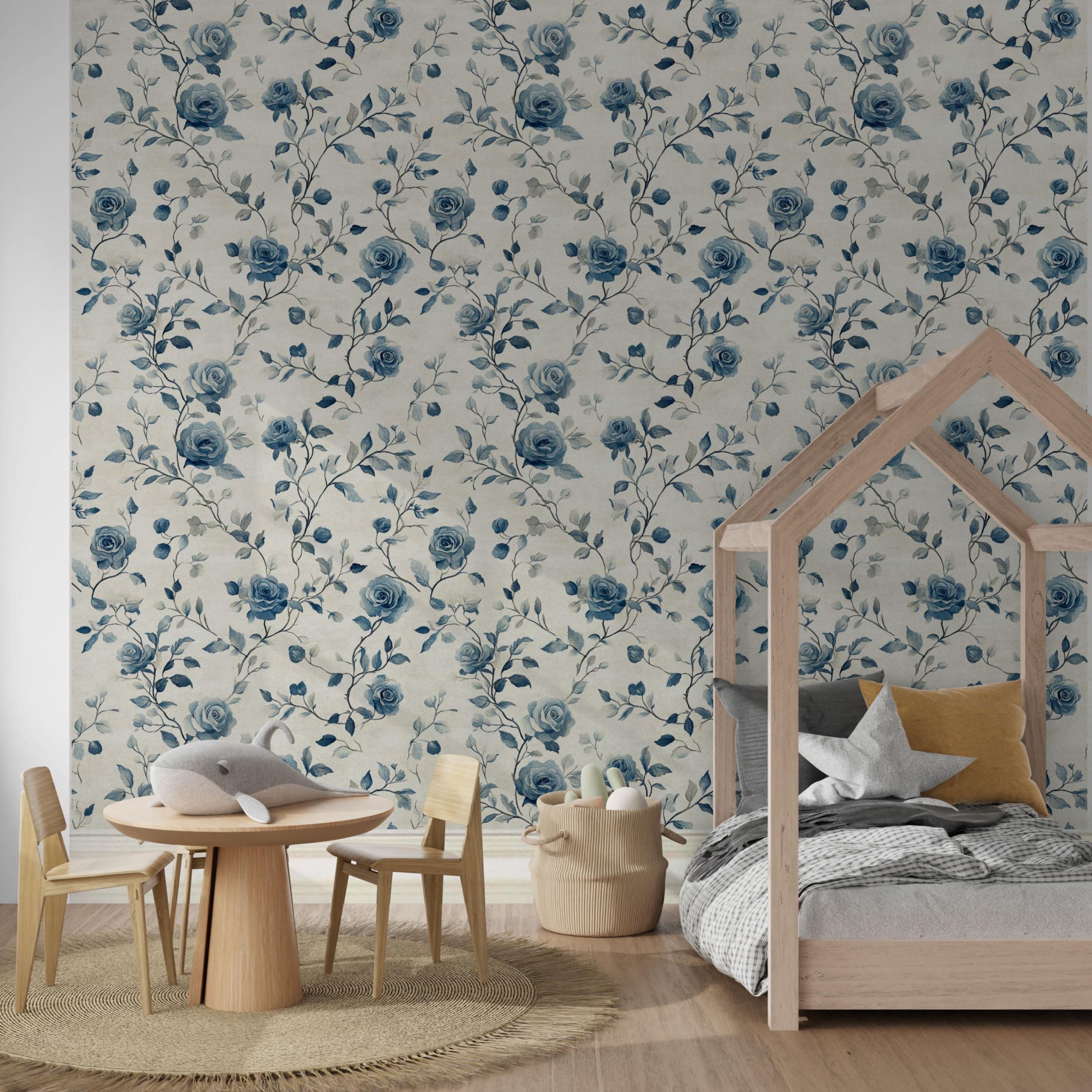 Soft blue roses bloom across a gently weathered backdrop, creating a look that’s timeless, elegant, and soothing. The vintage-inspired design adds warmth and calm to nurseries, kids’ rooms, or family spaces — a refined floral that feels collected, comforting, and beautifully lived-in.