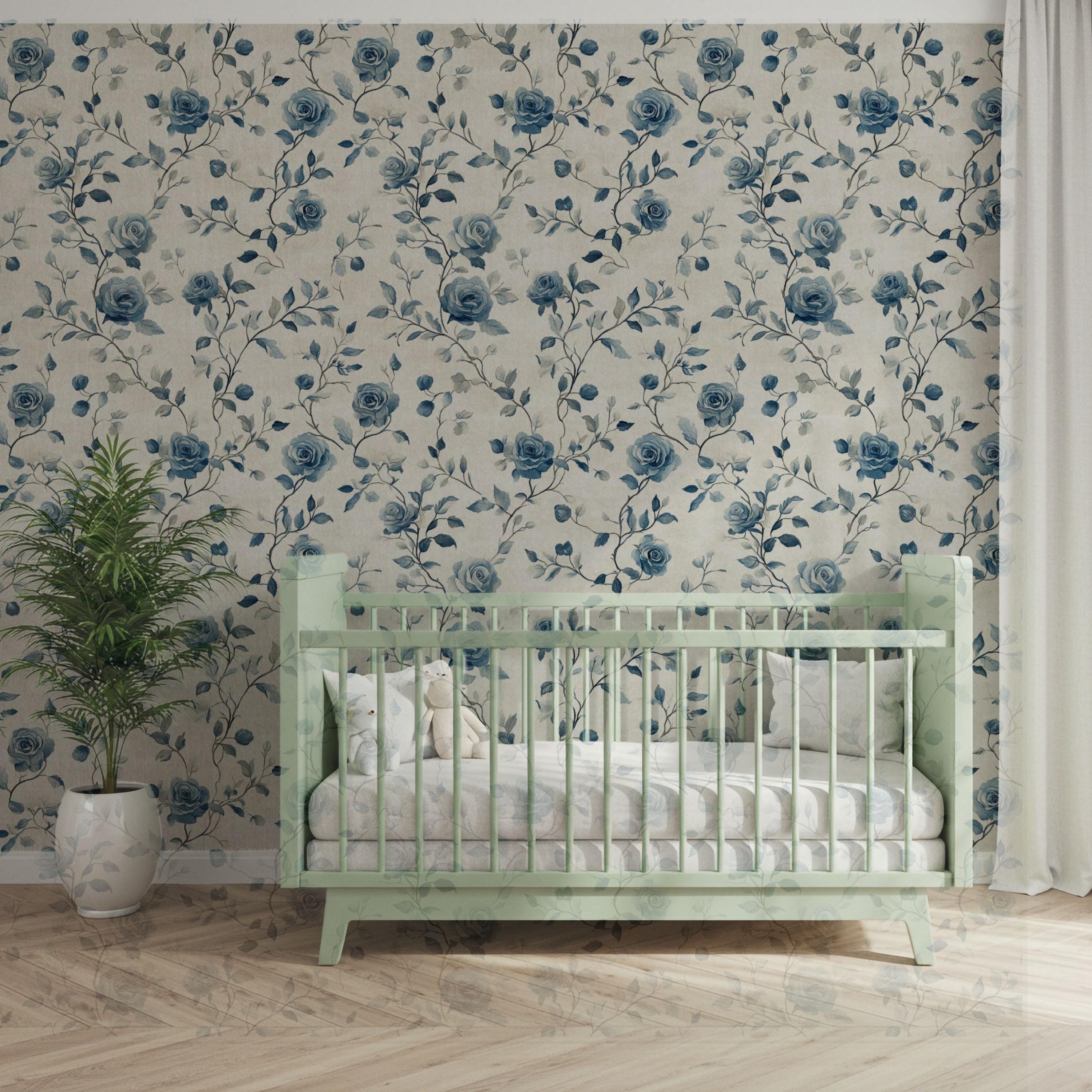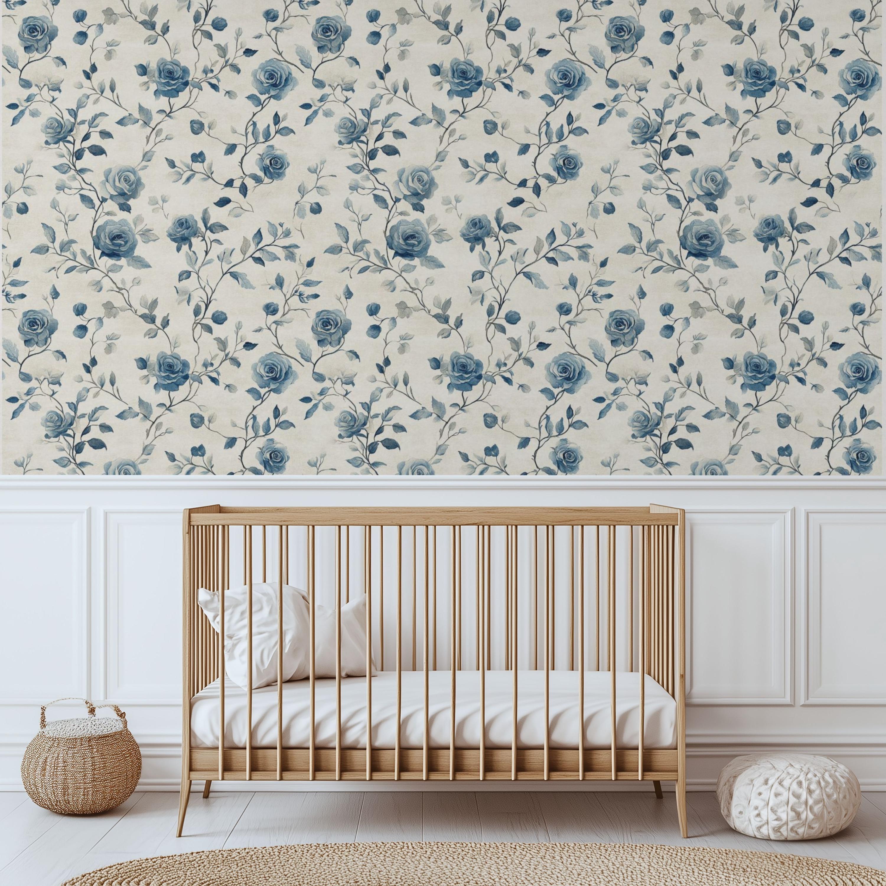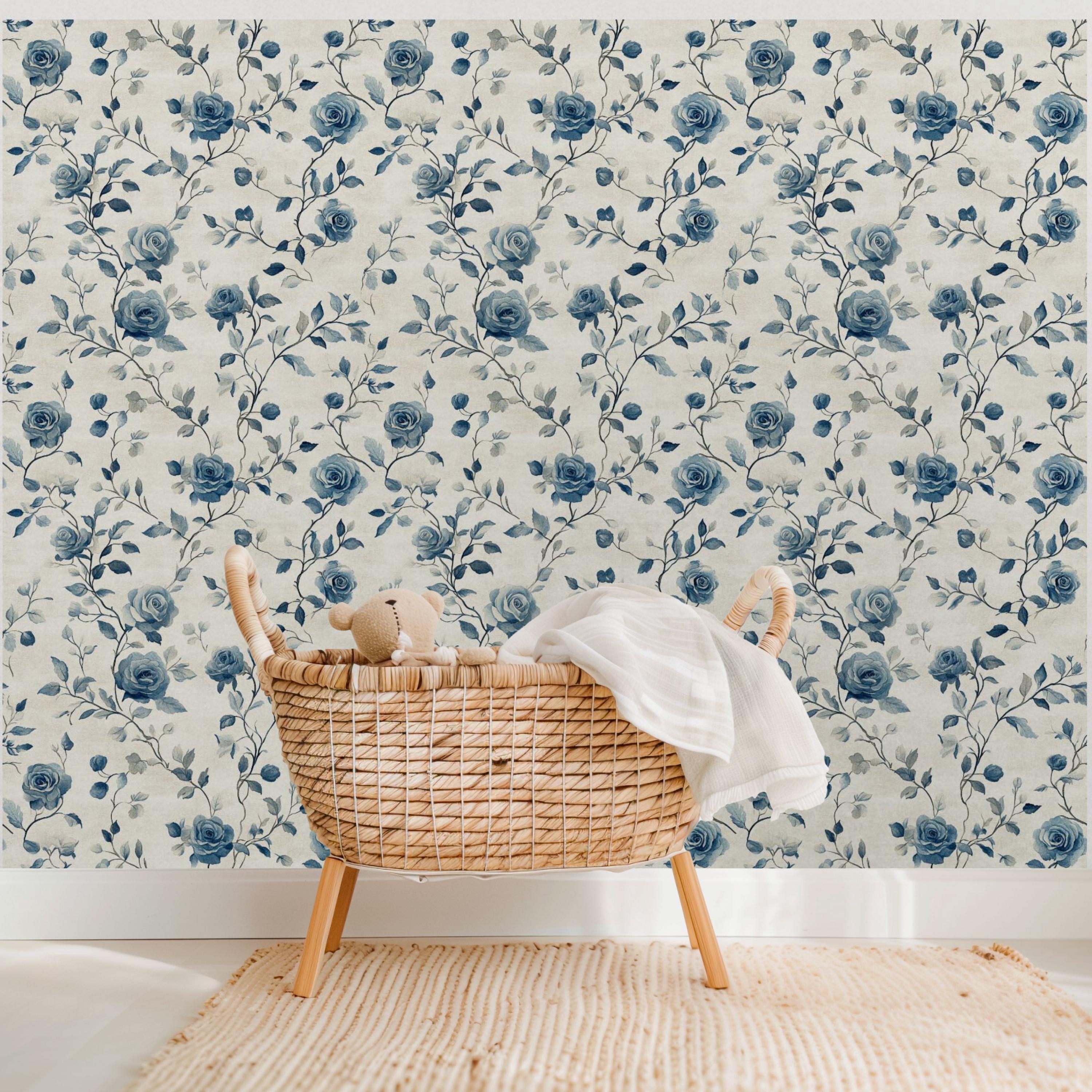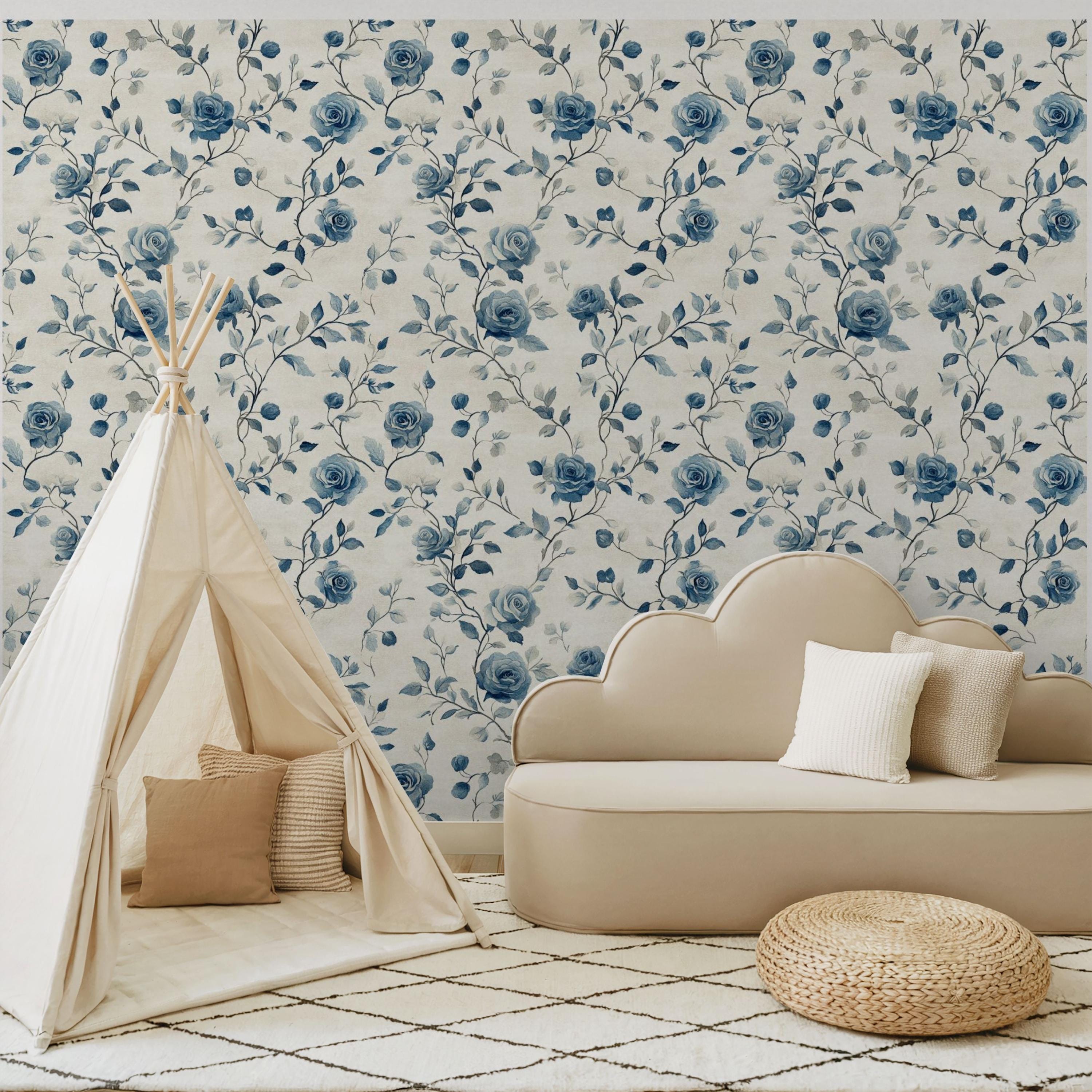 Soft blue roses bloom across a gently weathered backdrop, creating a look that’s timeless, elegant, and soothing. The vintage-inspired design adds warmth and calm to nurseries, kids’ rooms, or family spaces — a refined floral that feels collected, comforting, and beautifully lived-in.