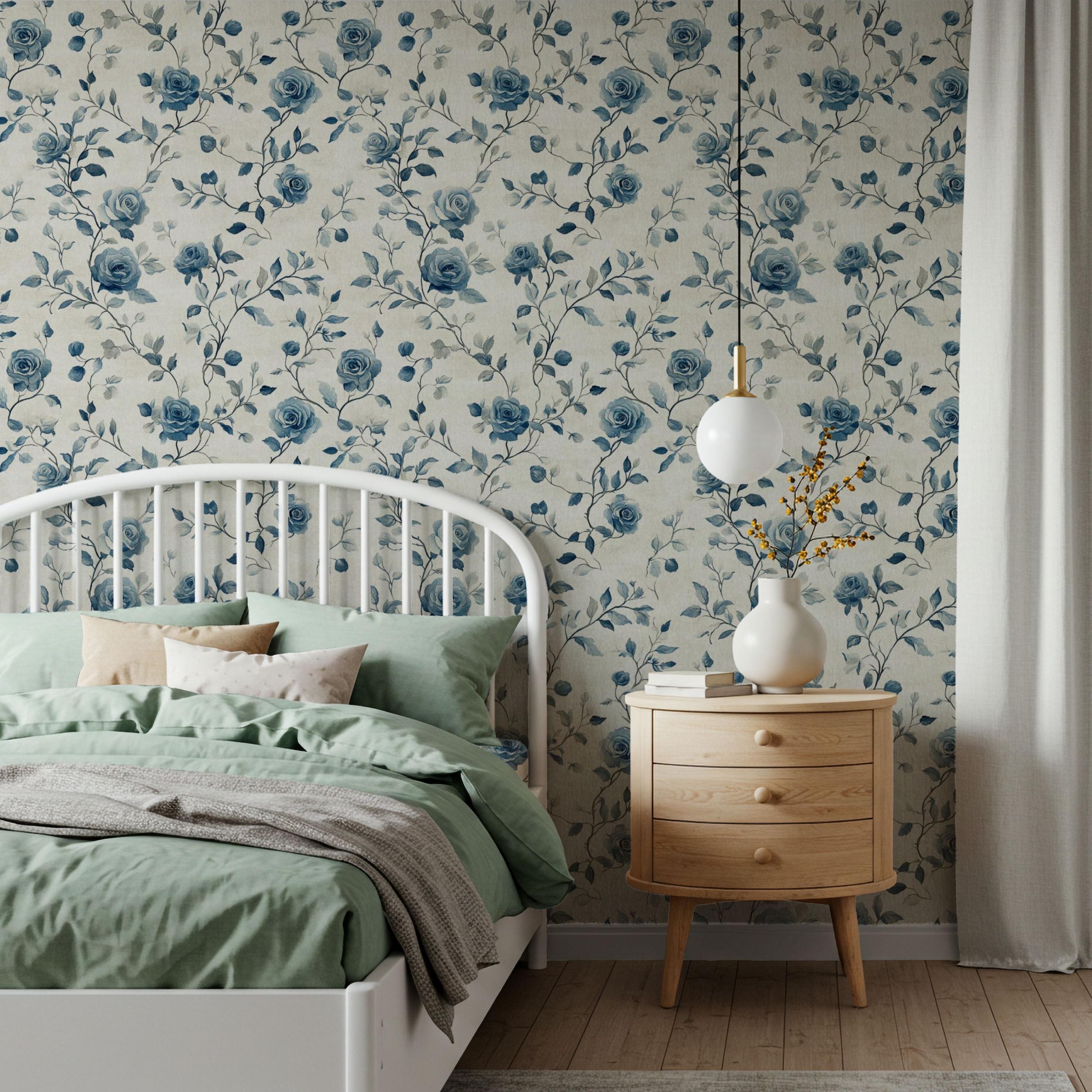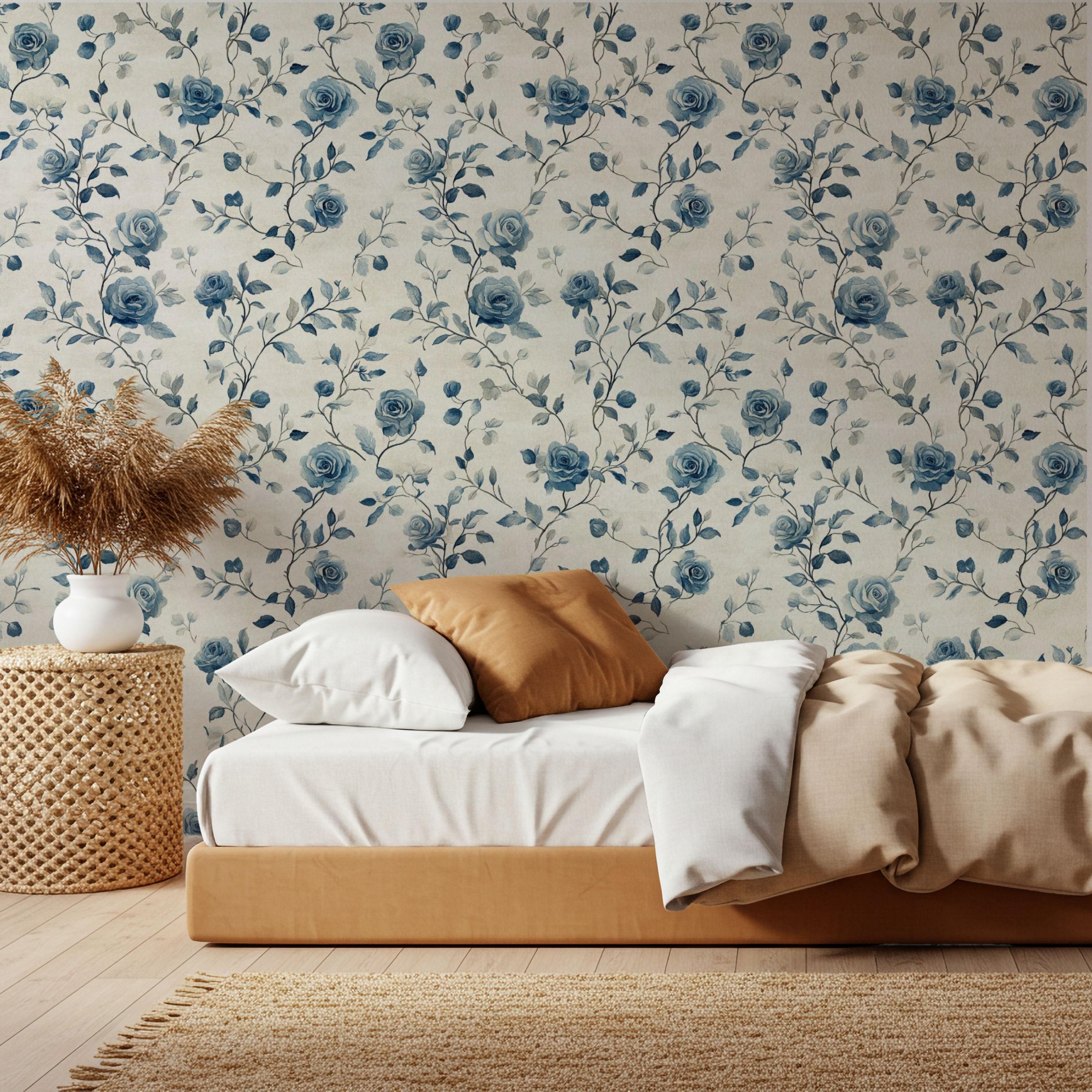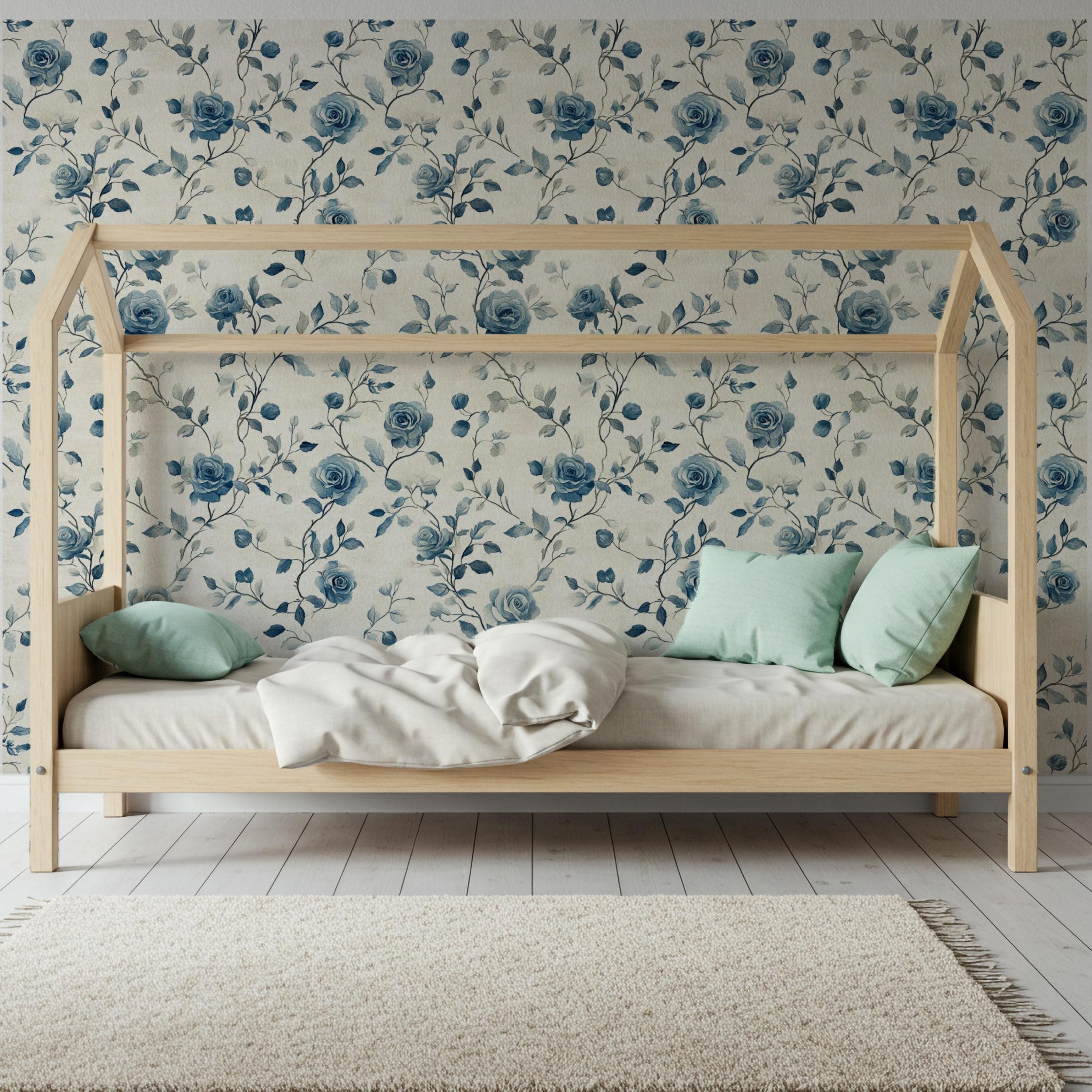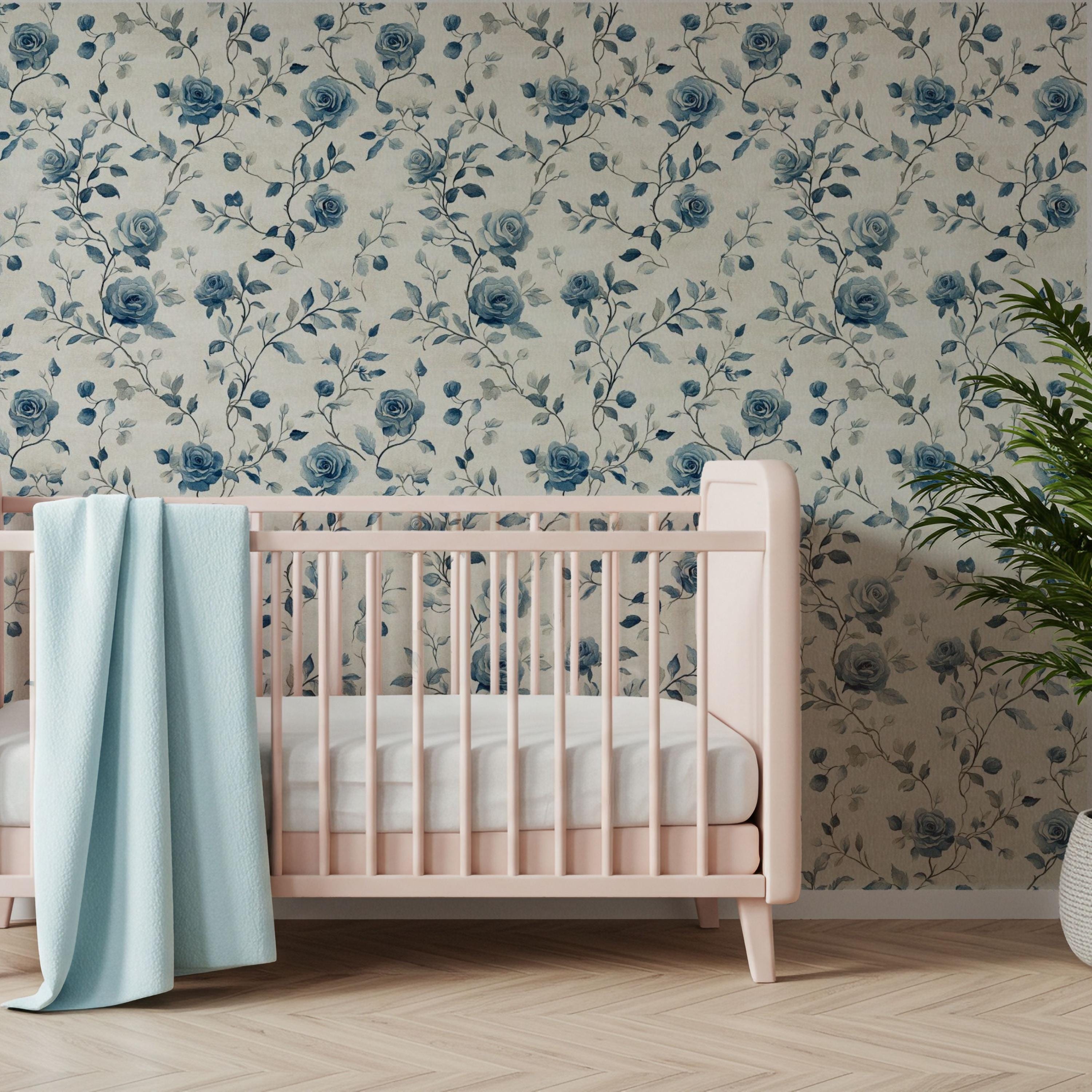 Soft blue roses bloom across a gently weathered backdrop, creating a look that’s timeless, elegant, and soothing. The vintage-inspired design adds warmth and calm to nurseries, kids’ rooms, or family spaces — a refined floral that feels collected, comforting, and beautifully lived-in.