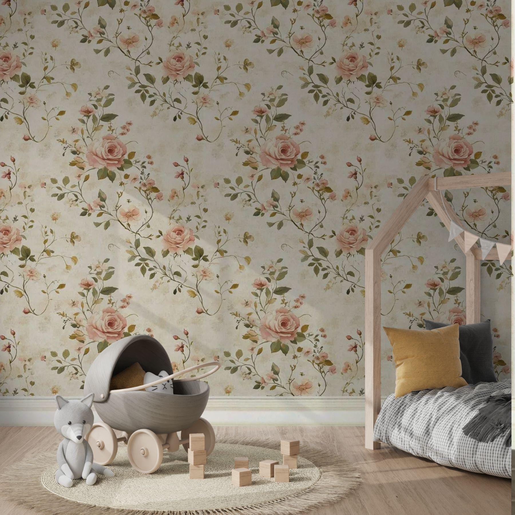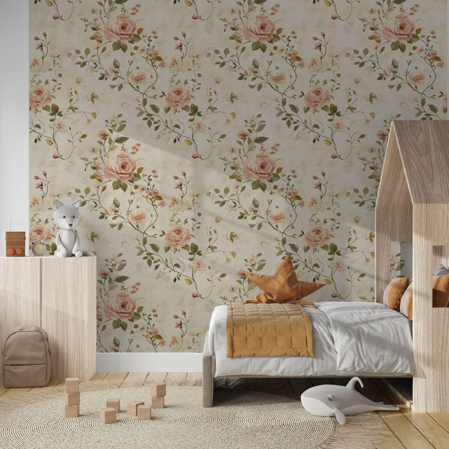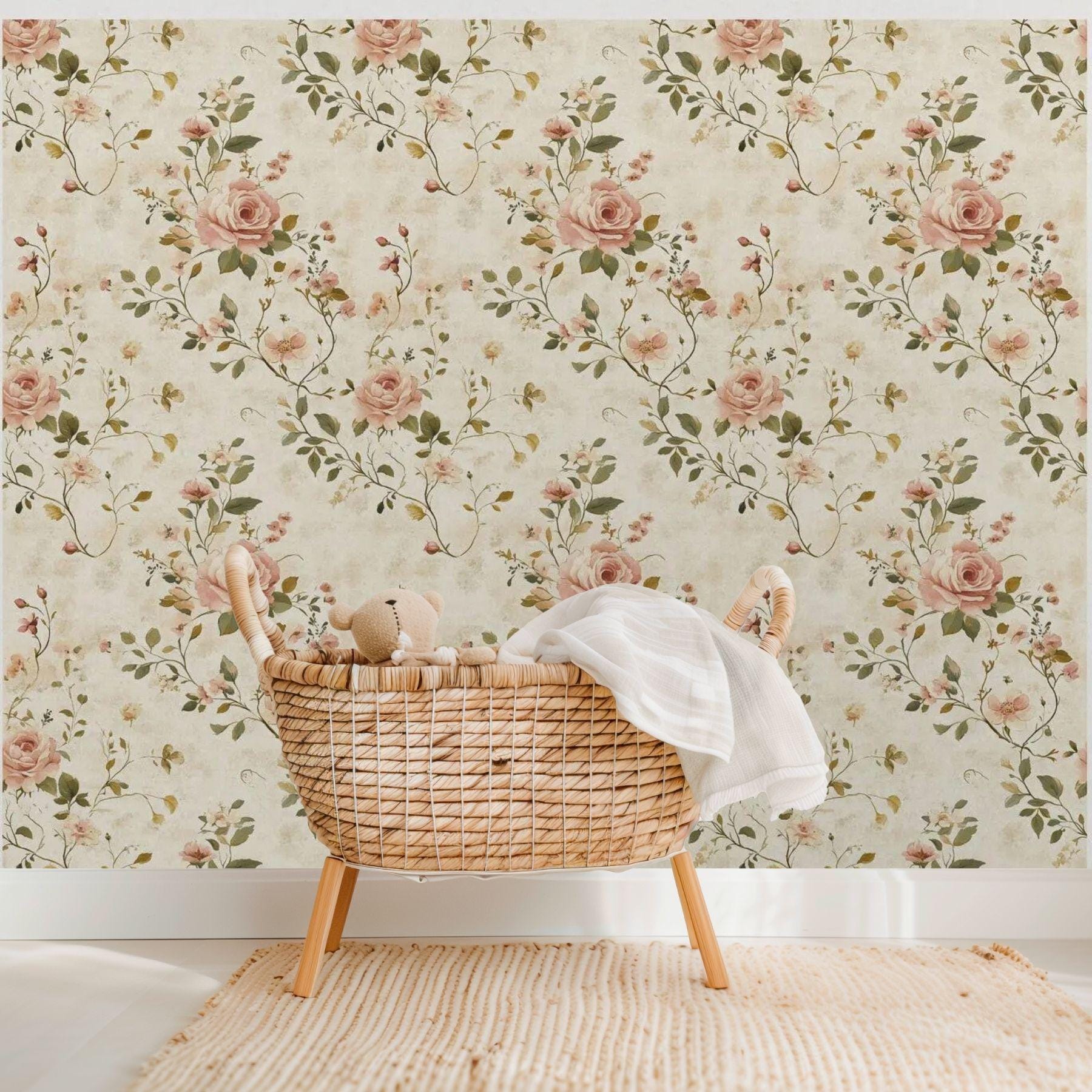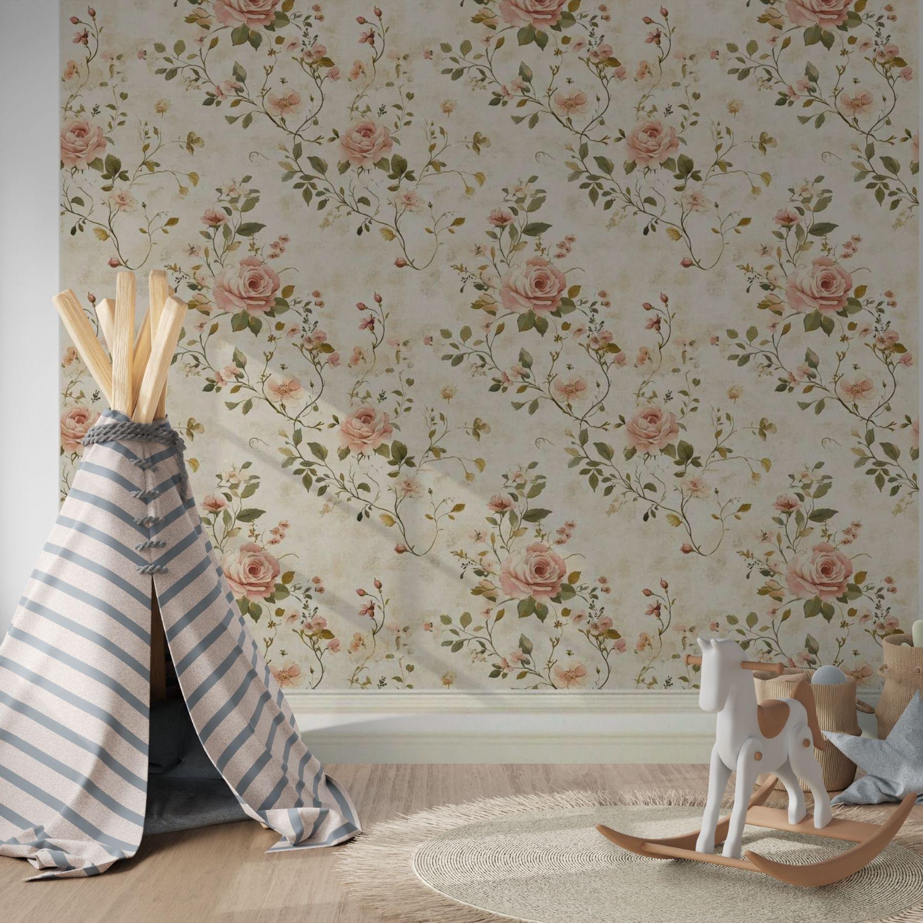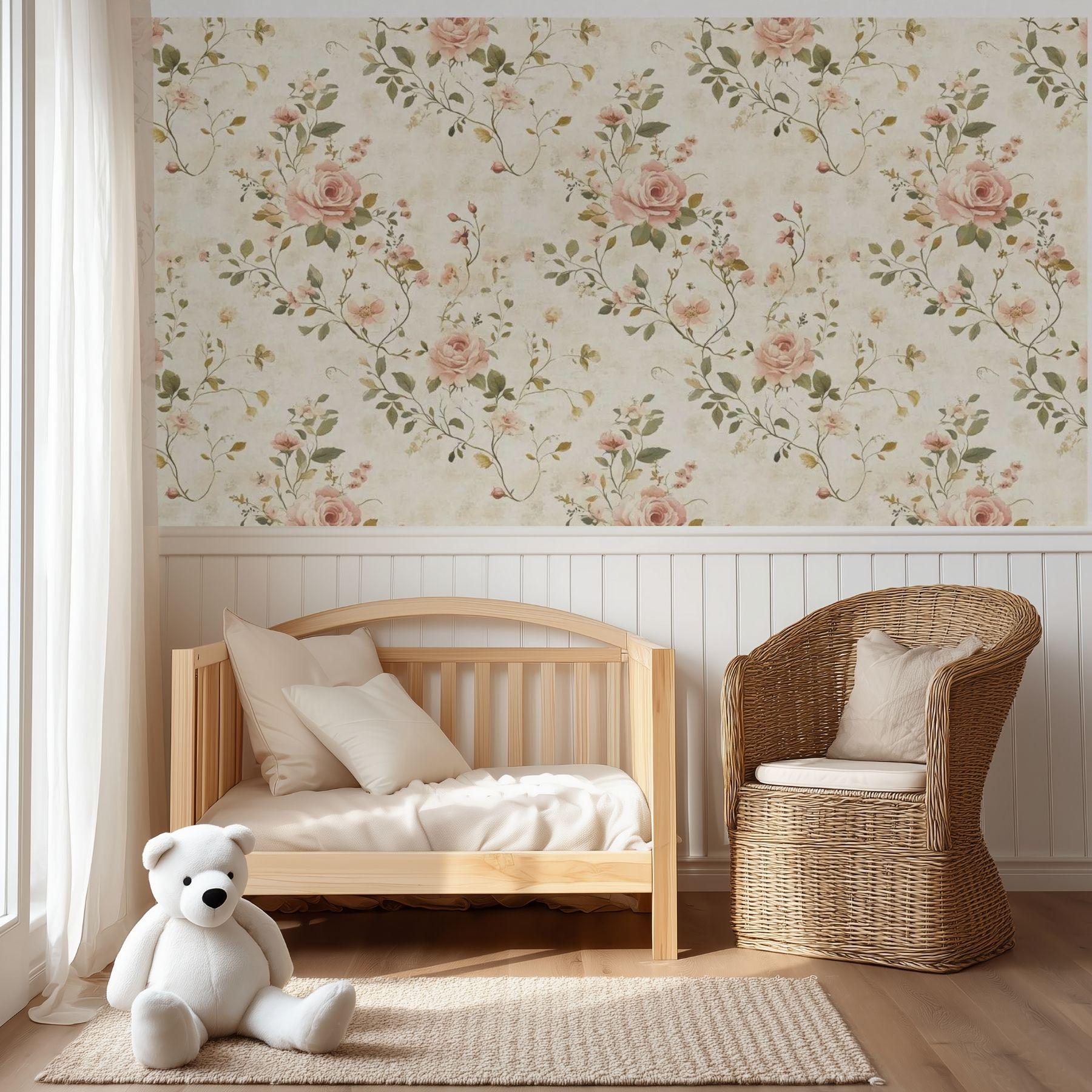 Soft blush roses bloom across a gentle linen backdrop, creating a look that feels timeless, tender, and full of quiet beauty. The painterly vines and faded patina bring a touch of vintage romance to nurseries, kids’ rooms, or any space meant to feel warm and welcoming.