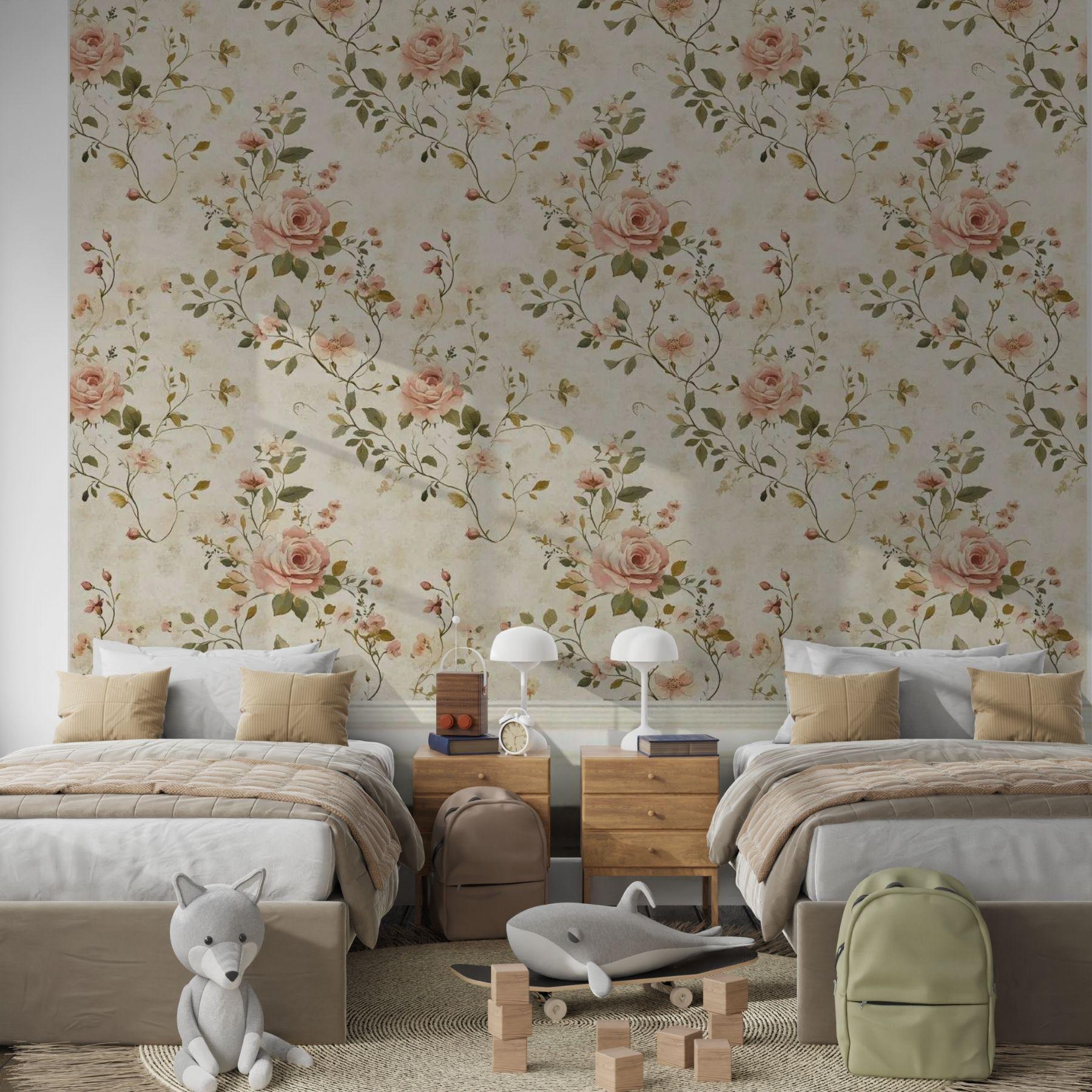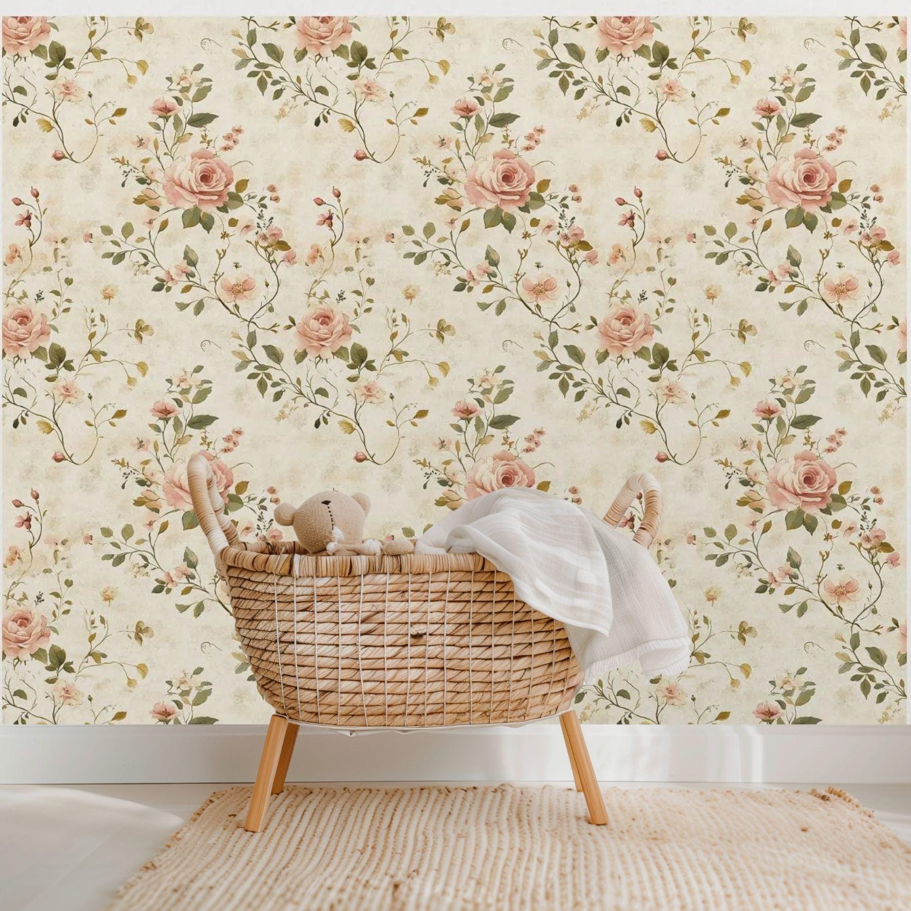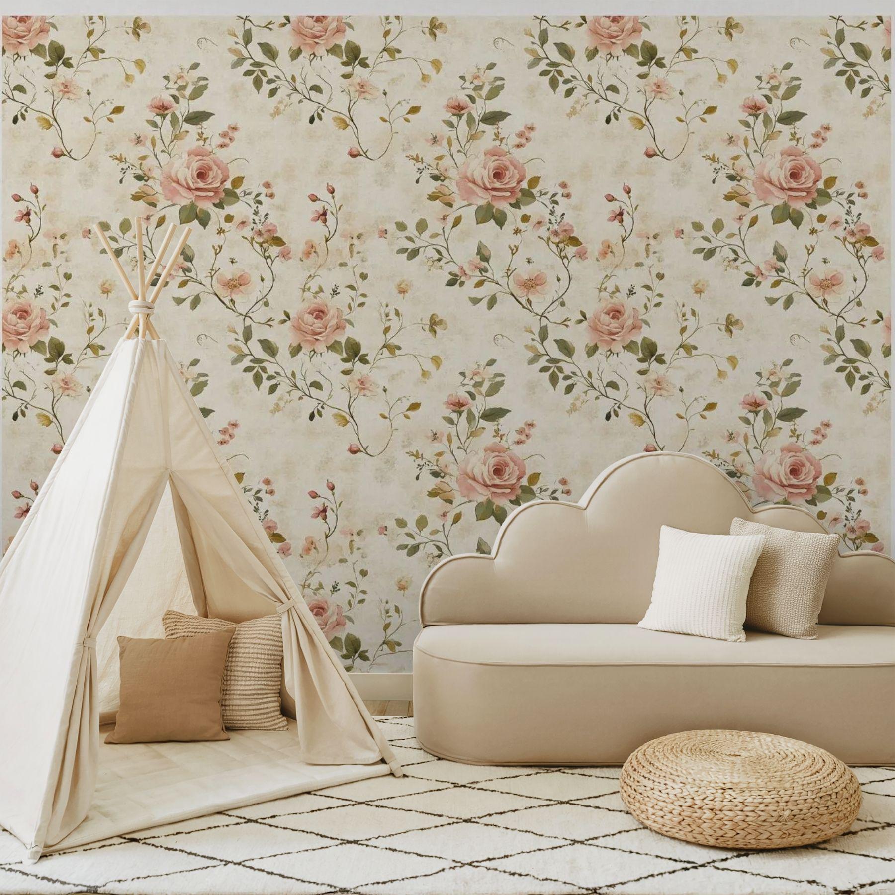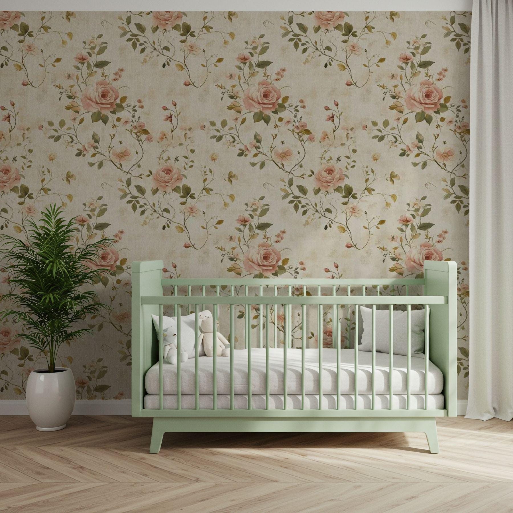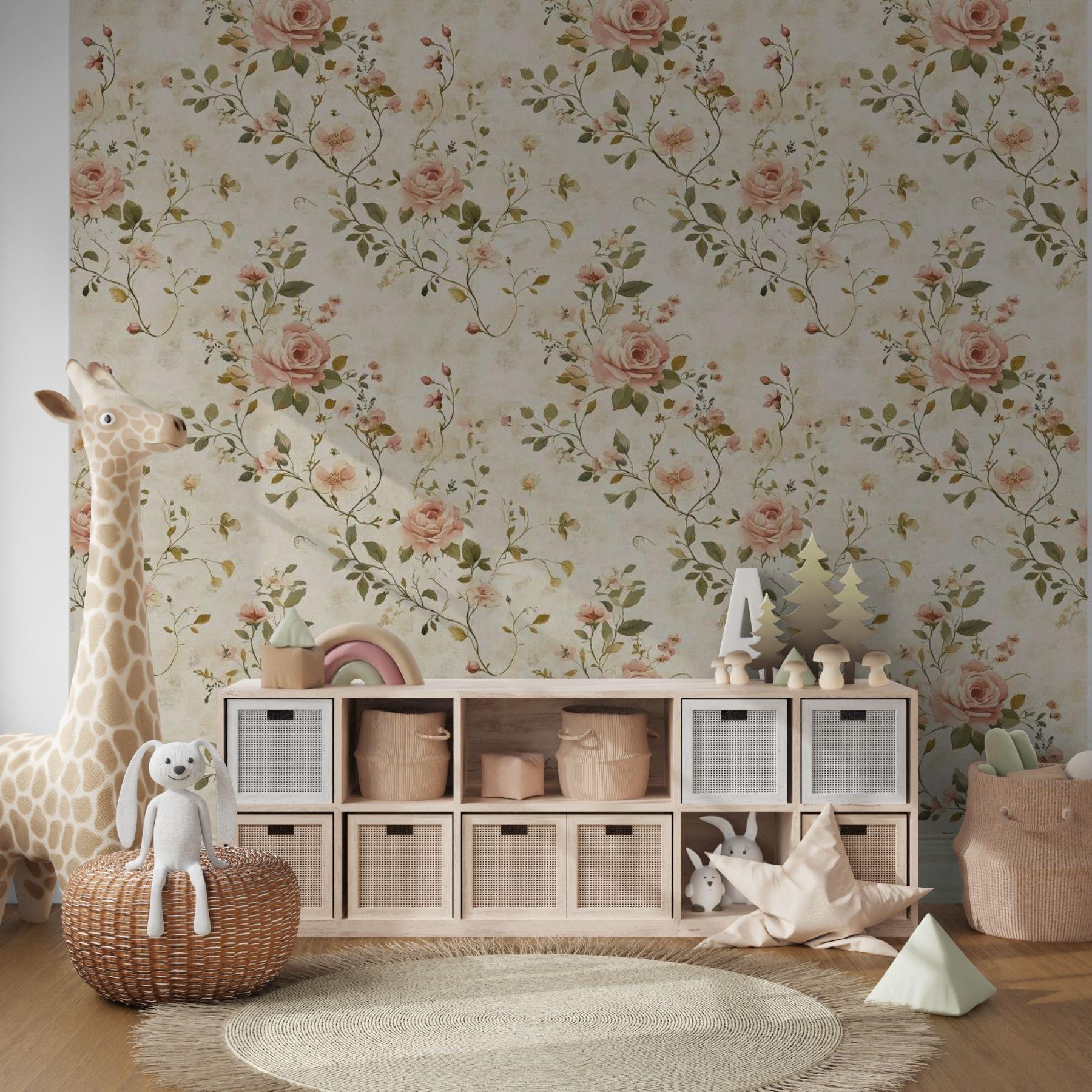 Soft blush roses bloom across a gentle linen backdrop, creating a look that feels timeless, tender, and full of quiet beauty. The painterly vines and faded patina bring a touch of vintage romance to nurseries, kids’ rooms, or any space meant to feel warm and welcoming.