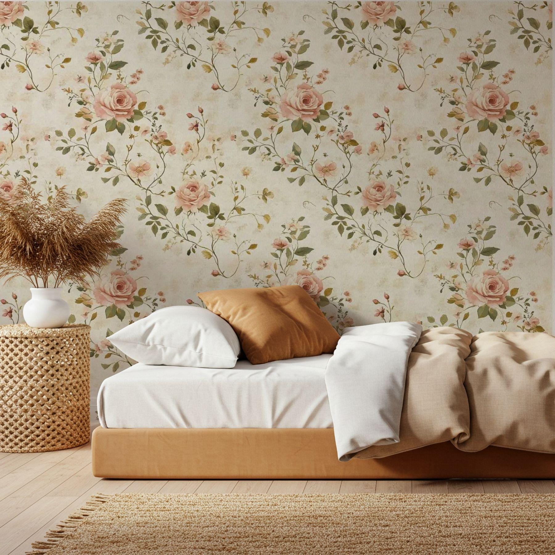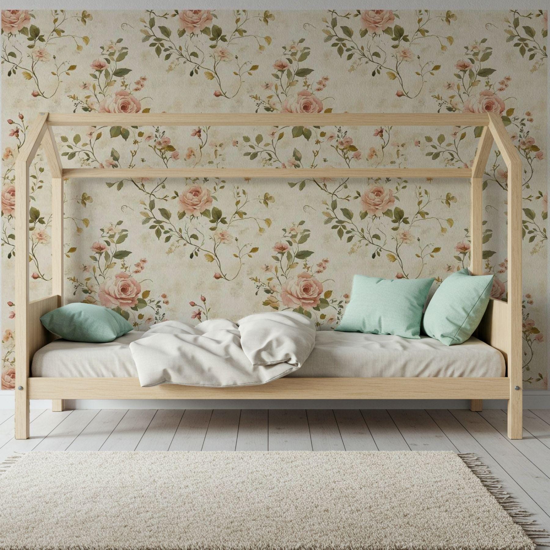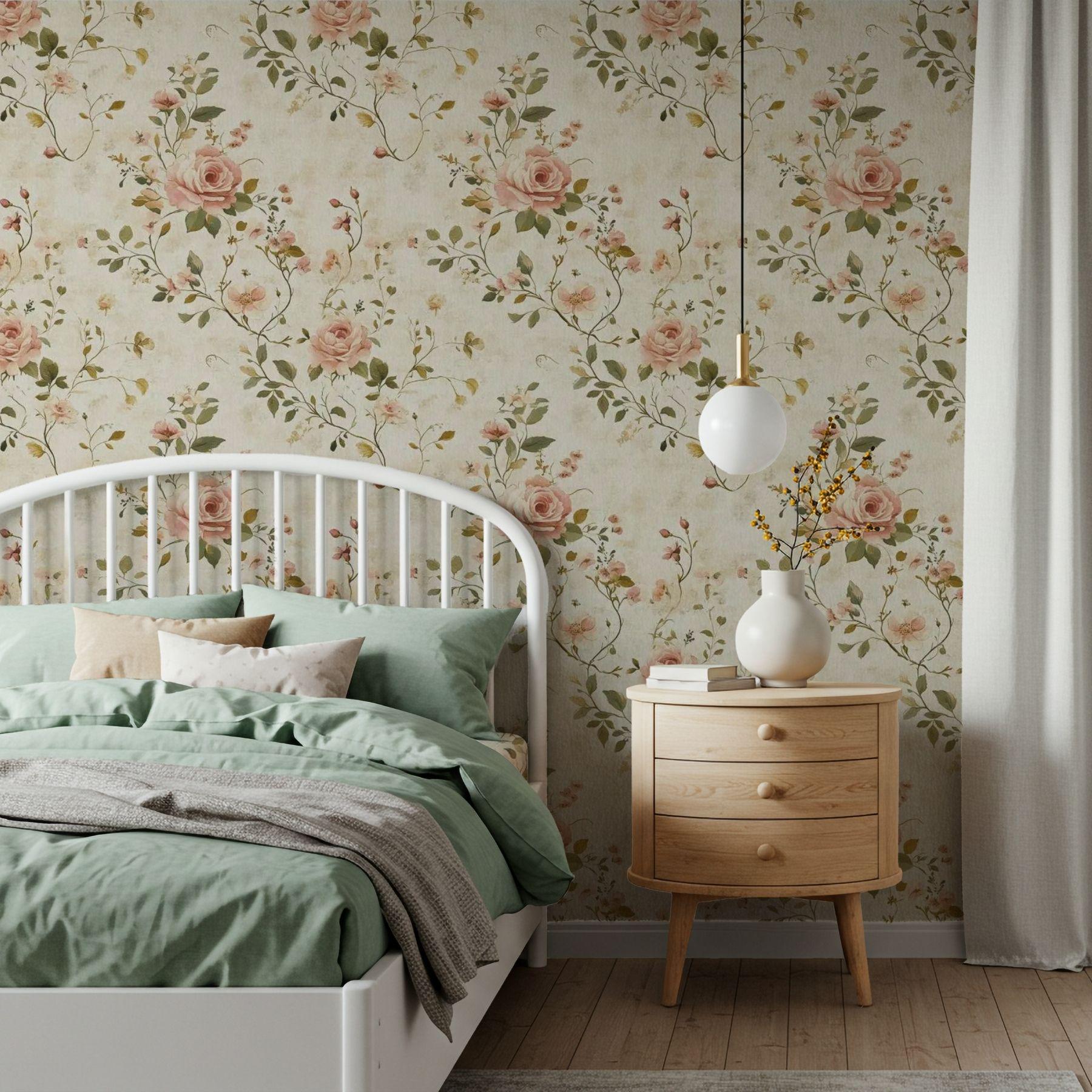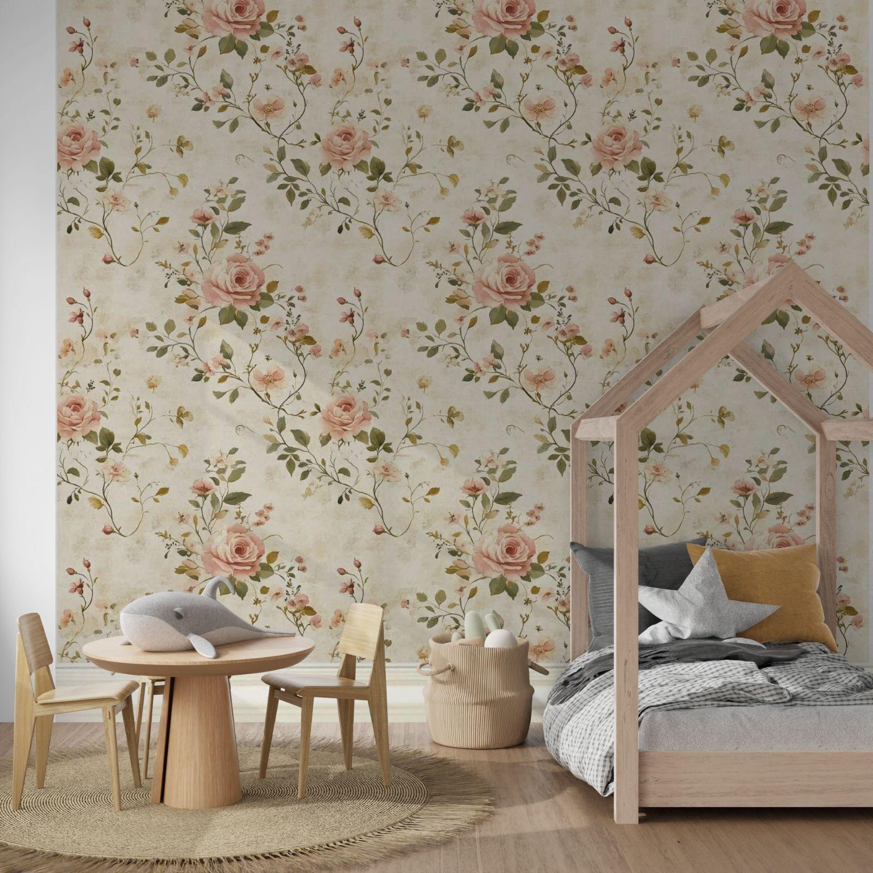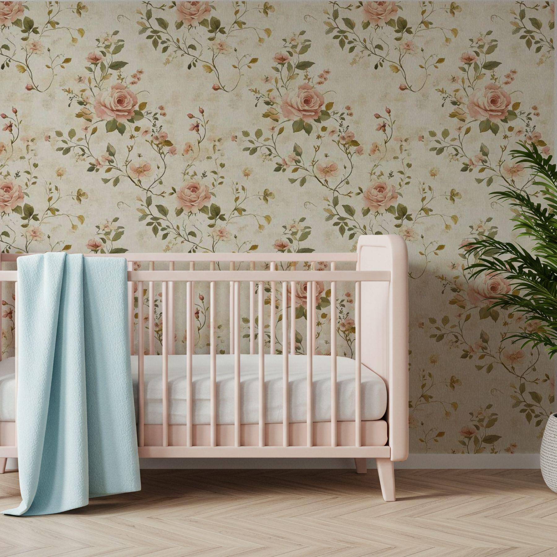 Soft blush roses bloom across a gentle linen backdrop, creating a look that feels timeless, tender, and full of quiet beauty. The painterly vines and faded patina bring a touch of vintage romance to nurseries, kids’ rooms, or any space meant to feel warm and welcoming.