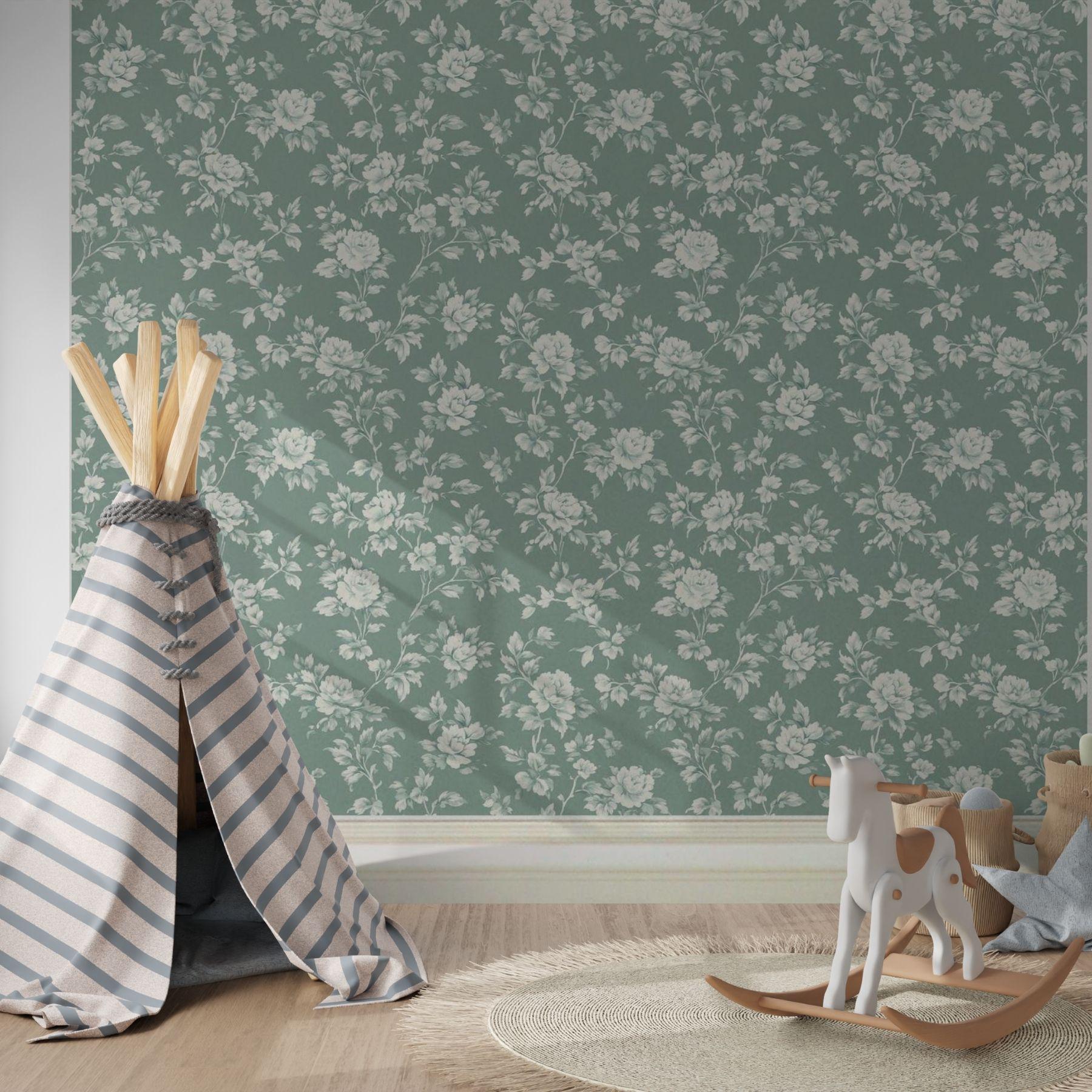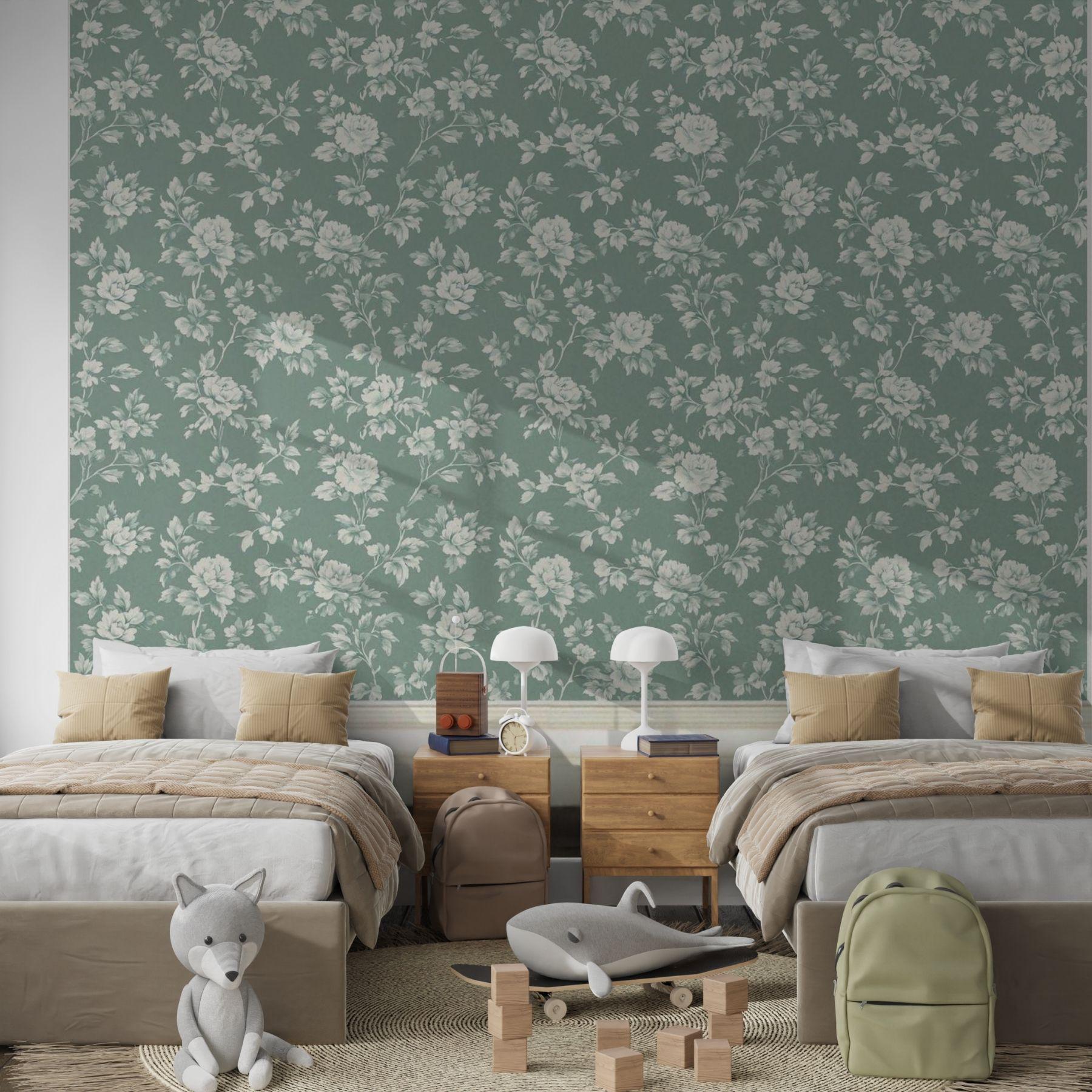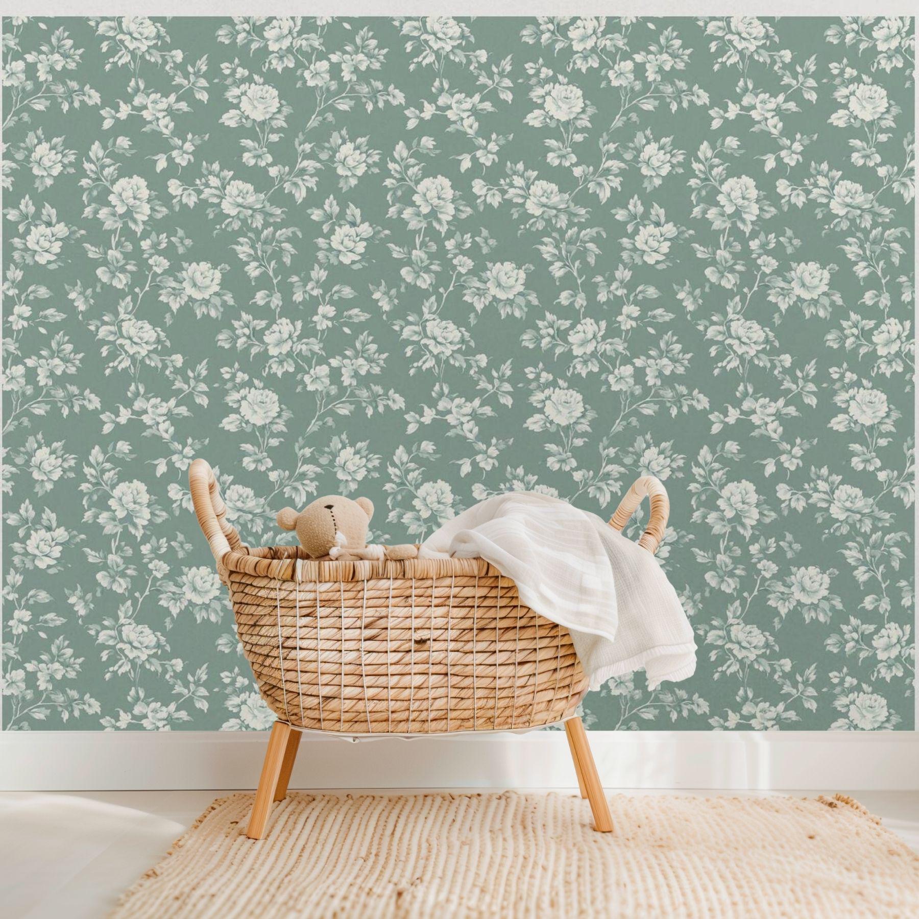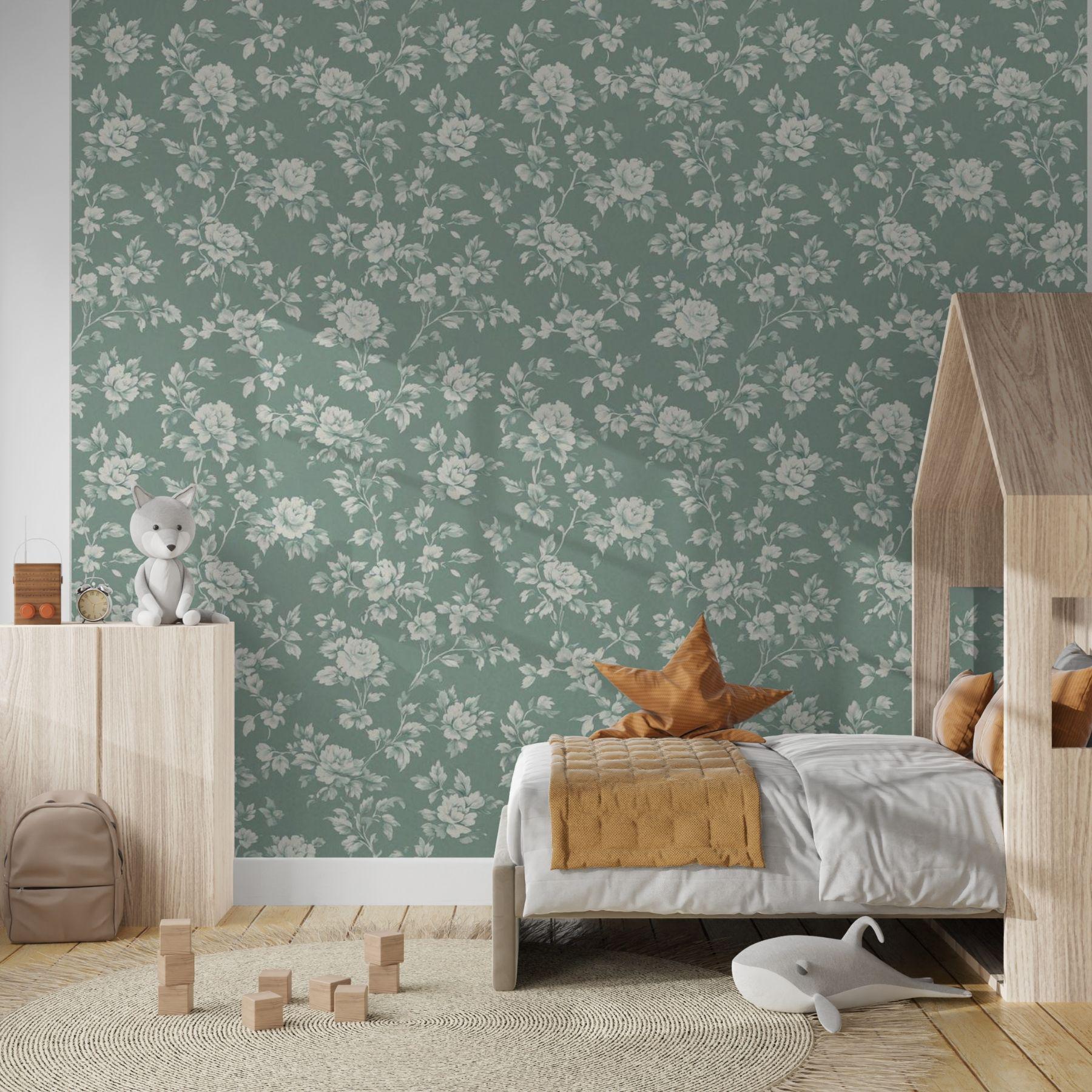 Delicate ivory blooms unfold across a deep vintage teal backdrop, creating a look that’s both classic and serene. This floral wallpaper brings an elevated charm to nurseries and play spaces — refined yet inviting, with a timeless beauty that grows right along with them.