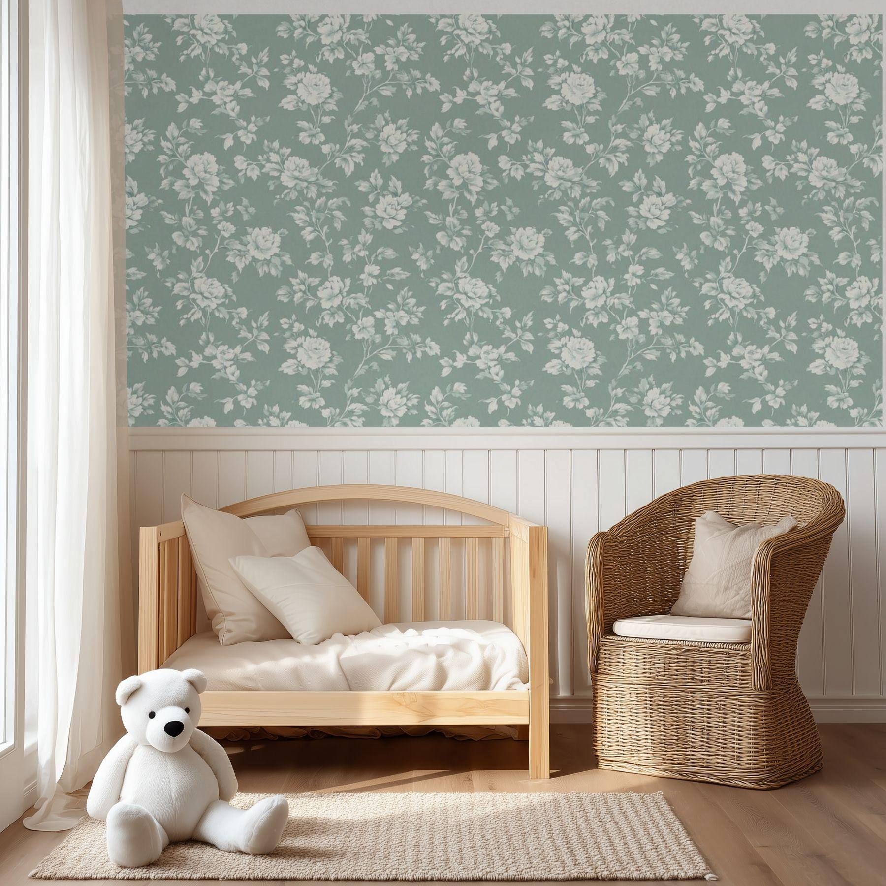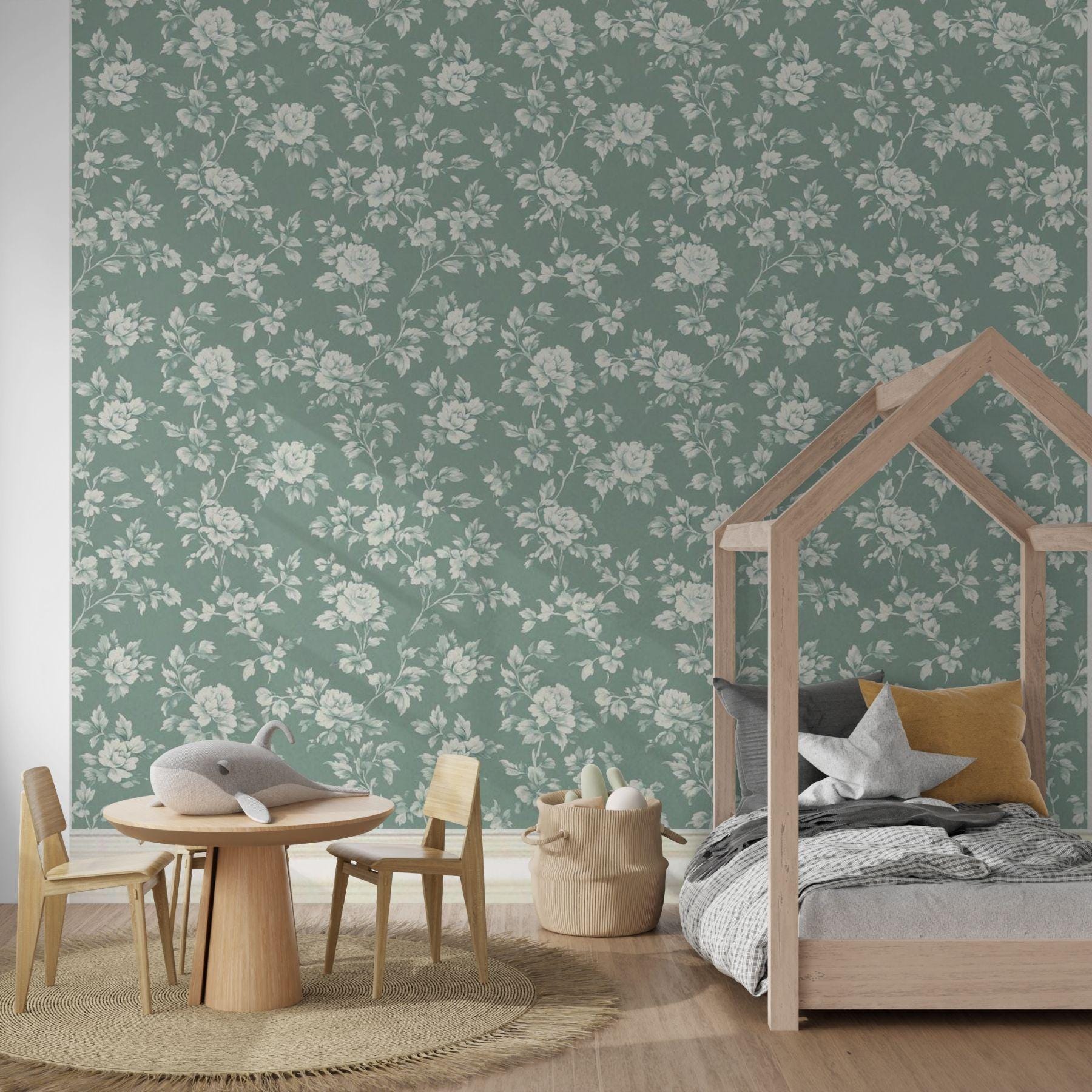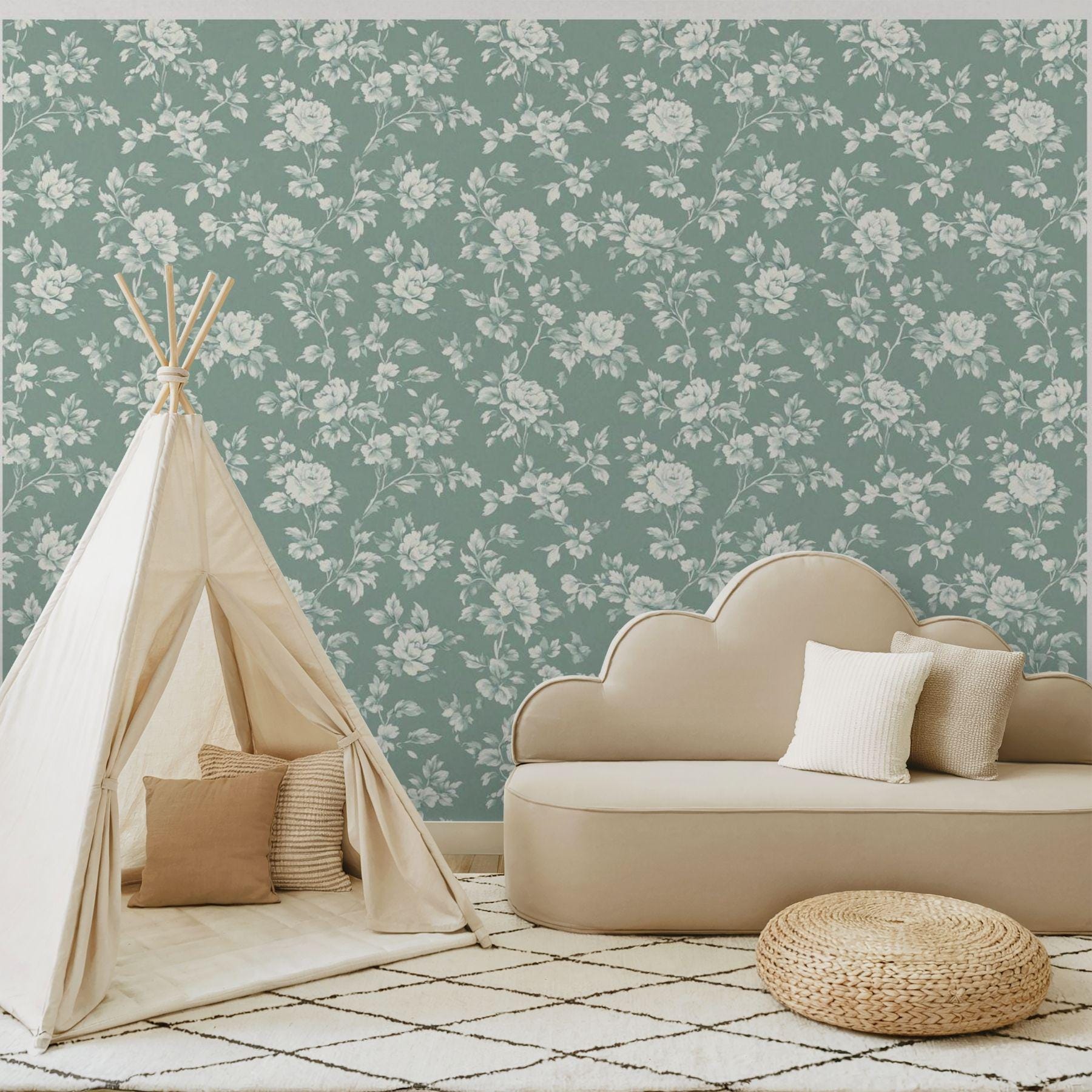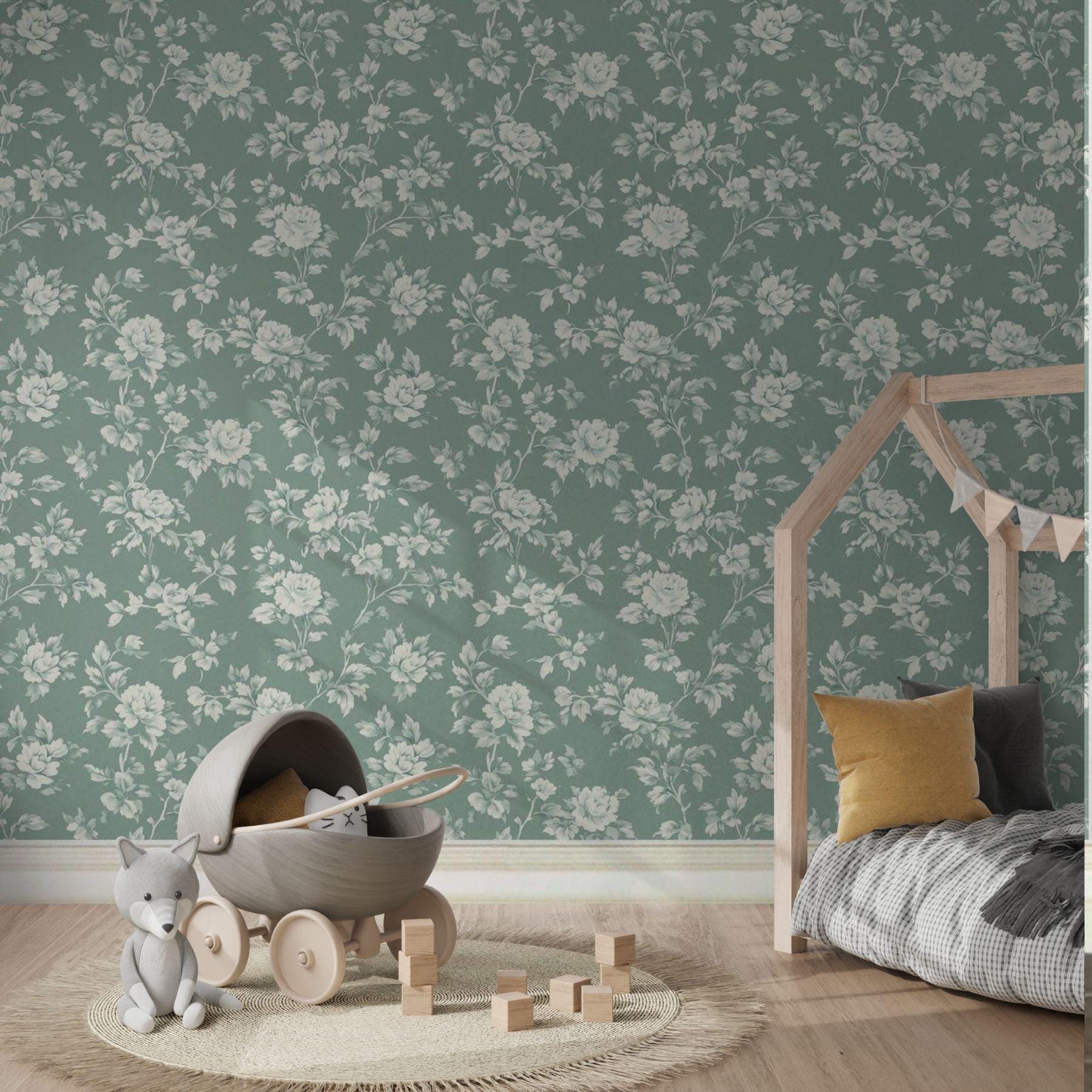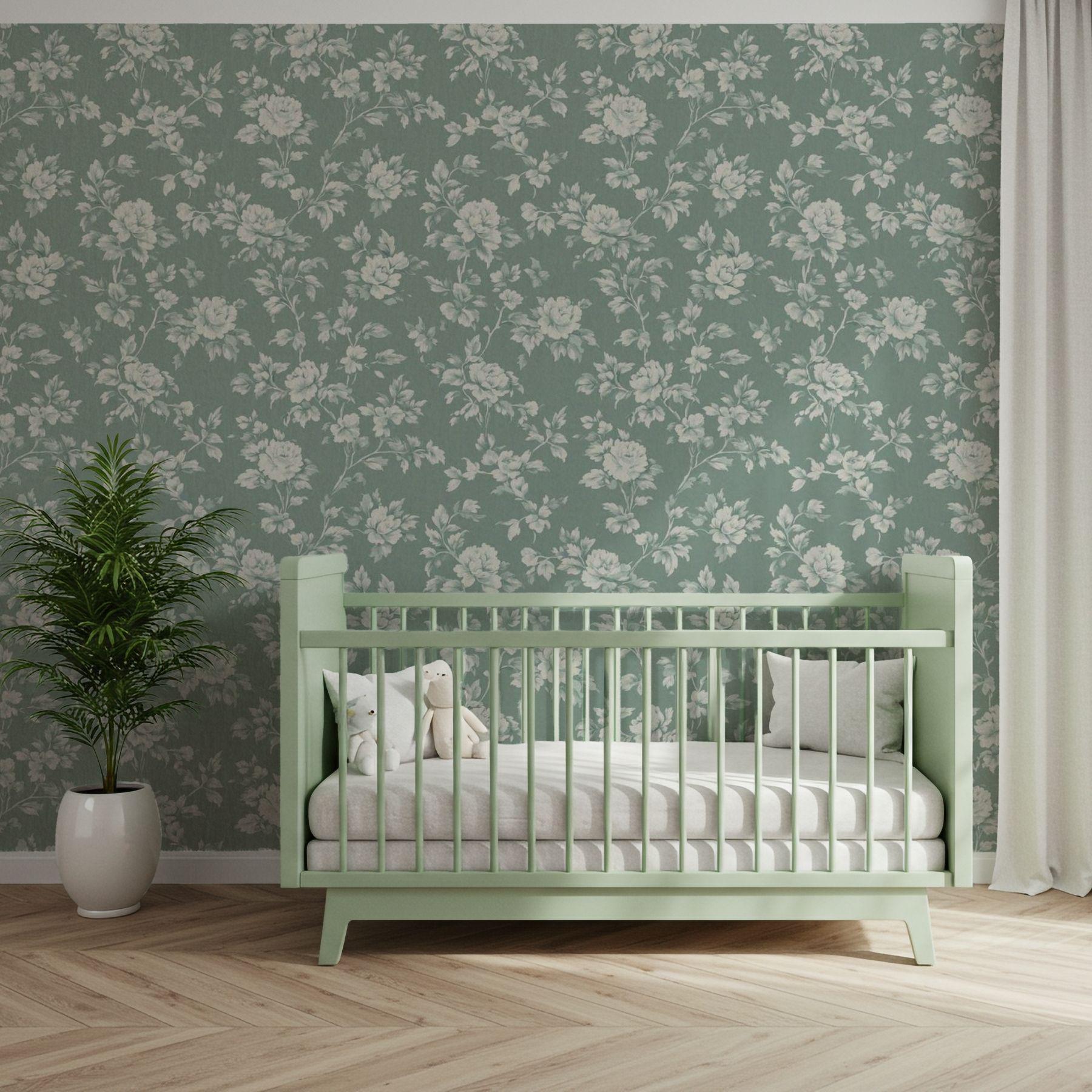 Delicate ivory blooms unfold across a deep vintage teal backdrop, creating a look that’s both classic and serene. This floral wallpaper brings an elevated charm to nurseries and play spaces — refined yet inviting, with a timeless beauty that grows right along with them.