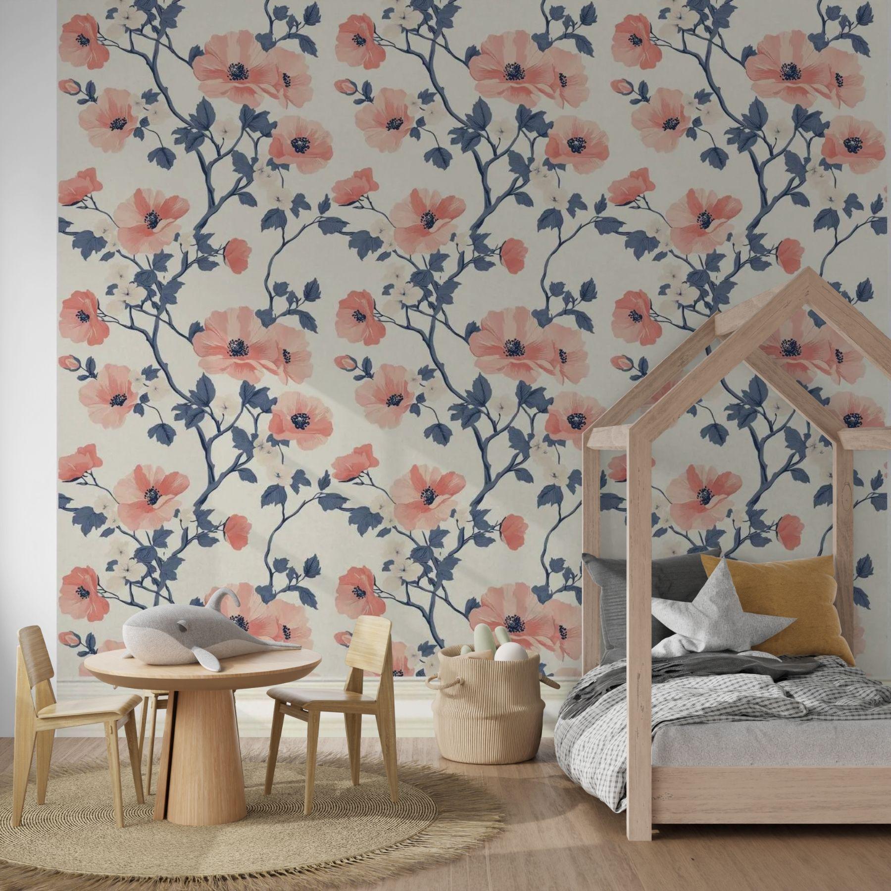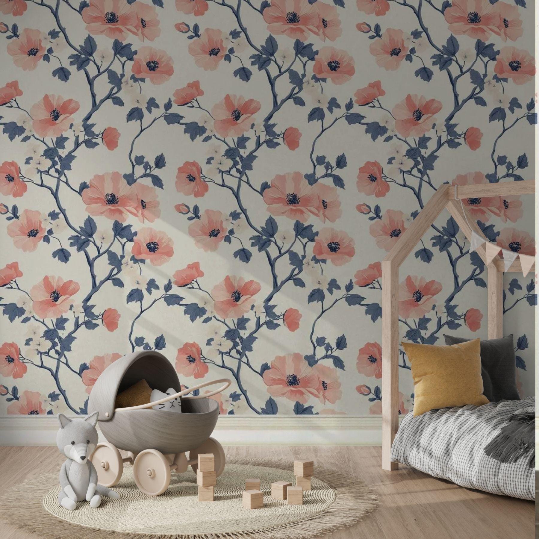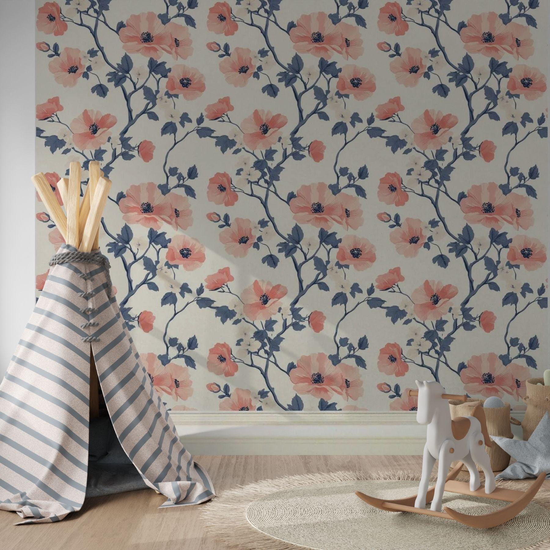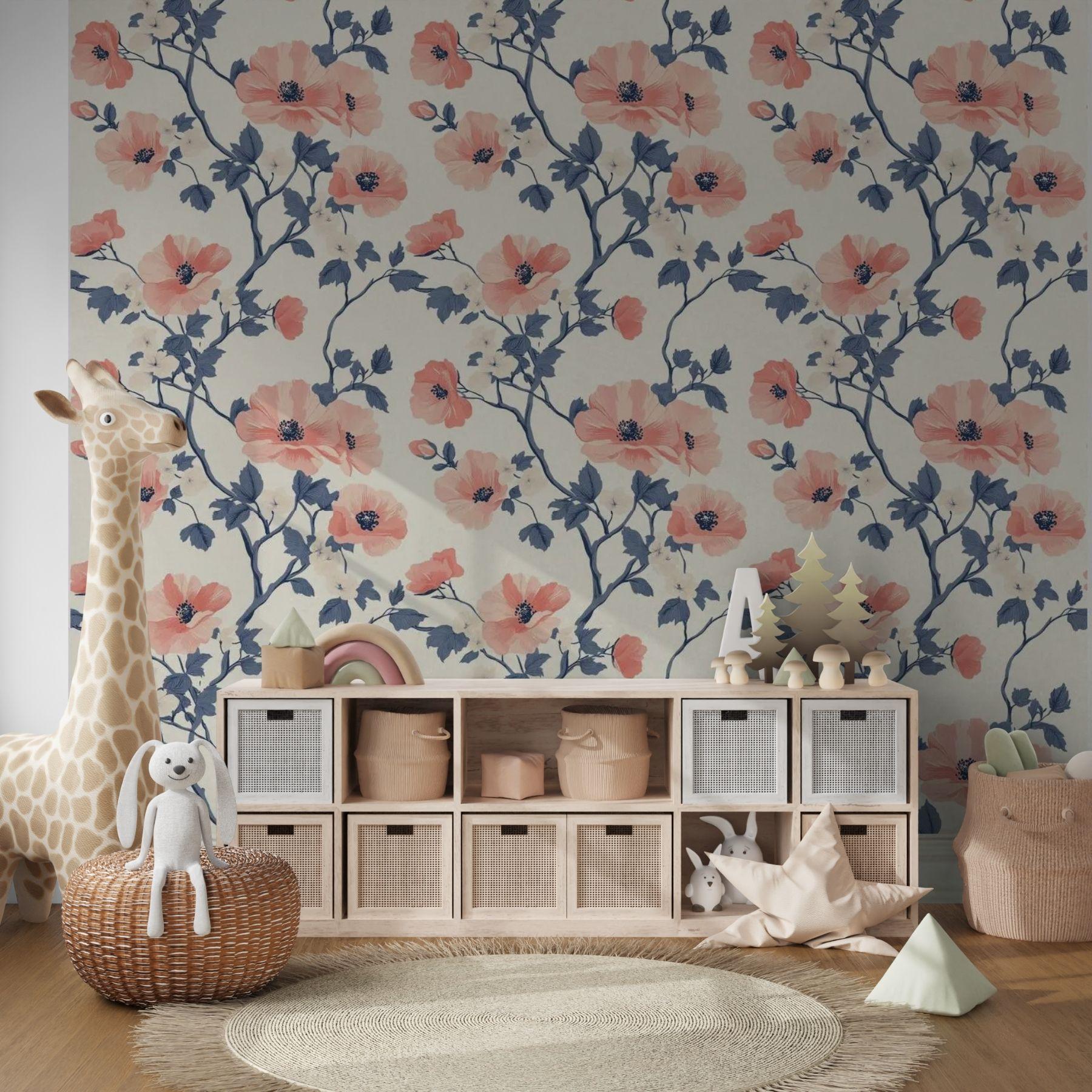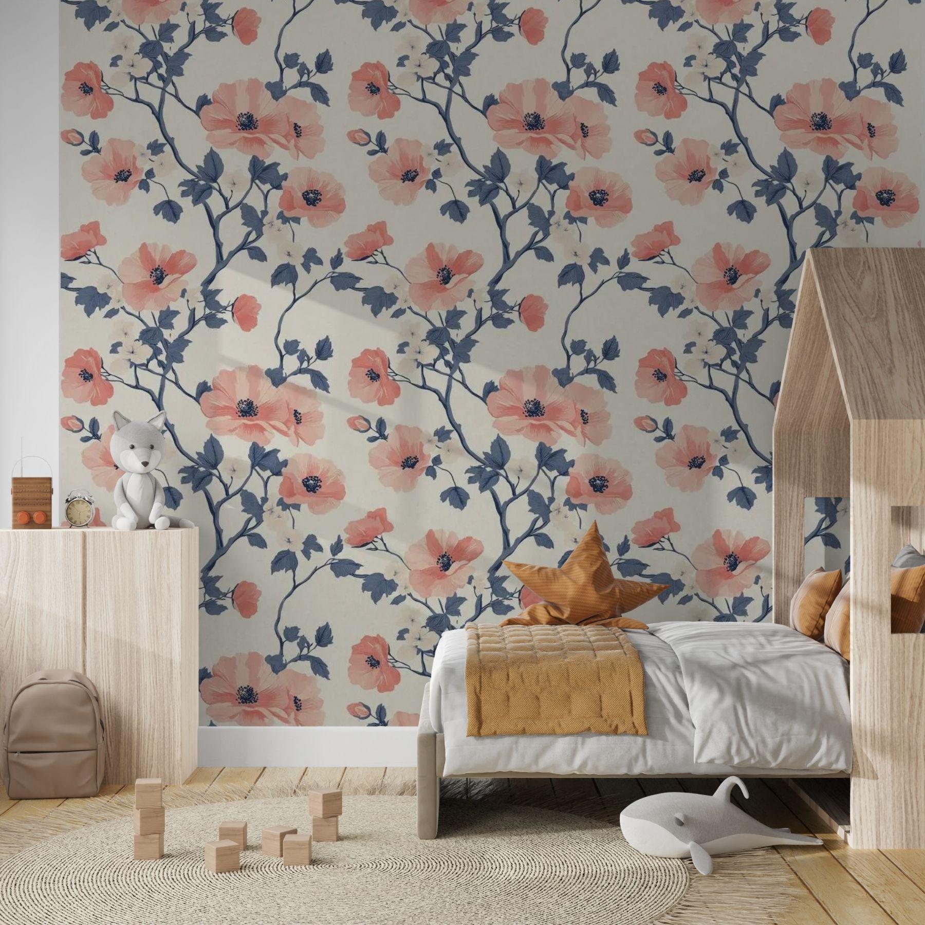 Bold yet tender, this painterly poppy print brings joy and artistry to every corner. Soft coral petals dance across deep indigo branches, creating a look that’s full of warmth and wonder — perfect for nurseries, playrooms, or any space meant to feel alive and beautifully loved.