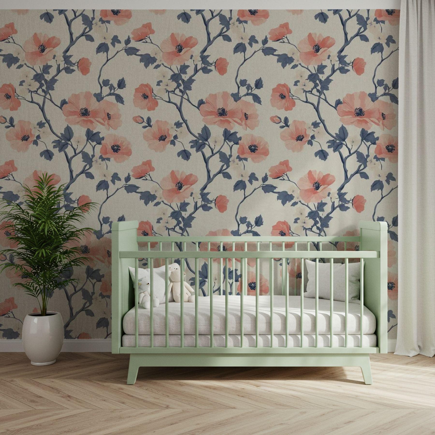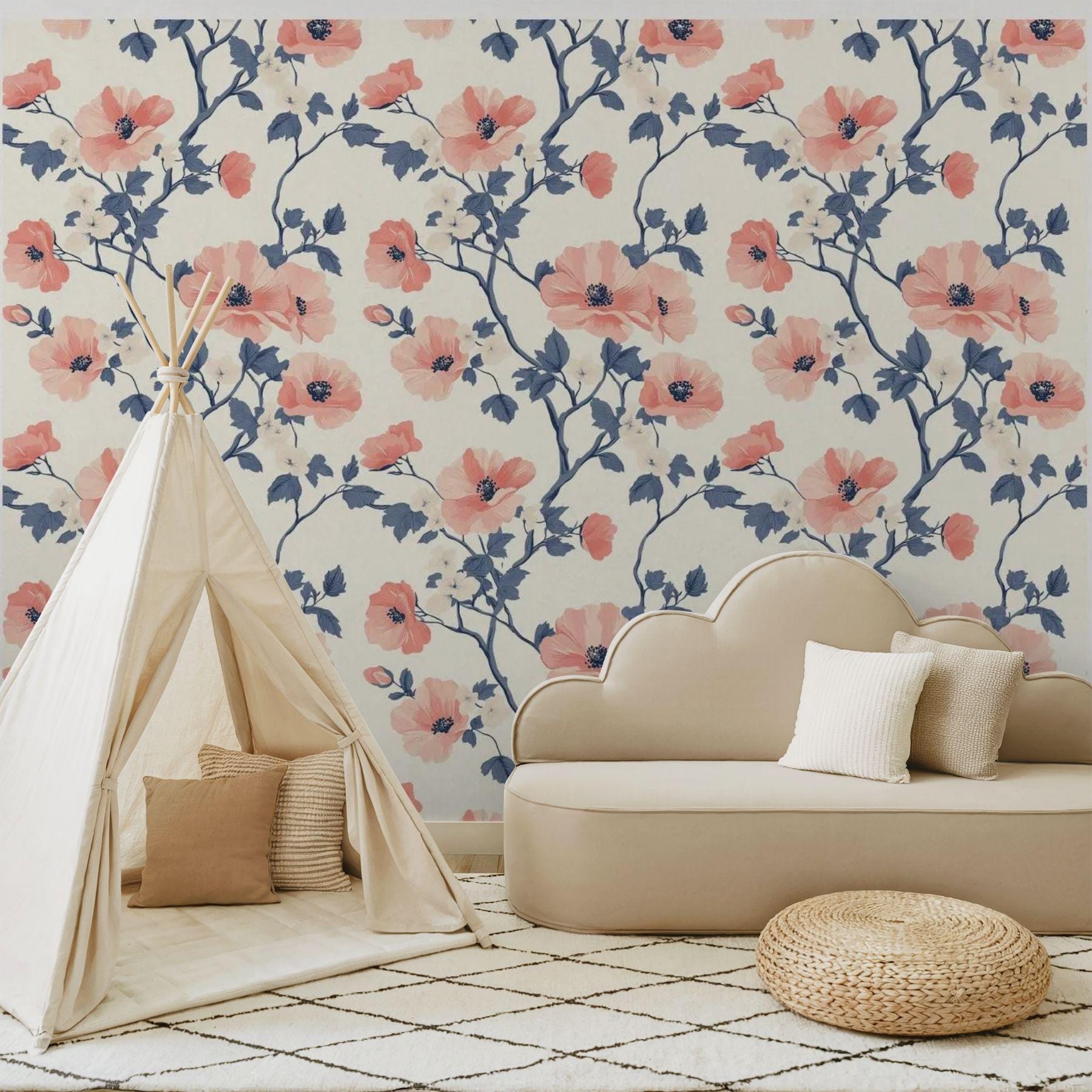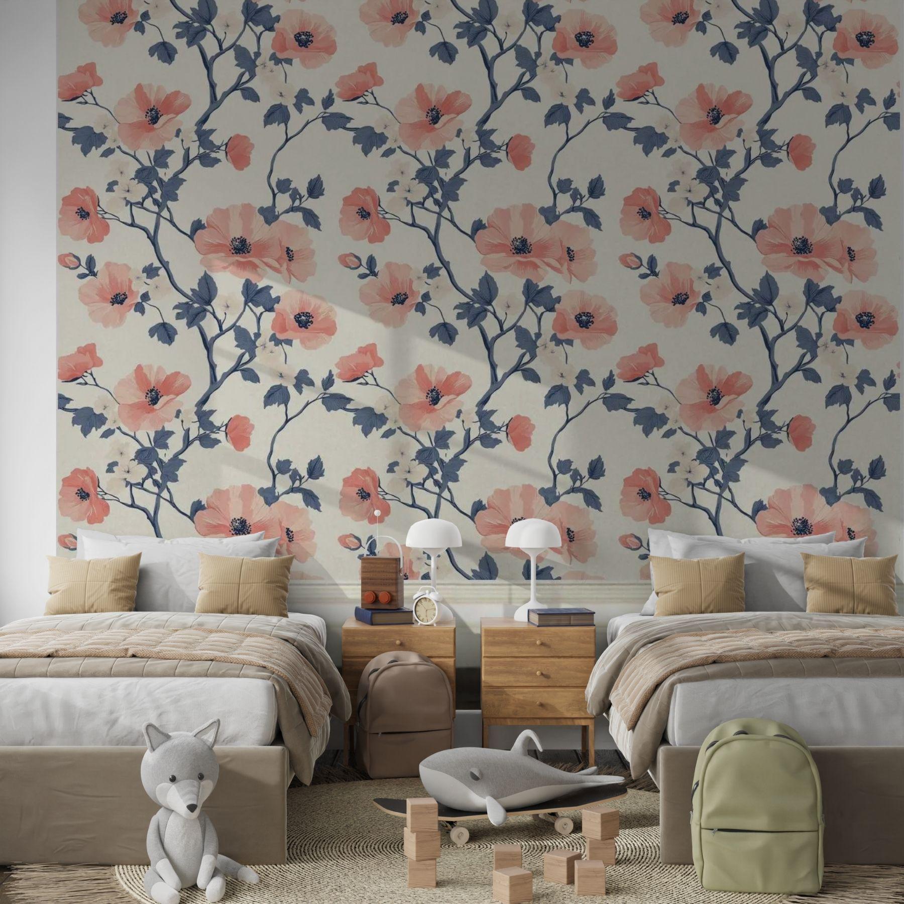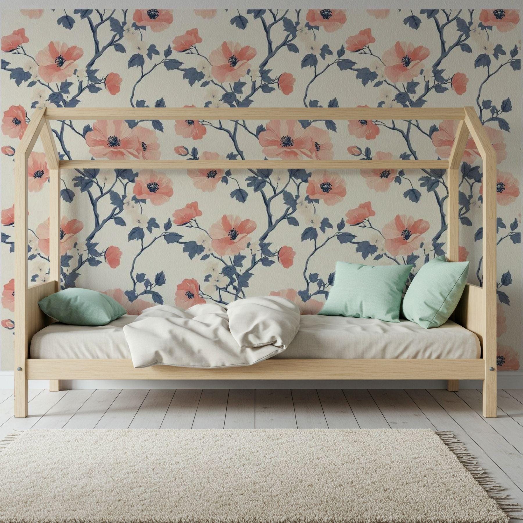 Bold yet tender, this painterly poppy print brings joy and artistry to every corner. Soft coral petals dance across deep indigo branches, creating a look that’s full of warmth and wonder — perfect for nurseries, playrooms, or any space meant to feel alive and beautifully loved.