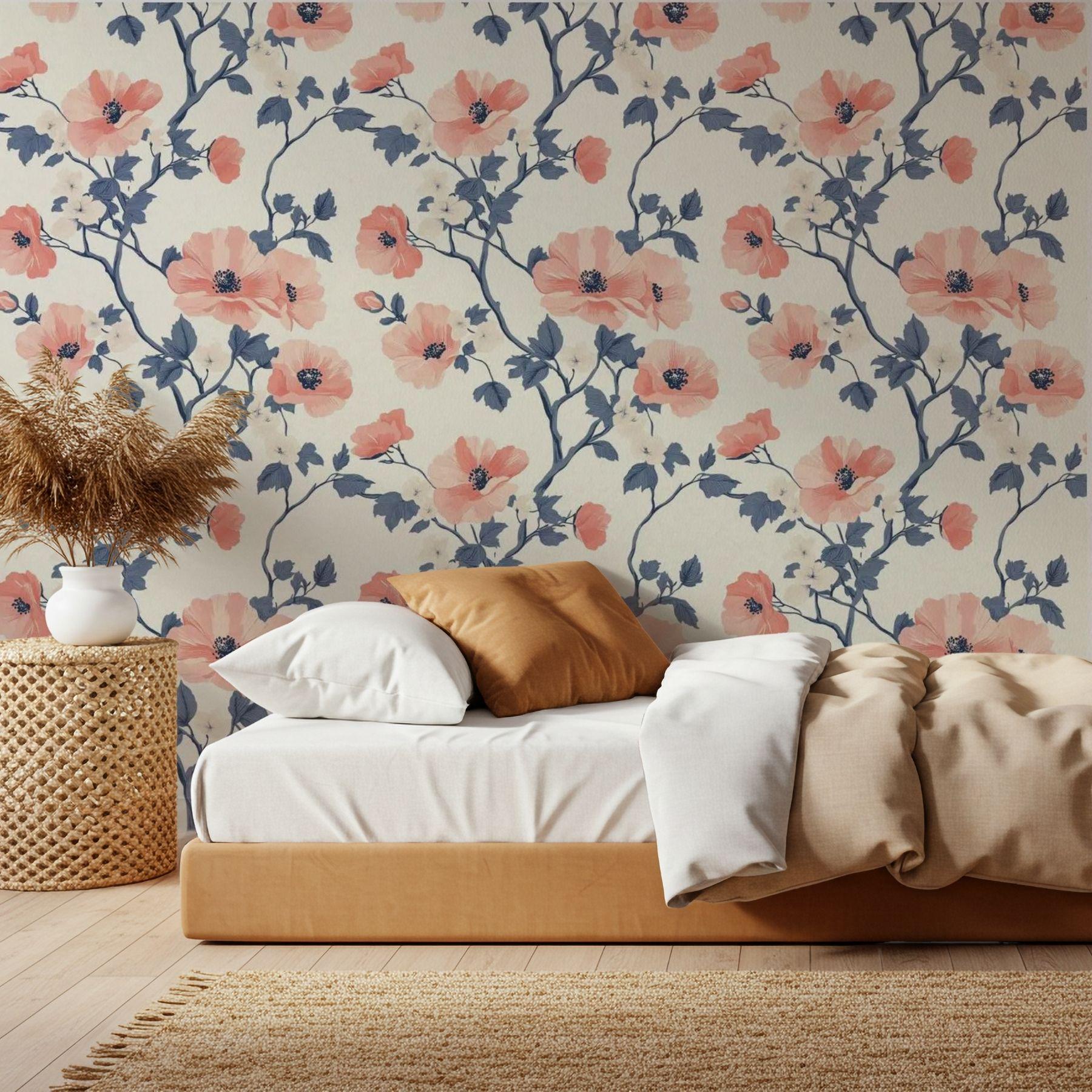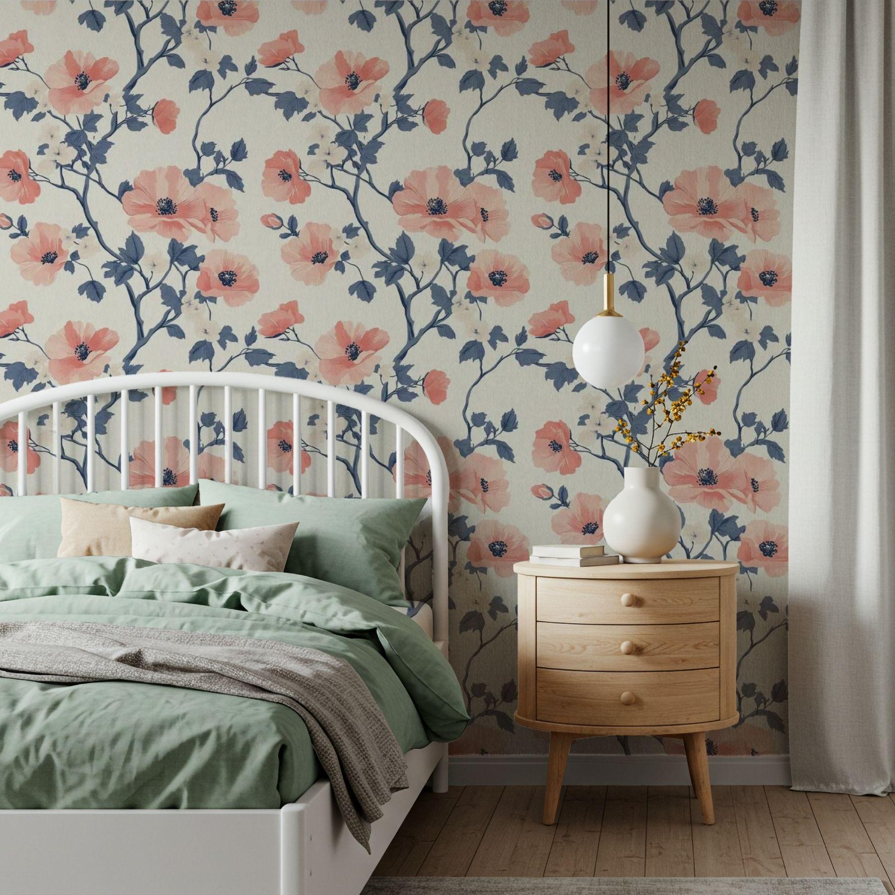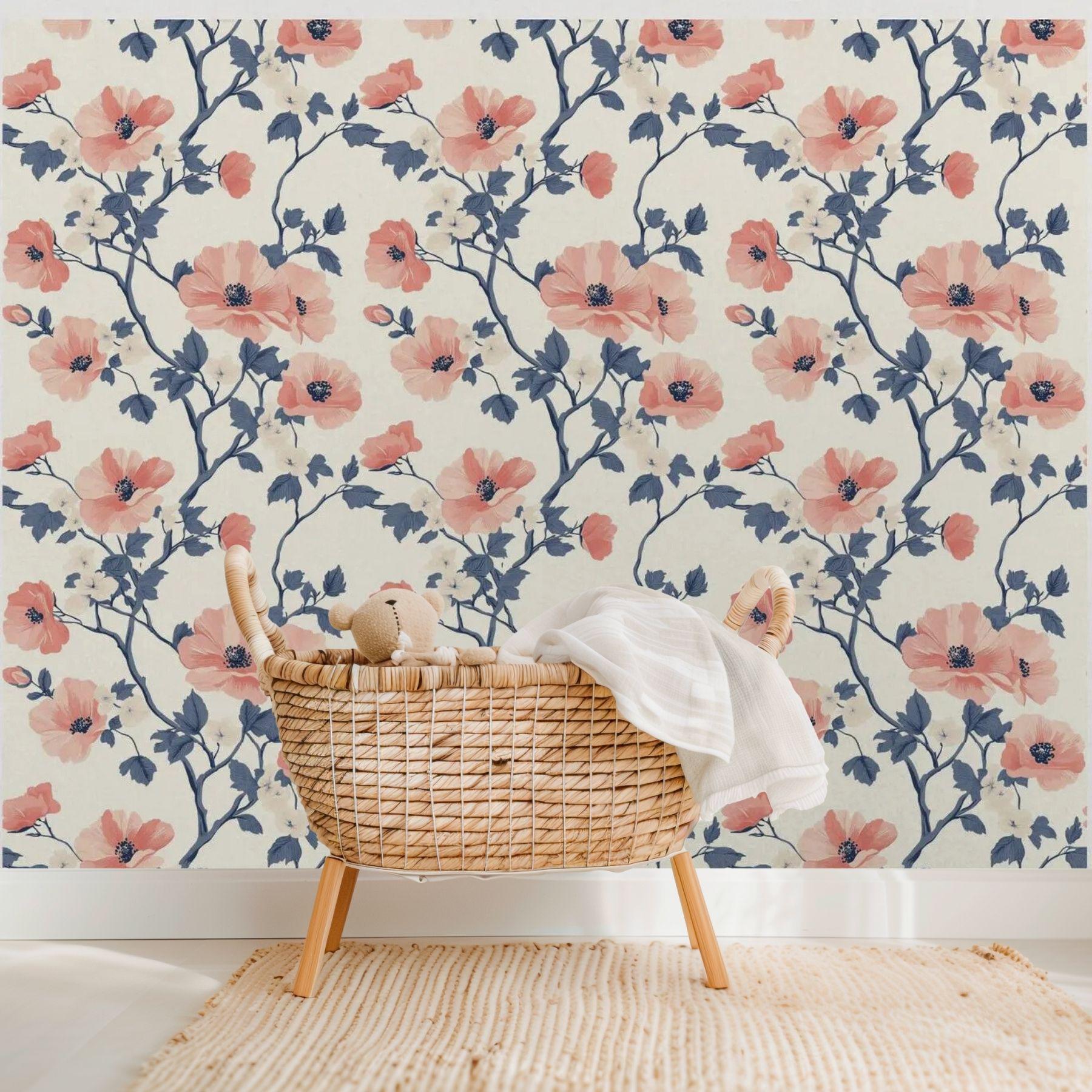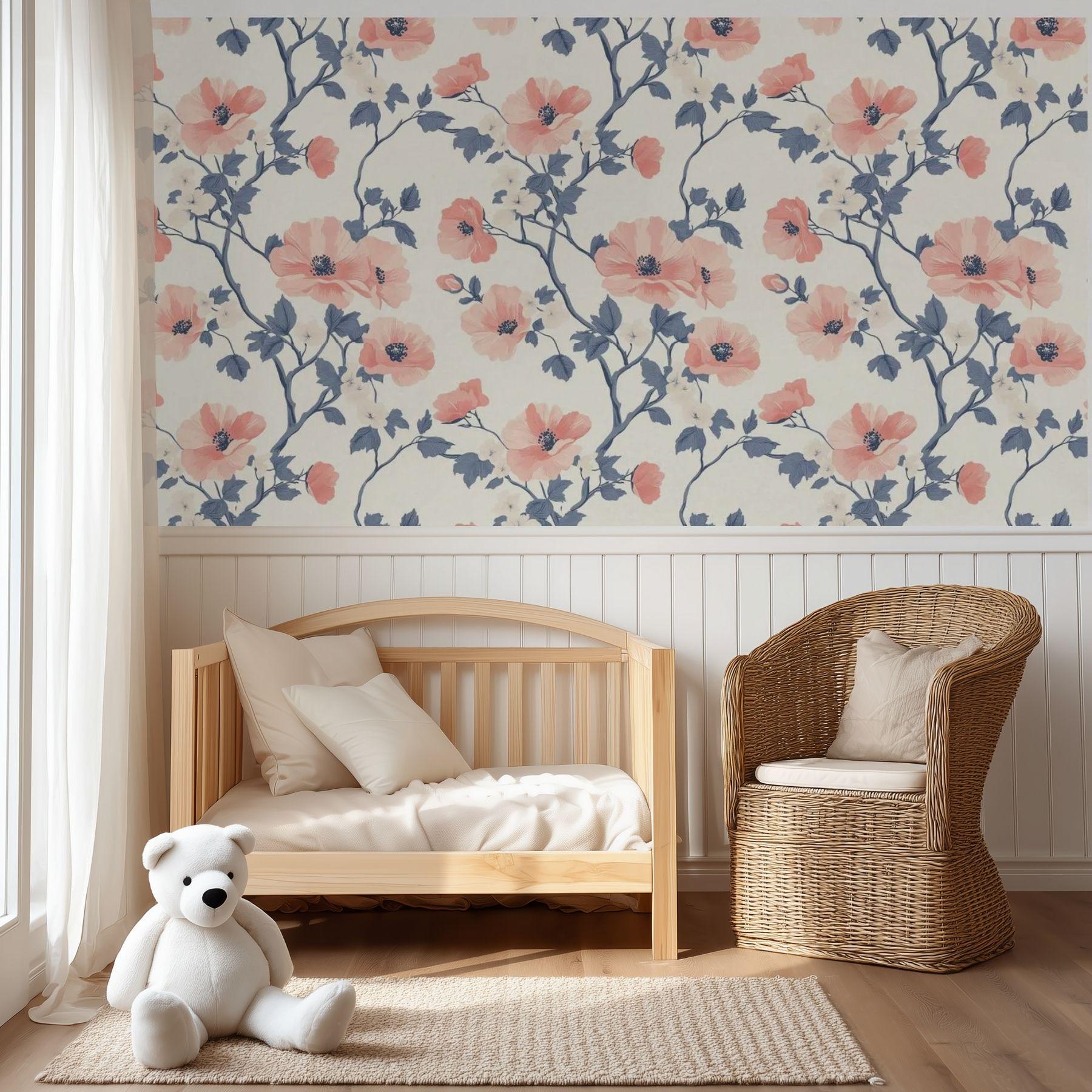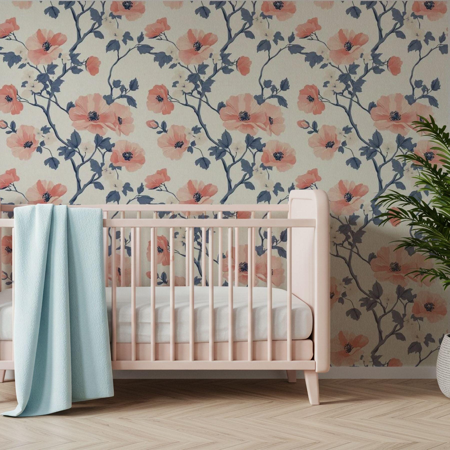 Bold yet tender, this painterly poppy print brings joy and artistry to every corner. Soft coral petals dance across deep indigo branches, creating a look that’s full of warmth and wonder — perfect for nurseries, playrooms, or any space meant to feel alive and beautifully loved.
