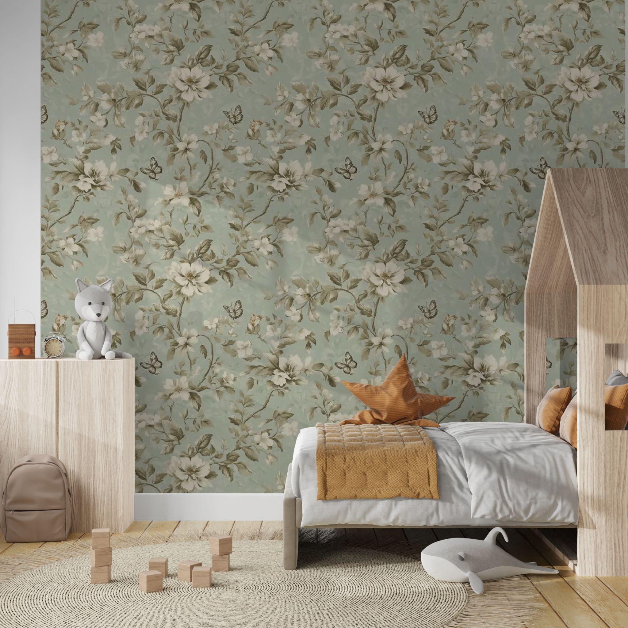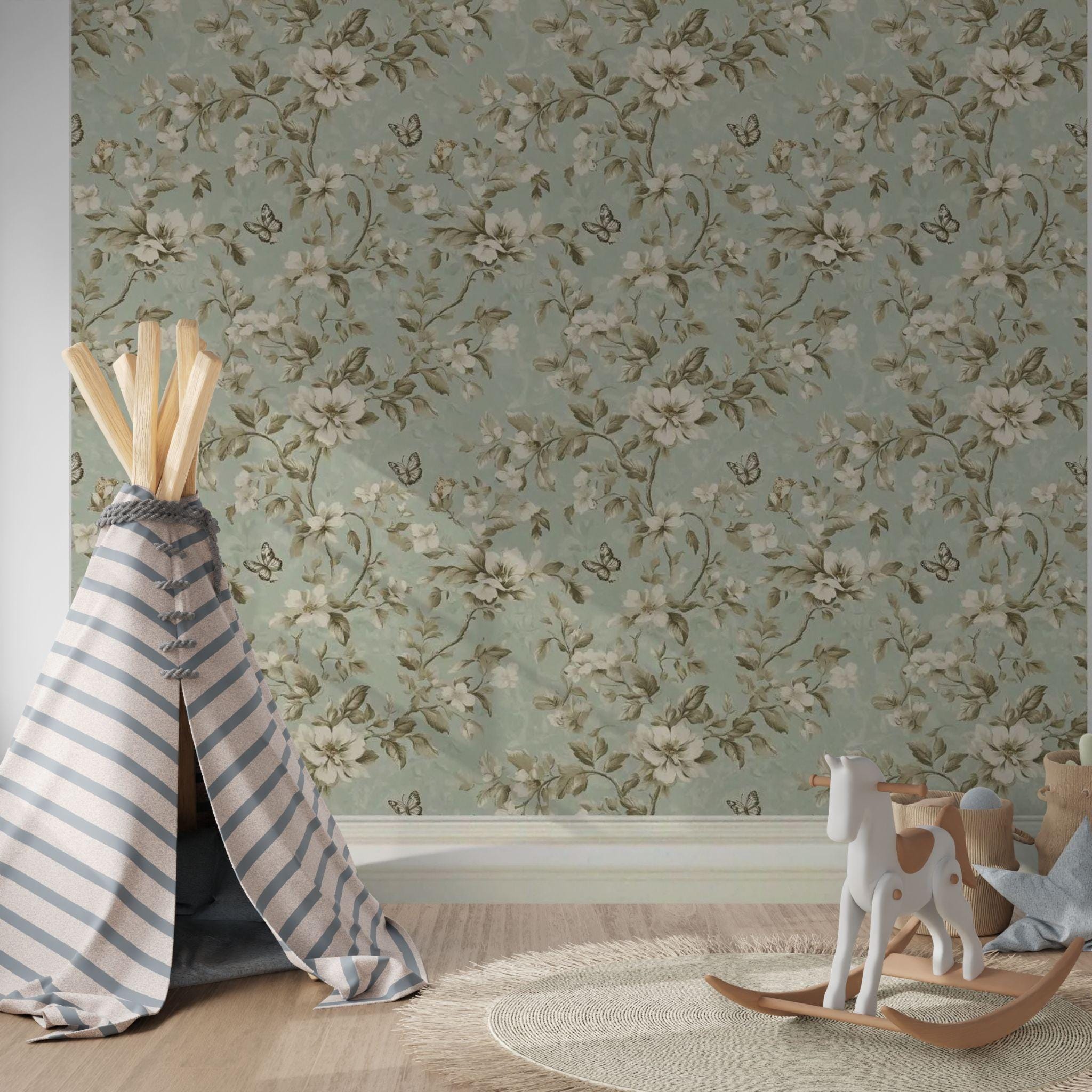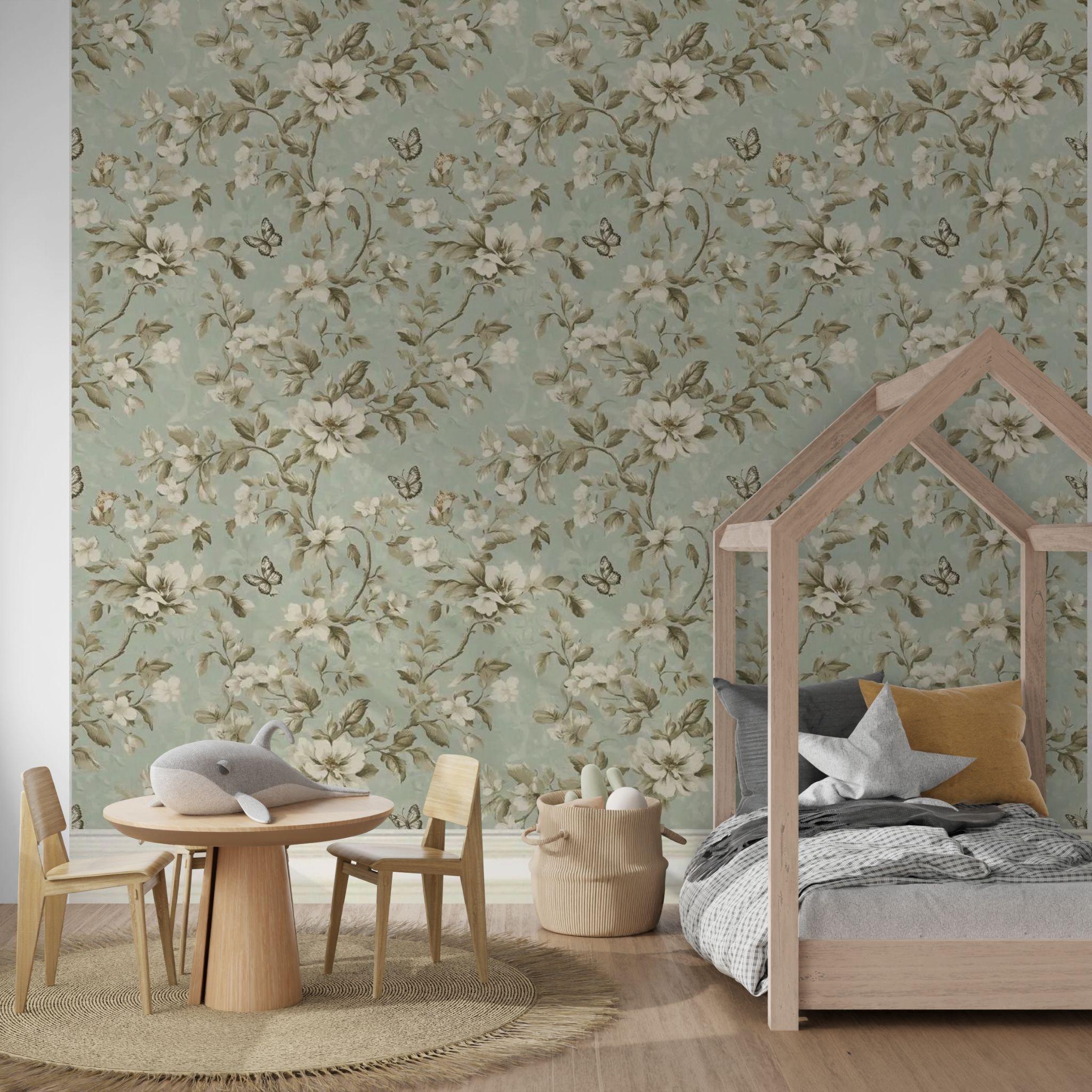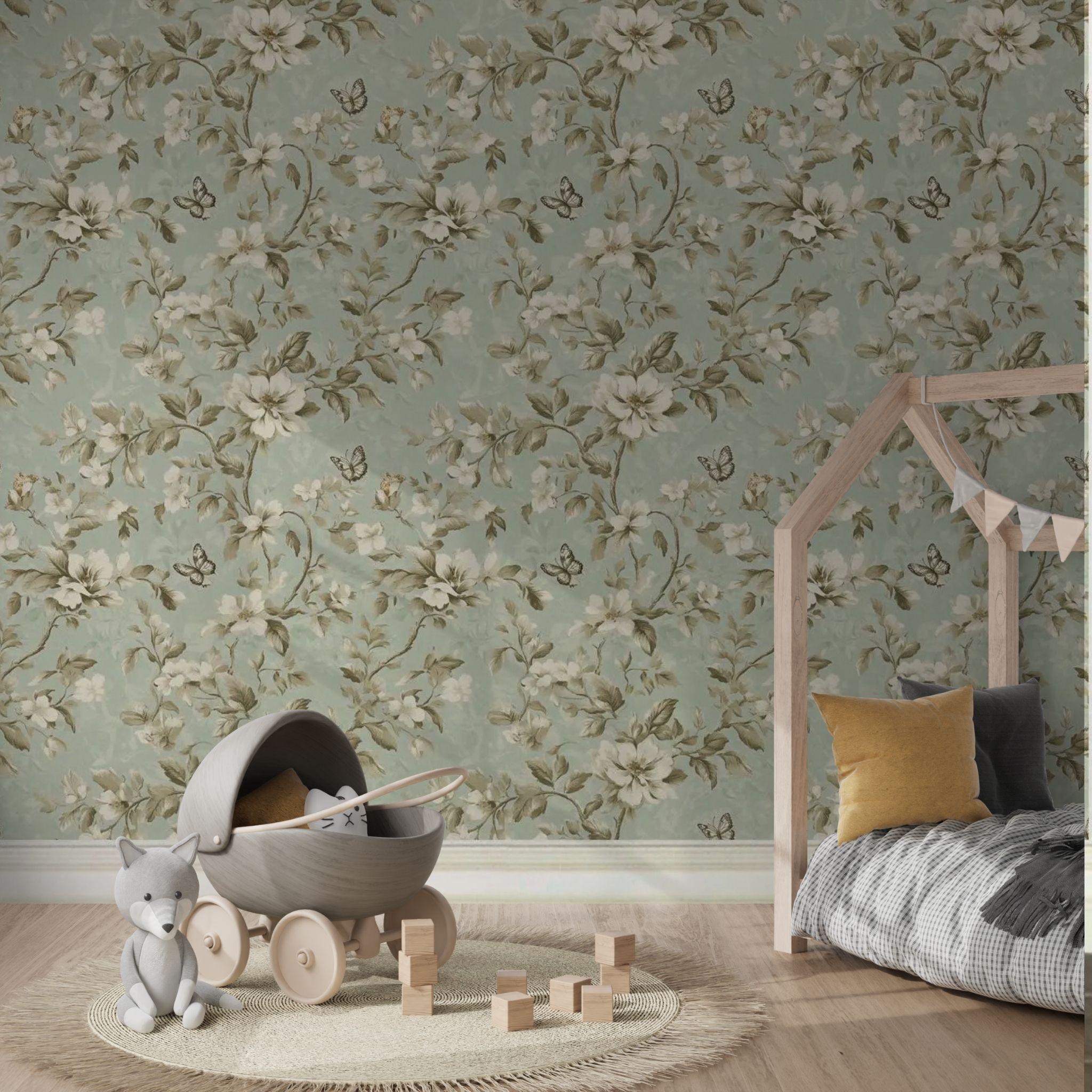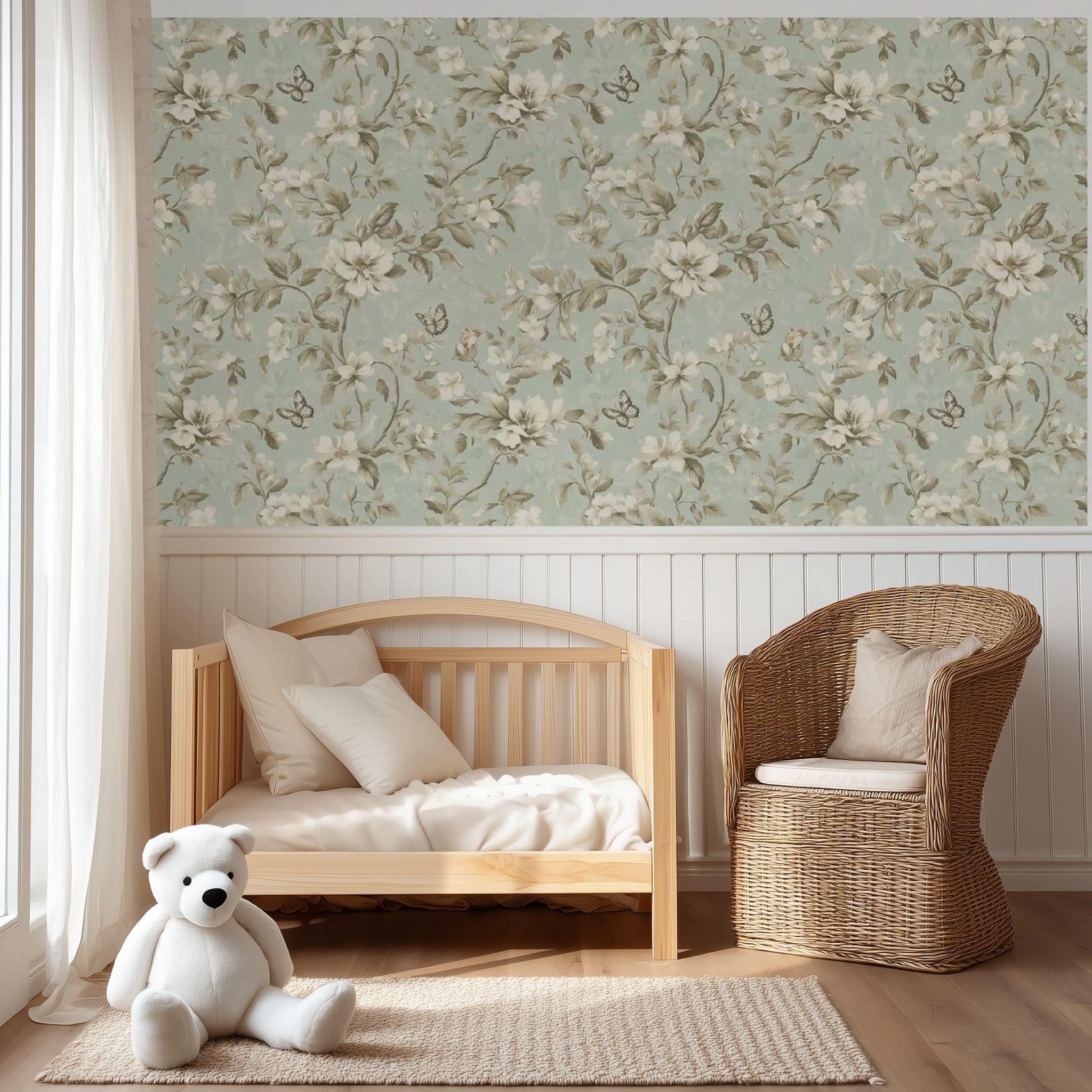 A serene blend of nature and nostalgia, this wallpaper features graceful cream blooms and fluttering butterflies over a washed sage backdrop. The hand-painted detailing and subtle texture evoke vintage charm, creating a peaceful, heirloom-inspired space perfect for nurseries, bedrooms, or reading nooks.