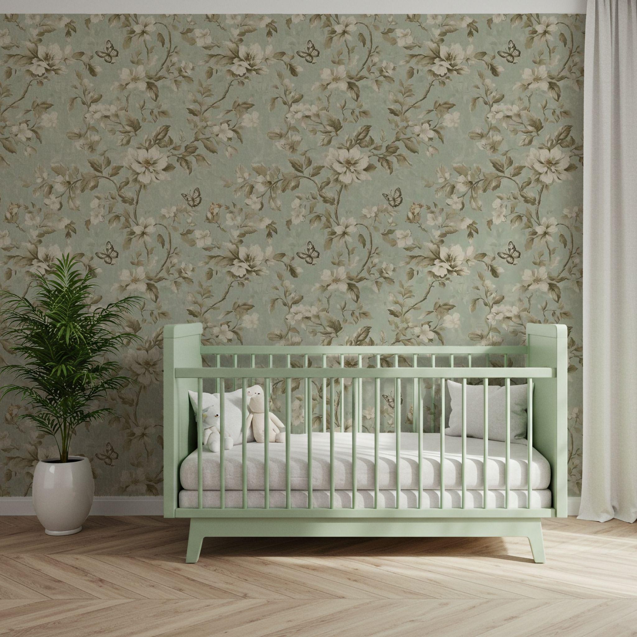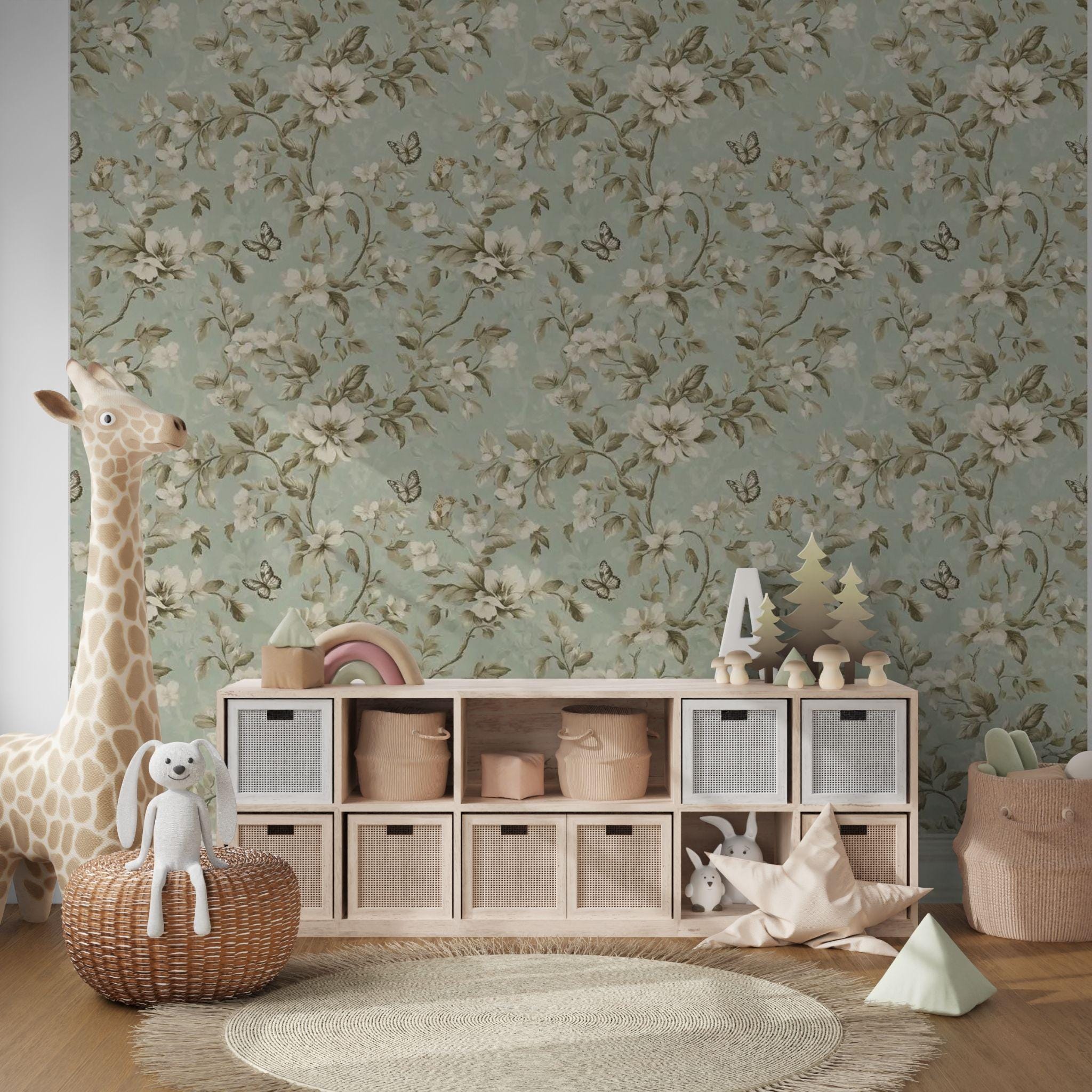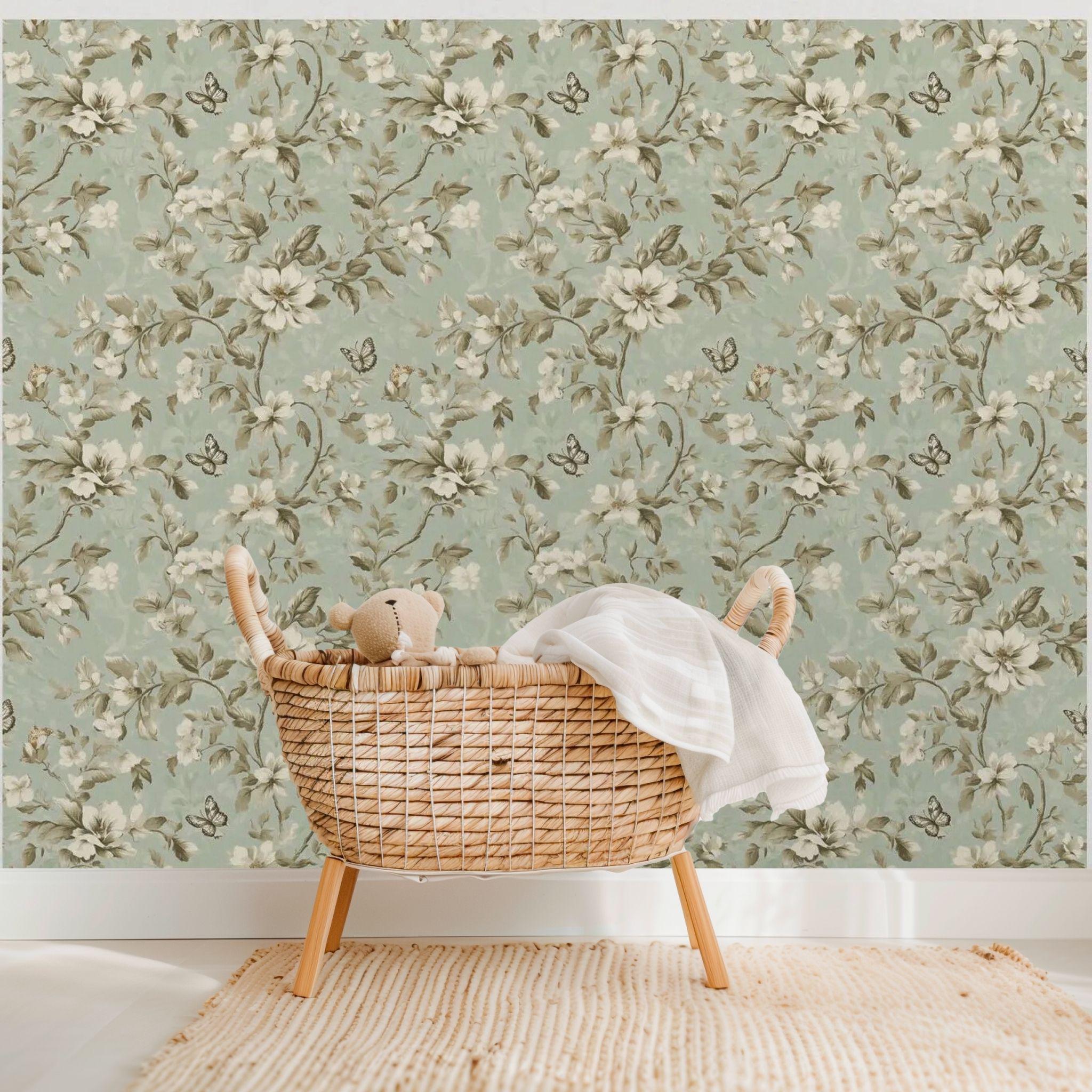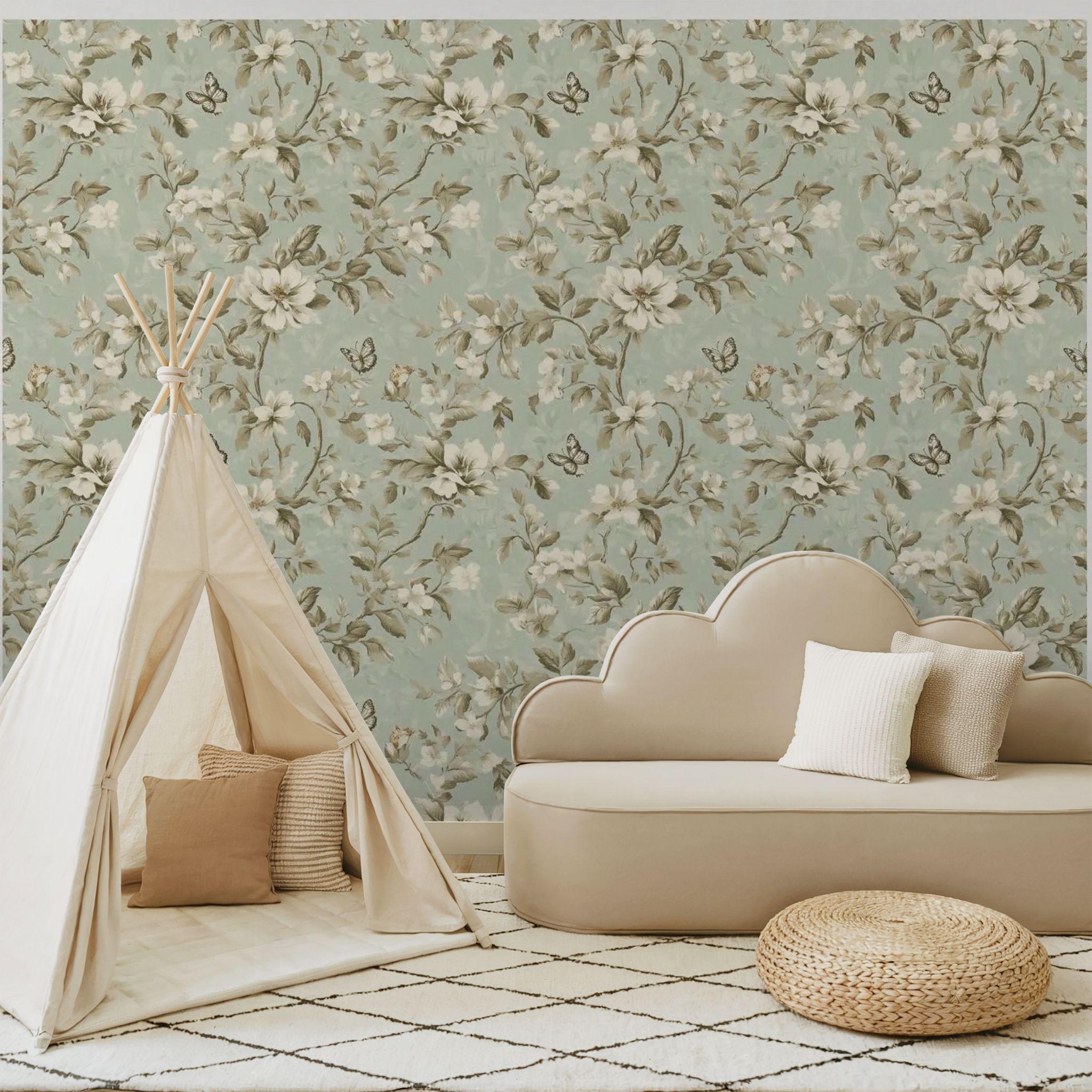 A serene blend of nature and nostalgia, this wallpaper features graceful cream blooms and fluttering butterflies over a washed sage backdrop. The hand-painted detailing and subtle texture evoke vintage charm, creating a peaceful, heirloom-inspired space perfect for nurseries, bedrooms, or reading nooks.