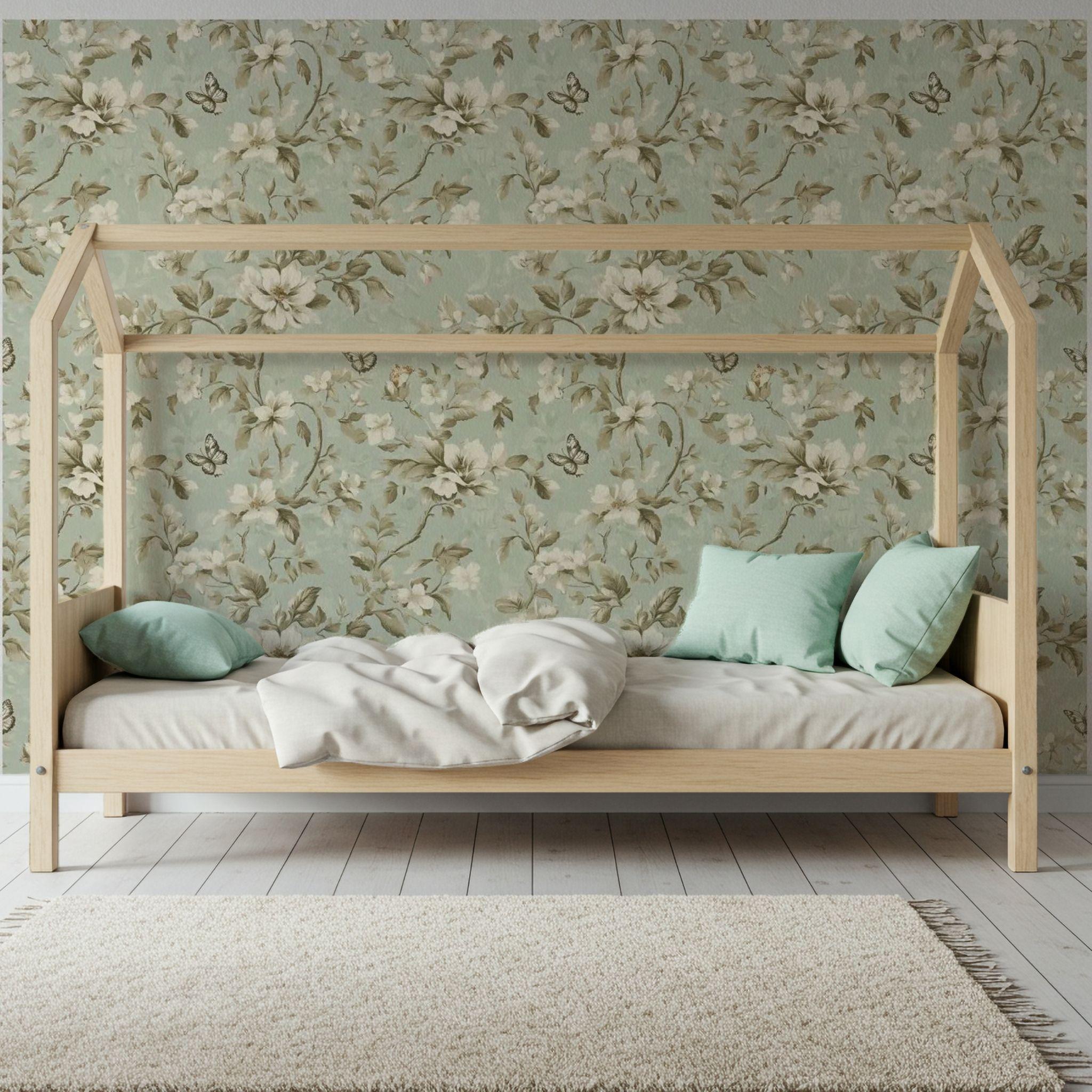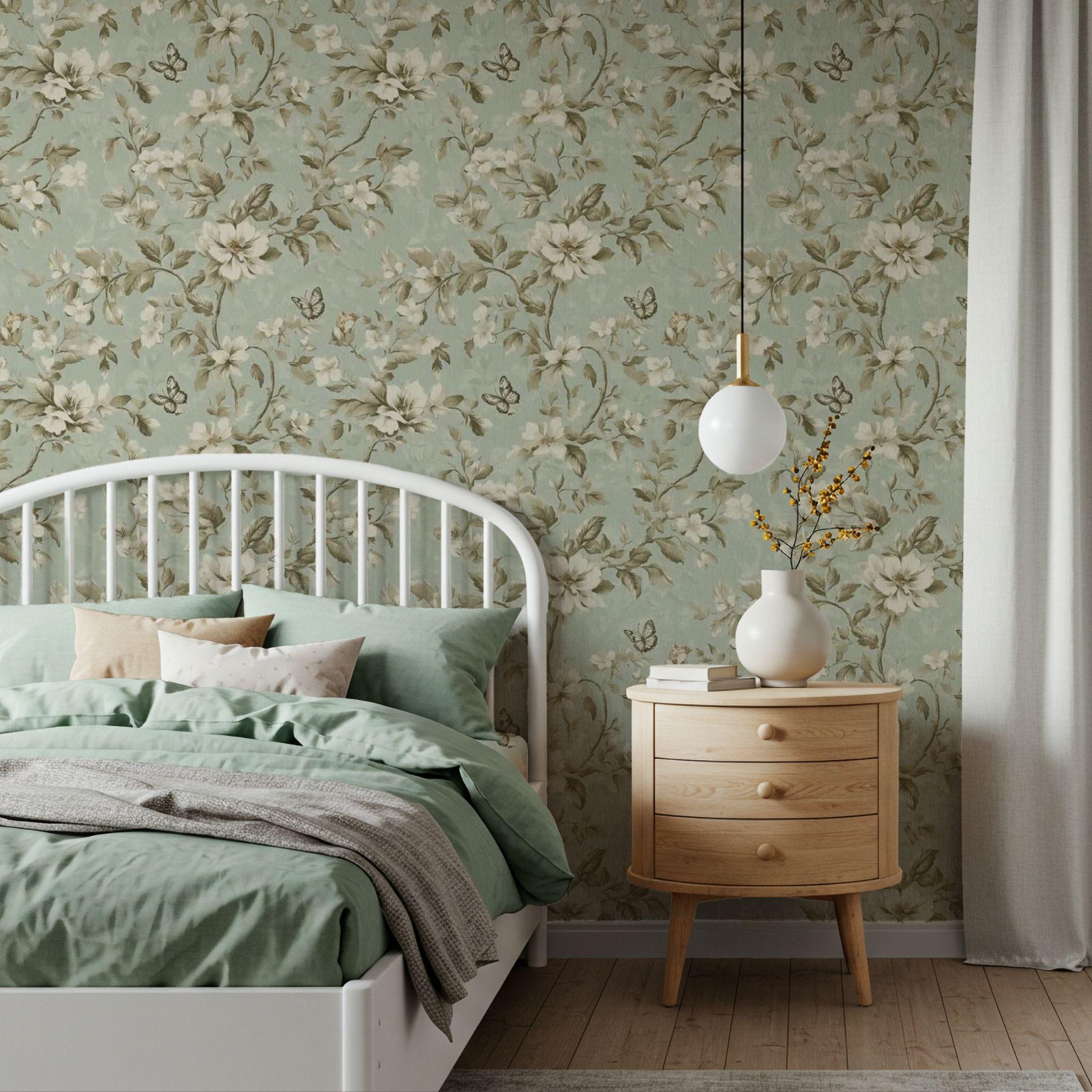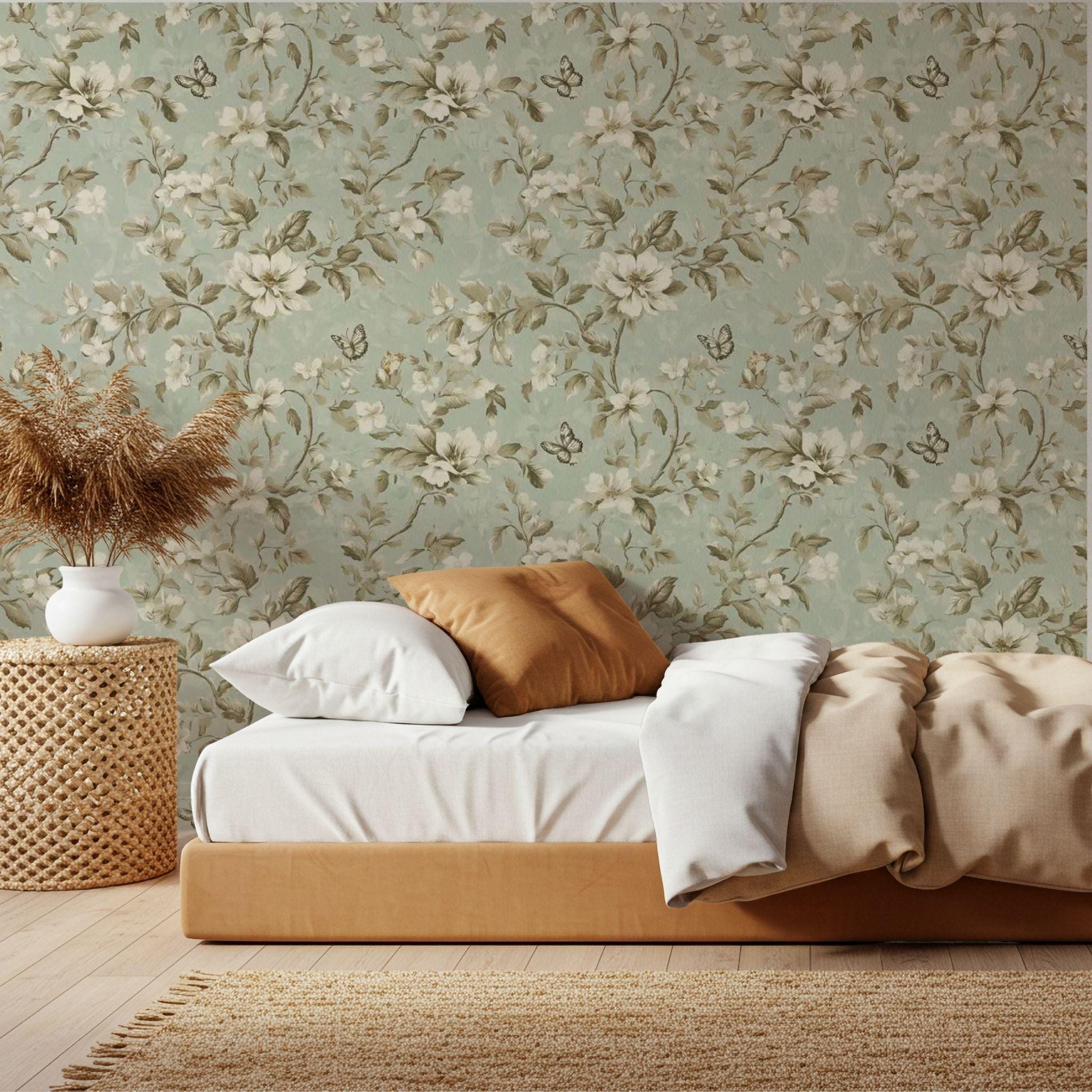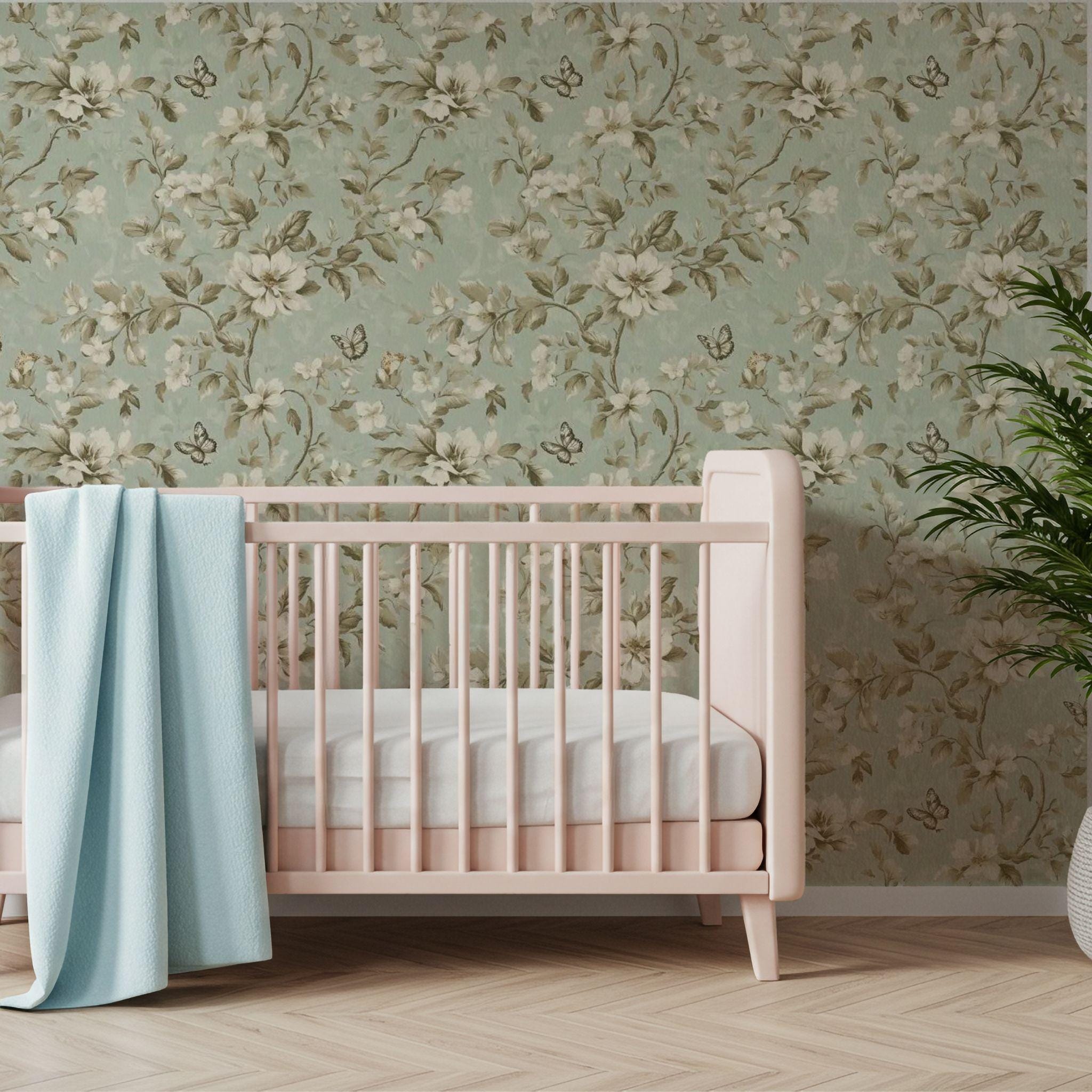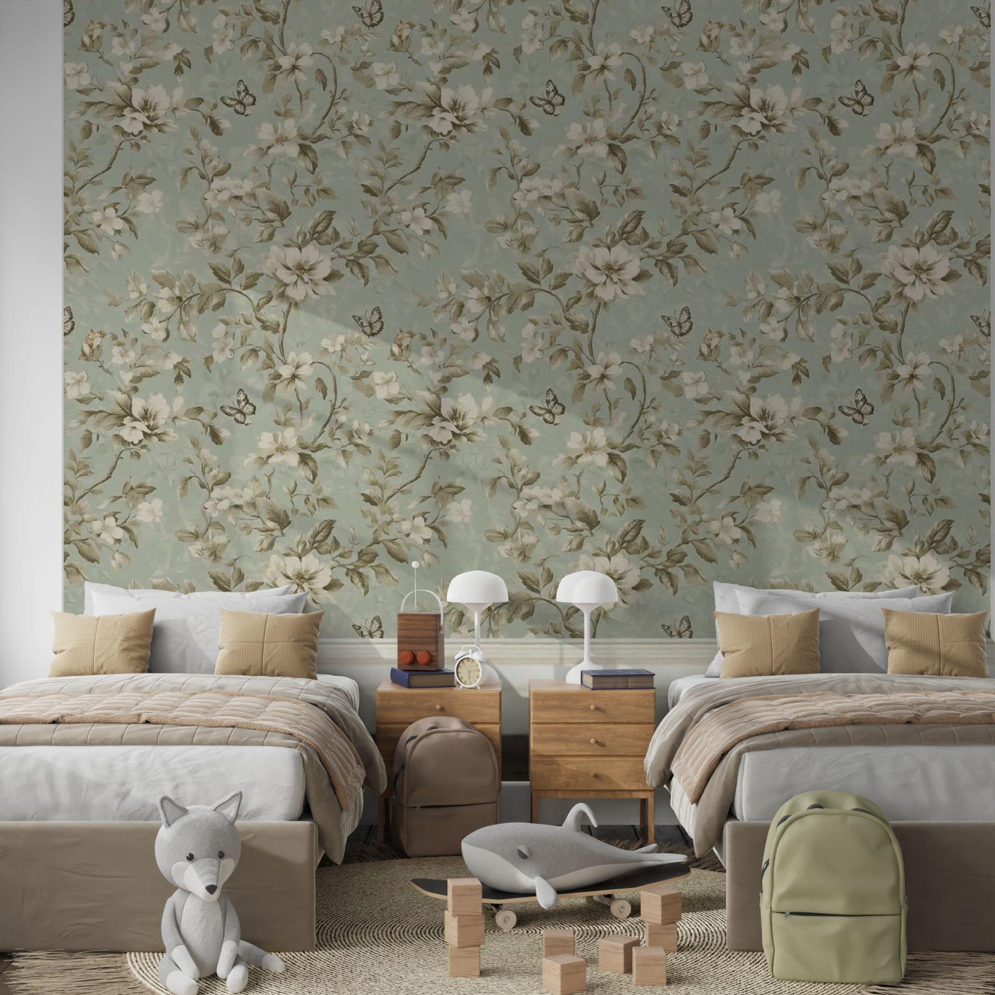 A serene blend of nature and nostalgia, this wallpaper features graceful cream blooms and fluttering butterflies over a washed sage backdrop. The hand-painted detailing and subtle texture evoke vintage charm, creating a peaceful, heirloom-inspired space perfect for nurseries, bedrooms, or reading nooks.