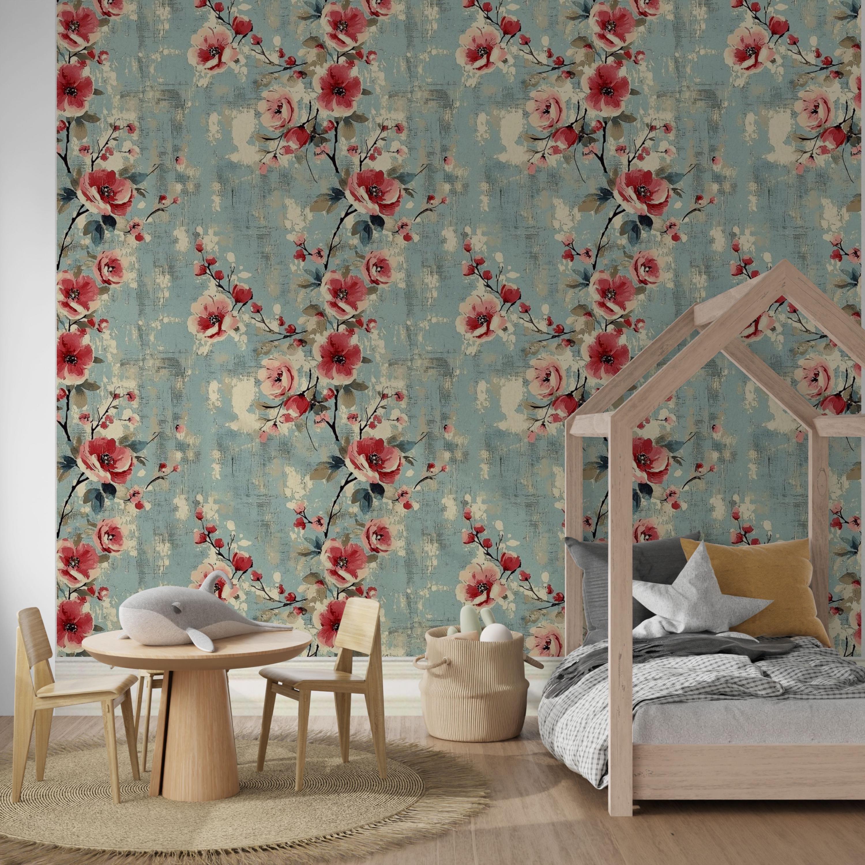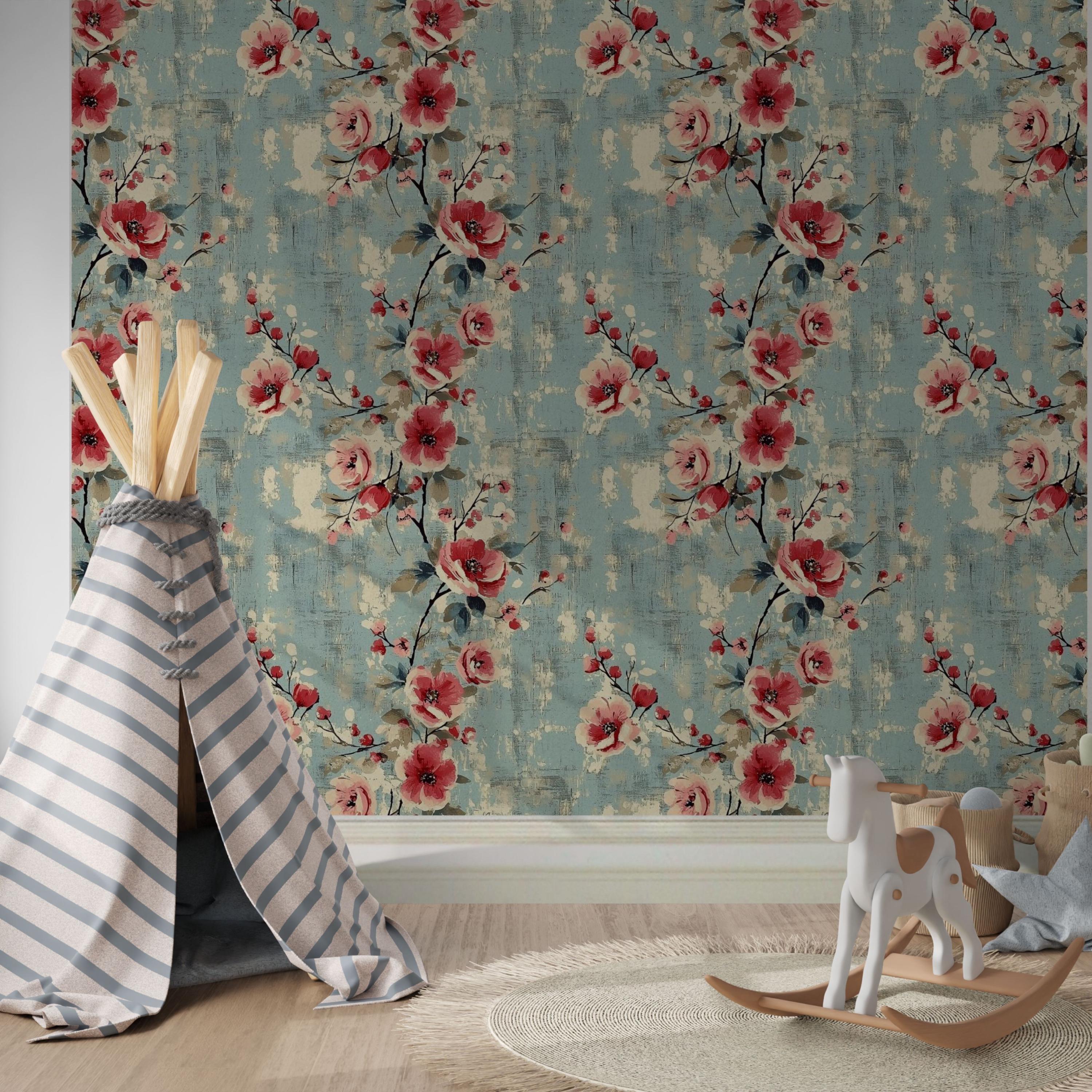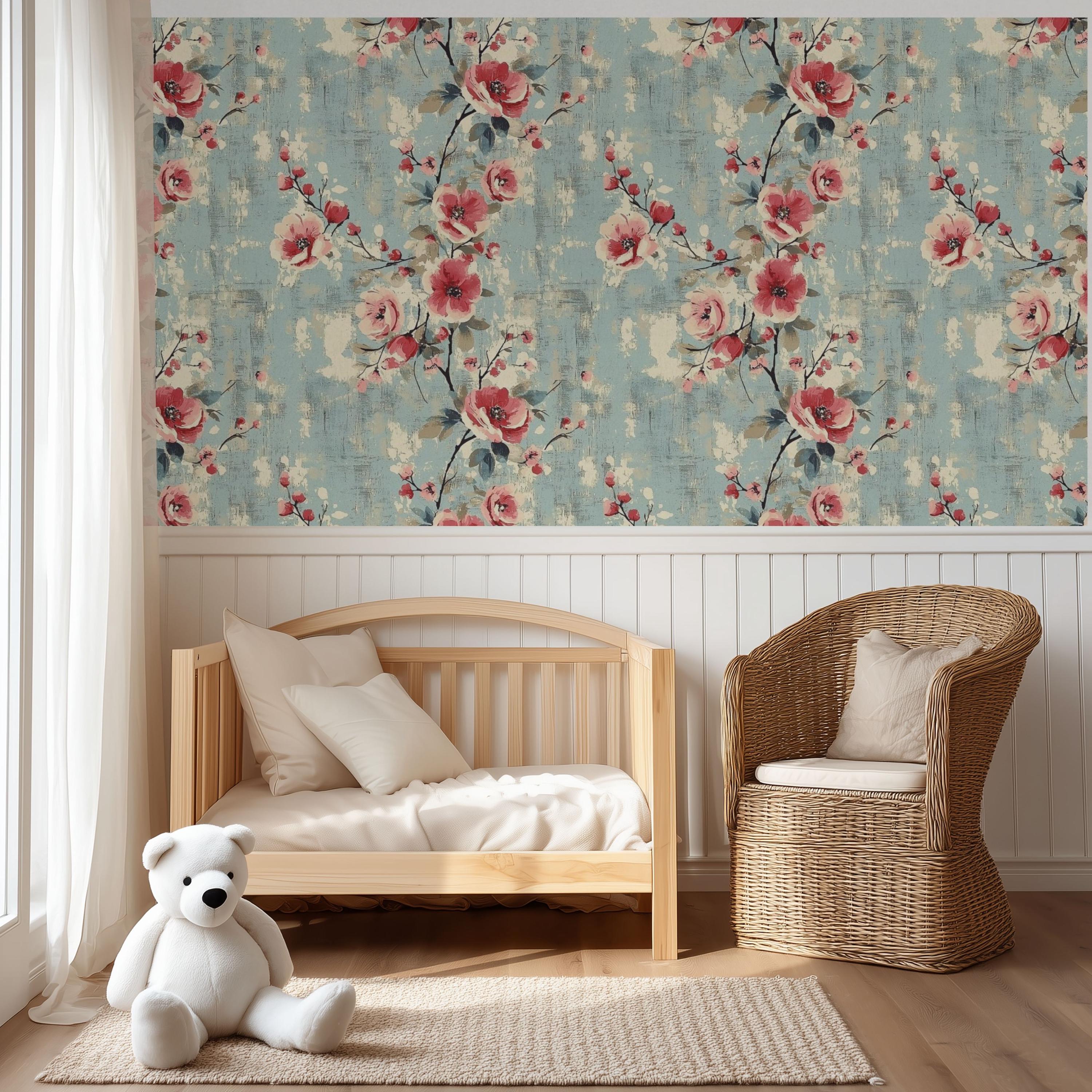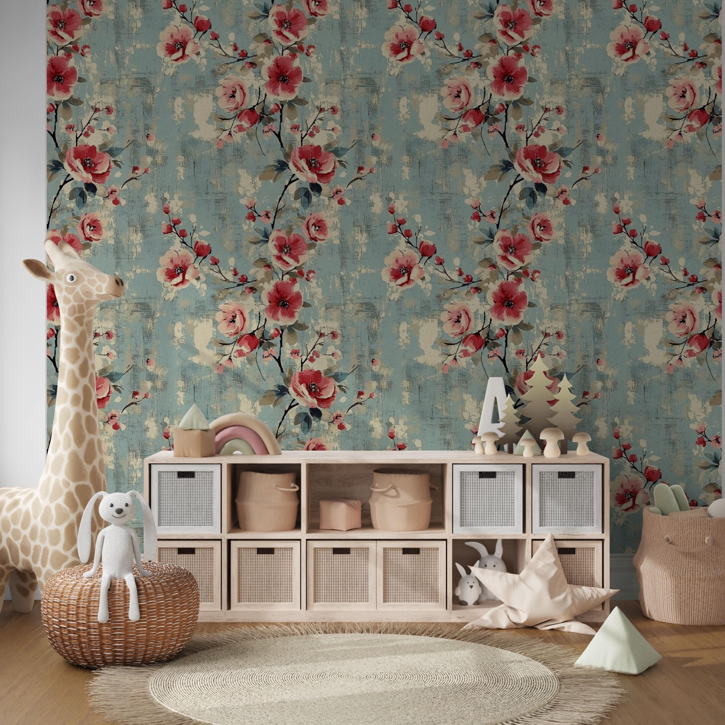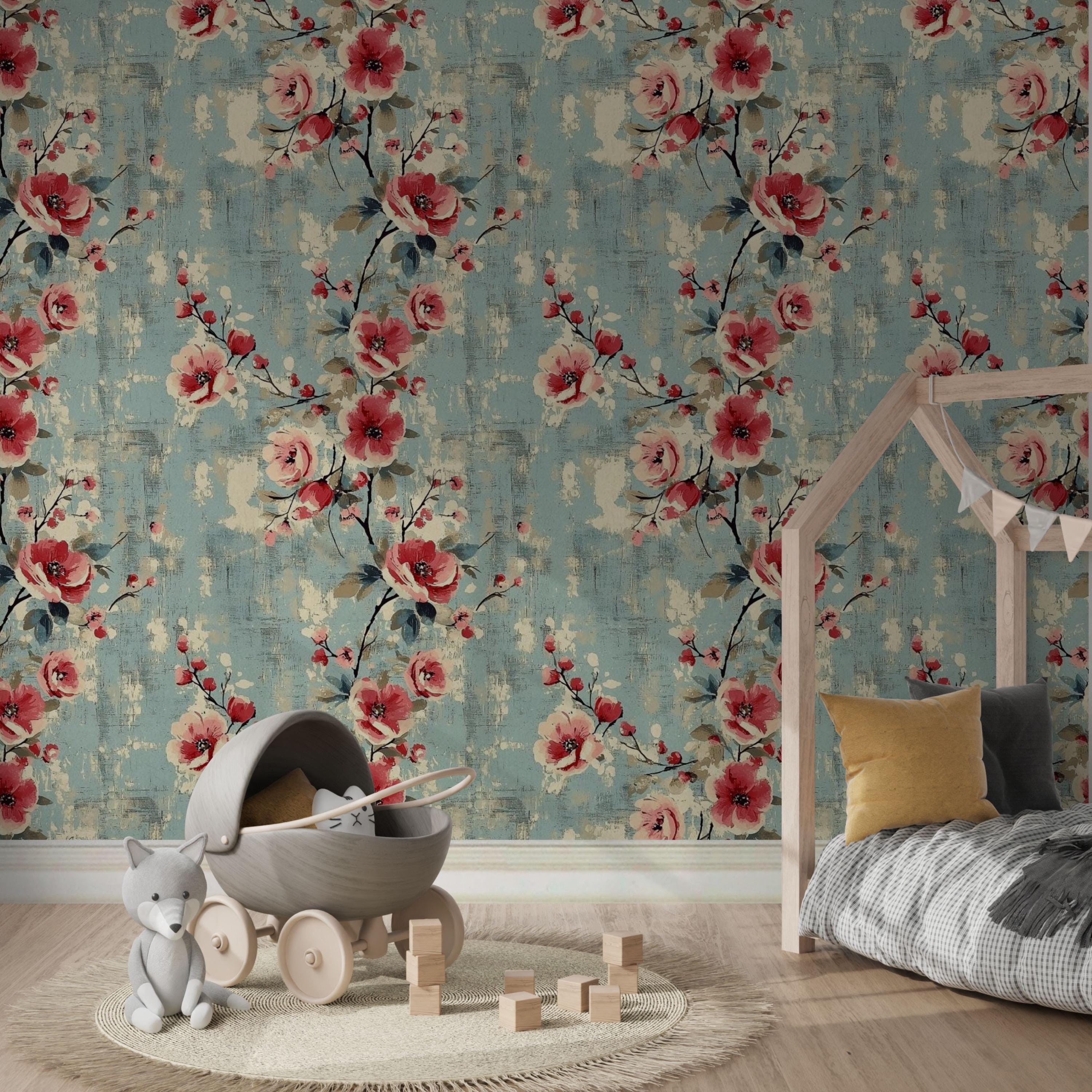 Painterly blooms unfurl across a weathered blue canvas, blending vintage romance with quiet modern charm. The layered brushwork and warm coral tones create a sense of timeless comfort — perfect for nurseries, kids’ rooms, or any space that deserves art that lives on your walls.