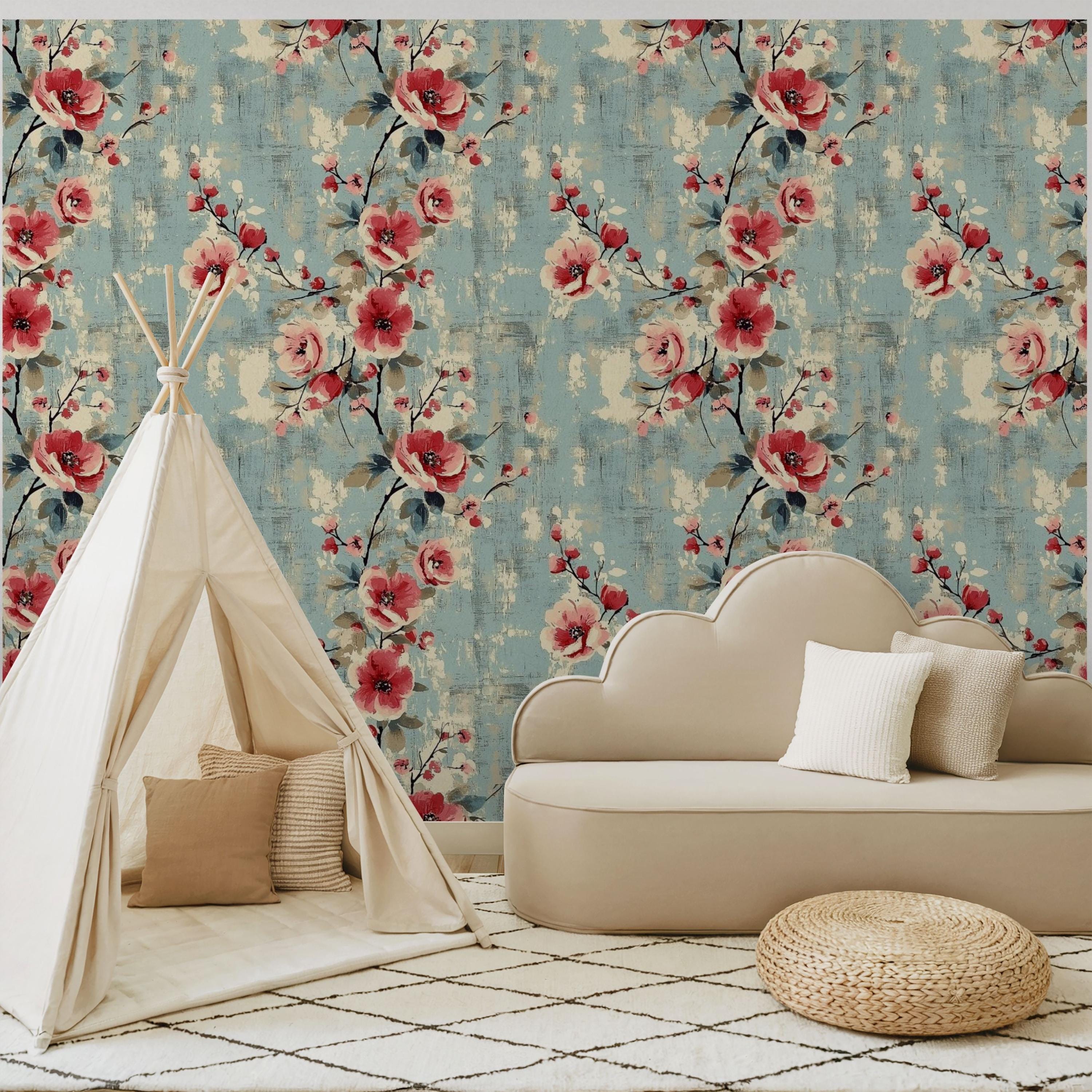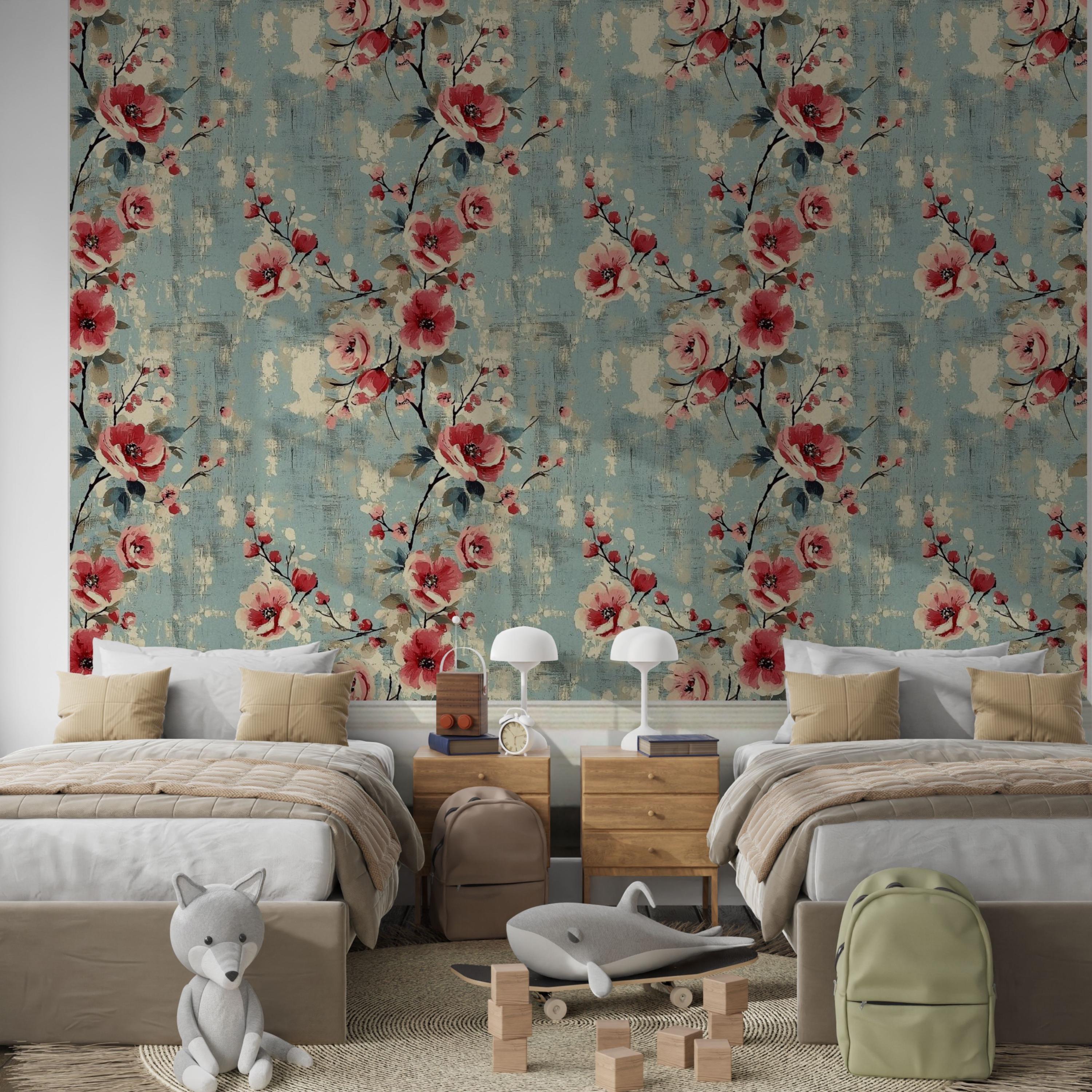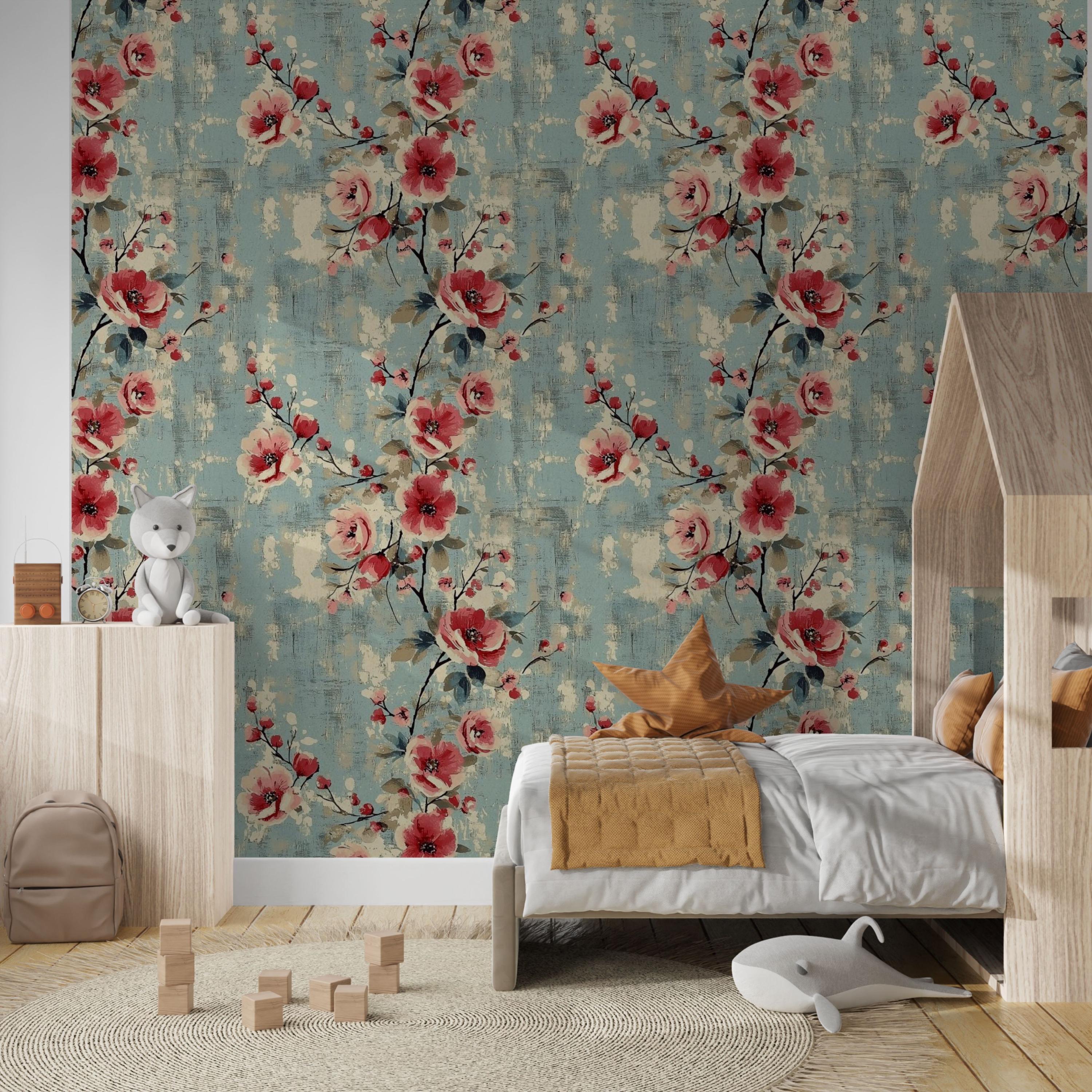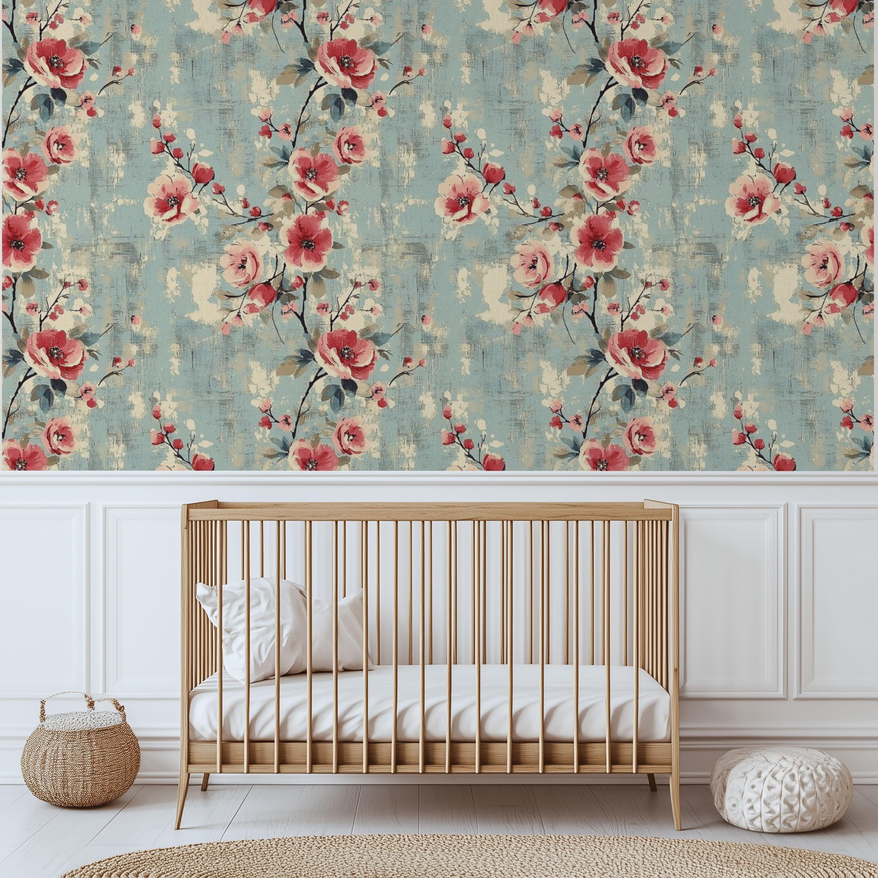 Painterly blooms unfurl across a weathered blue canvas, blending vintage romance with quiet modern charm. The layered brushwork and warm coral tones create a sense of timeless comfort — perfect for nurseries, kids’ rooms, or any space that deserves art that lives on your walls.