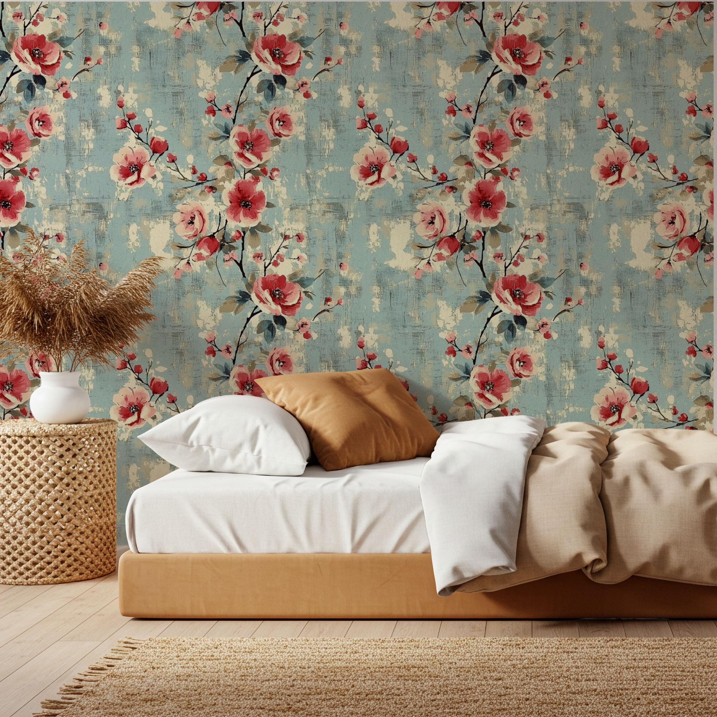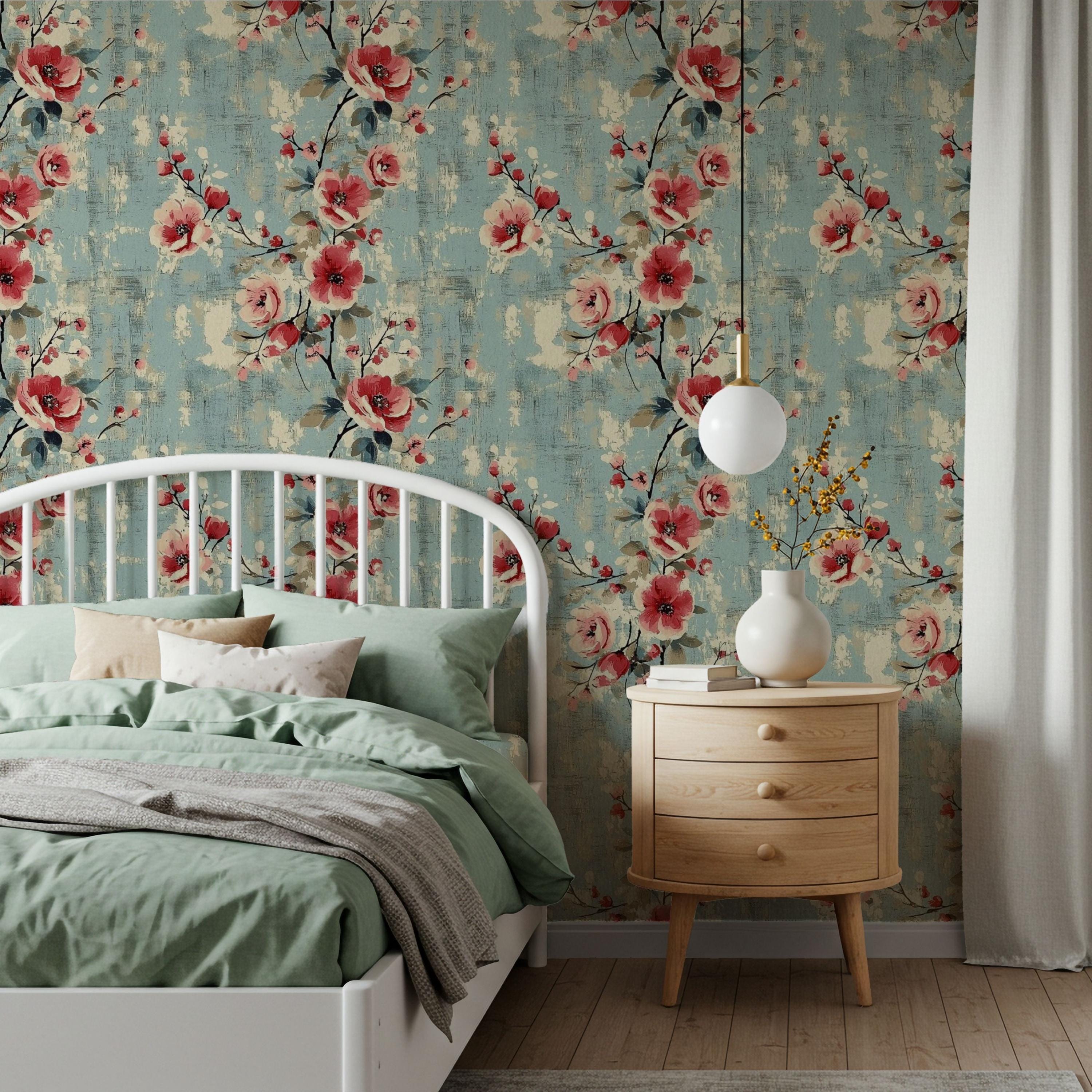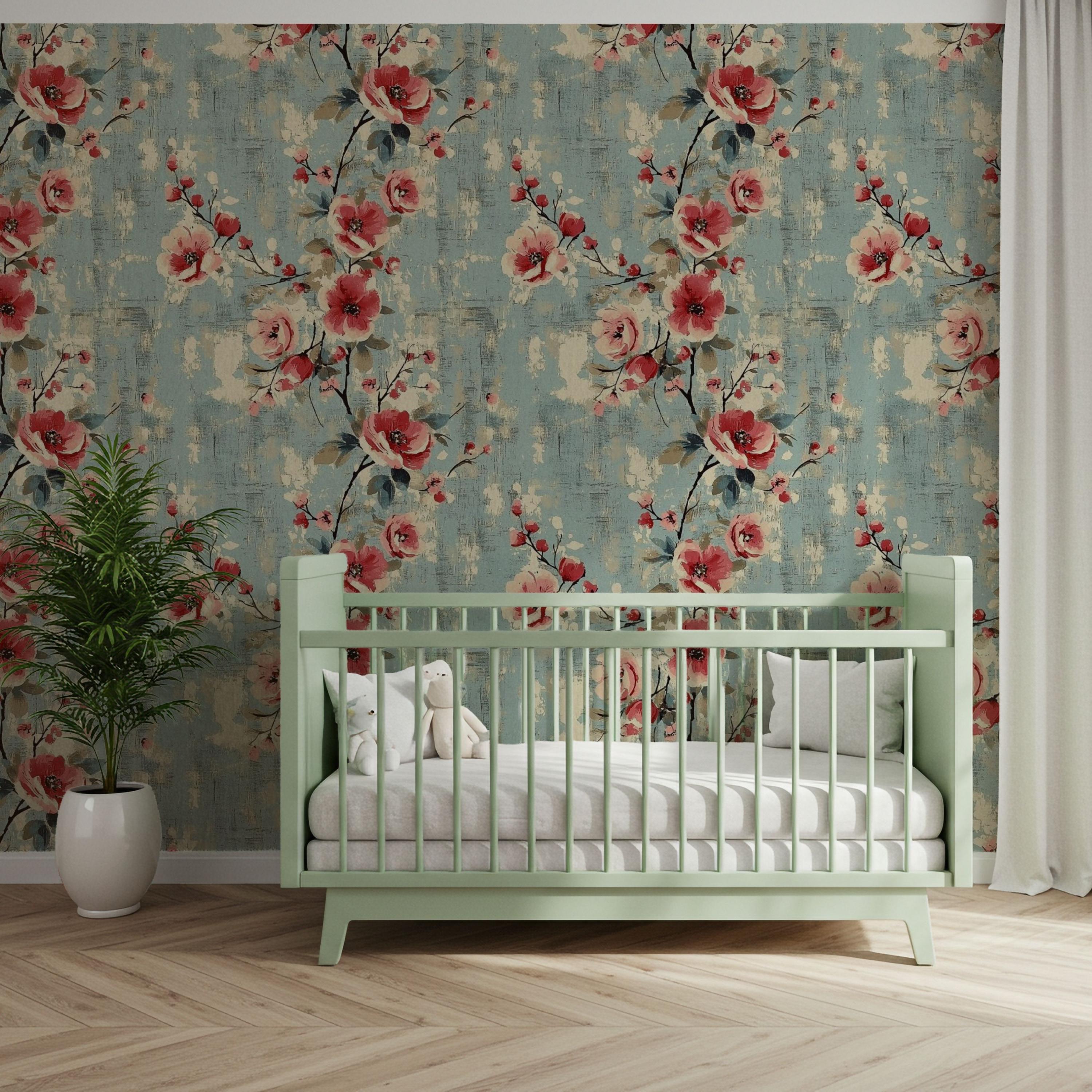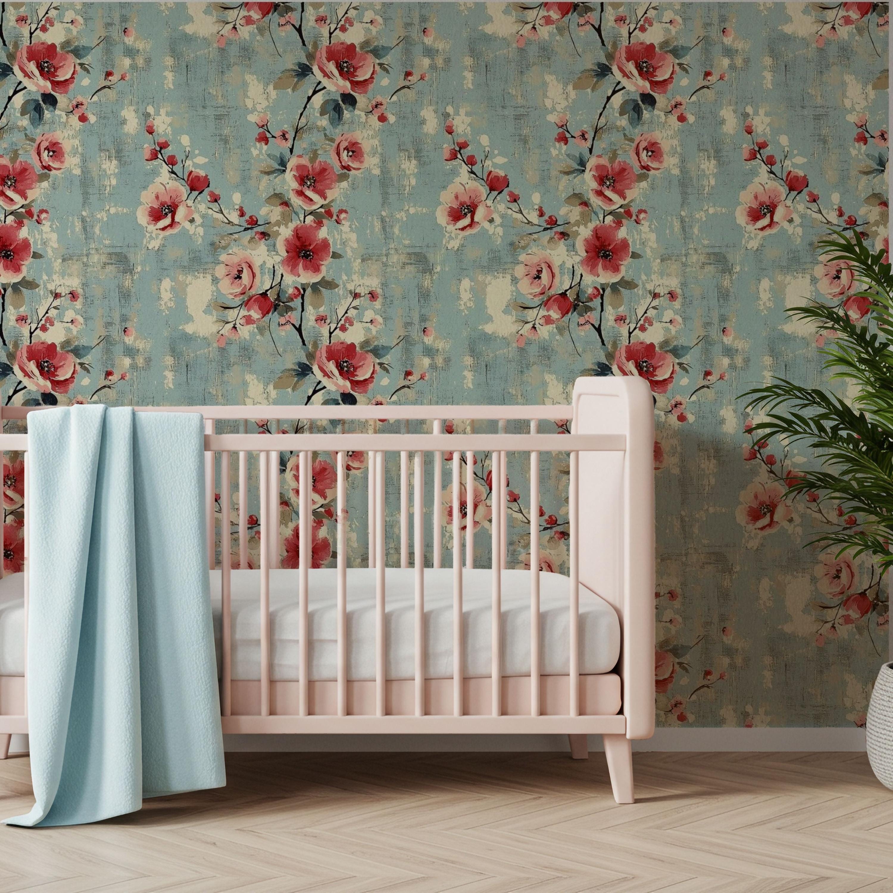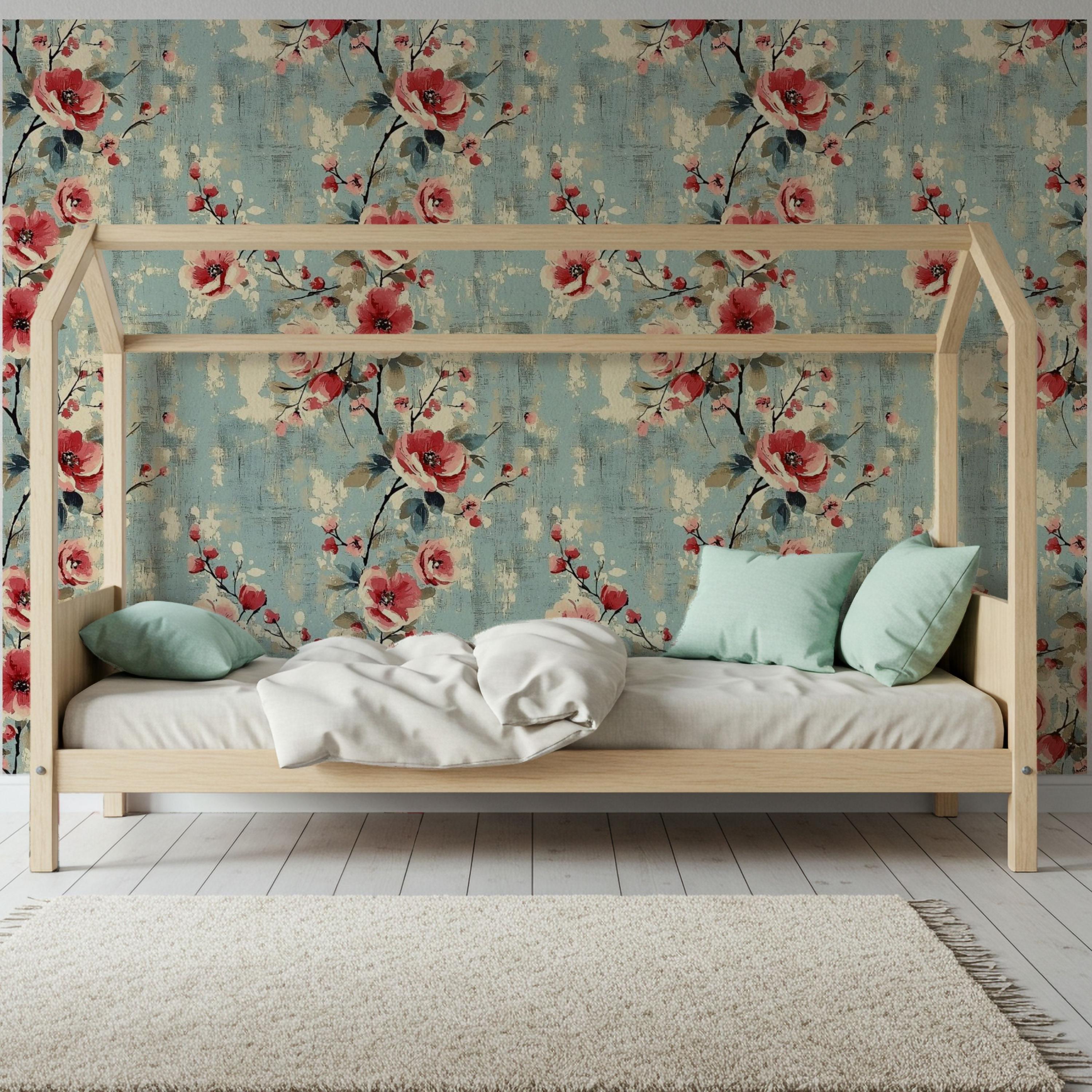 Painterly blooms unfurl across a weathered blue canvas, blending vintage romance with quiet modern charm. The layered brushwork and warm coral tones create a sense of timeless comfort — perfect for nurseries, kids’ rooms, or any space that deserves art that lives on your walls.